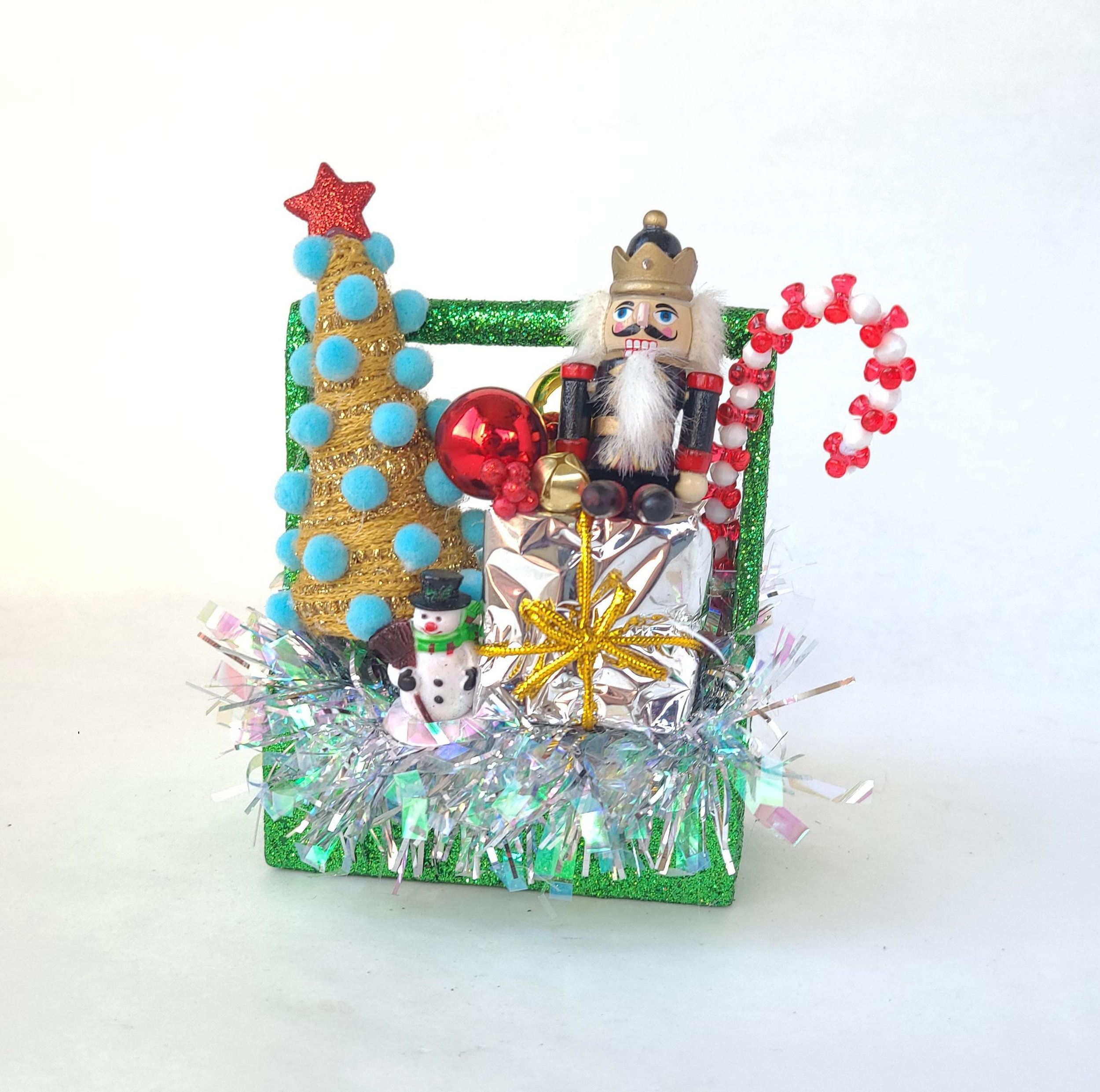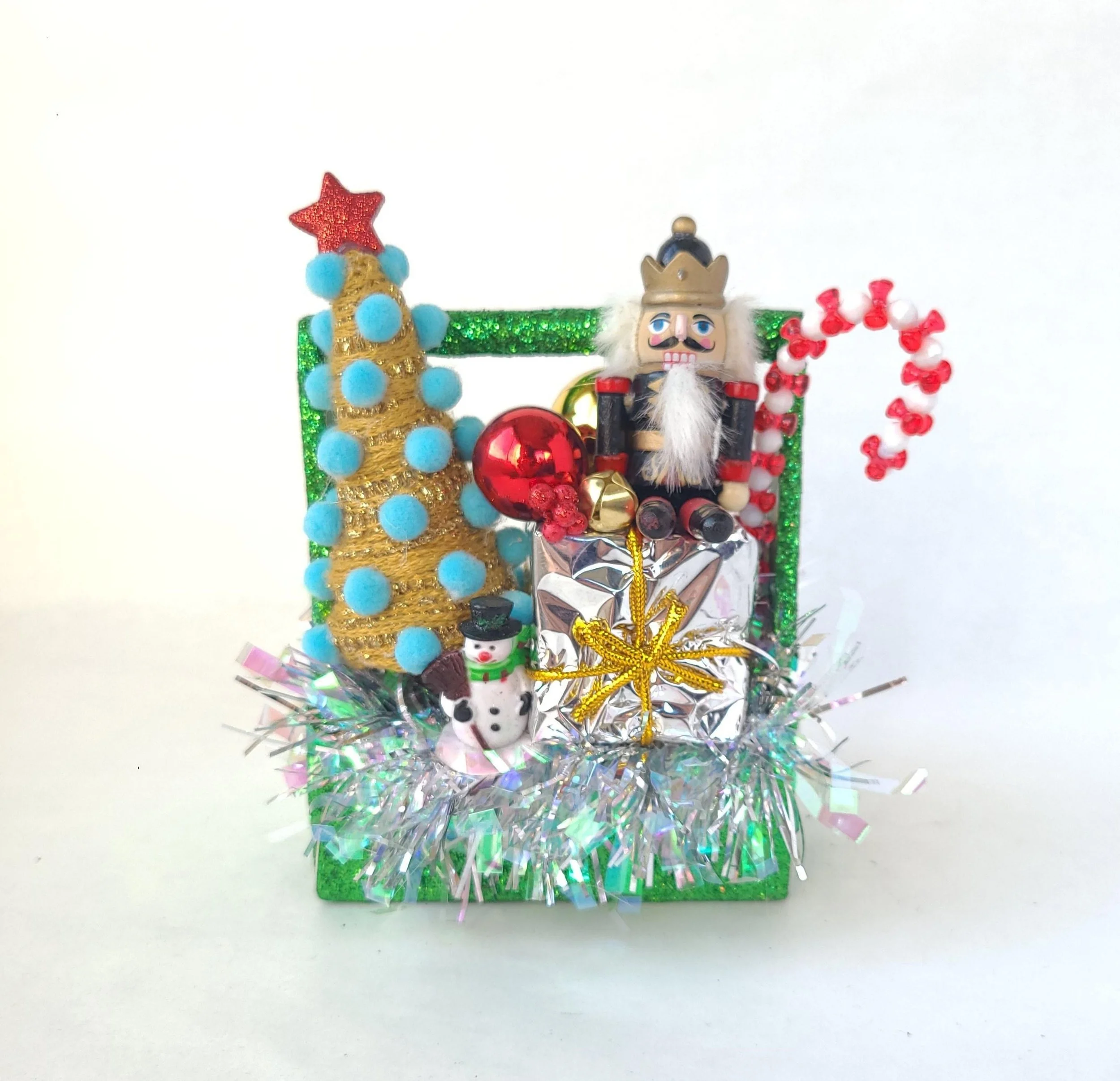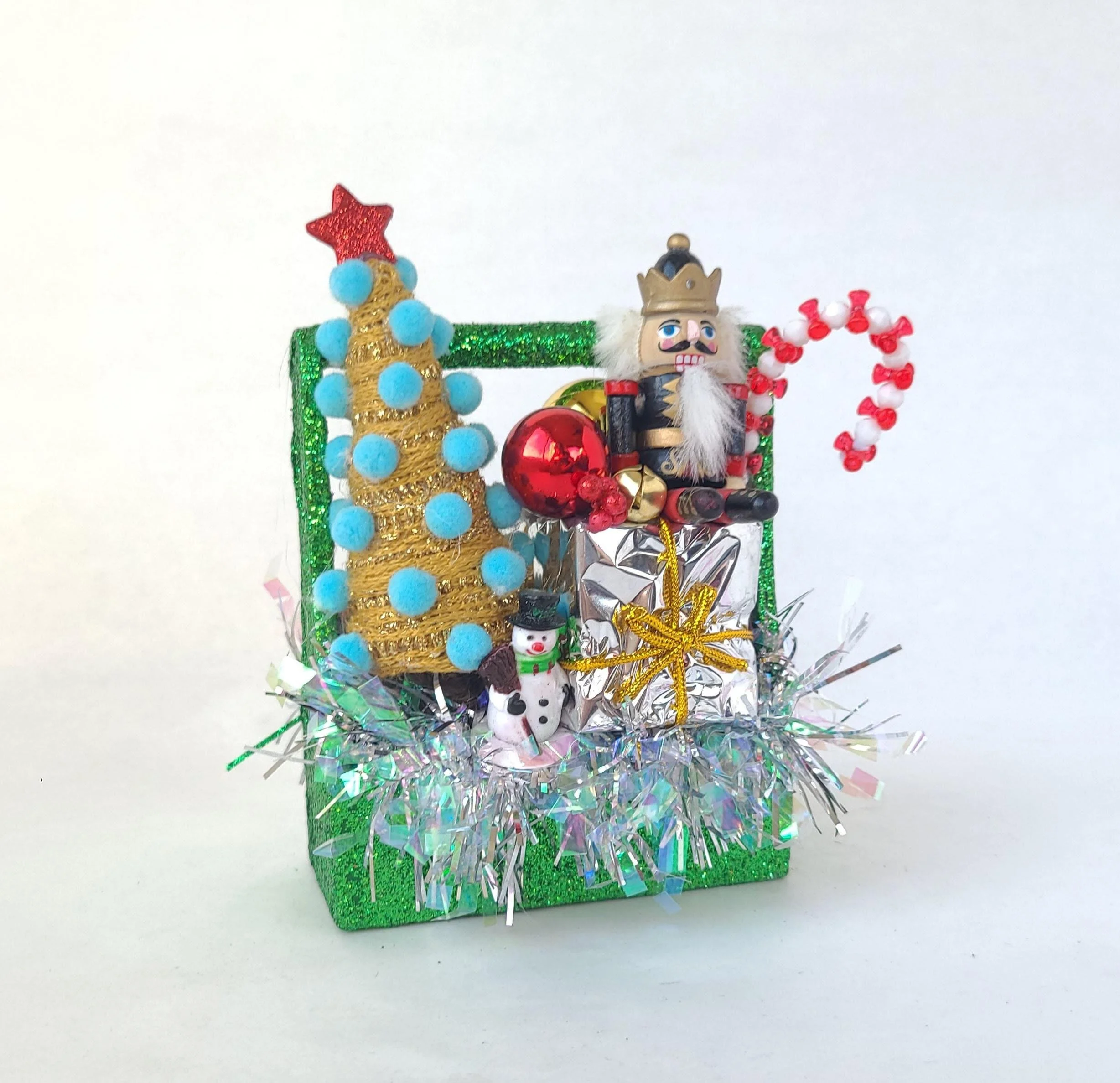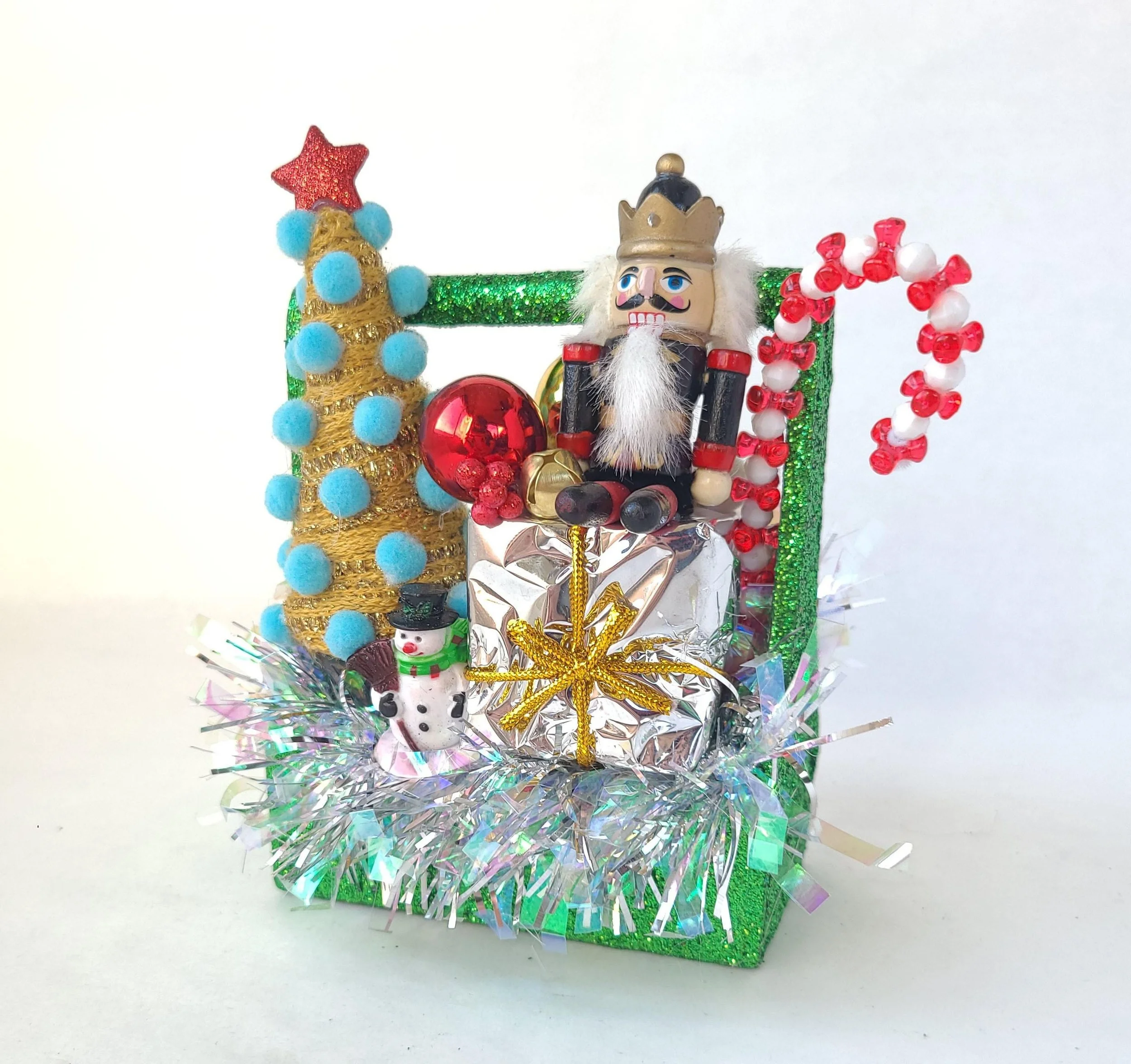 This little shrine altar box celebrates the one and only Billie Holiday. It features the famous image of Billie Holiday with a magnolia flower in her hair. The box has been adorned with satin ribbon, chenille yarn, rhinestone studs, glass beads, silver roses and much more. The back of the the box has been decked out with glittering blue letters that read "Lady Day".