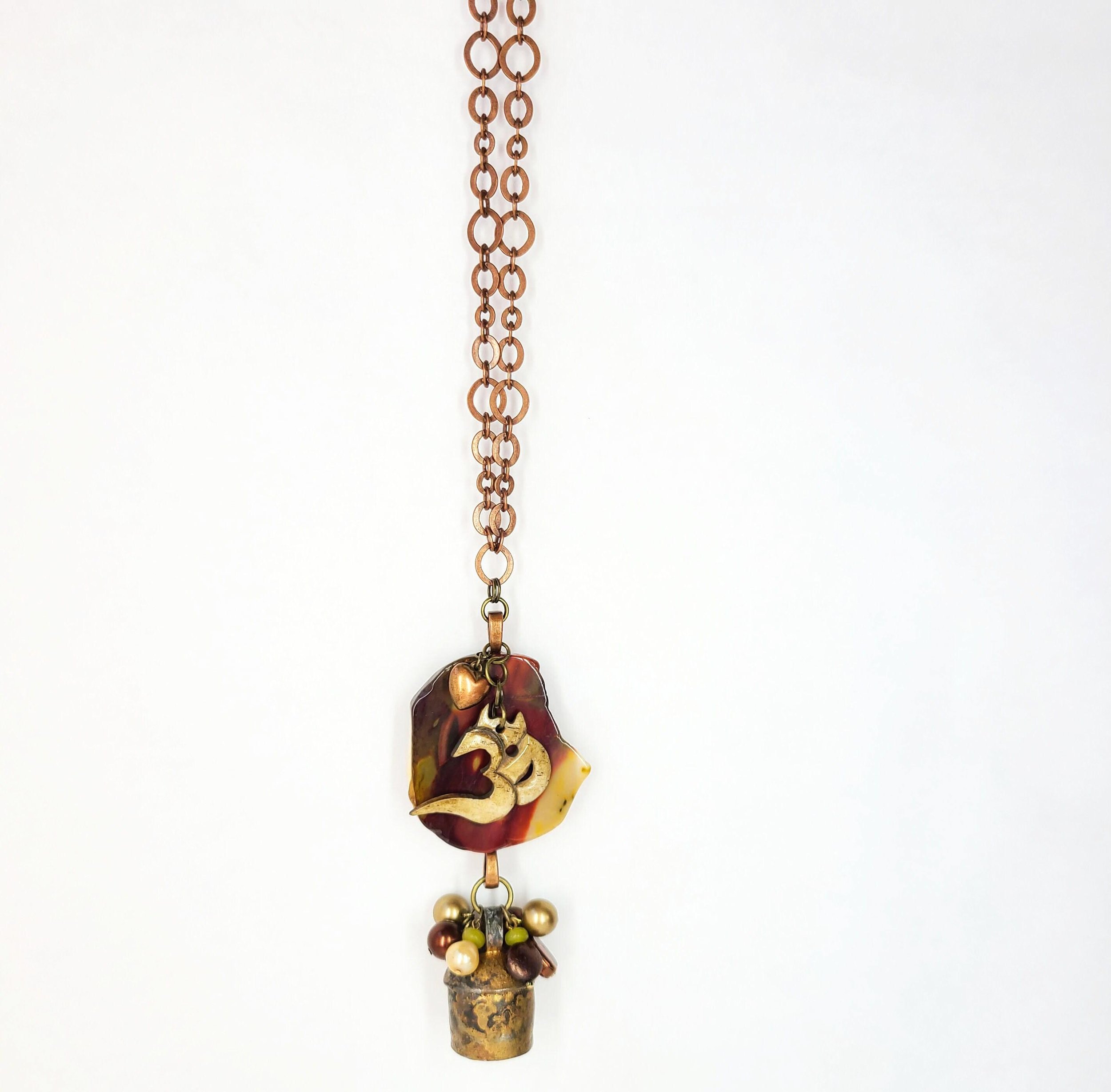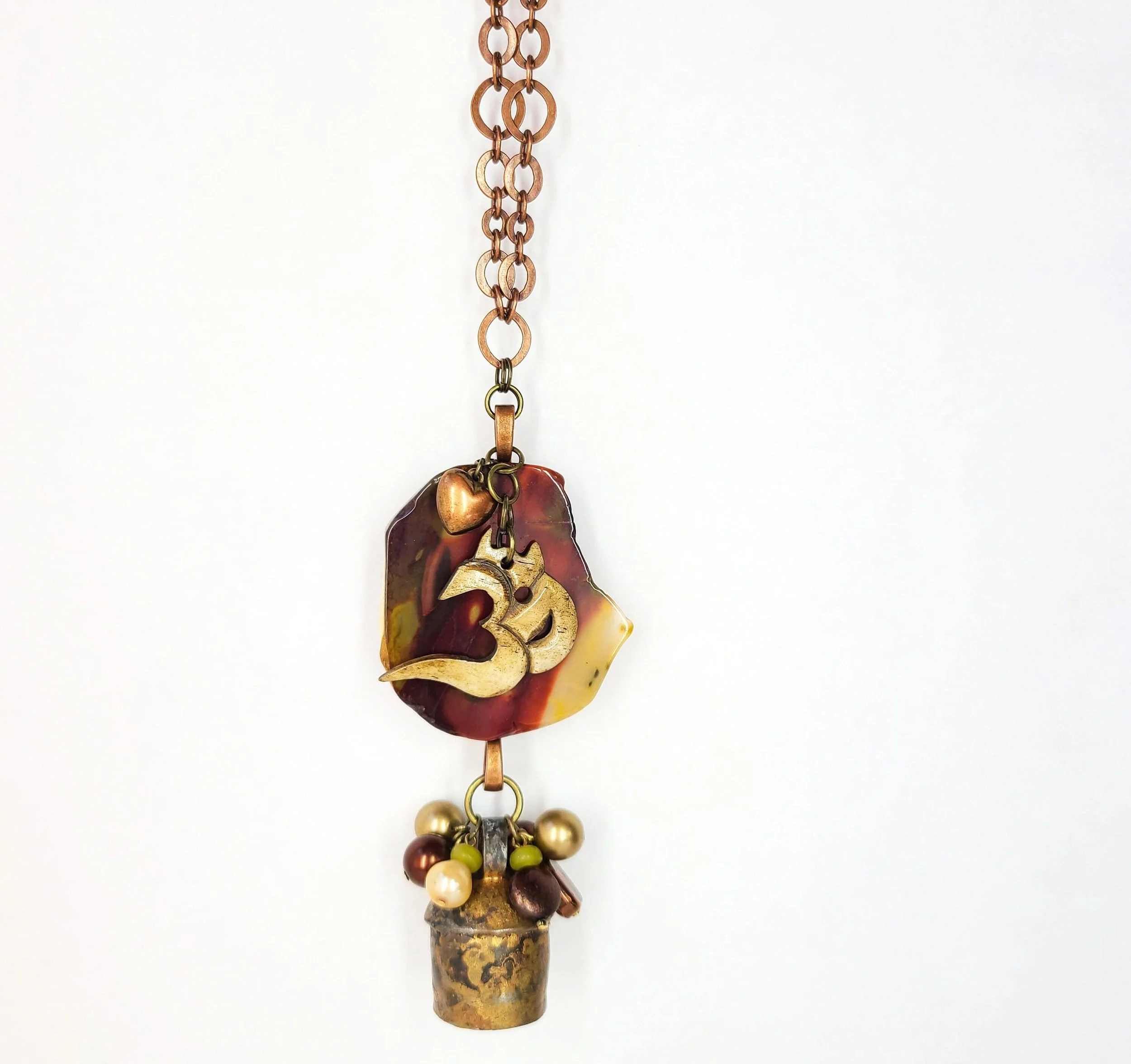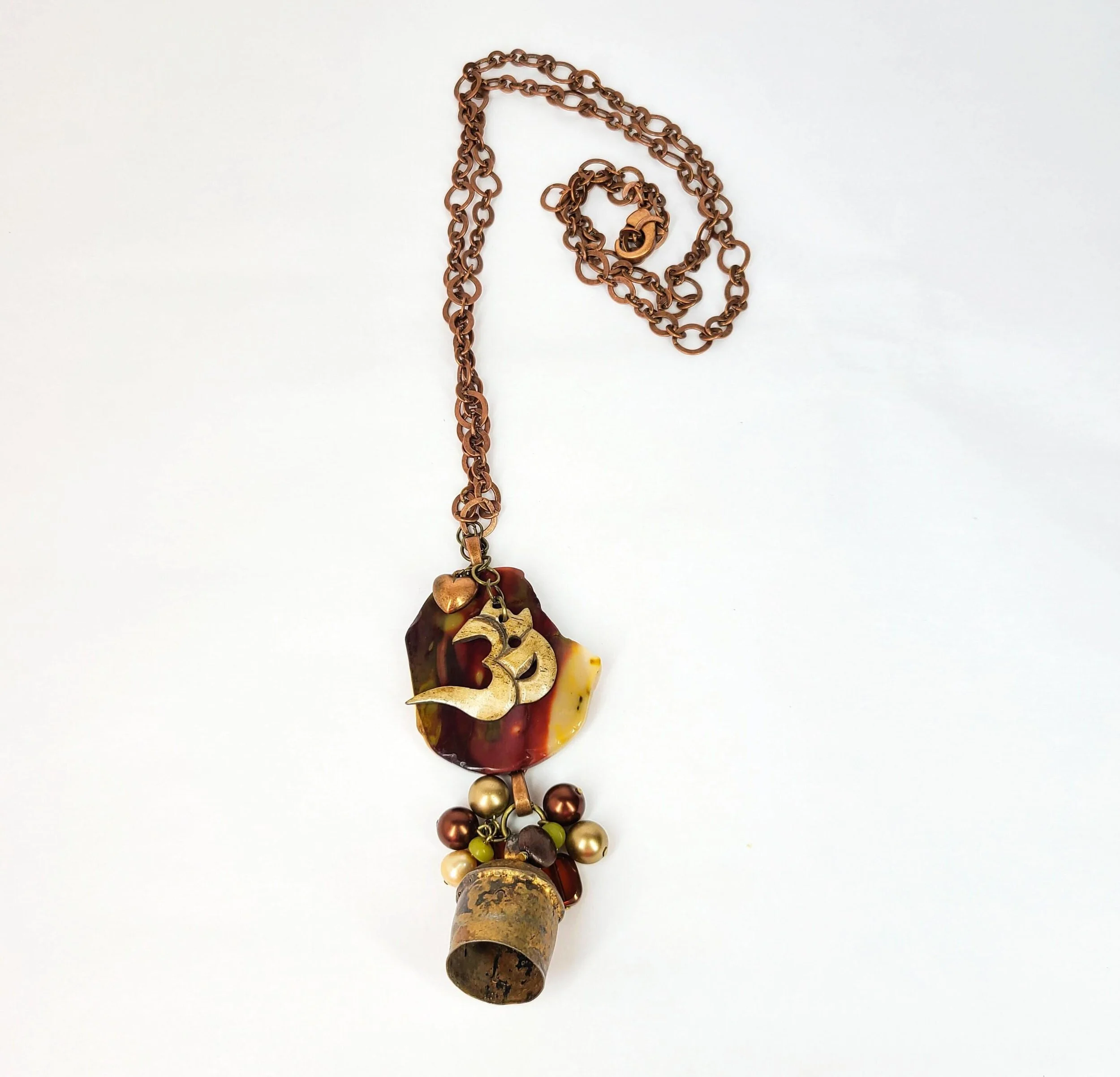This beautiful necklace features a nickel free copper tone chain with a large multi-piece pendant. It includes a slice of desert jasper with a bone OM charm and small copper heart hanging on top. Hanging from the bottom of the jasper is a handmade copper bell adorned with a cluster of glass beads.