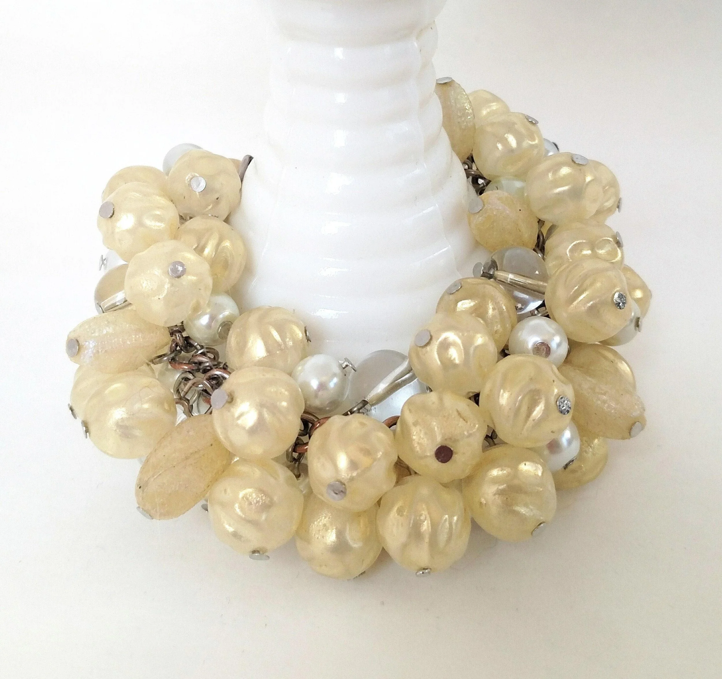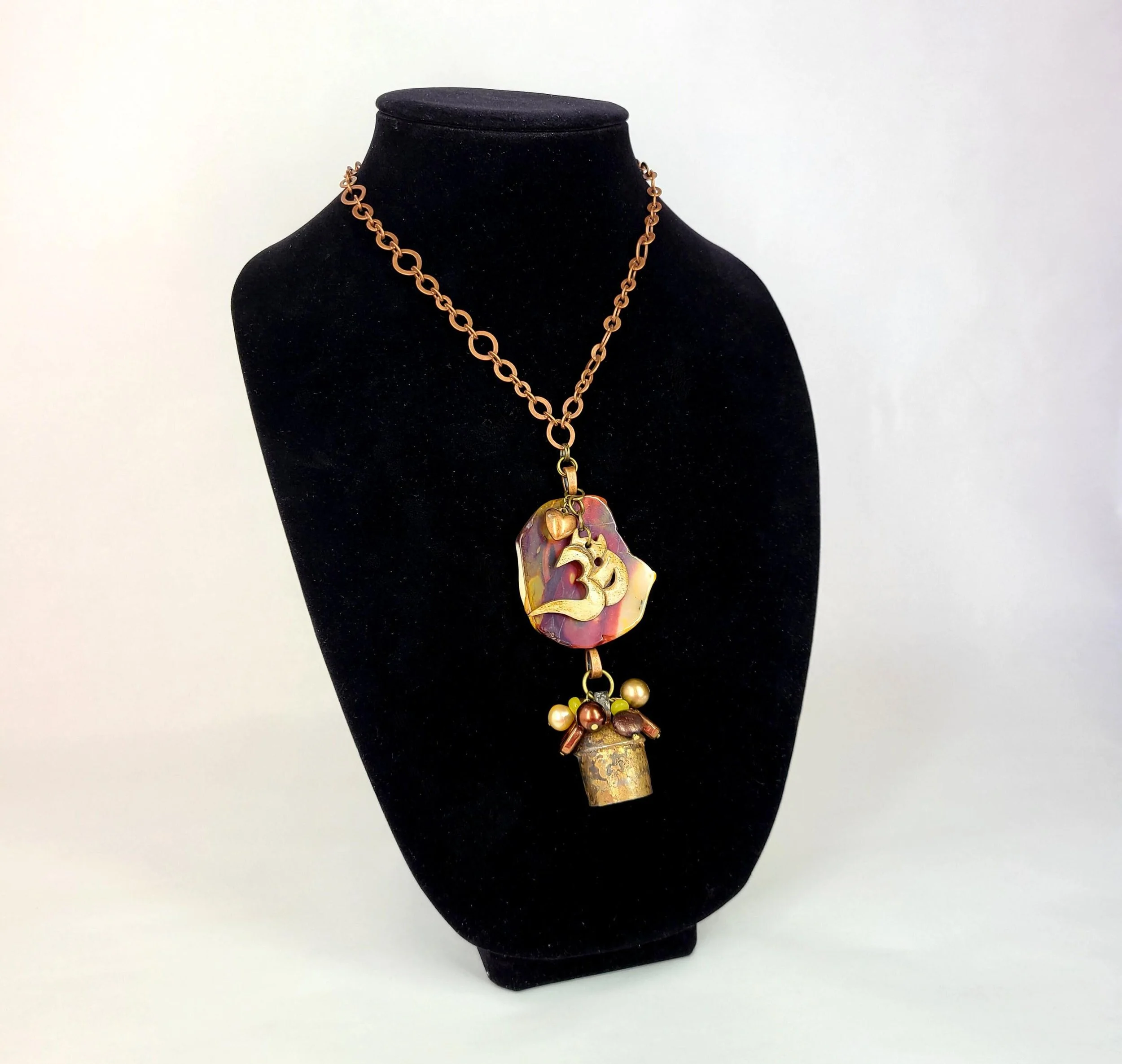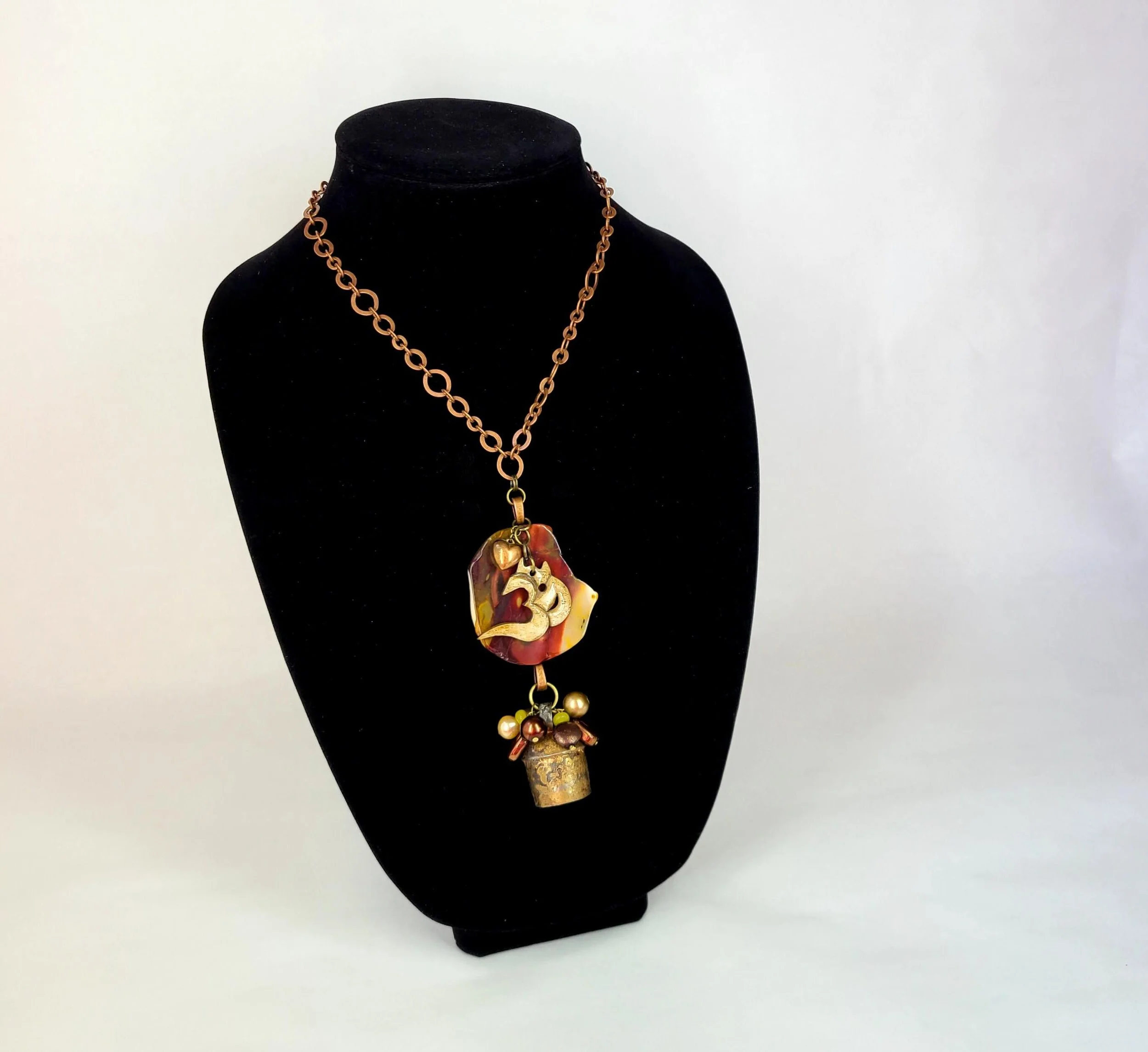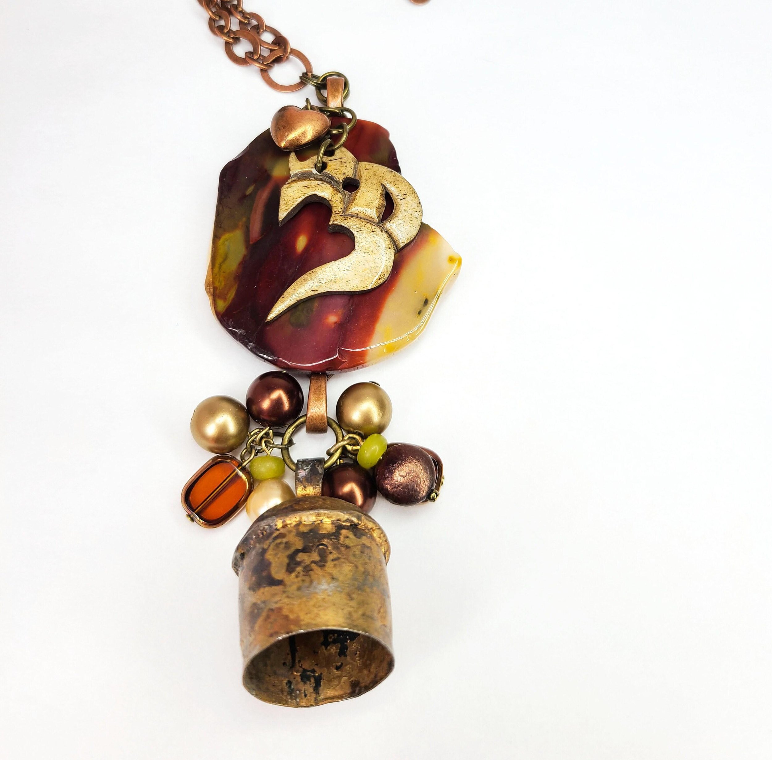 This beautiful necklace features a nickel free copper tone chain with a large multi-piece pendant. It includes a slice of desert jasper with a bone OM charm and small copper heart hanging on top. Hanging from the bottom of the jasper is a handmade copper bell adorned with a cluster of glass beads.