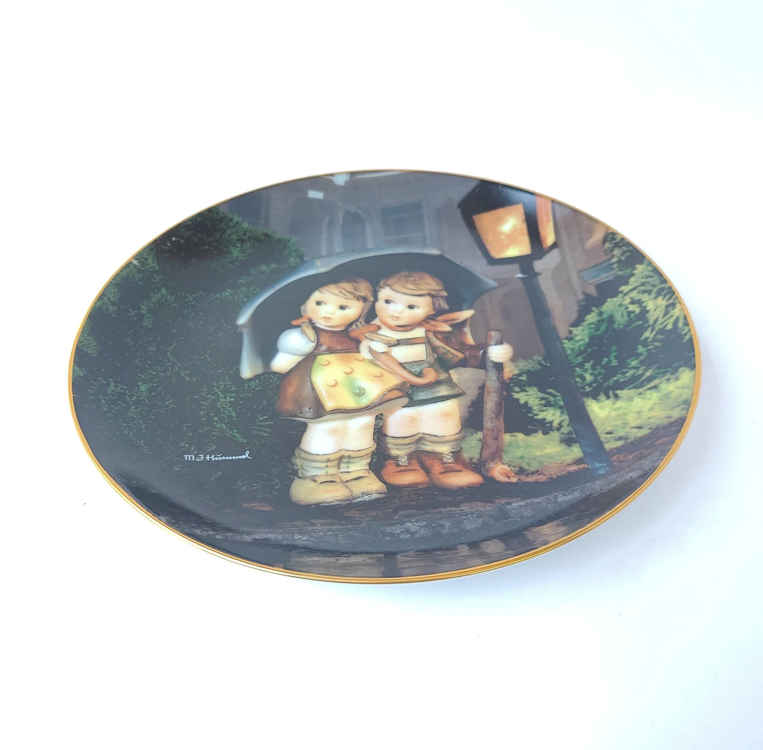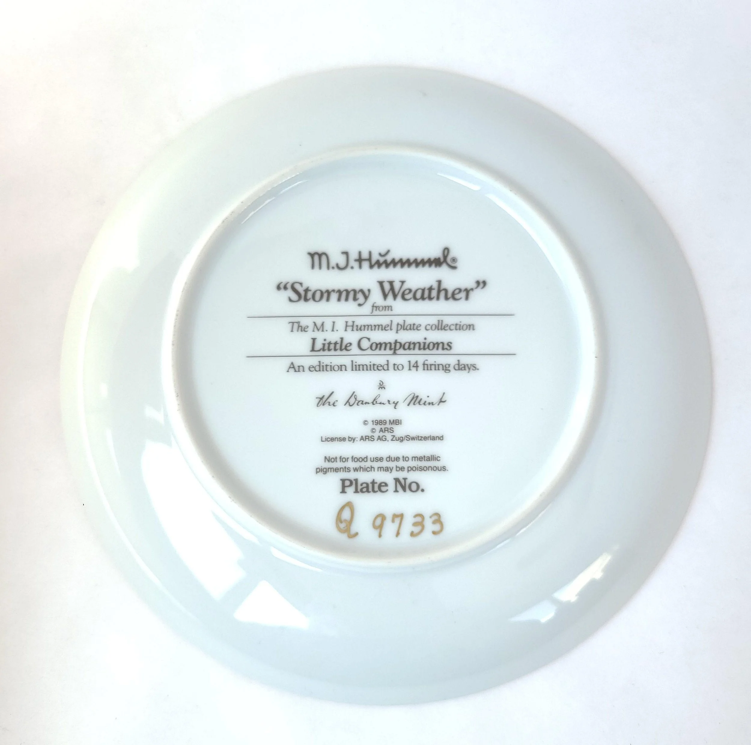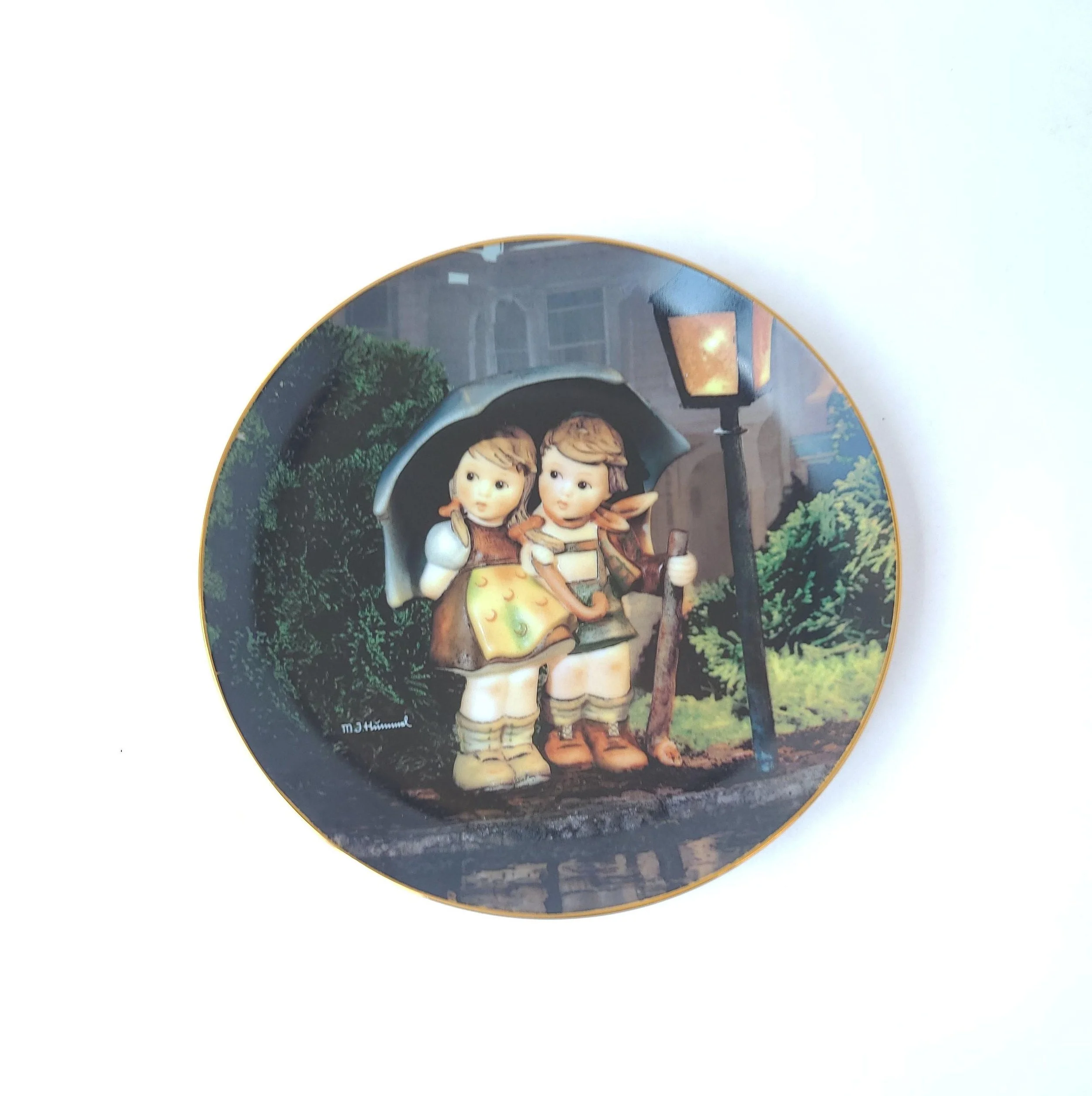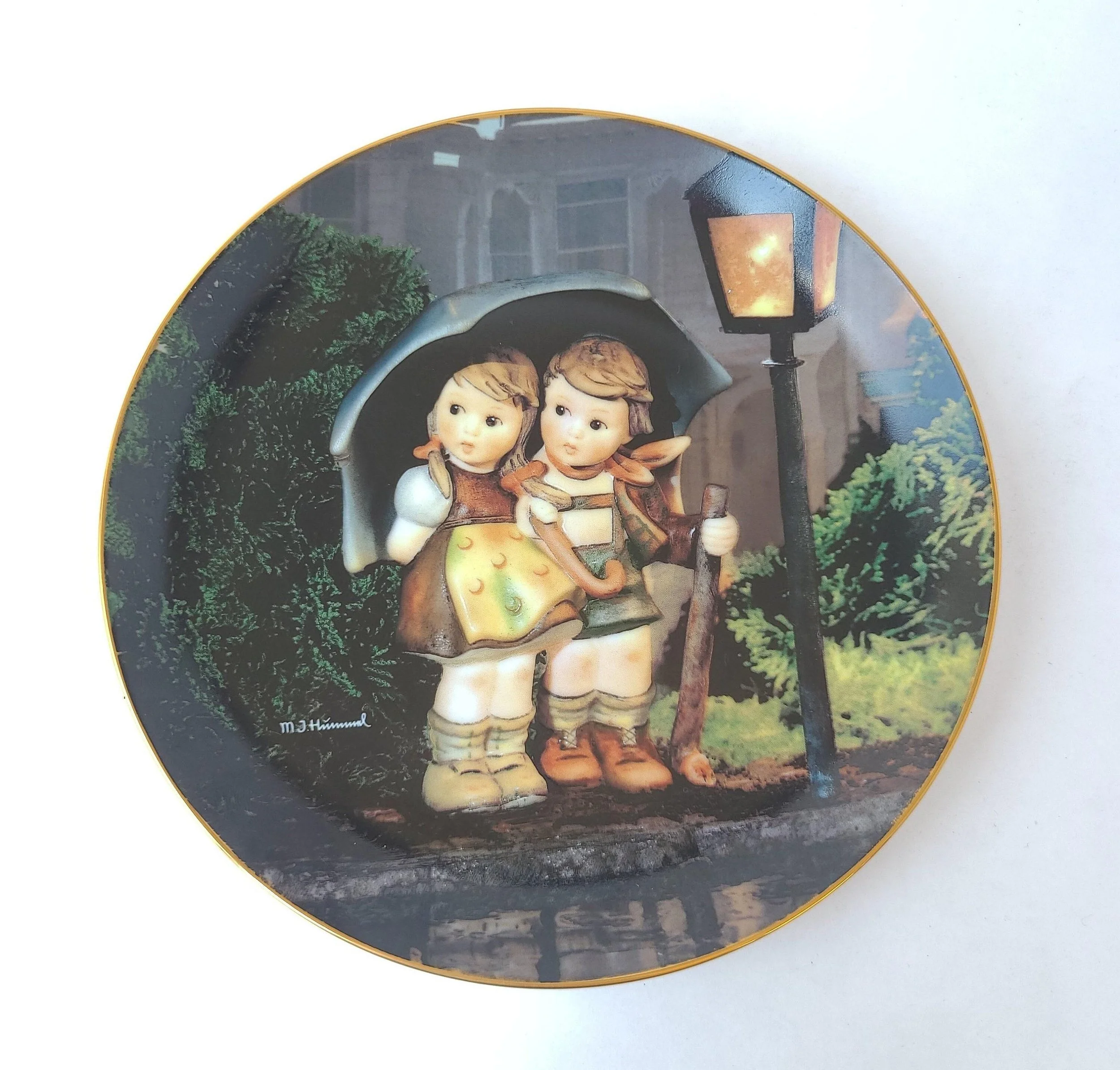 This precious vintage 1990 Danbury Mint collectible plate is part of the M.I Hummel Little Companions collection and is titled "Stormy Weather". It features a little boy and girl standing underneath an umbrella by a streetlamp. The plate is in very good used condition with no chips or cracks and excellent color quality.