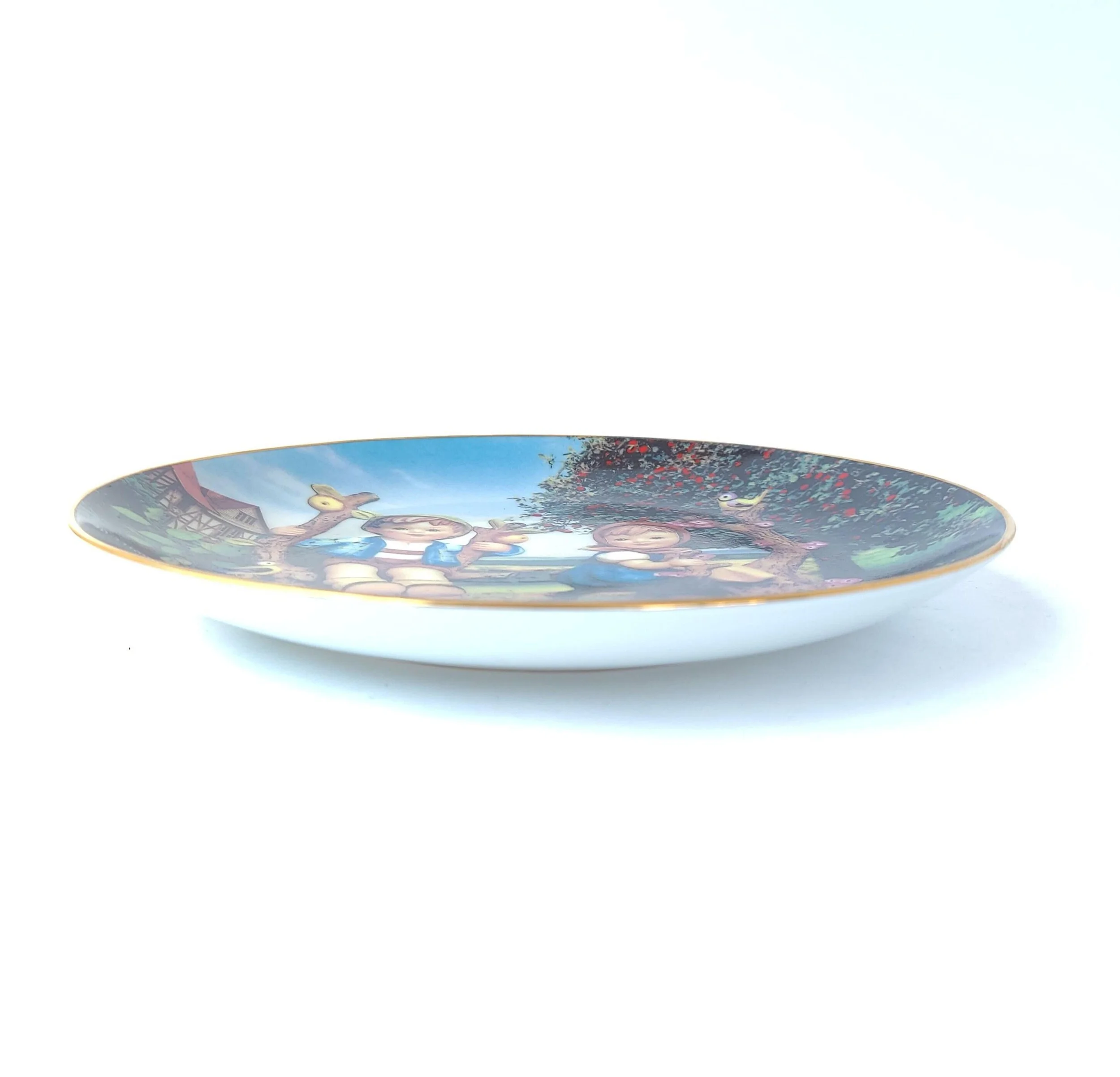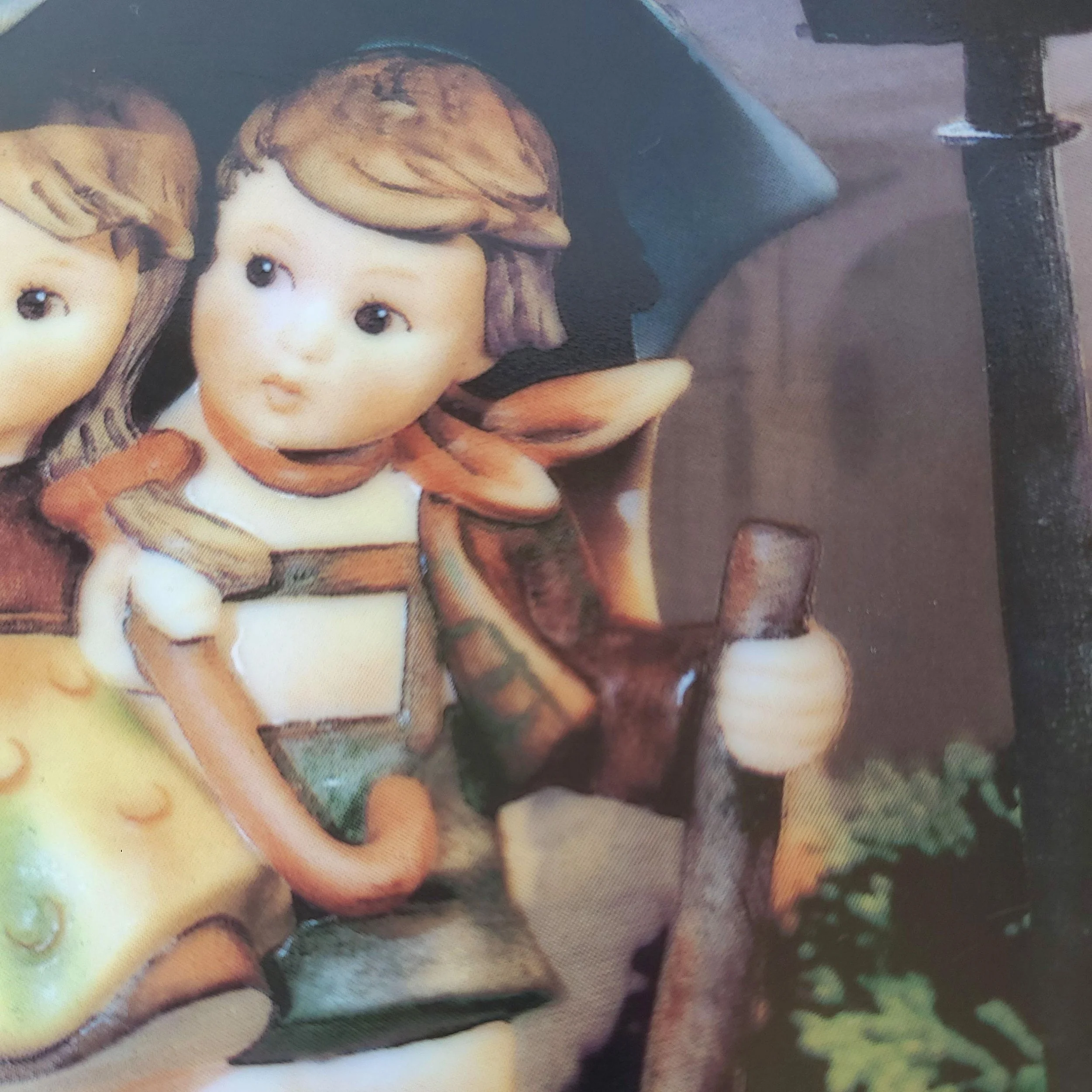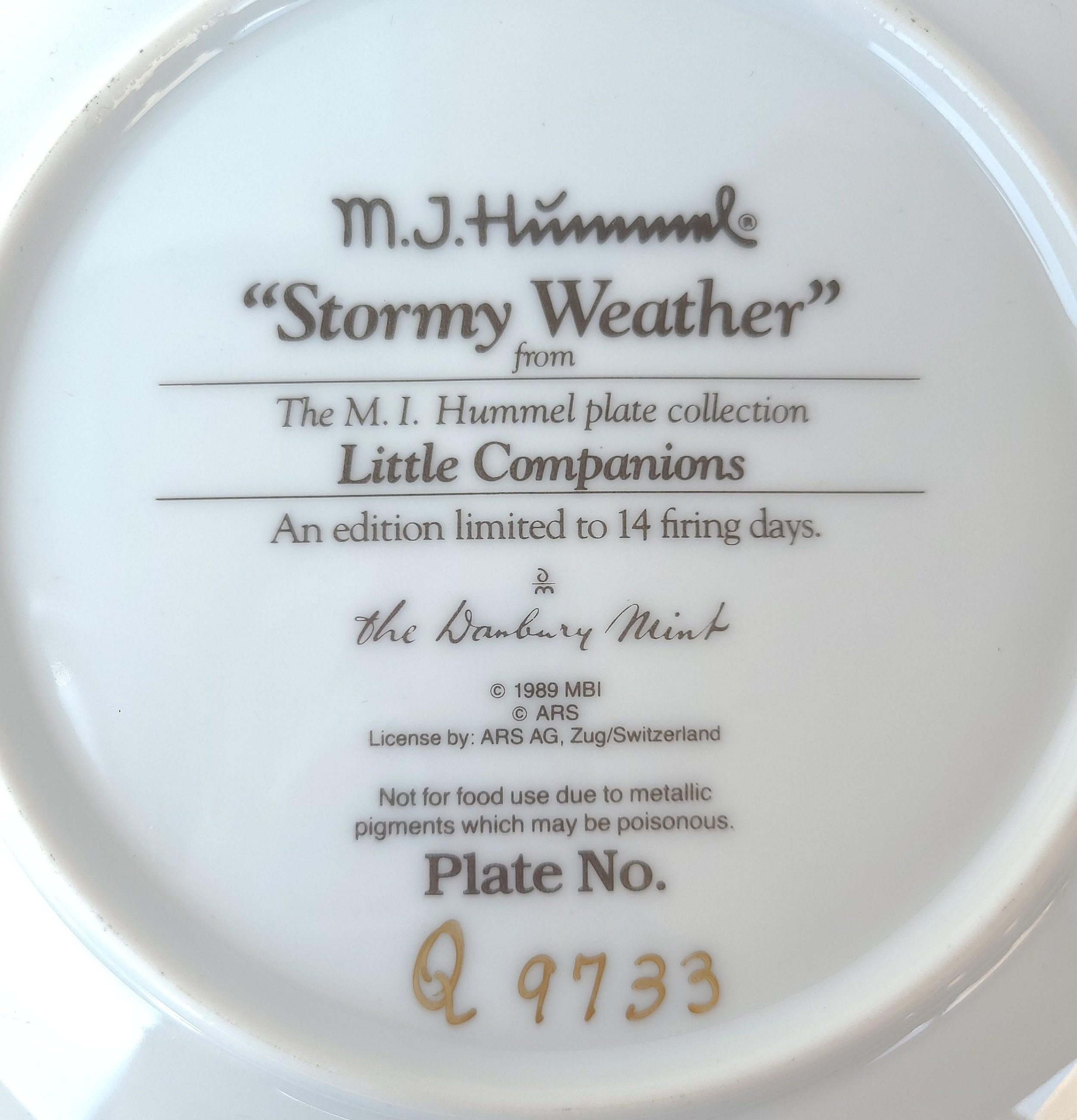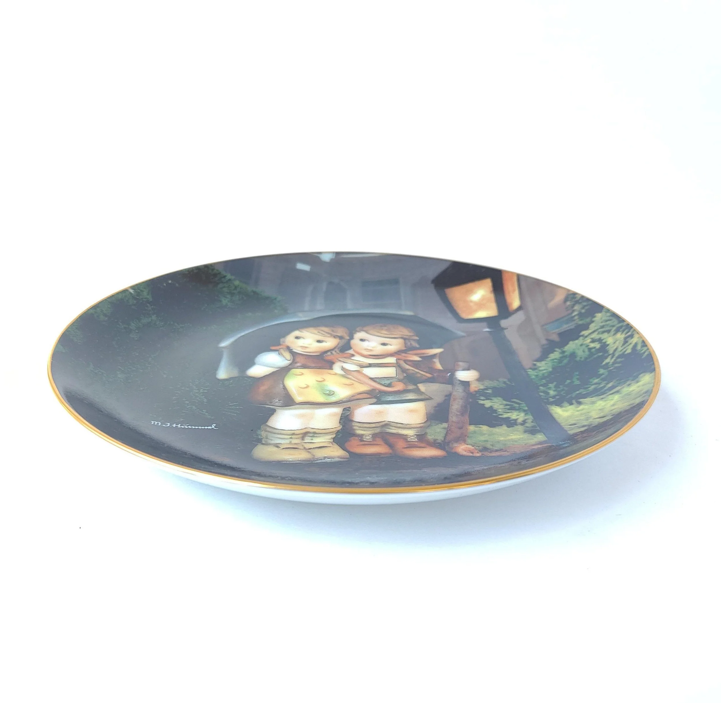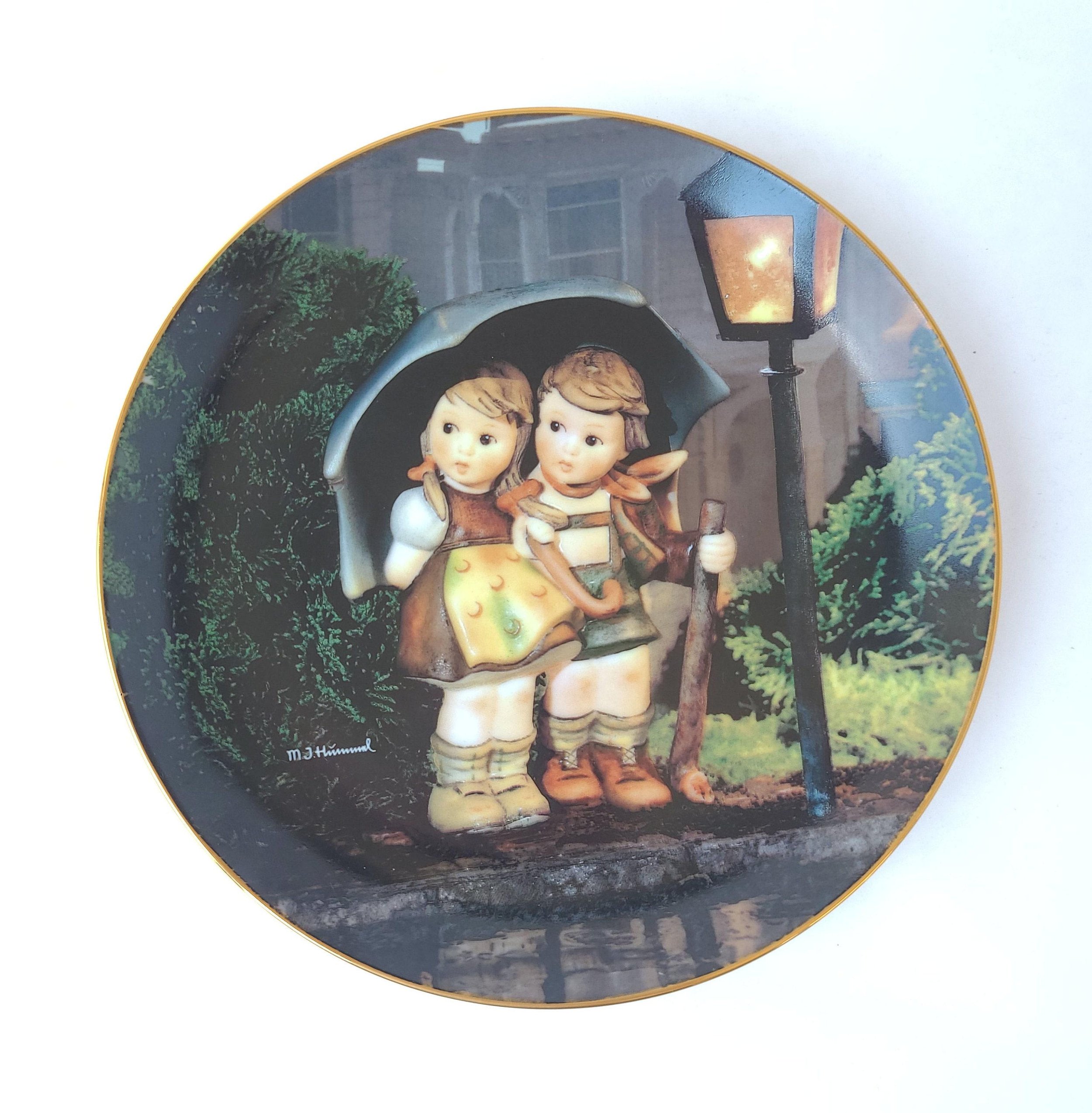 This precious vintage 1990 Danbury Mint collectible plate is part of the M.I Hummel Little Companions collection and is titled "Stormy Weather". It features a little boy and girl standing underneath an umbrella by a streetlamp. The plate is in very good used condition with no chips or cracks and excellent color quality.