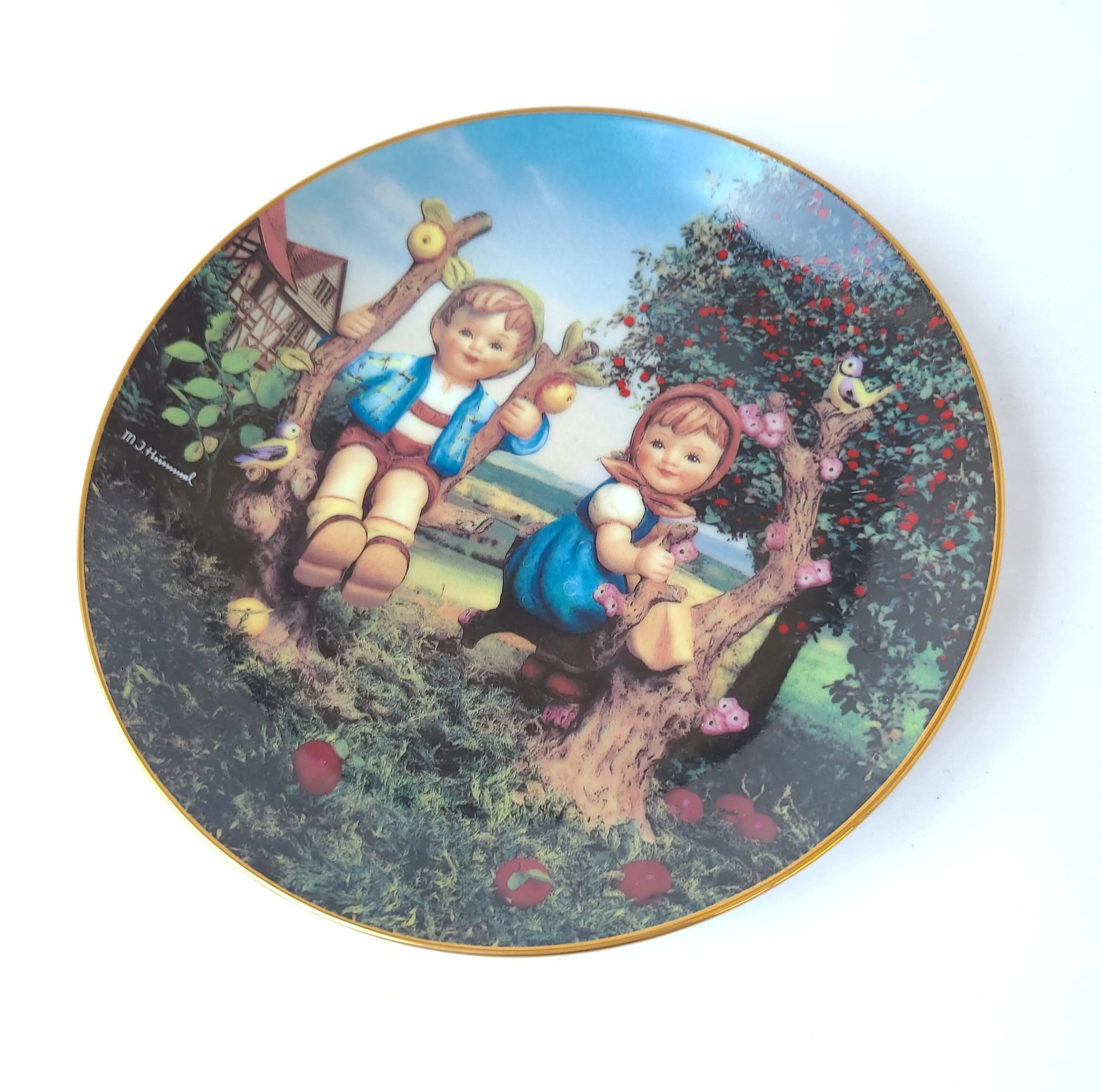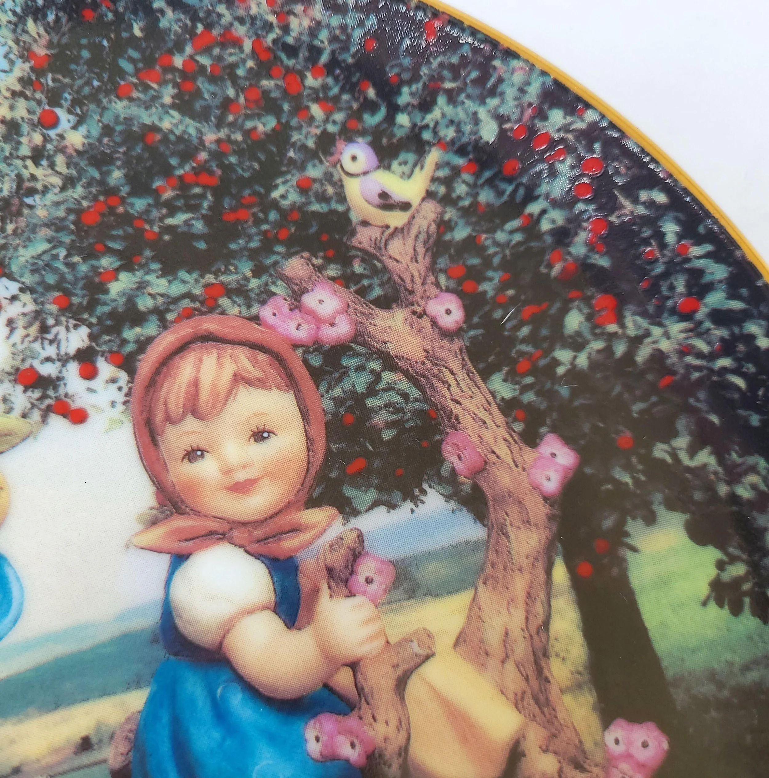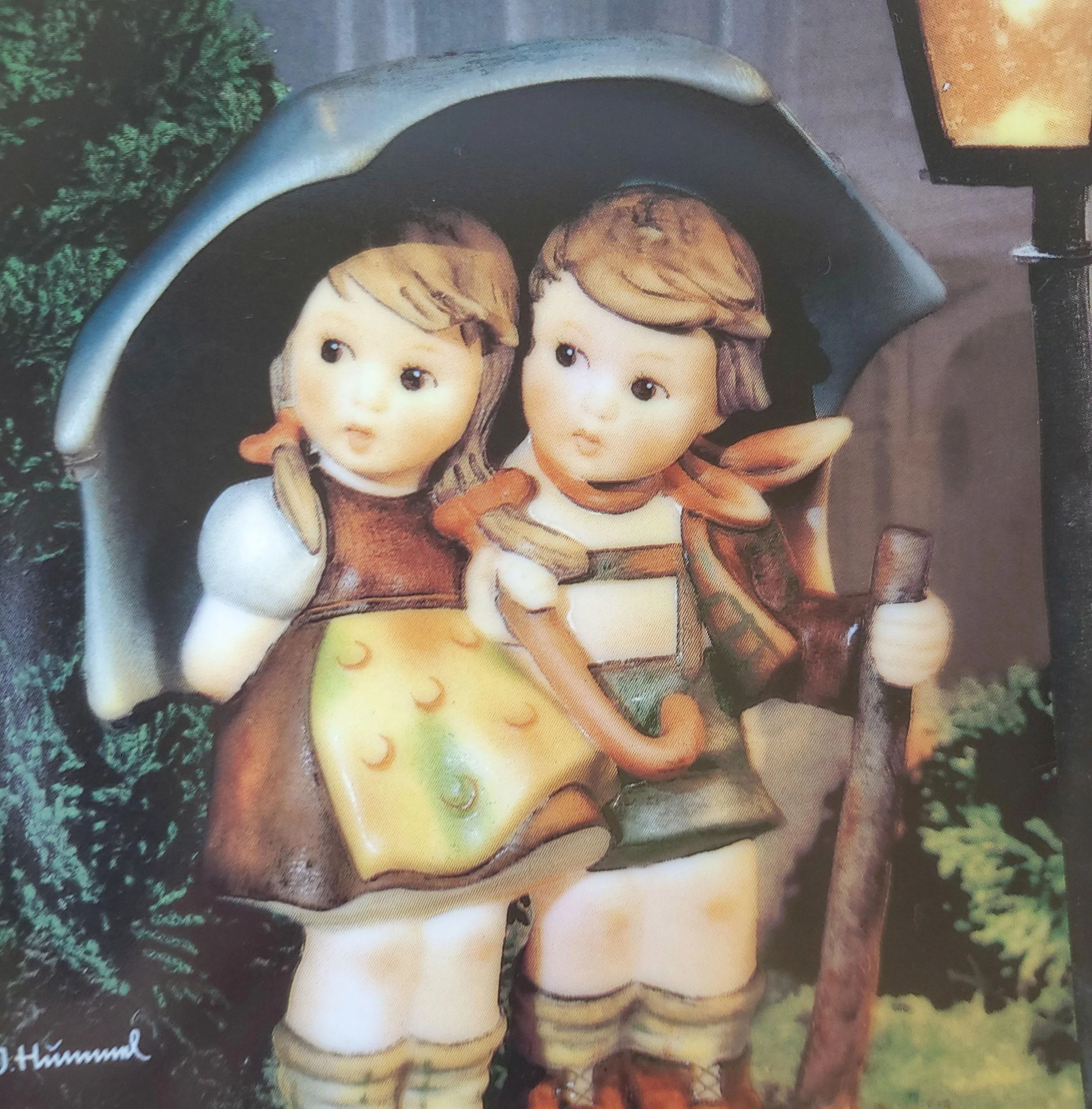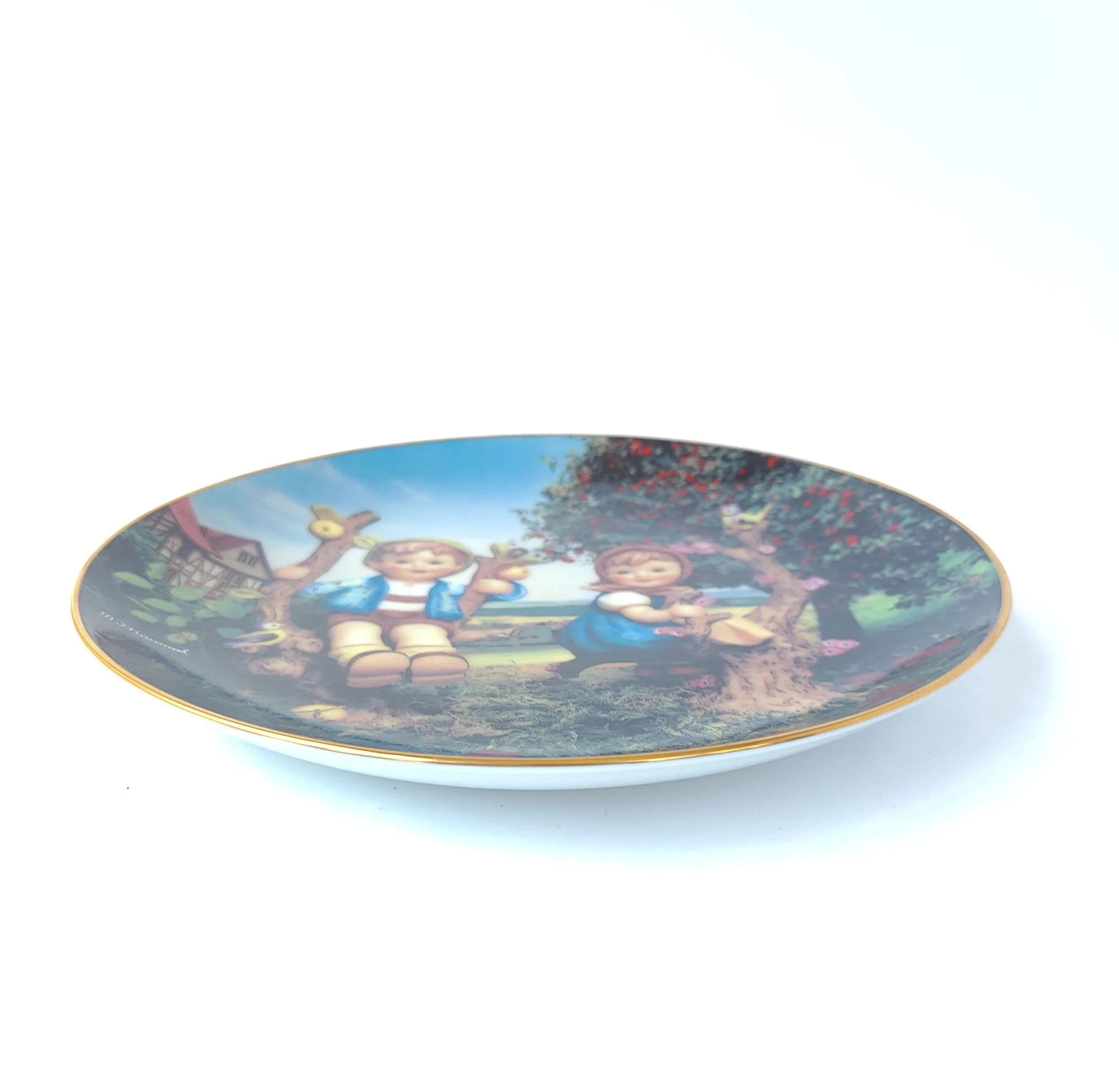 This precious vintage 1990 Danbury Mint collectible plate is part of the M.I Hummel Little Companions collection and is titled "Stormy Weather". It features a little boy and girl standing underneath an umbrella by a streetlamp. The plate is in very good used condition with no chips or cracks and excellent color quality.