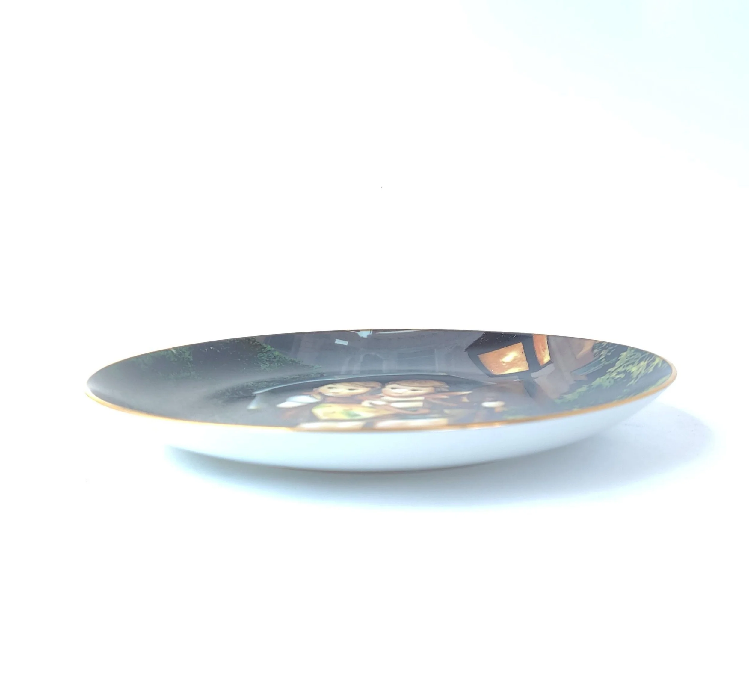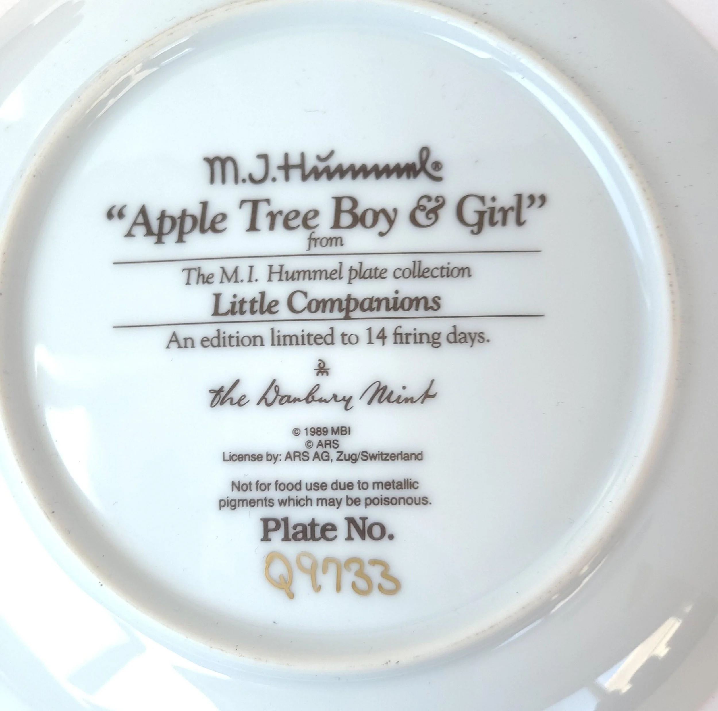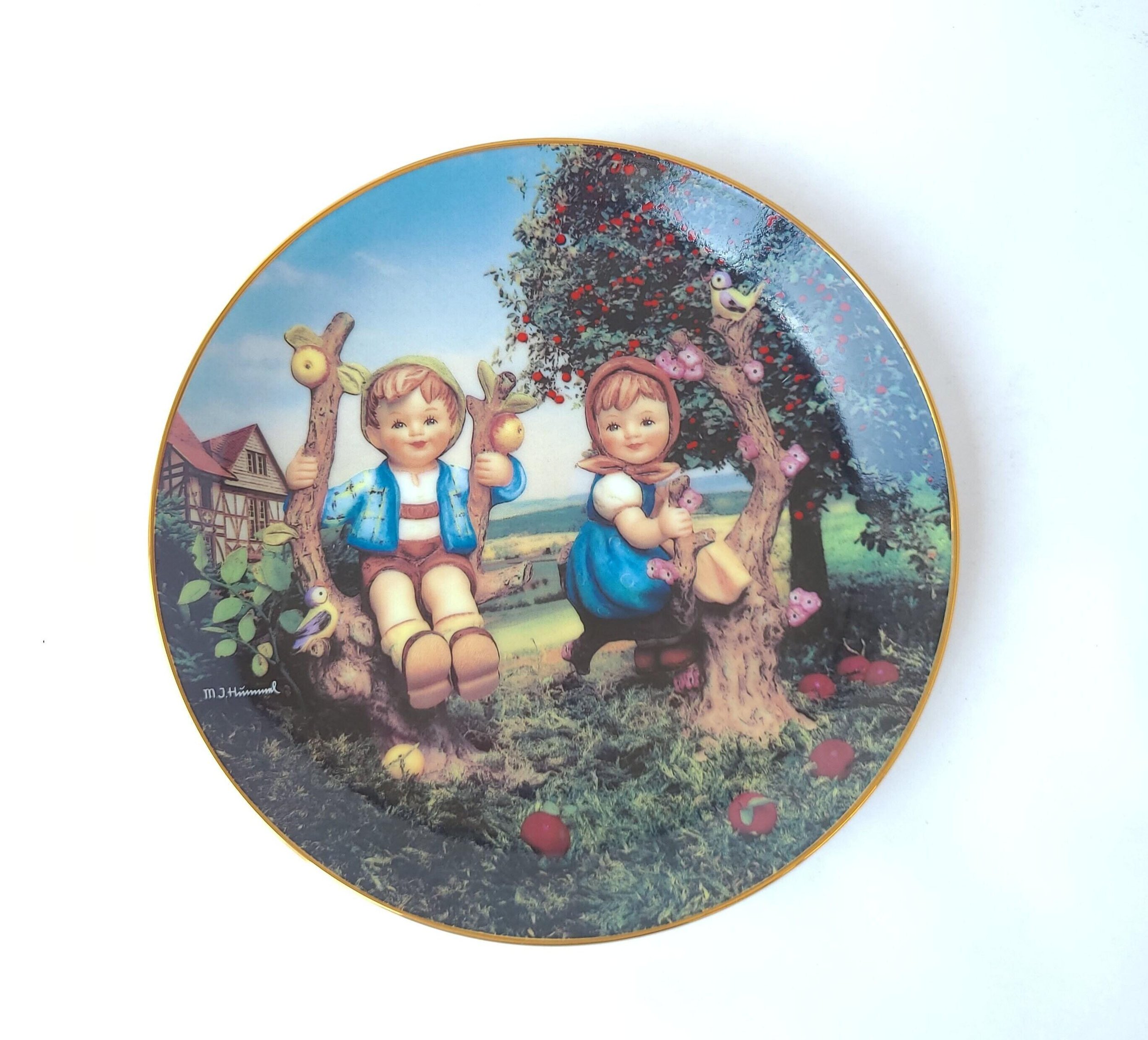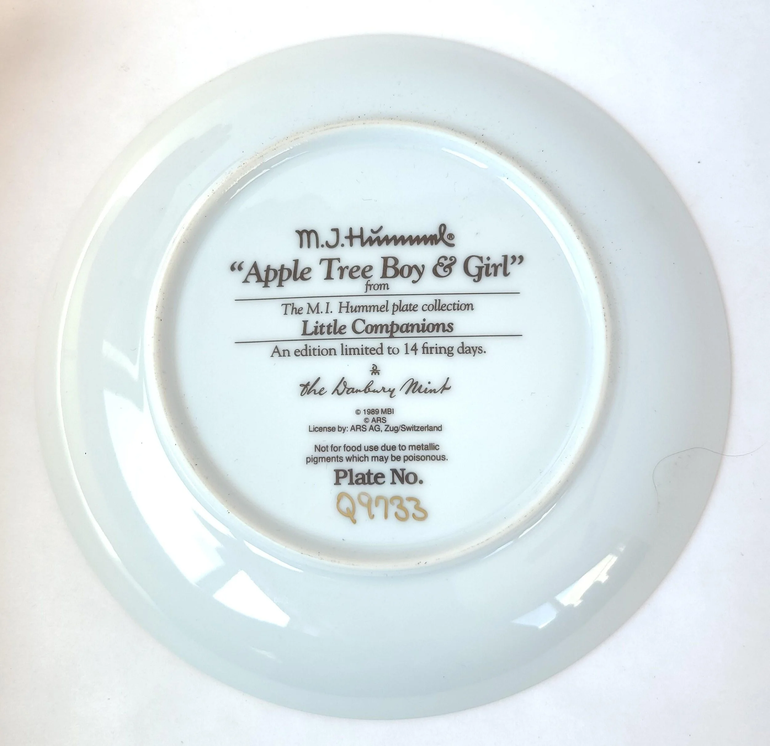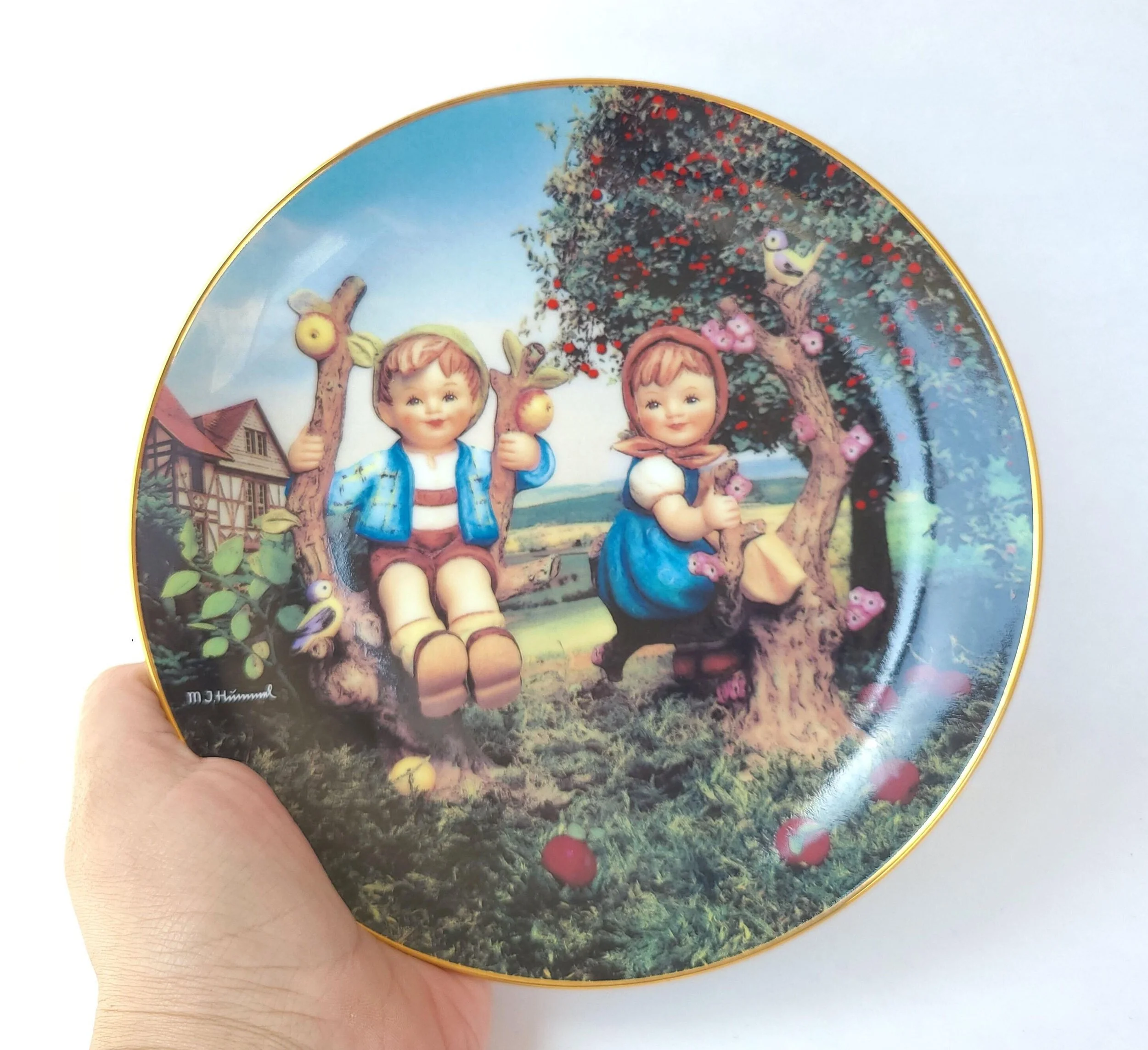 This precious vintage 1990 Danbury Mint collectible plate is part of the M.I Hummel Little Companions collection and is titled "Stormy Weather". It features a little boy and girl standing underneath an umbrella by a streetlamp. The plate is in very good used condition with no chips or cracks and excellent color quality.