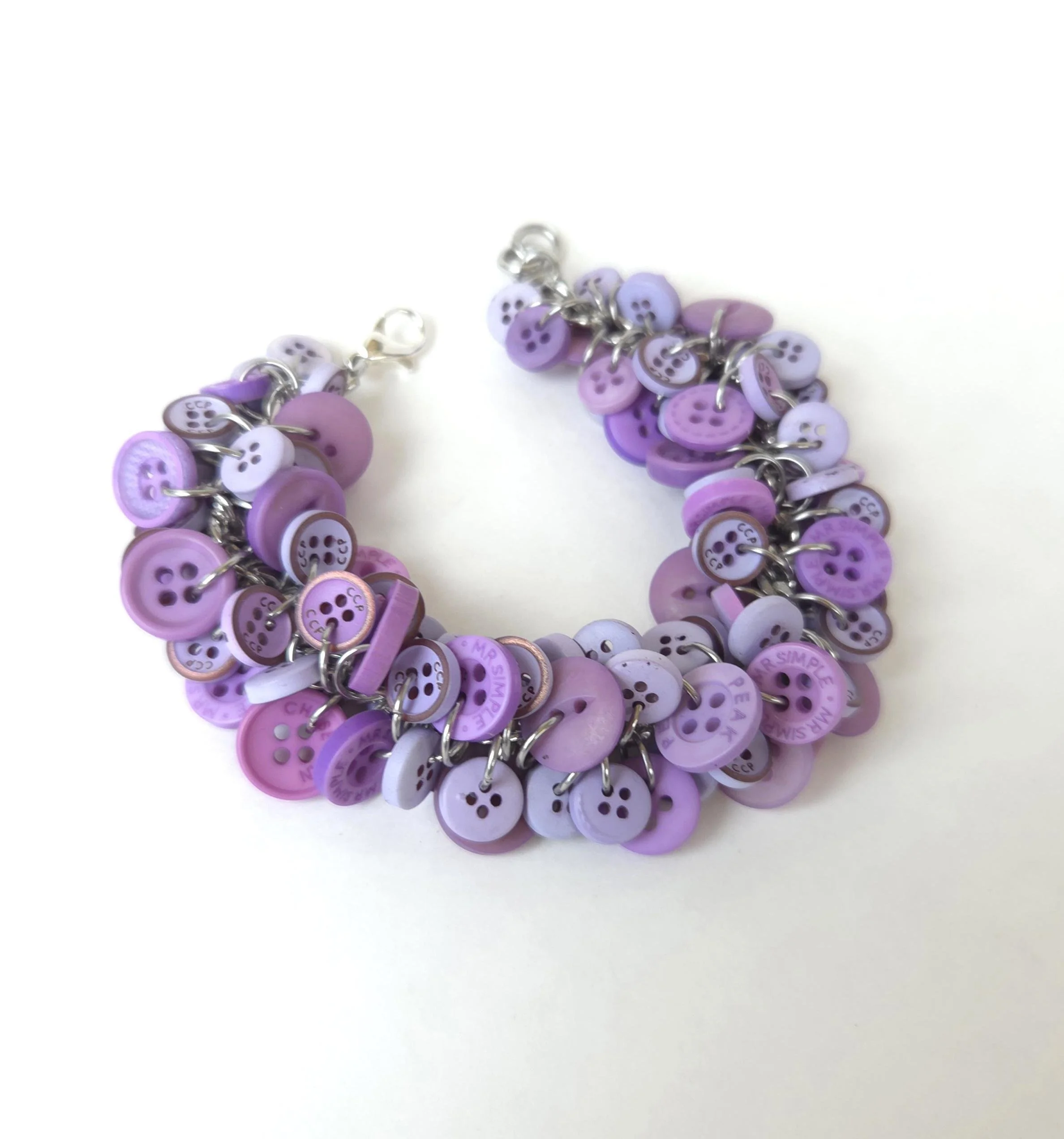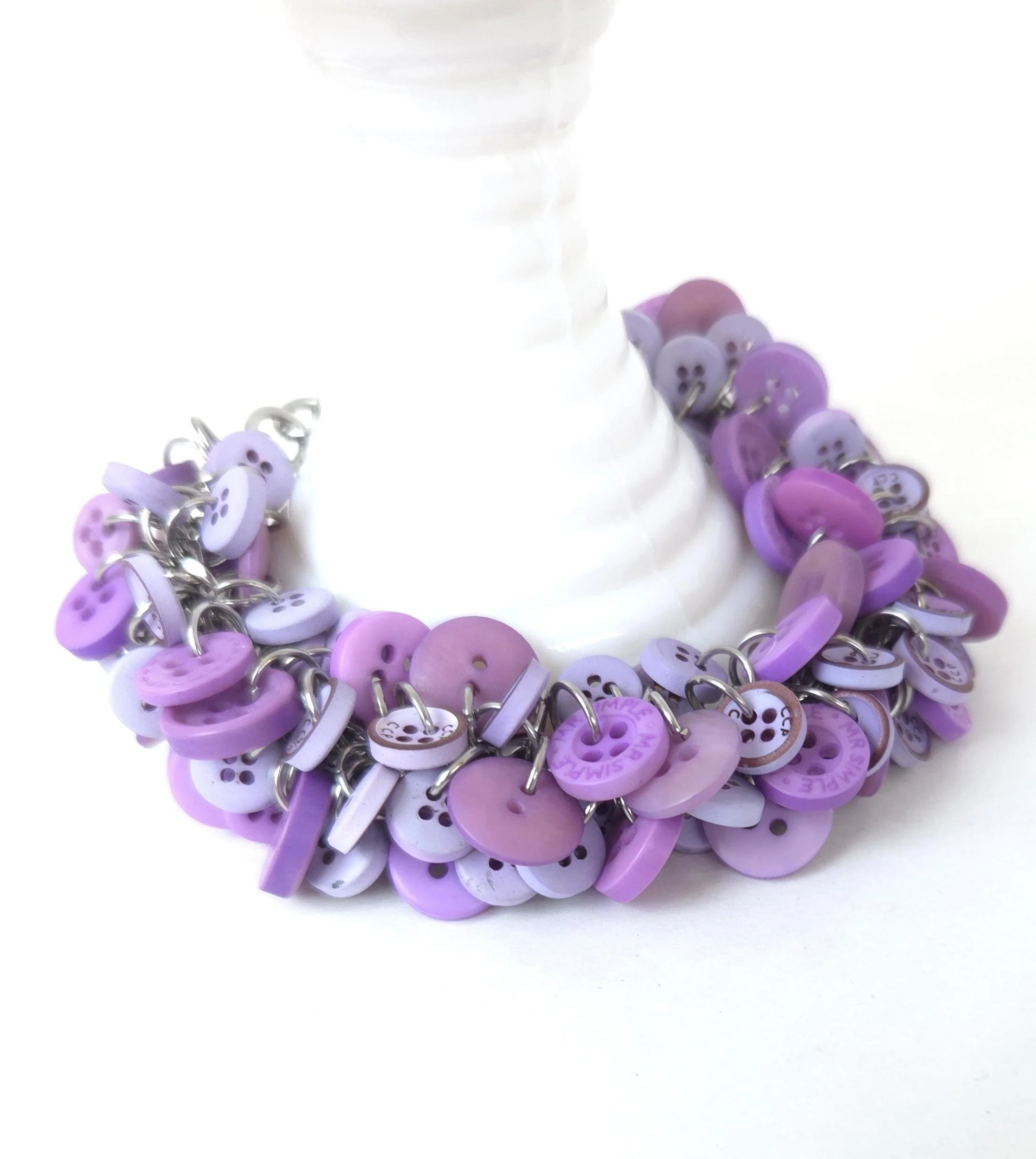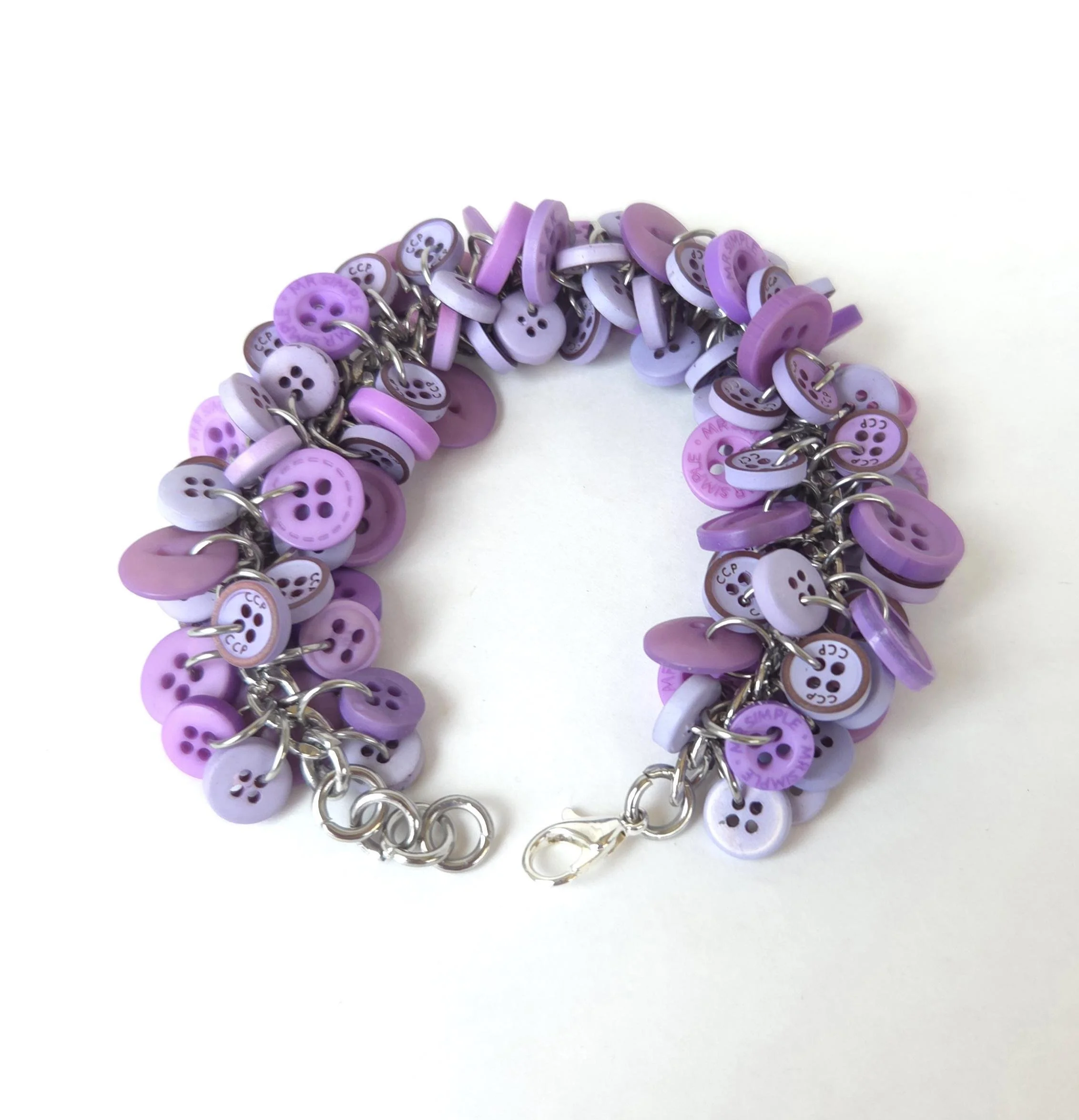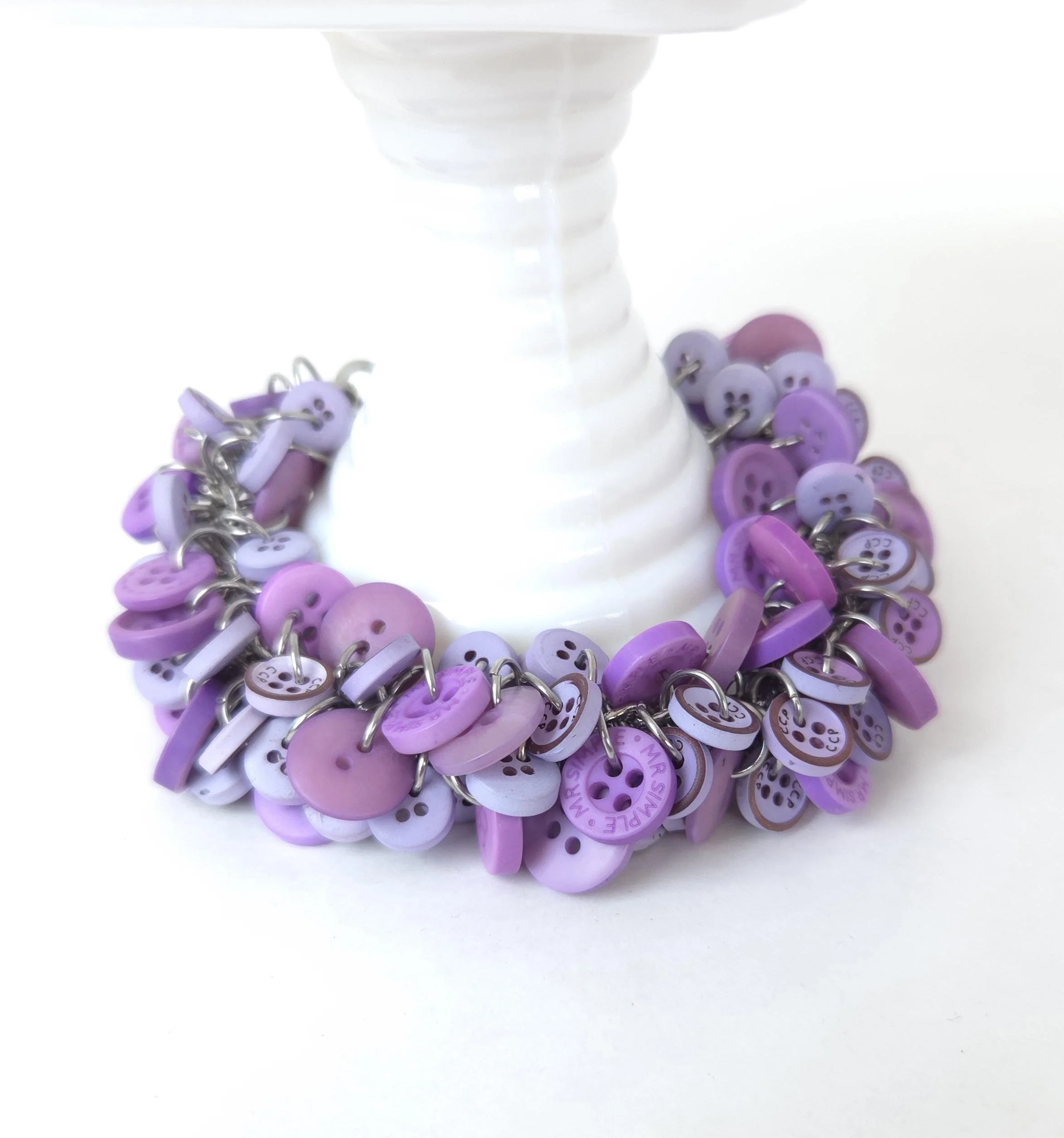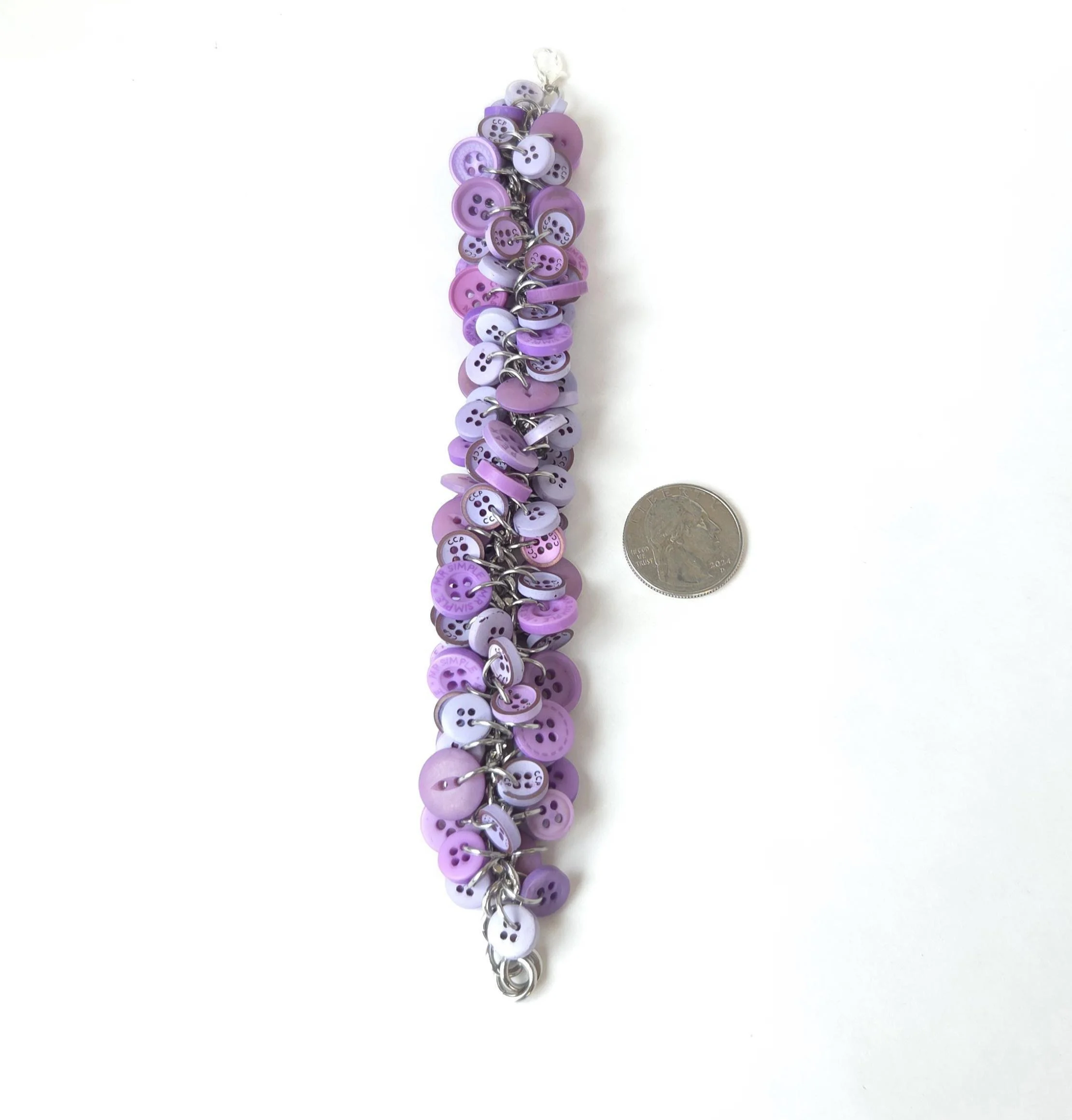 This funky statement bracelet was made with a variety of vintage acrylic buttons in rich shades of light purple in marbled and matte finishes. The buttons hang from a rhodium plated metal chain that features a large lobster claw clasp and a 3/4 inch chain of links for adjustable sizing. This bold, one of a kind piece of jewelry is the perfect gift for folks who love unique accessories.