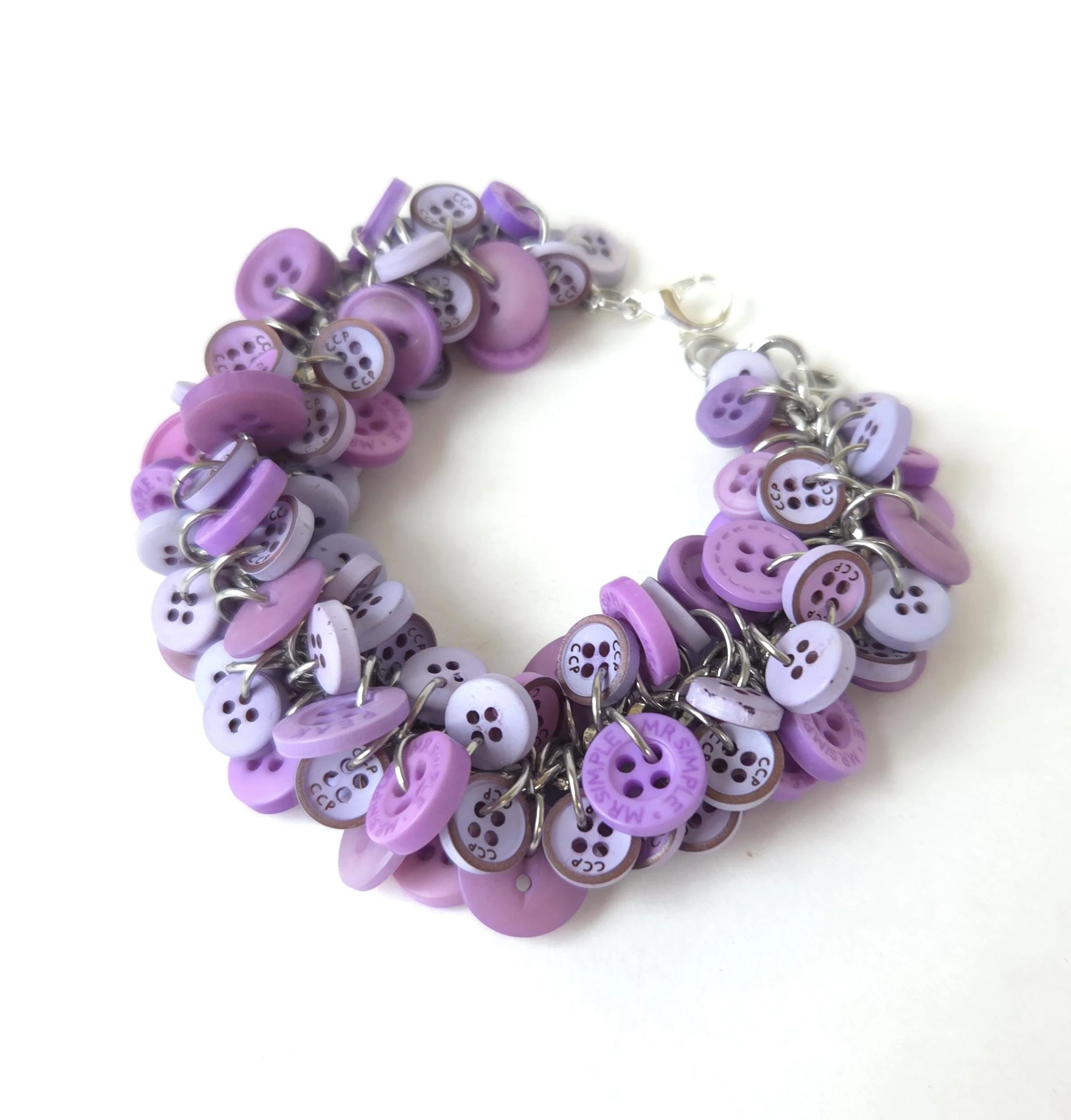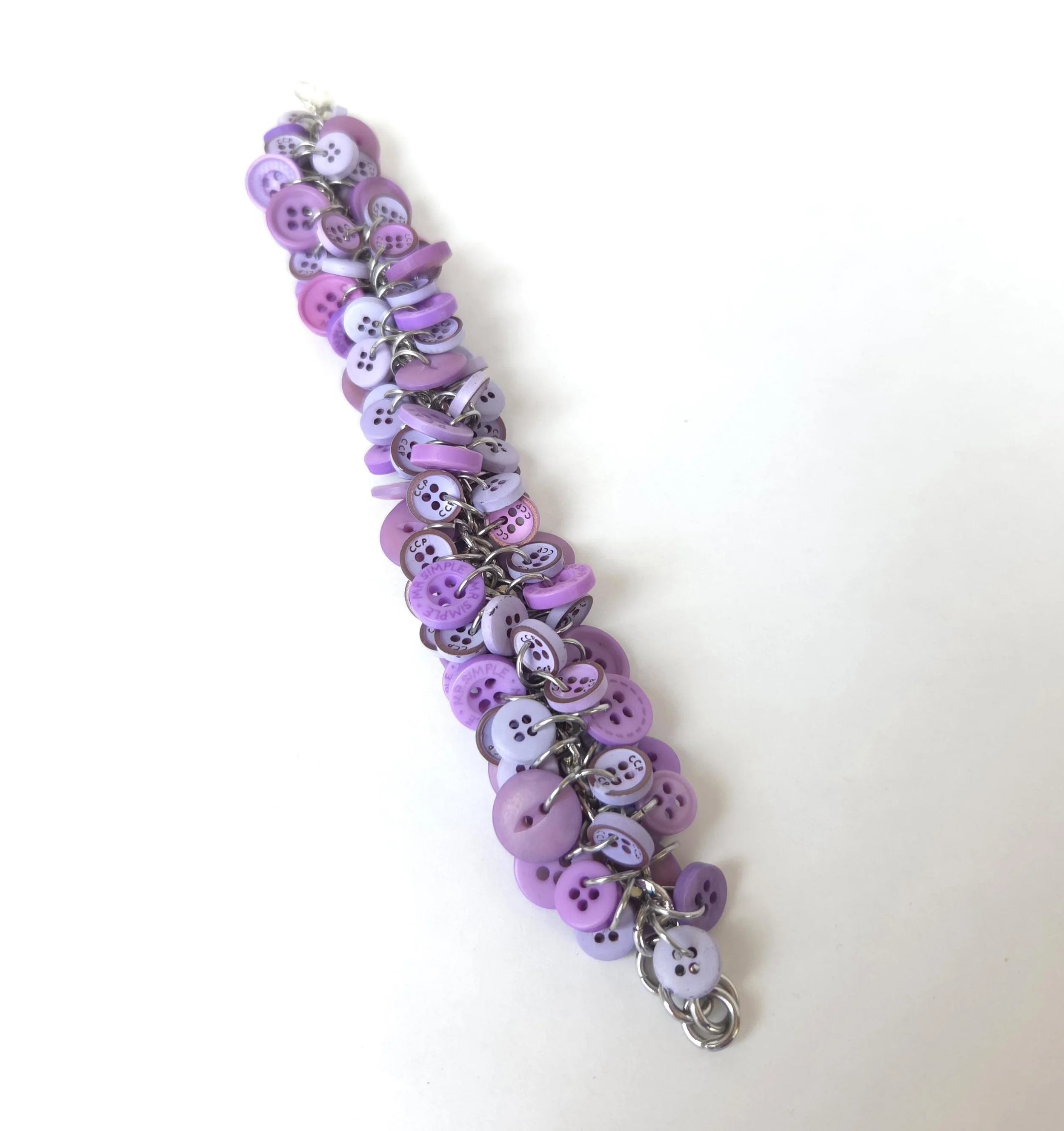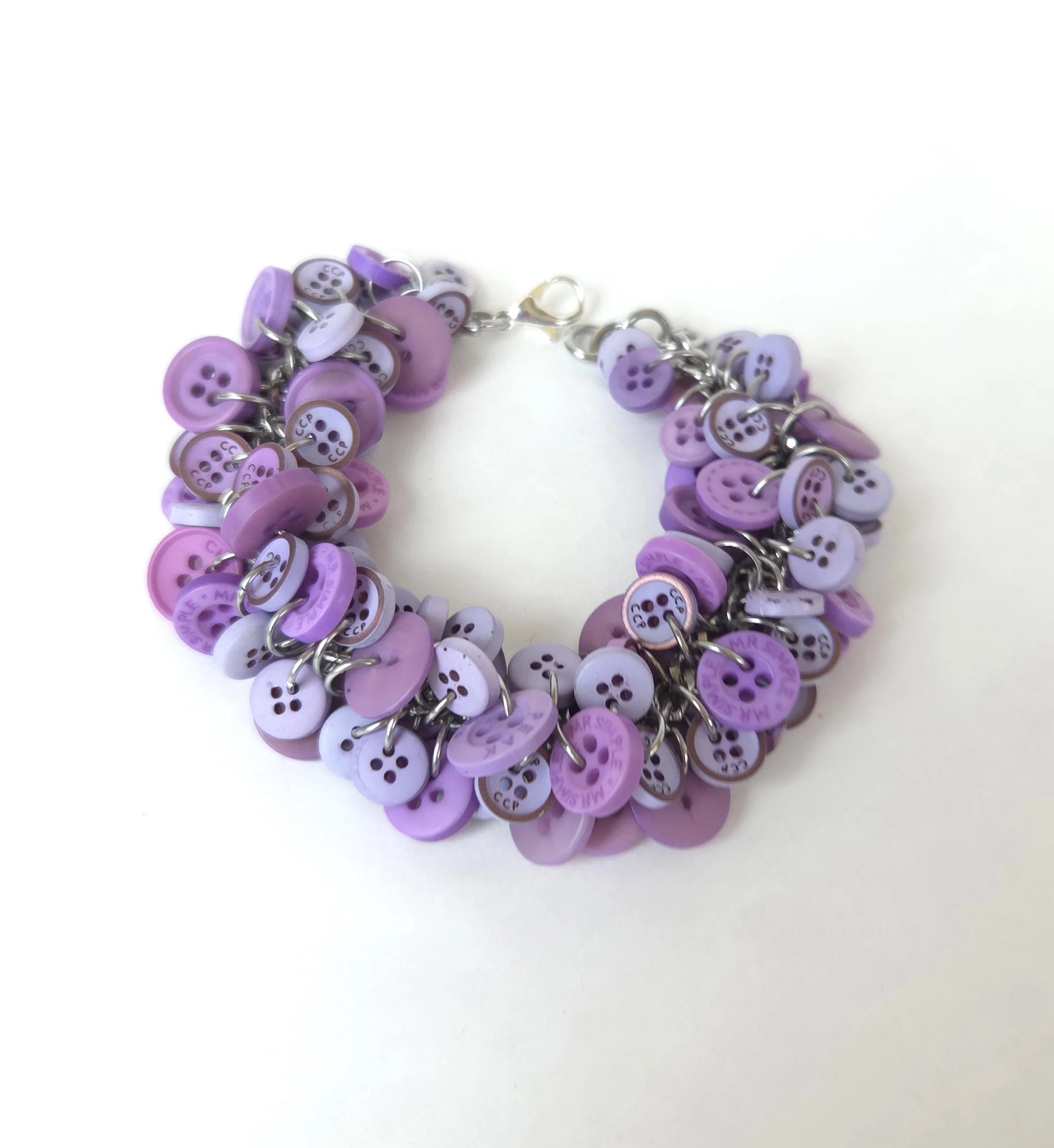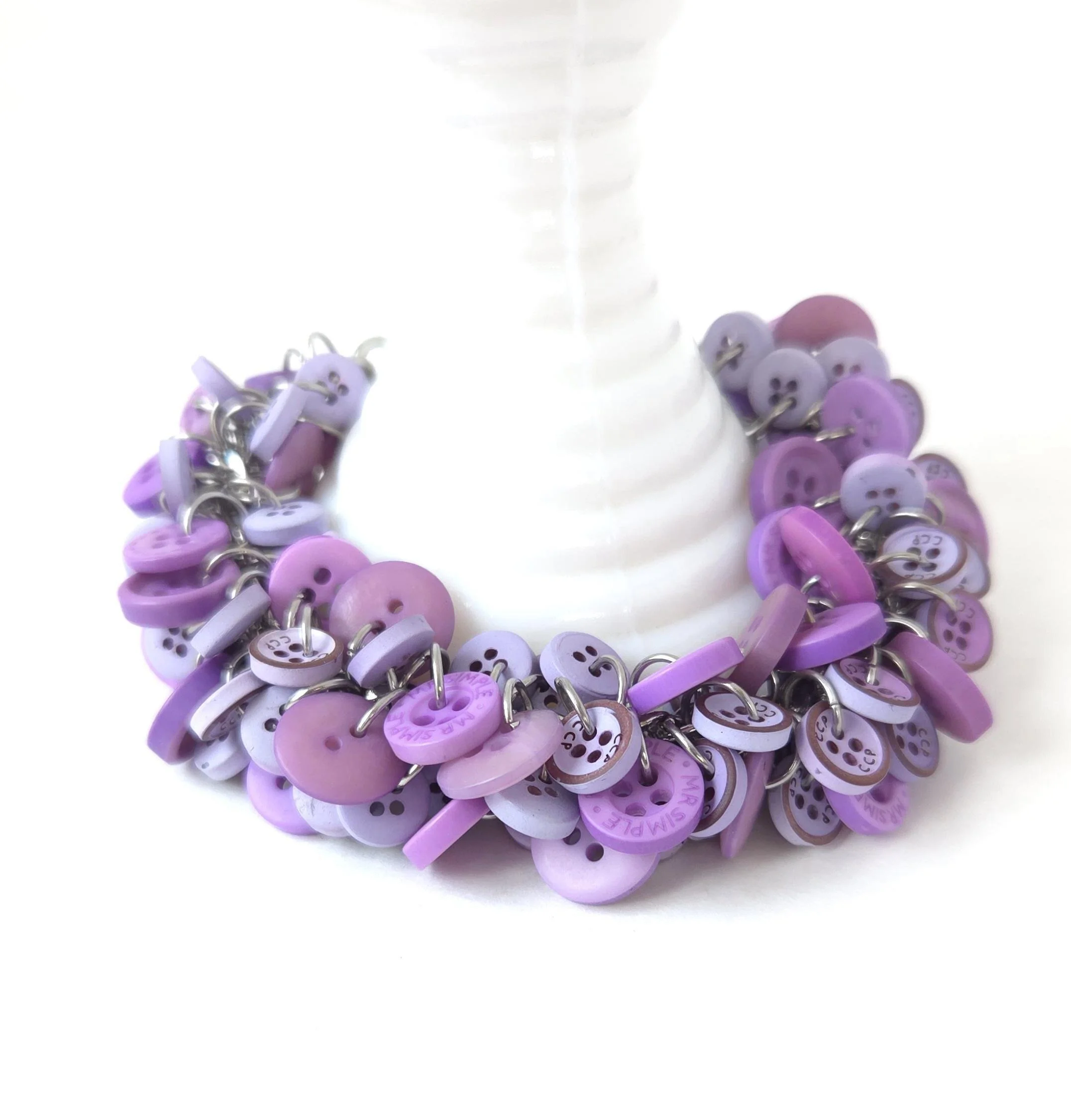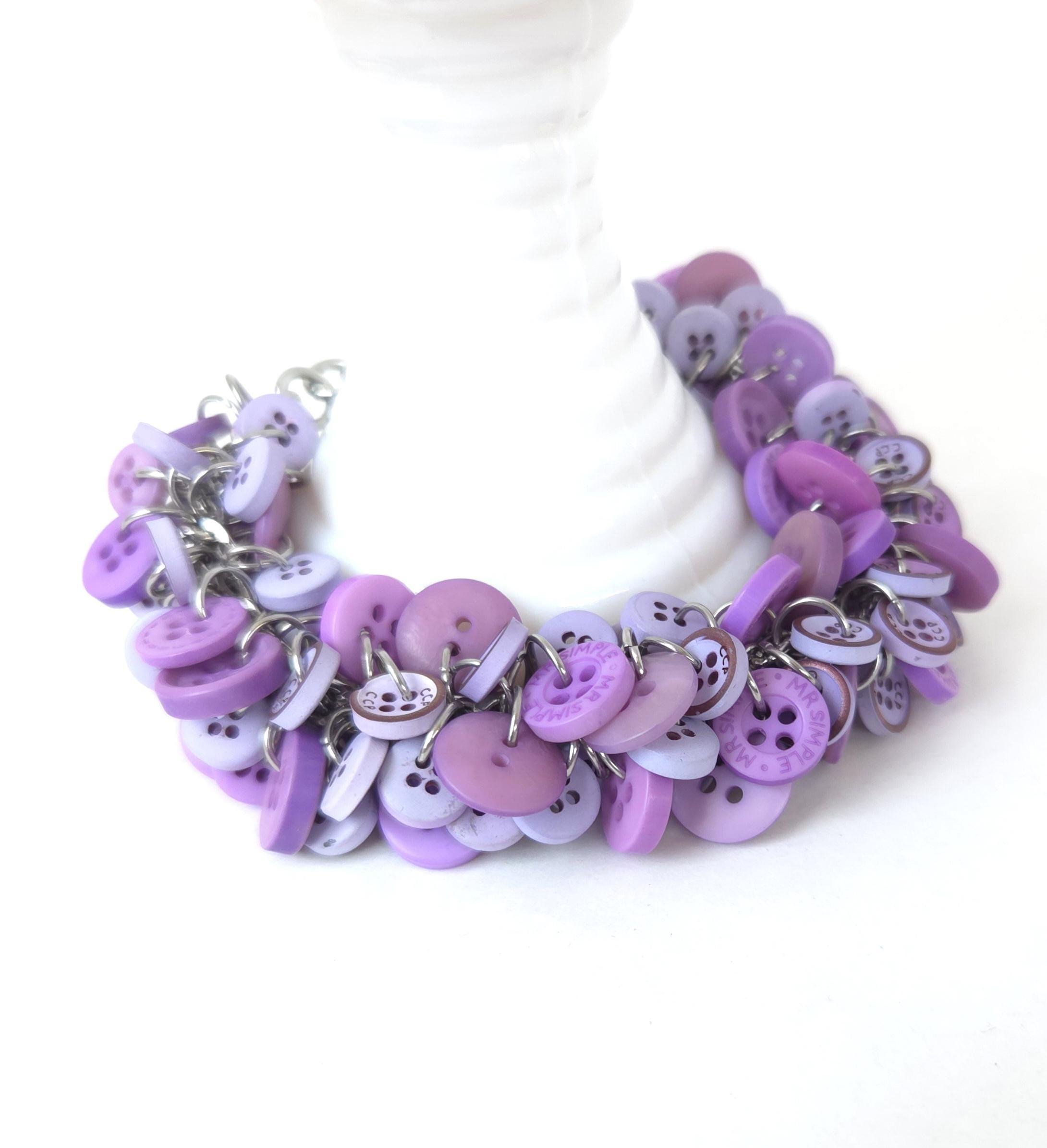 This funky statement bracelet was made with a variety of vintage acrylic buttons in rich shades of light purple in marbled and matte finishes. The buttons hang from a rhodium plated metal chain that features a large lobster claw clasp and a 3/4 inch chain of links for adjustable sizing. This bold, one of a kind piece of jewelry is the perfect gift for folks who love unique accessories.