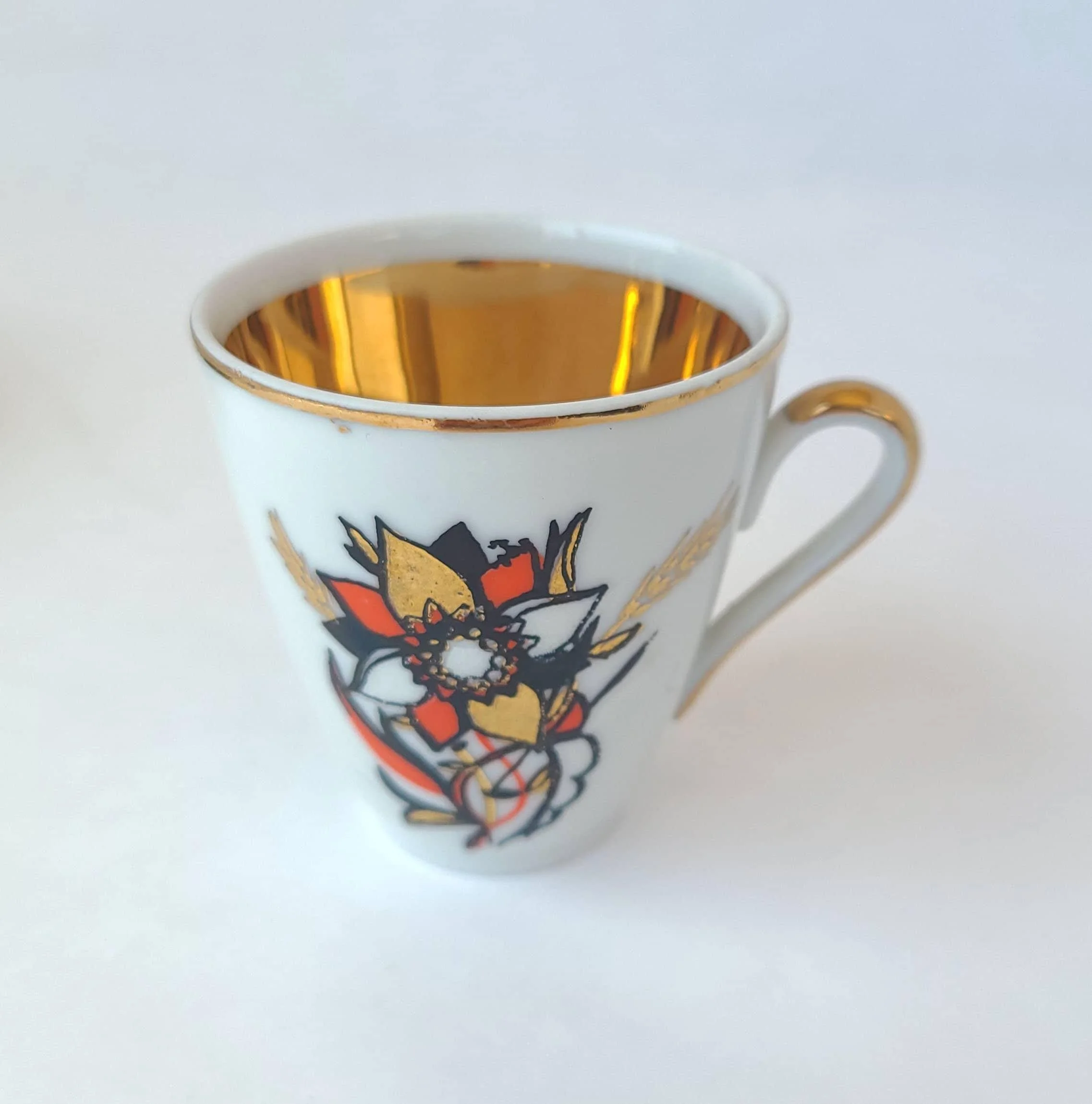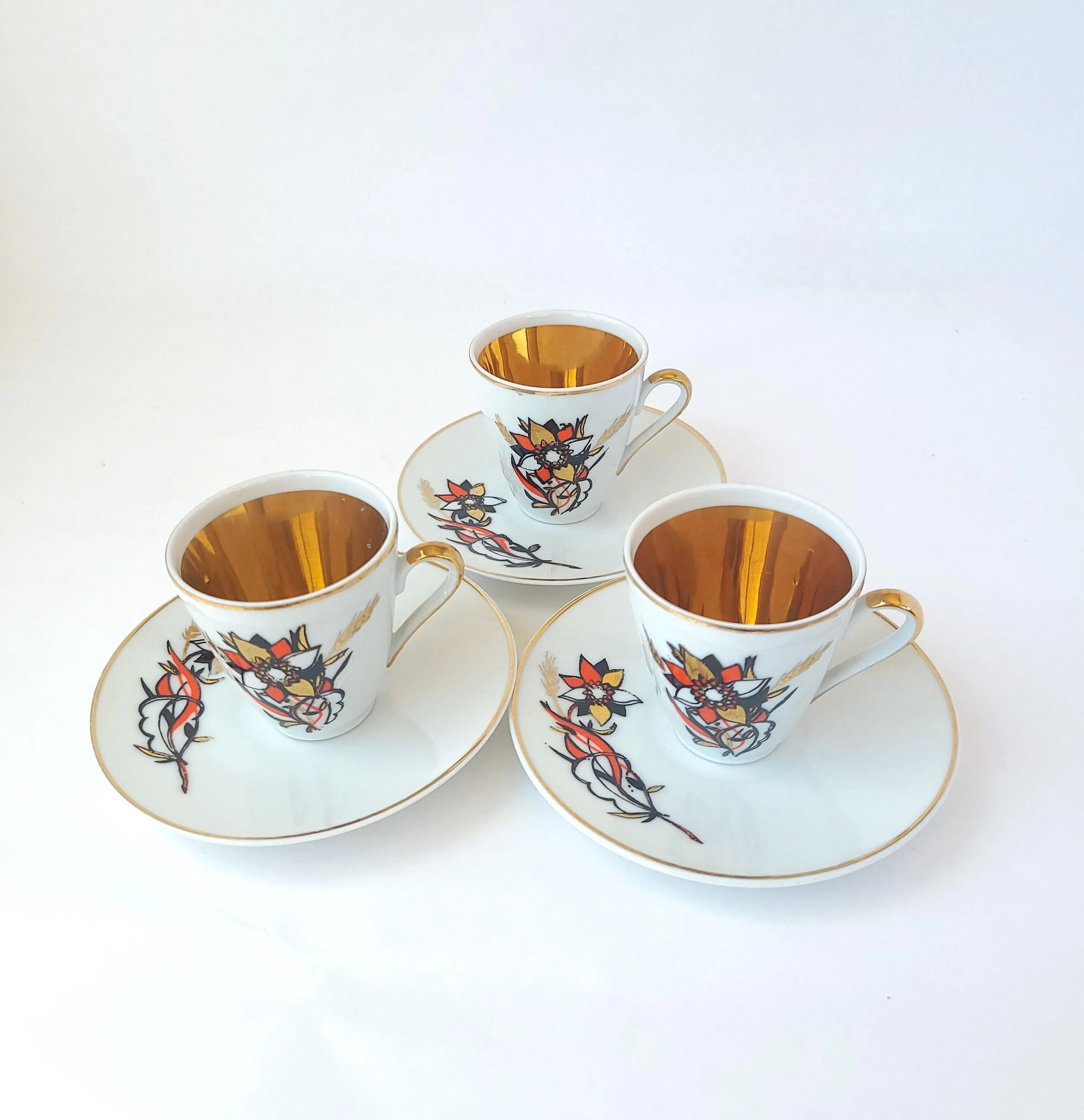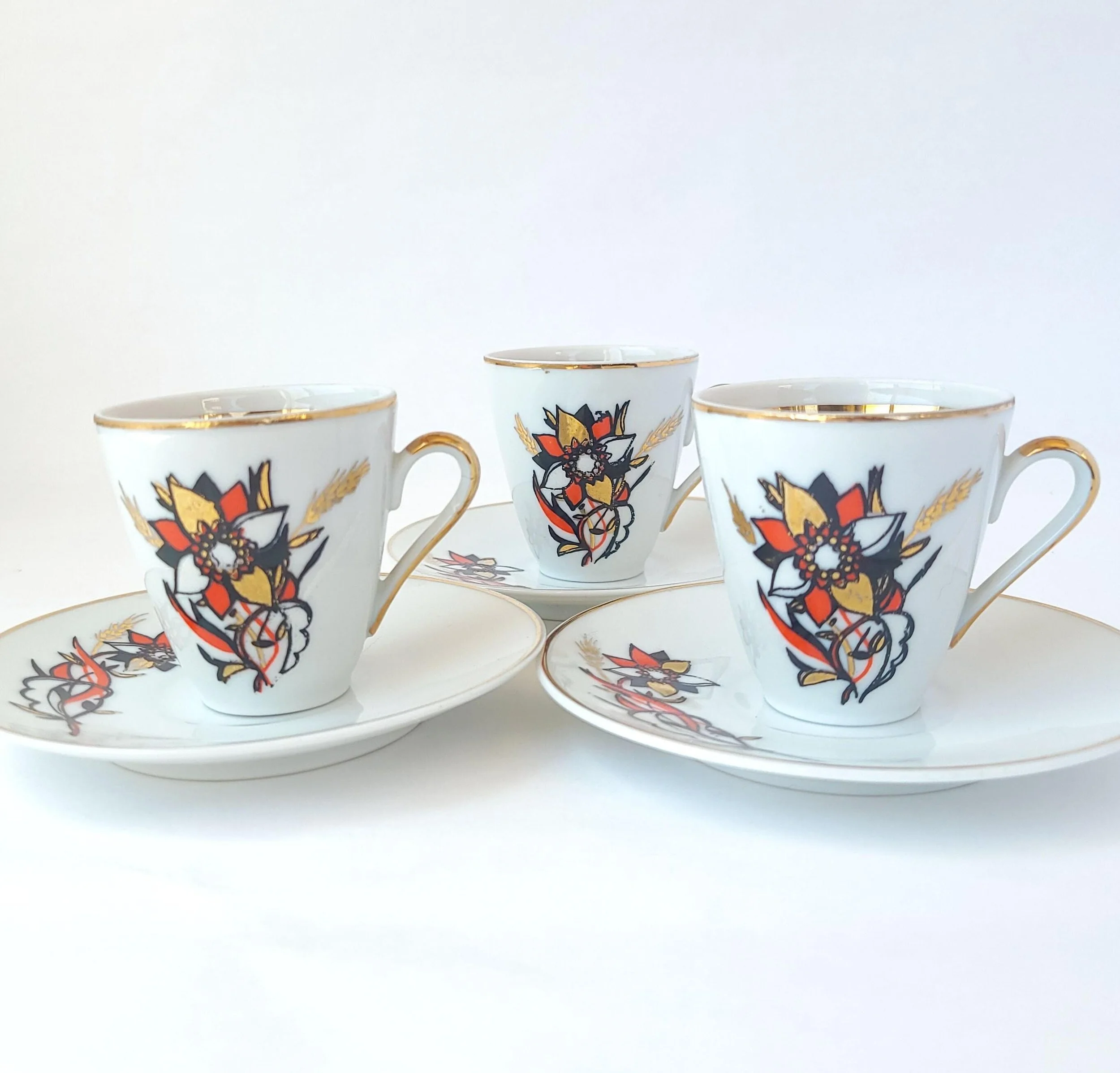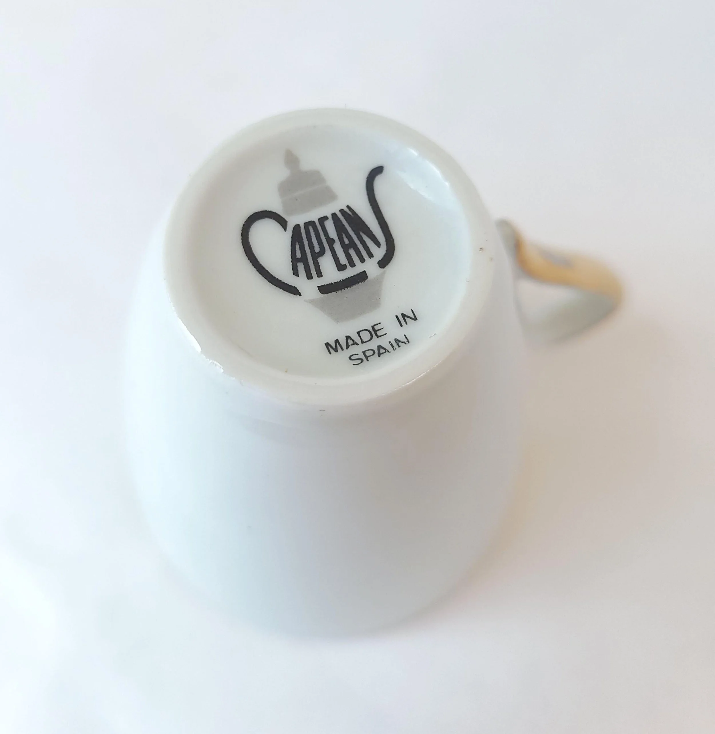 These beautiful vintage mid century porcelain espresso and saucers were made in Spain by Capean. They feature a floral design in gold, black and orange on a white background. The pieces are in good used condition with no chips or cracks, there is some paint loss in spots - but excellent overall color quality.