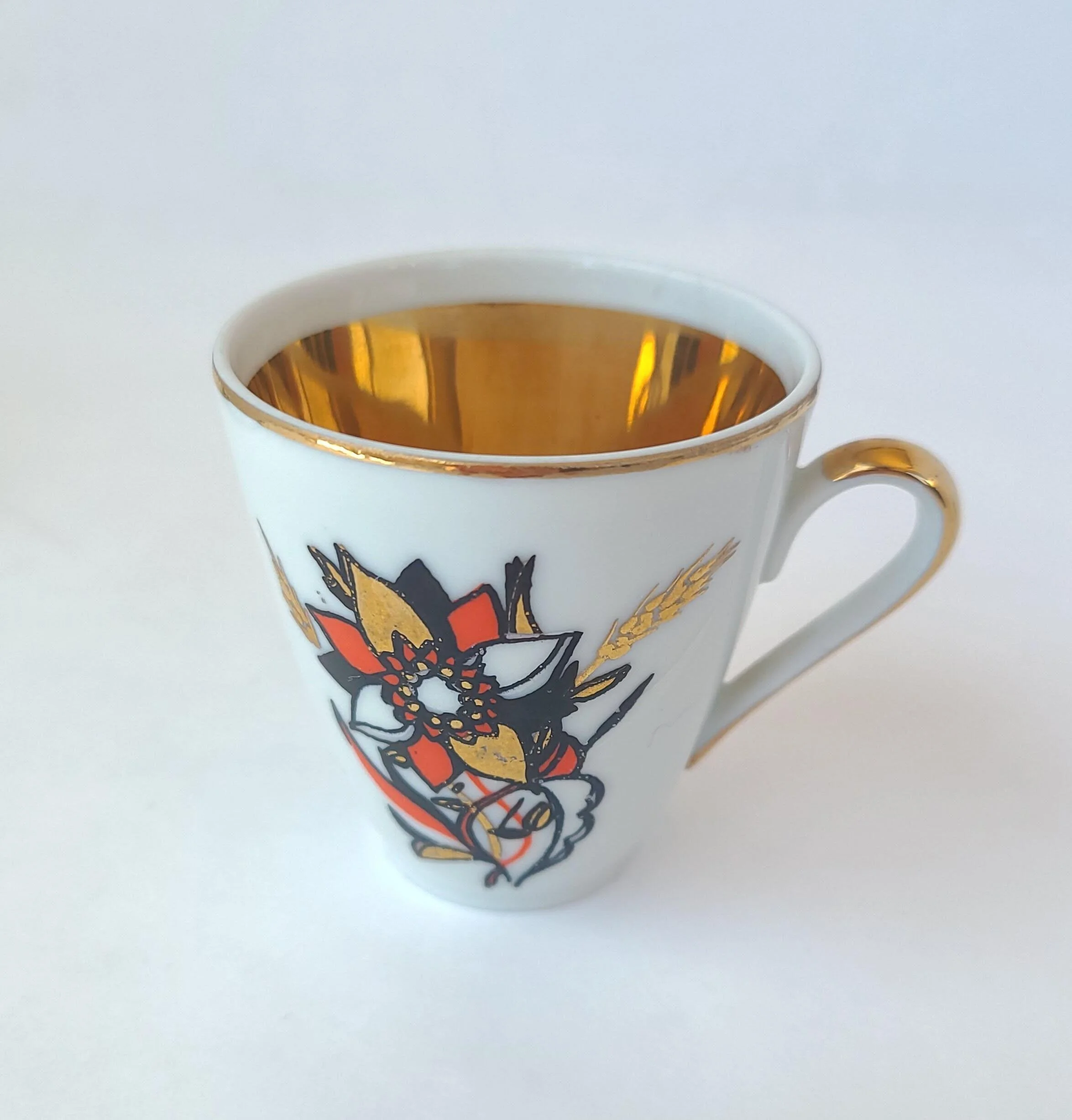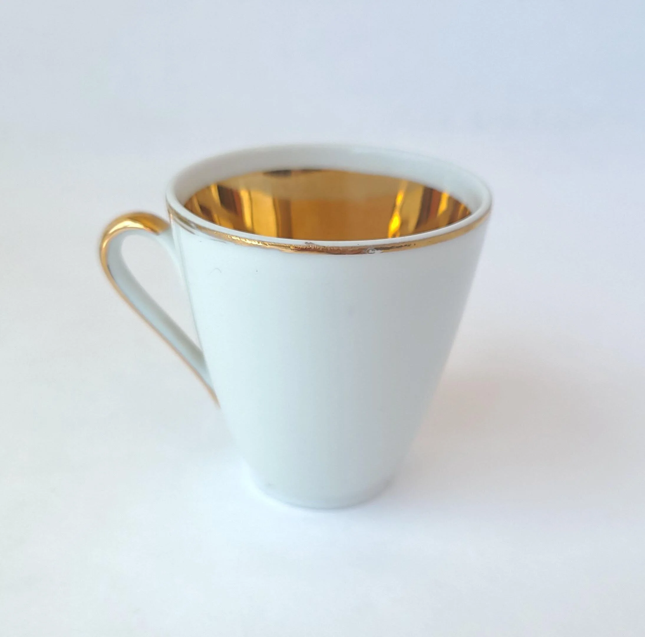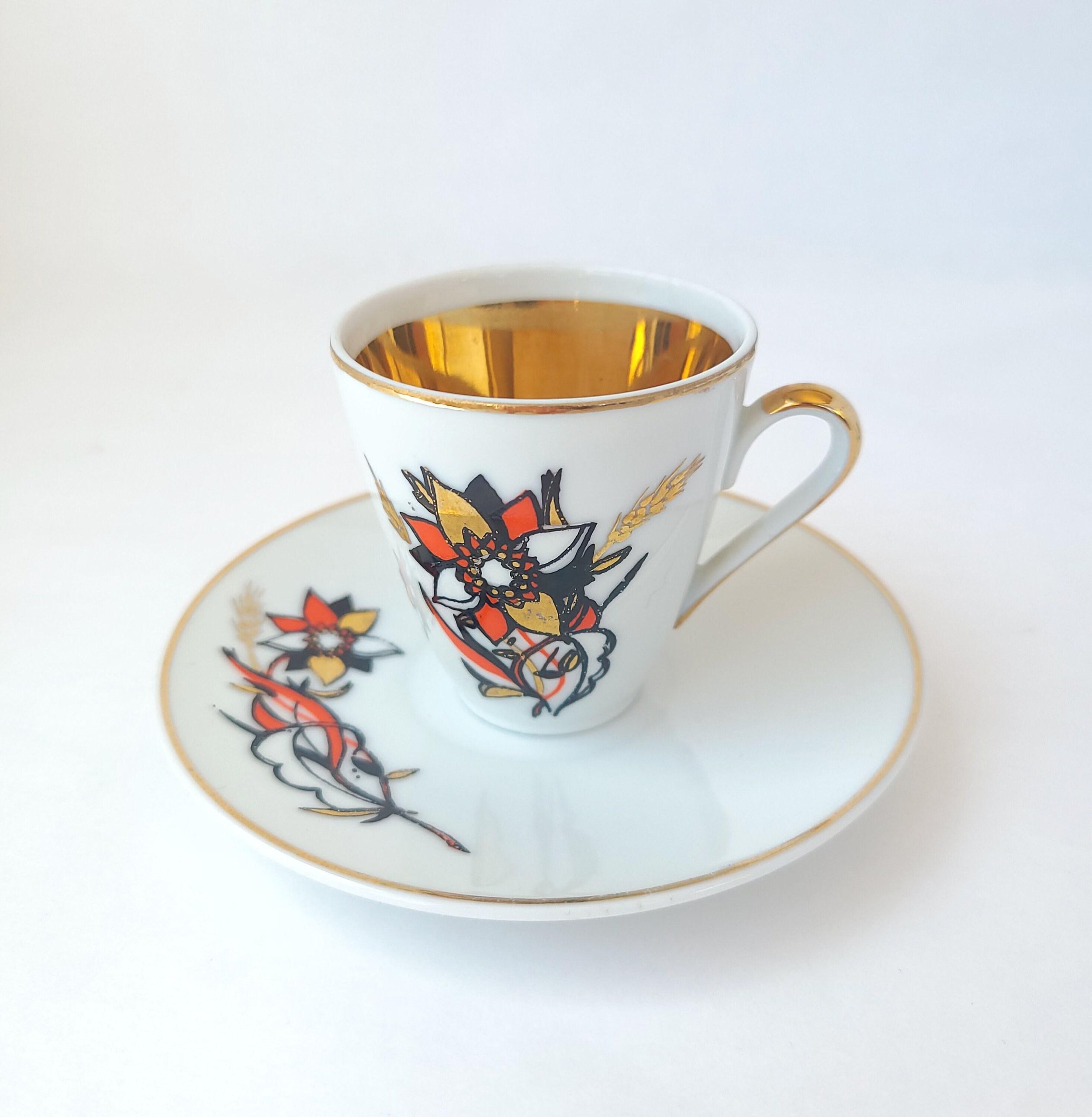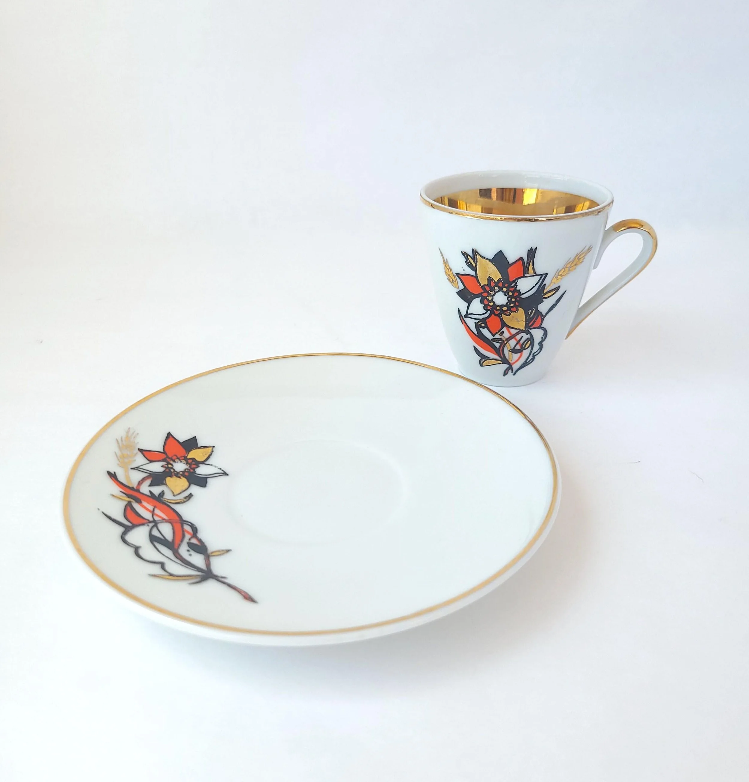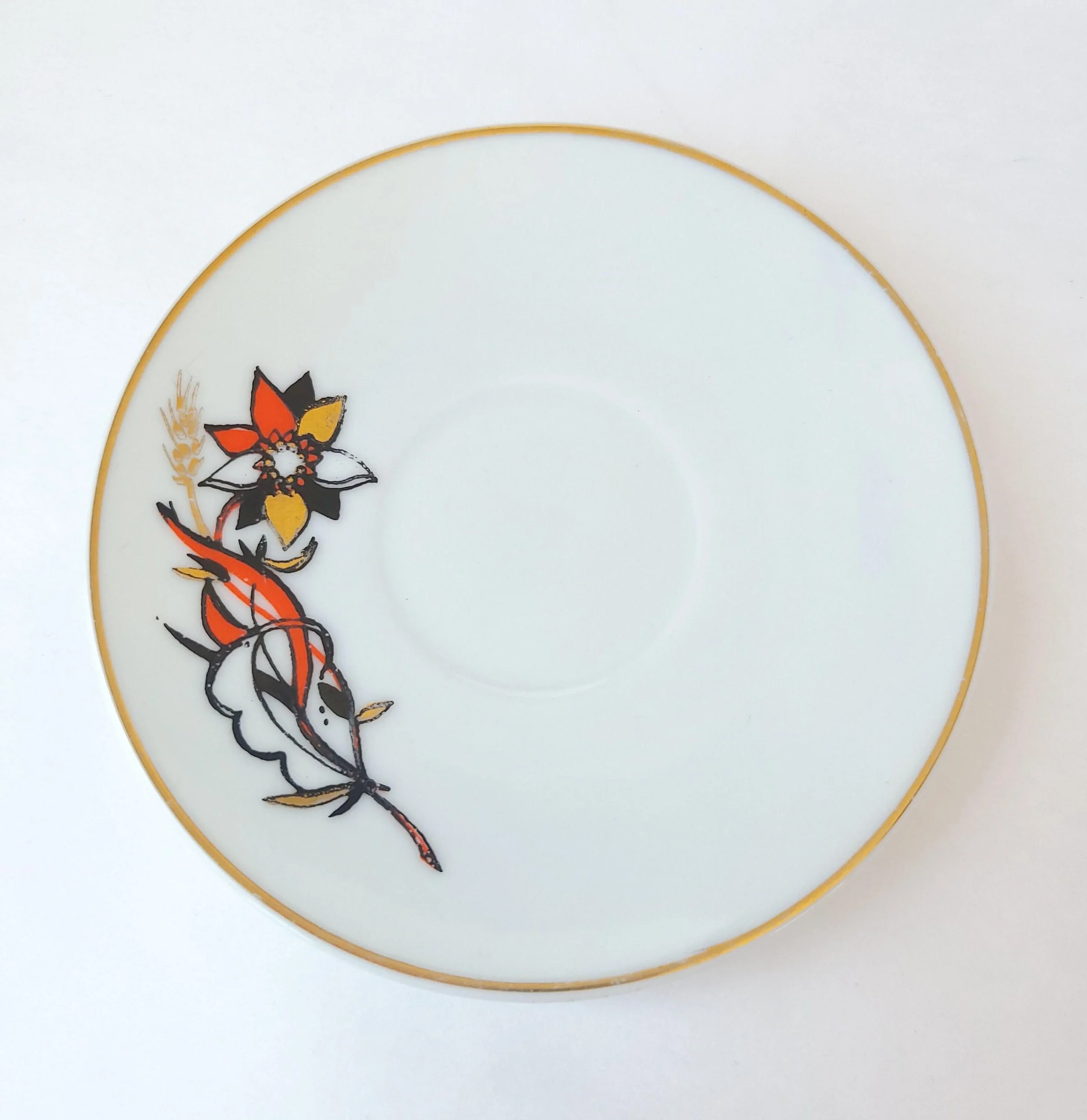 These beautiful vintage mid century porcelain espresso and saucers were made in Spain by Capean. They feature a floral design in gold, black and orange on a white background. The pieces are in good used condition with no chips or cracks, there is some paint loss in spots - but excellent overall color quality.