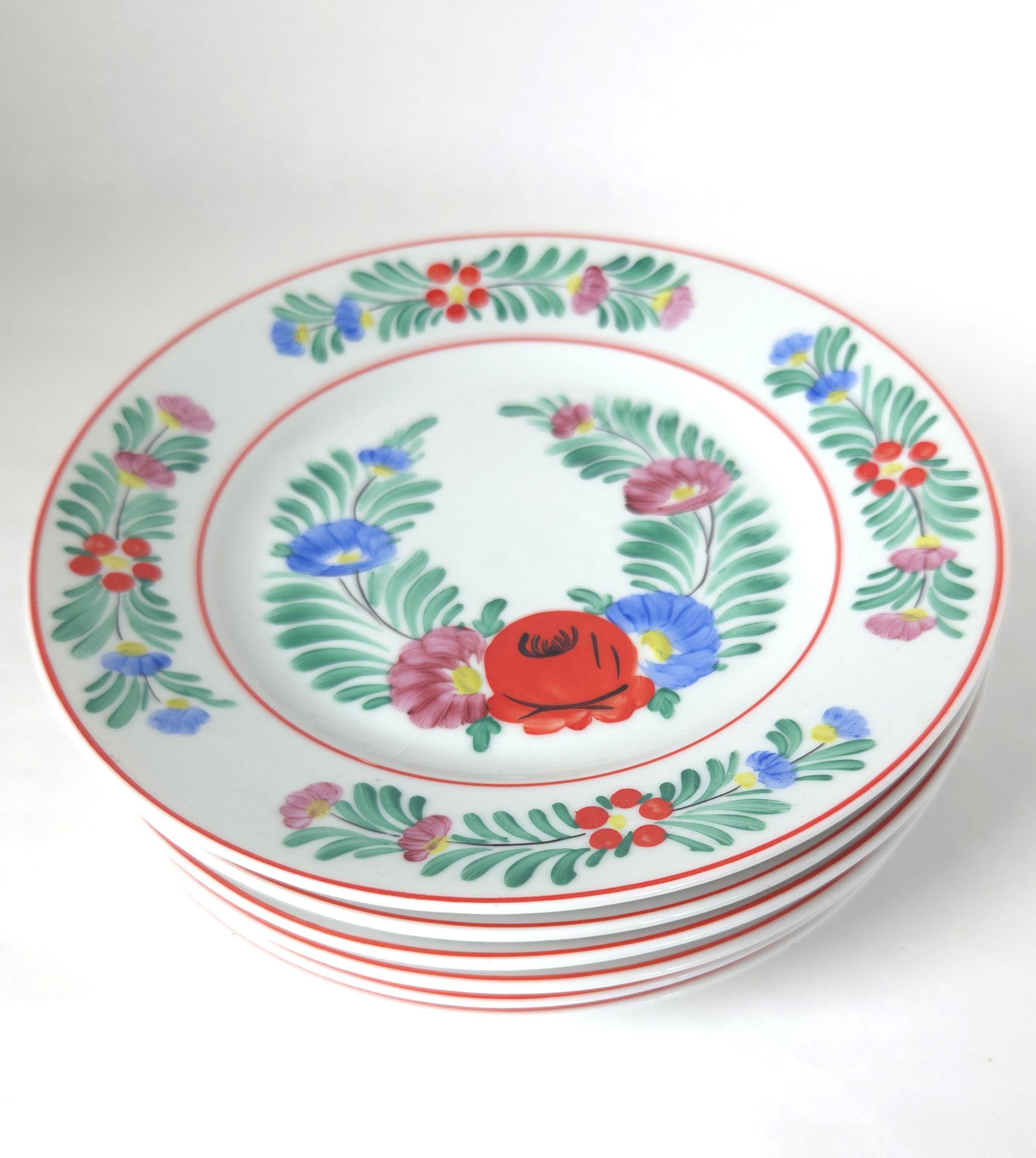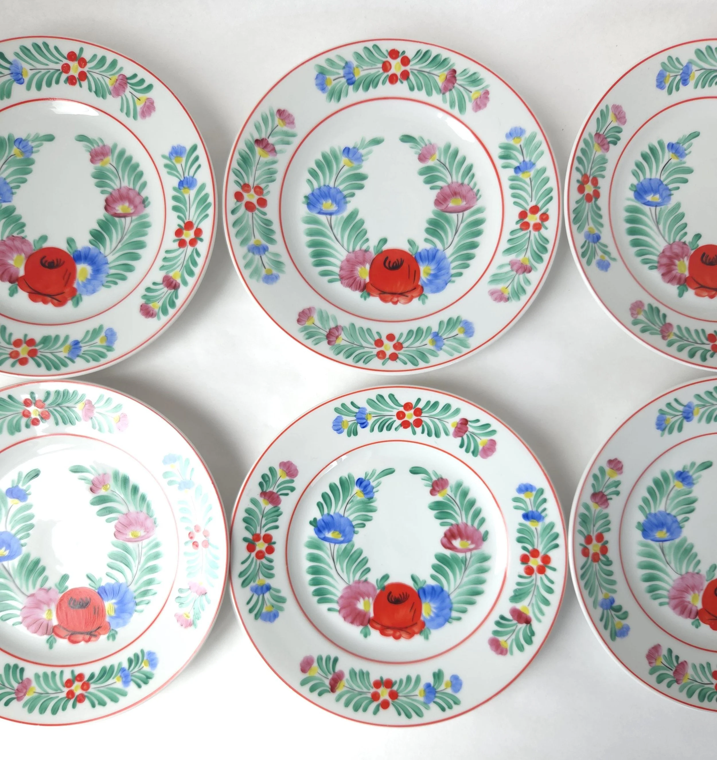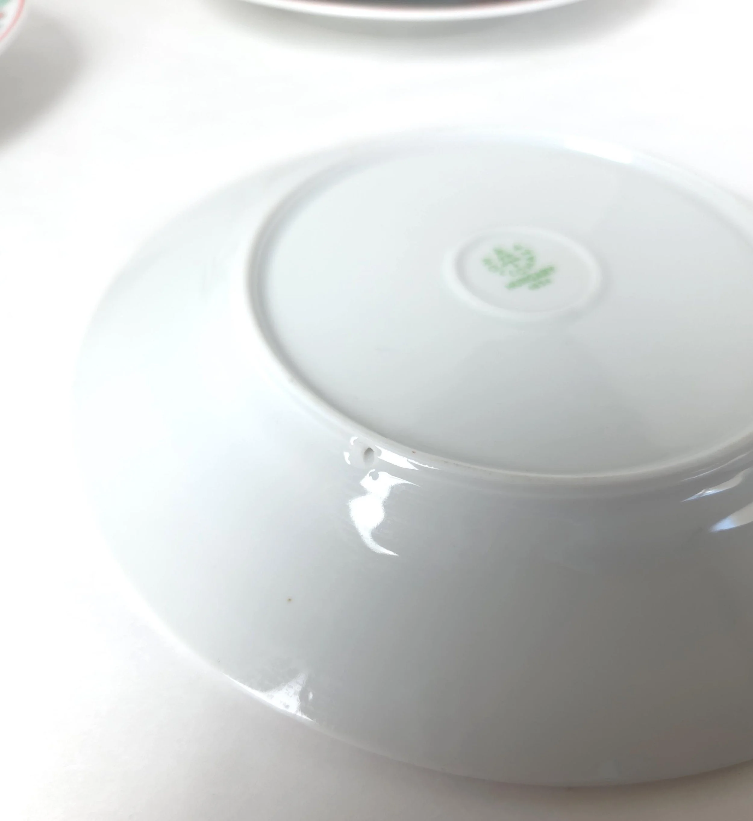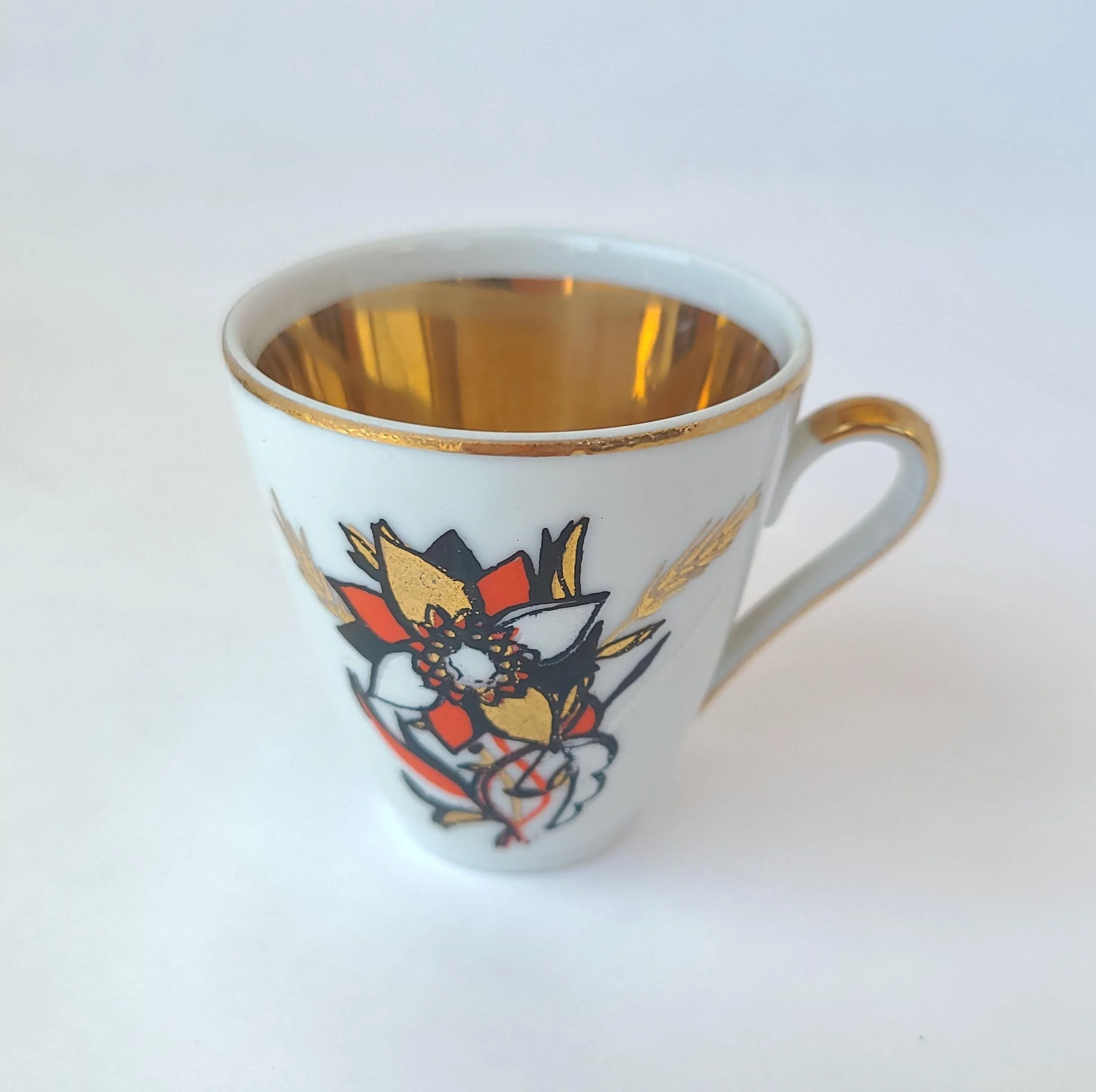 These beautiful vintage mid century porcelain espresso and saucers were made in Spain by Capean. They feature a floral design in gold, black and orange on a white background. The pieces are in good used condition with no chips or cracks, there is some paint loss in spots - but excellent overall color quality.