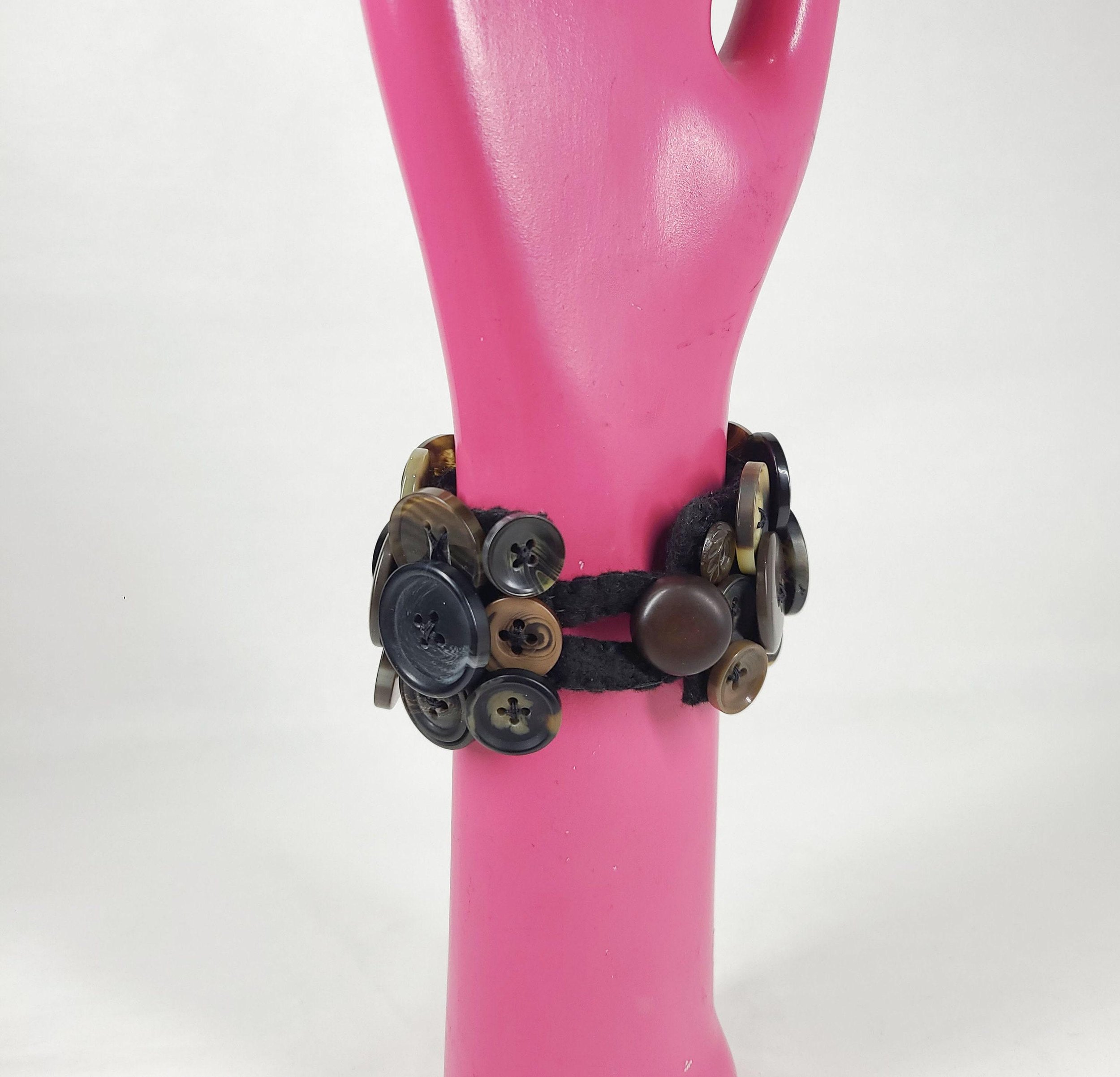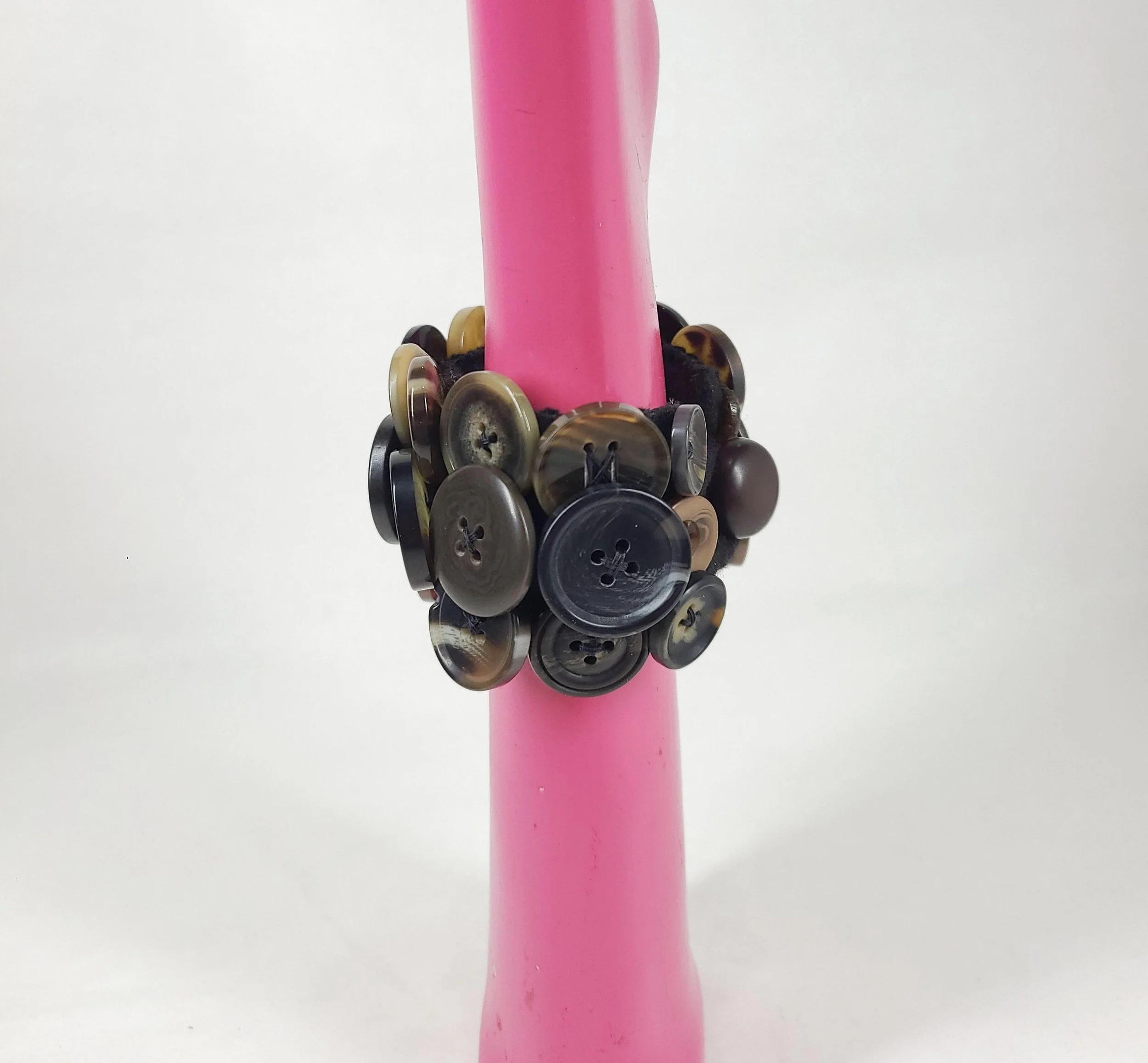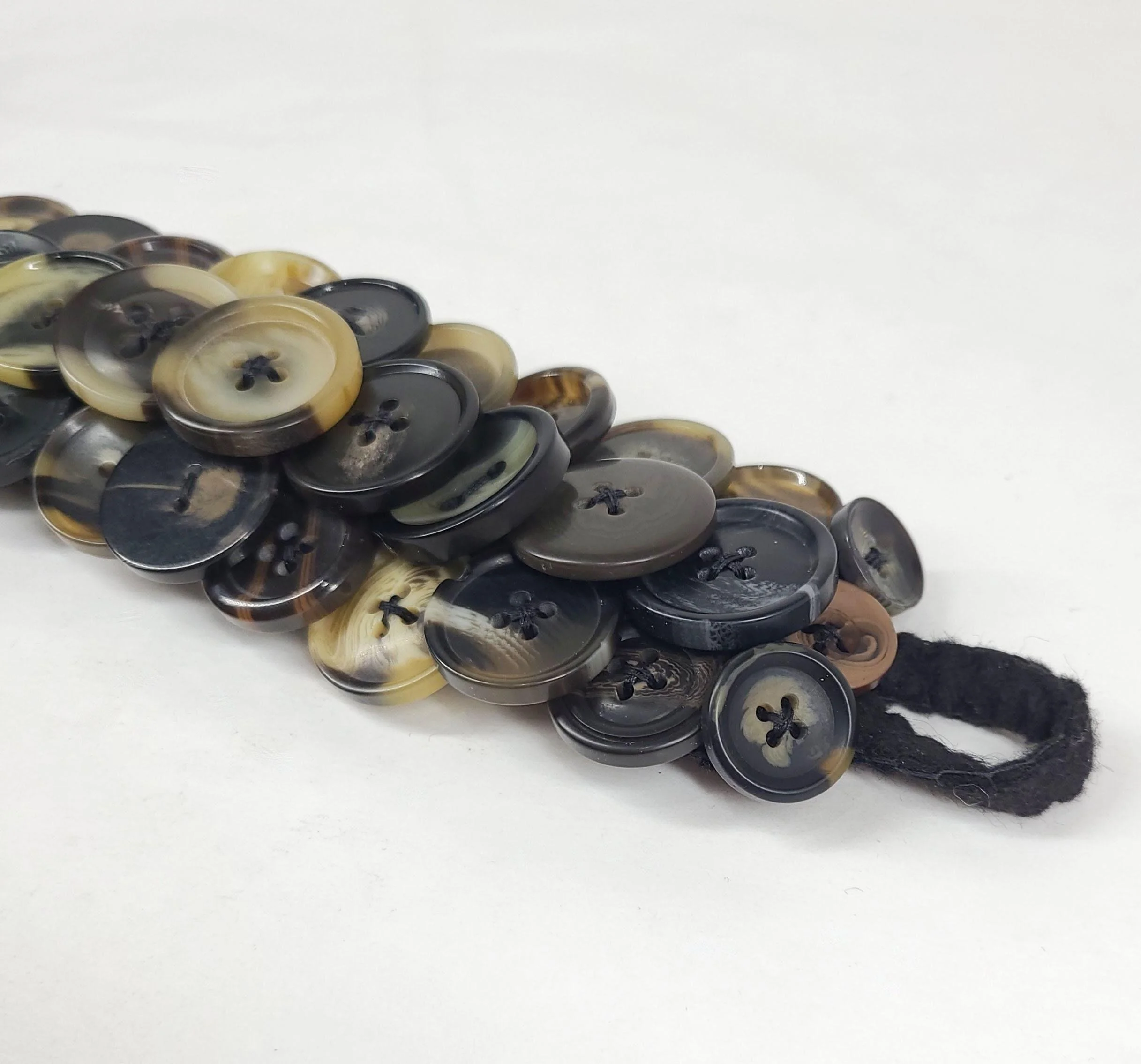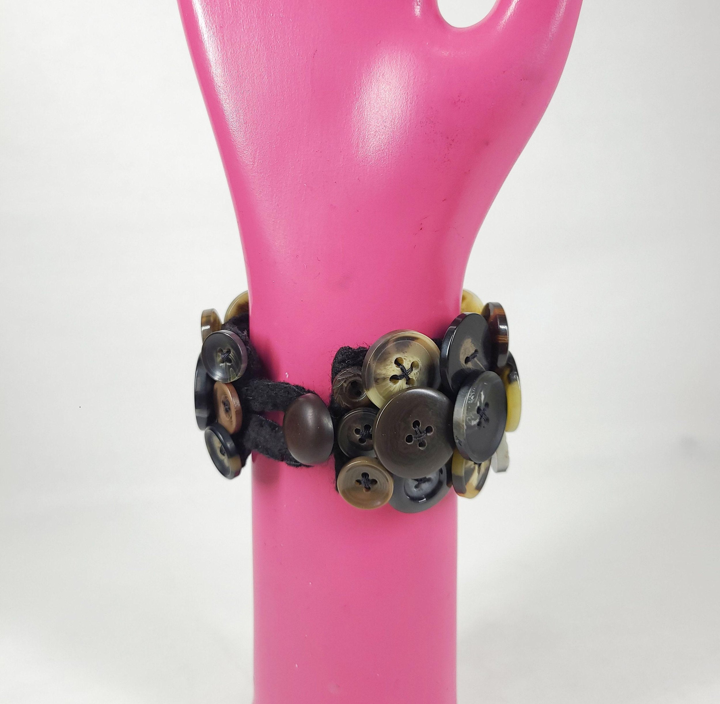 This chunky, funky, one of a kind bracelet was made with a variety of vintage buttons in faux tortoise shell in shades of black, brown and beige, that have been hand stitched onto a acrylic felt backing. The buttons are from the 1950's through the 1990's and are made from various forms of resin in an assortment of sizes, textures and designs. The bracelet is made with several layers of soft felt for extra comfort with an easy button and loop toggle closure. The buttons are used vintage pieces, so there may be some minor scratches or nicks due to their age.