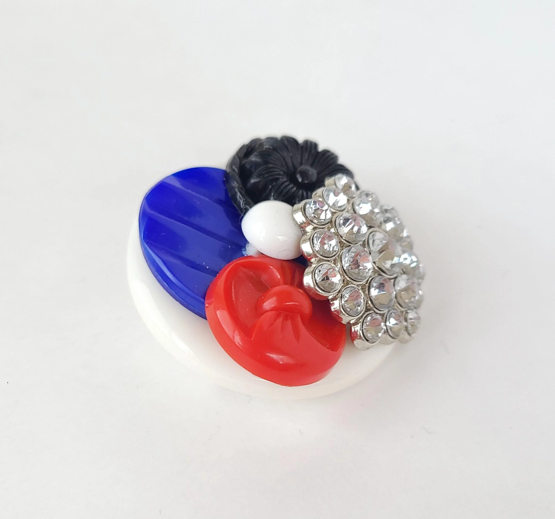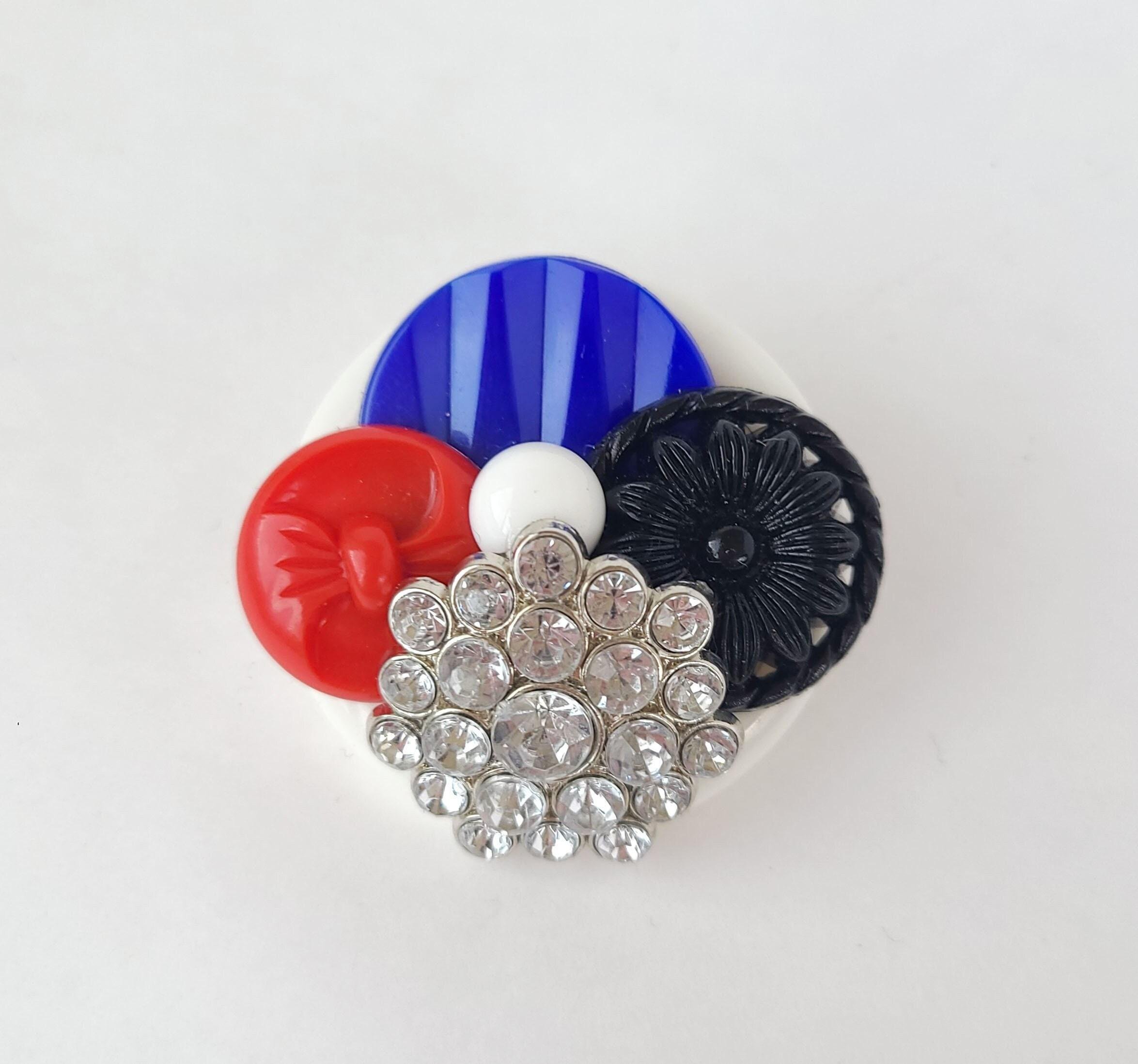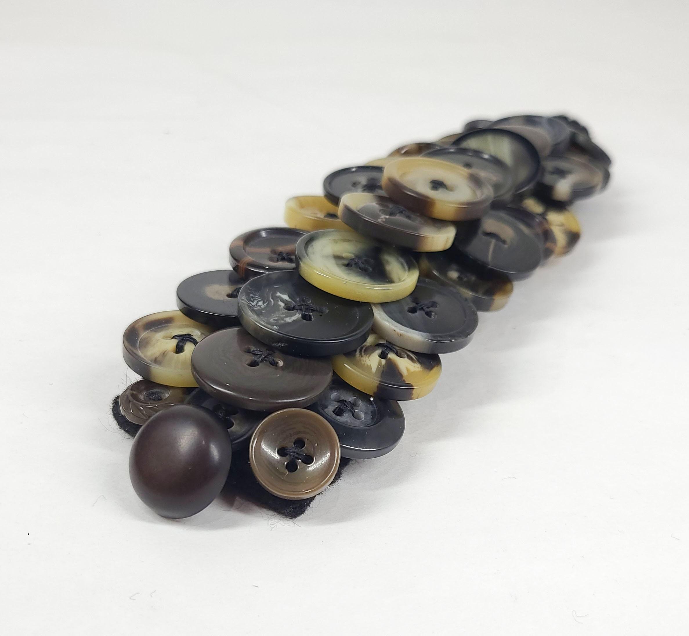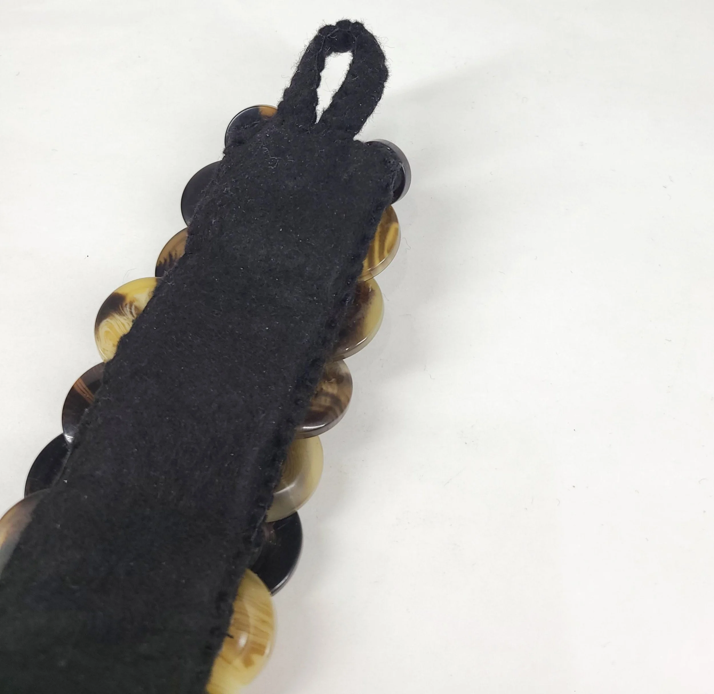 This chunky, funky, one of a kind bracelet was made with a variety of vintage buttons in faux tortoise shell in shades of black, brown and beige, that have been hand stitched onto a acrylic felt backing. The buttons are from the 1950's through the 1990's and are made from various forms of resin in an assortment of sizes, textures and designs. The bracelet is made with several layers of soft felt for extra comfort with an easy button and loop toggle closure. The buttons are used vintage pieces, so there may be some minor scratches or nicks due to their age.