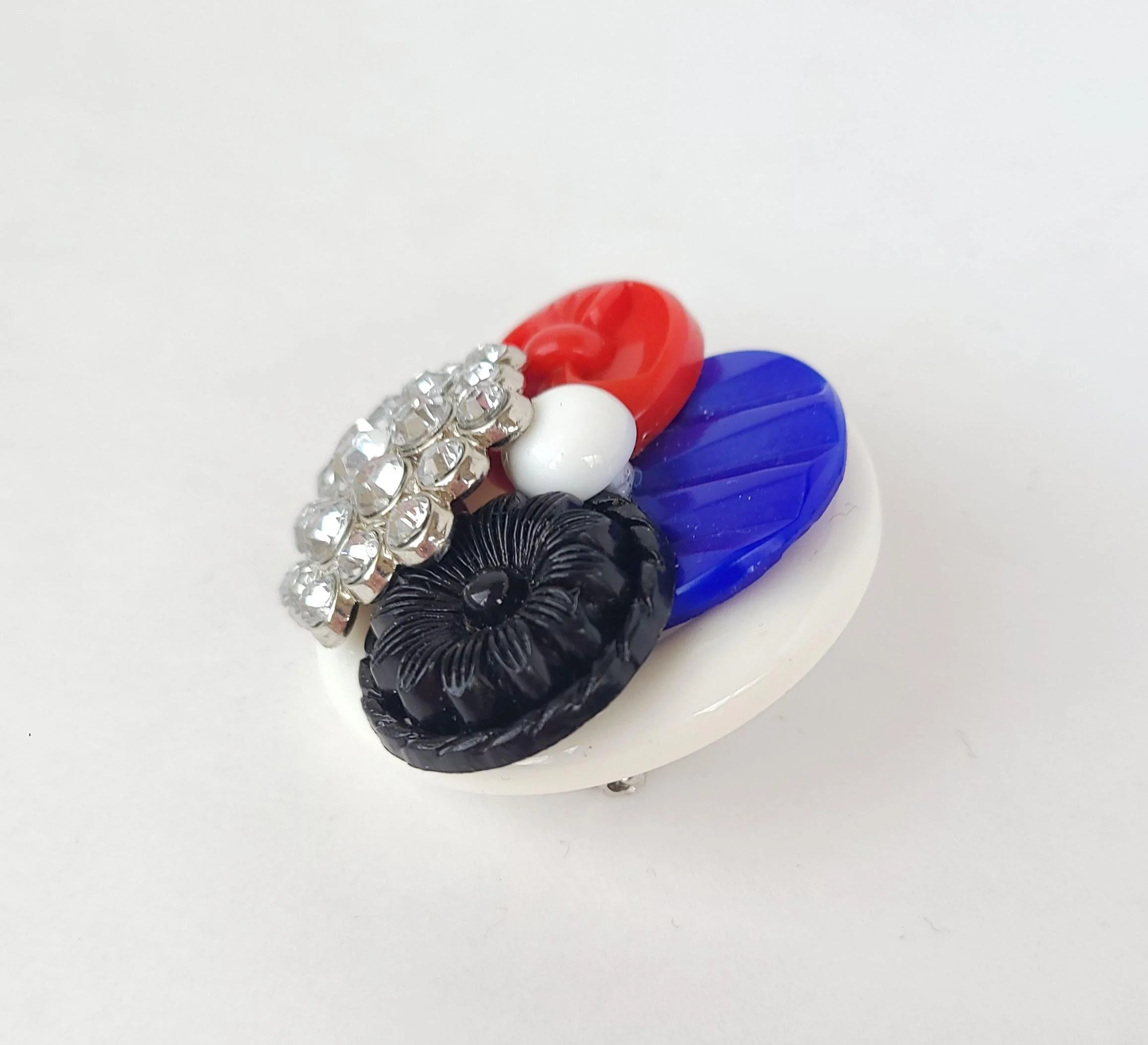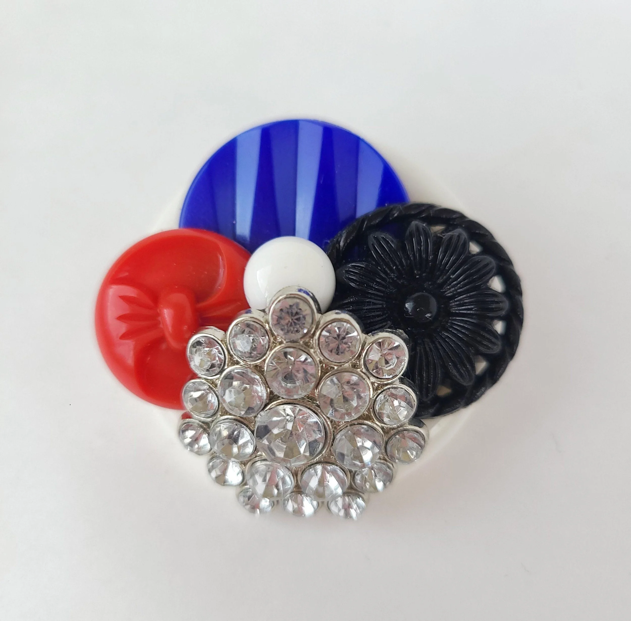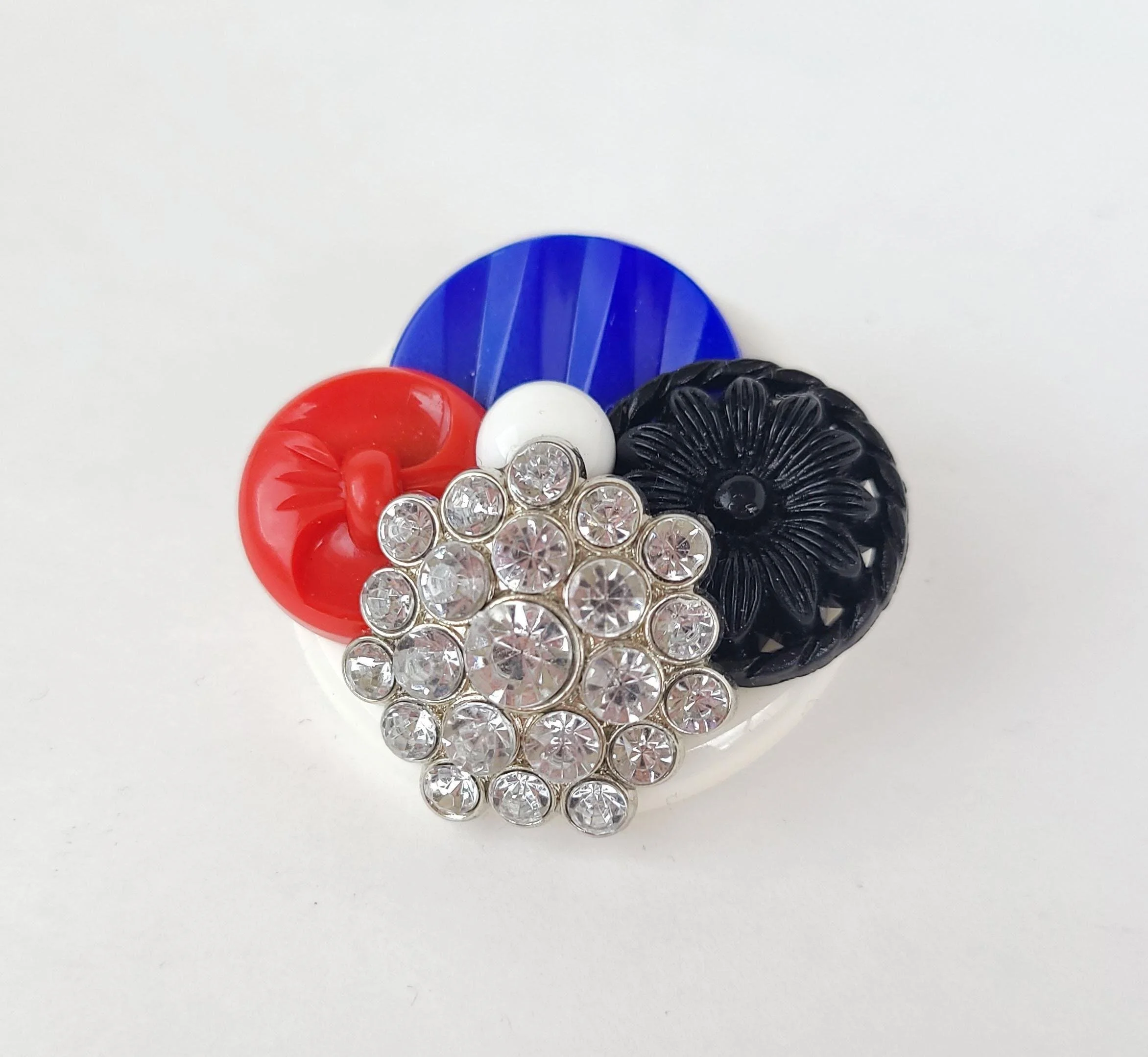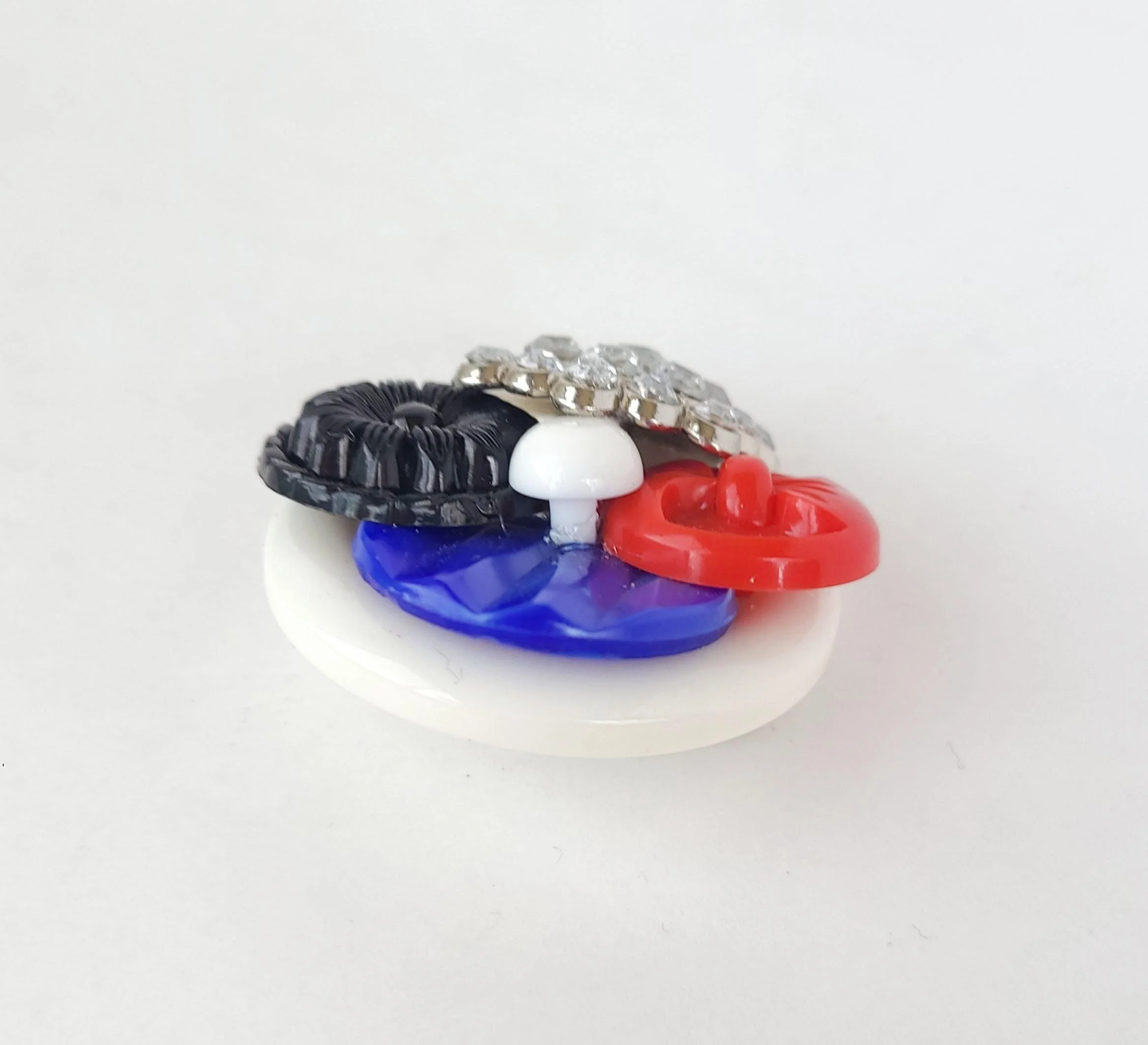 This chunky, funky, one of a kind bracelet was made with a variety of vintage buttons in faux tortoise shell in shades of black, brown and beige, that have been hand stitched onto a acrylic felt backing. The buttons are from the 1950's through the 1990's and are made from various forms of resin in an assortment of sizes, textures and designs. The bracelet is made with several layers of soft felt for extra comfort with an easy button and loop toggle closure. The buttons are used vintage pieces, so there may be some minor scratches or nicks due to their age.