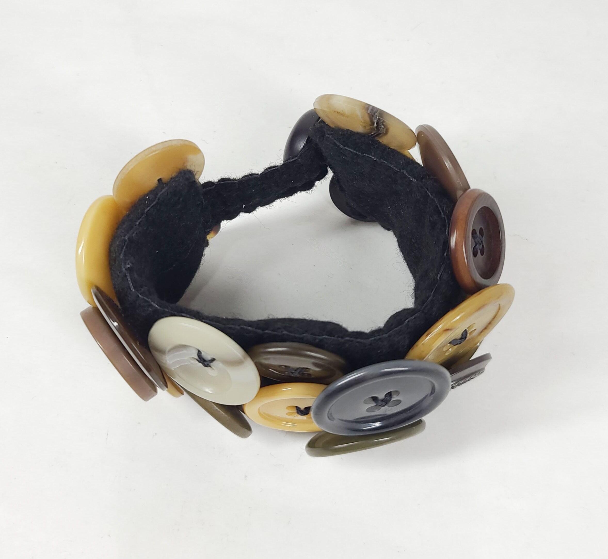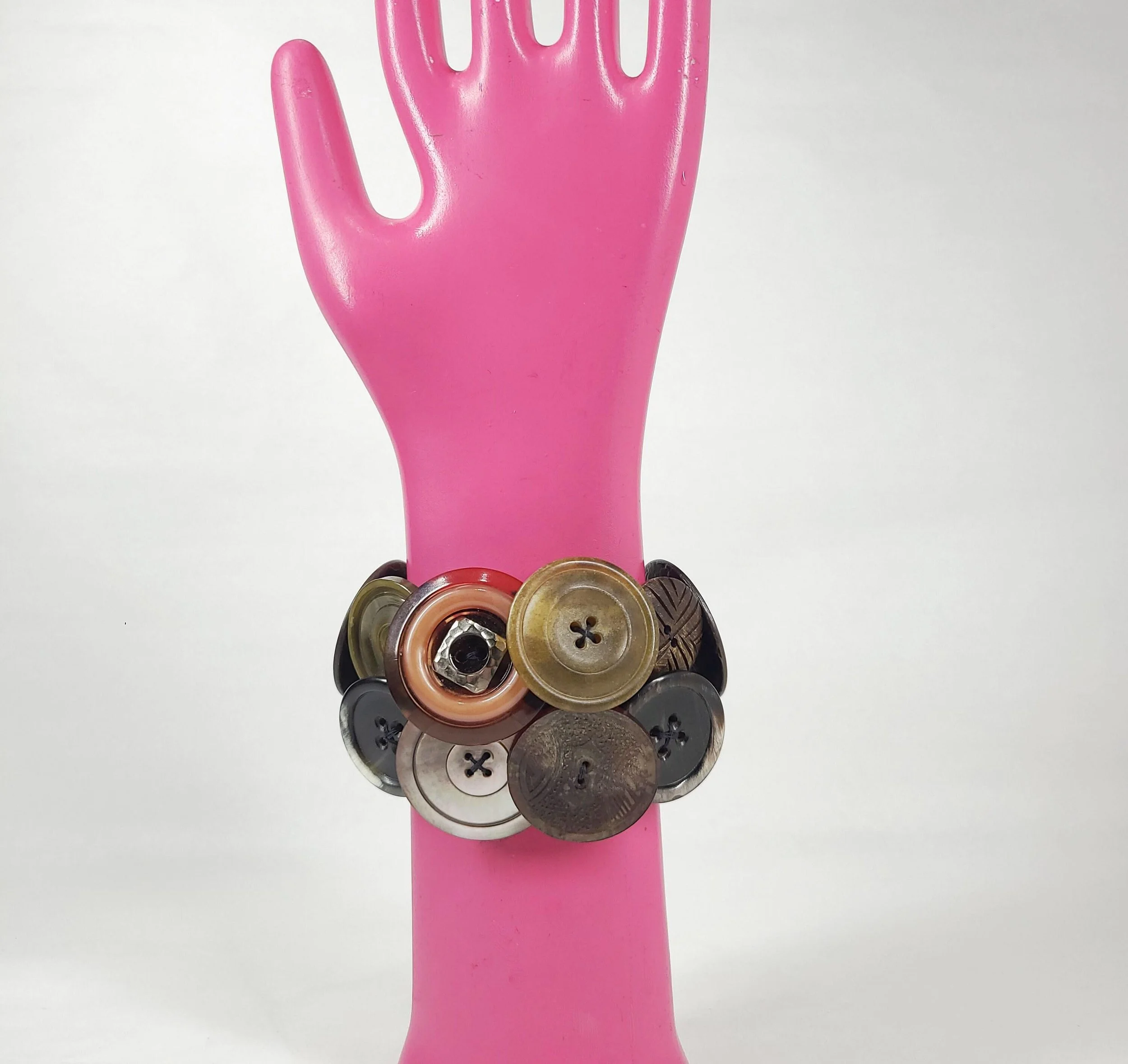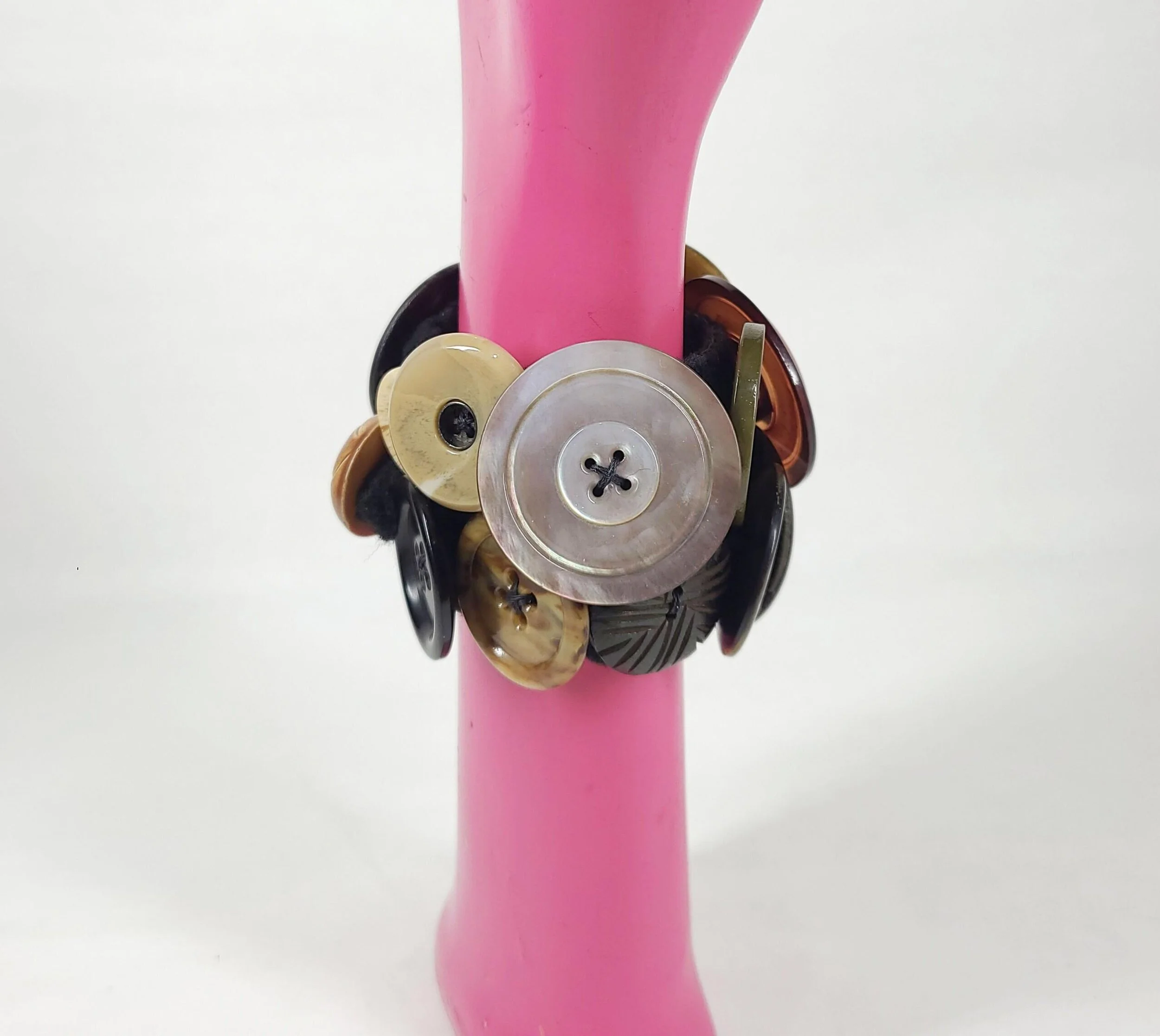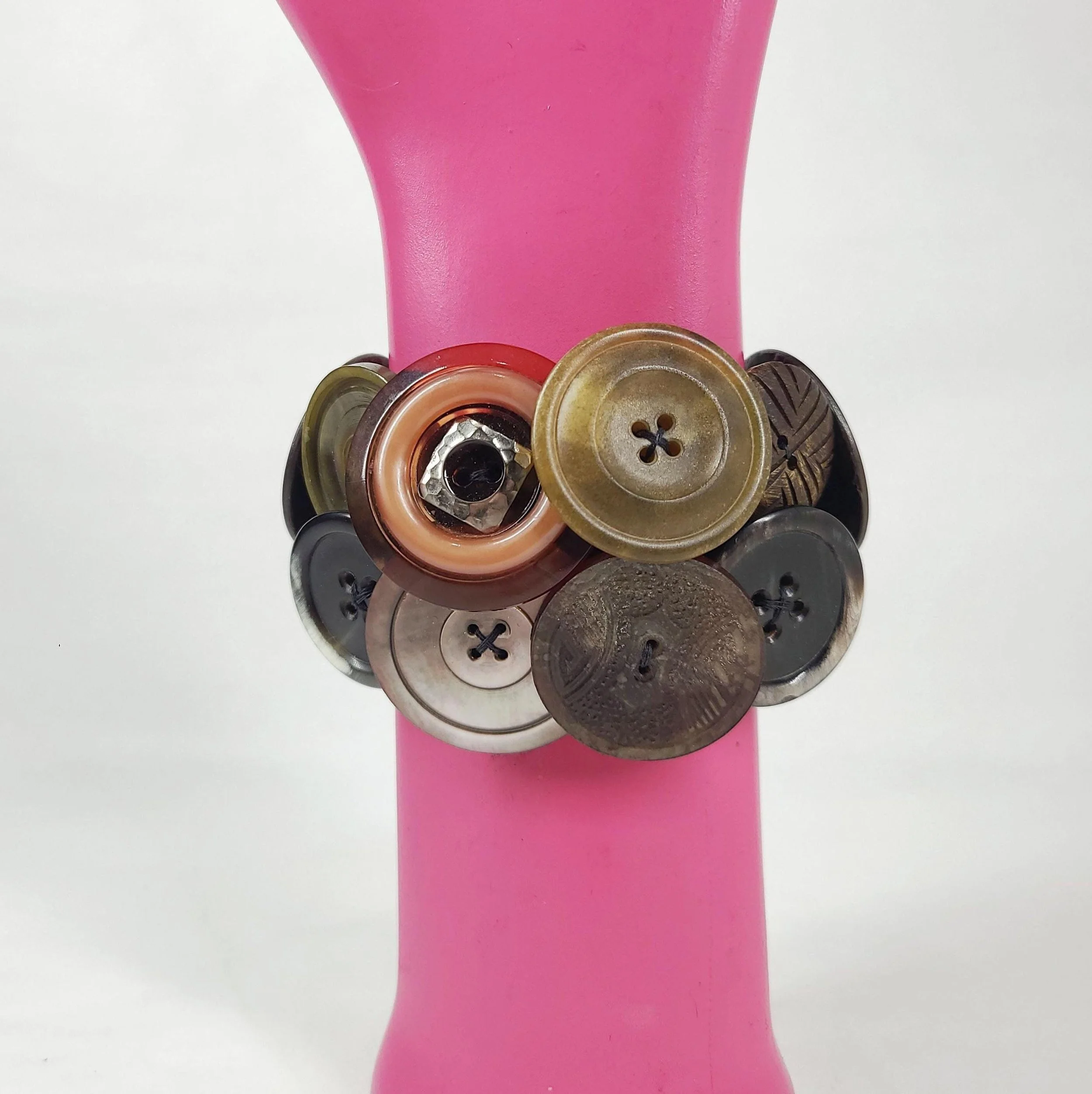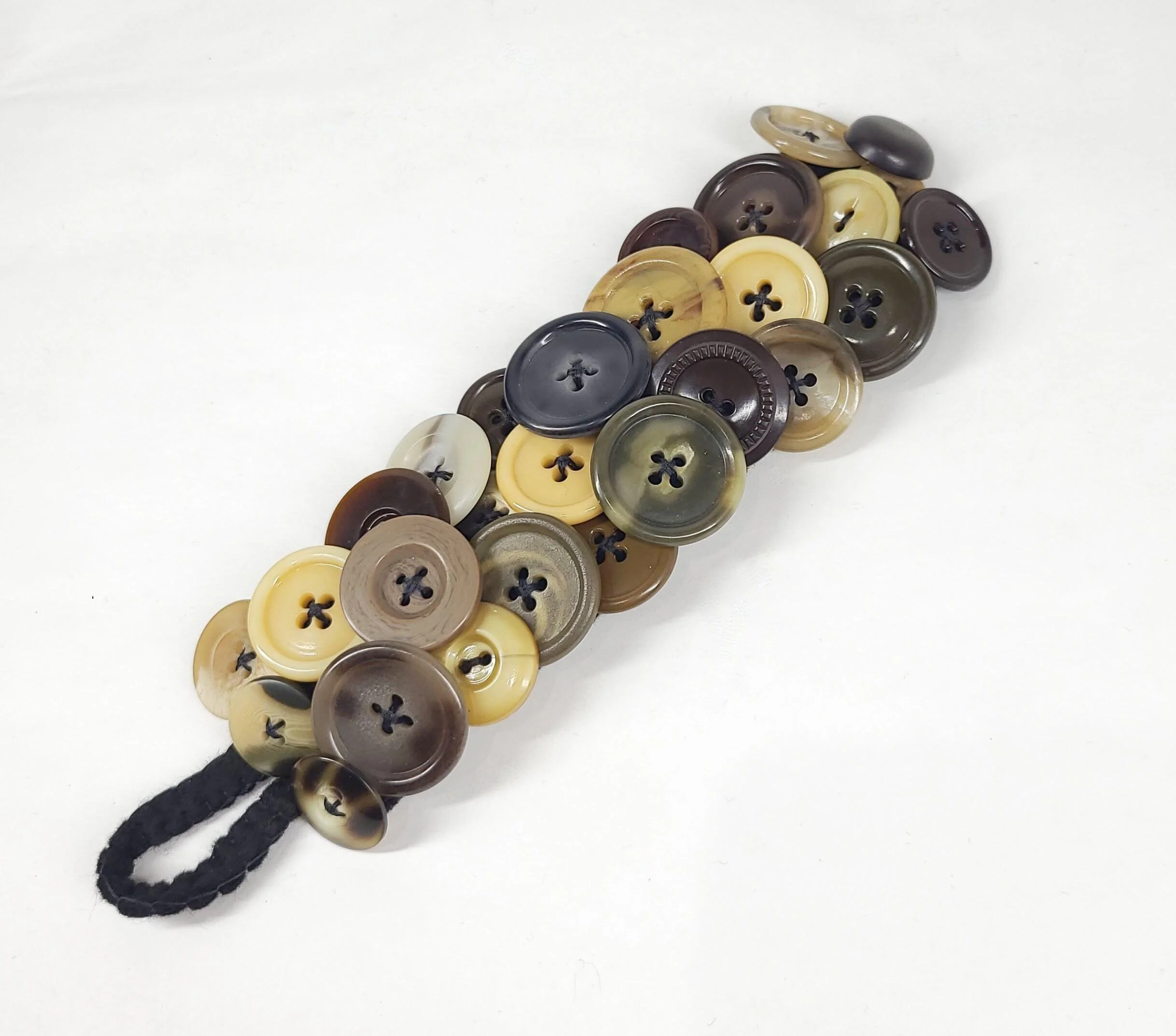 This chunky, funky, one of a kind bracelet was made with a variety of vintage buttons in black, brown and beige, that have been hand stitched onto a acrylic felt backing. The buttons are from the 1950's through the 1990's and are made from various forms of resin, natural shell, and coconut shell in an assortment of sizes, textures and designs. The bracelet is made with several layers of soft felt for extra comfort with an easy button and loop toggle closure. The buttons are used vintage pieces, so there may be some minor scratches or nicks due to their age.