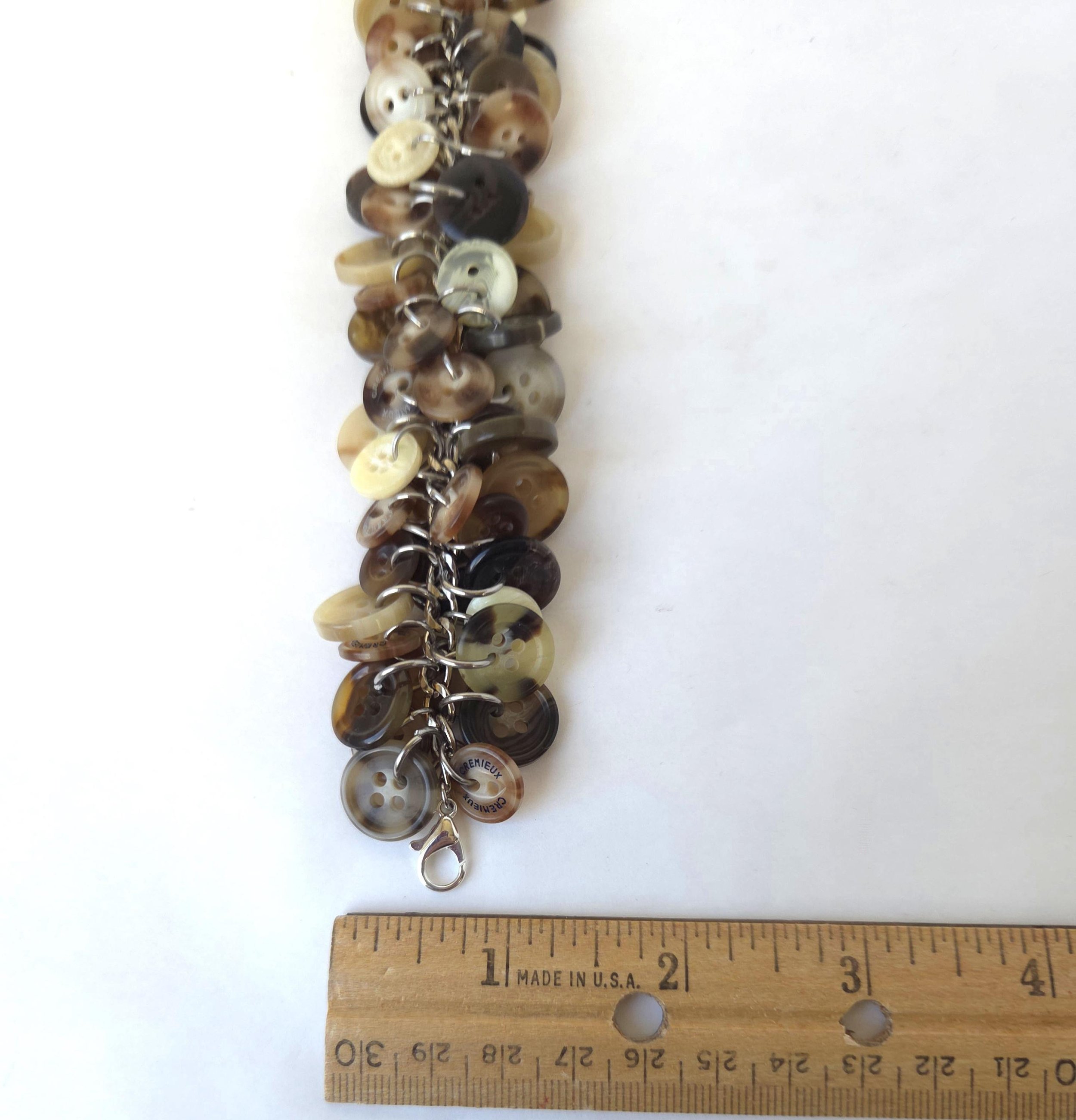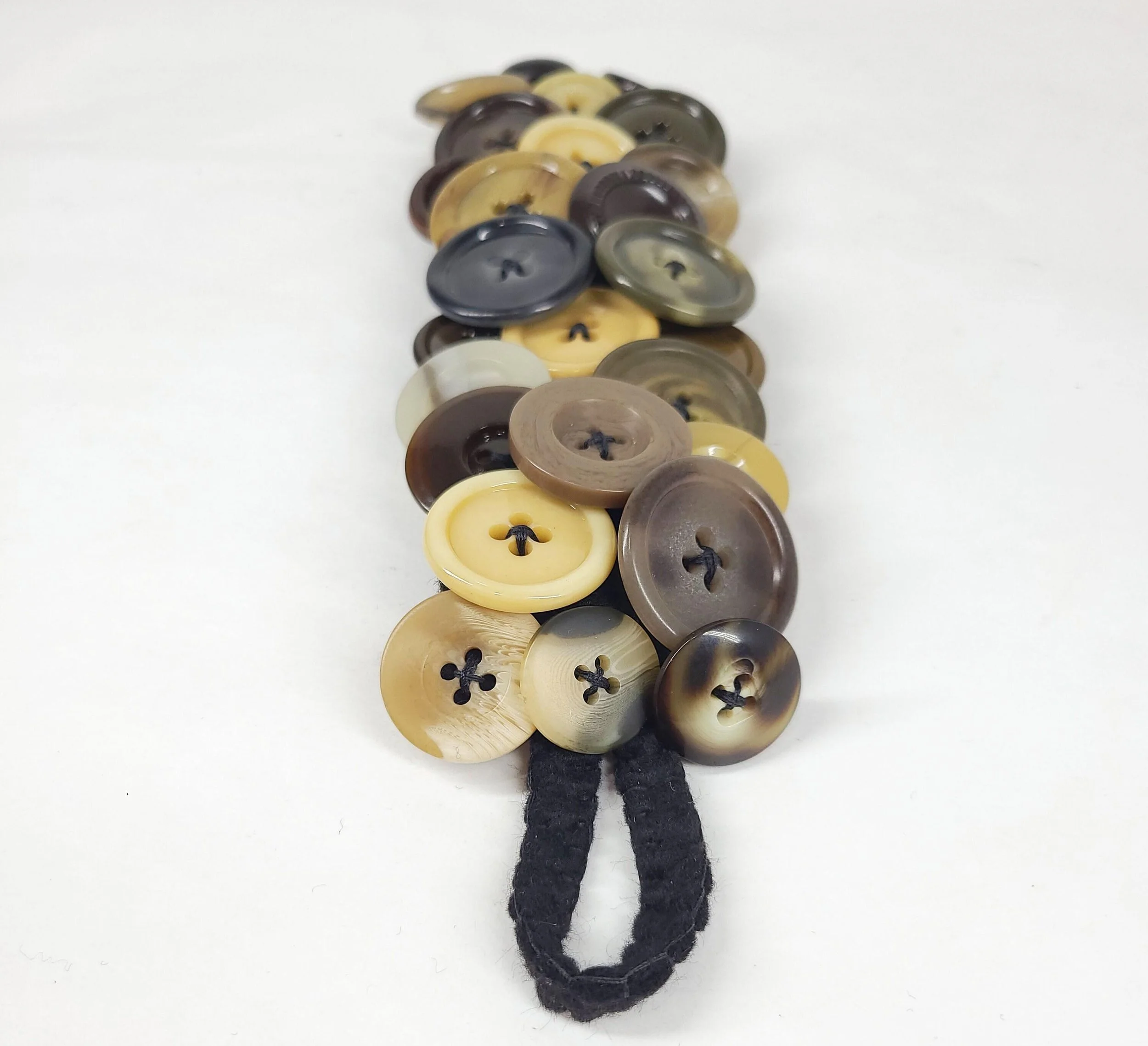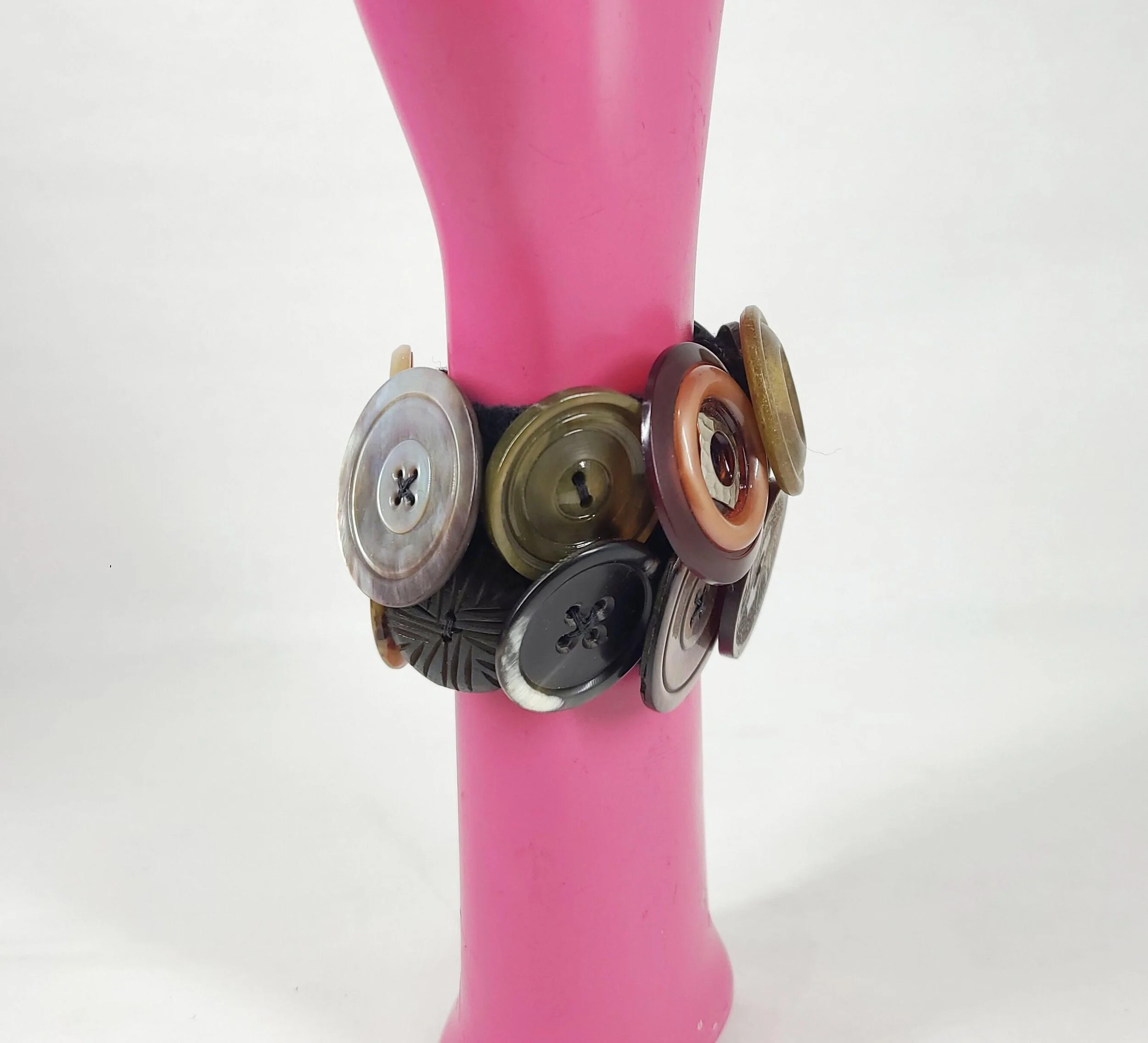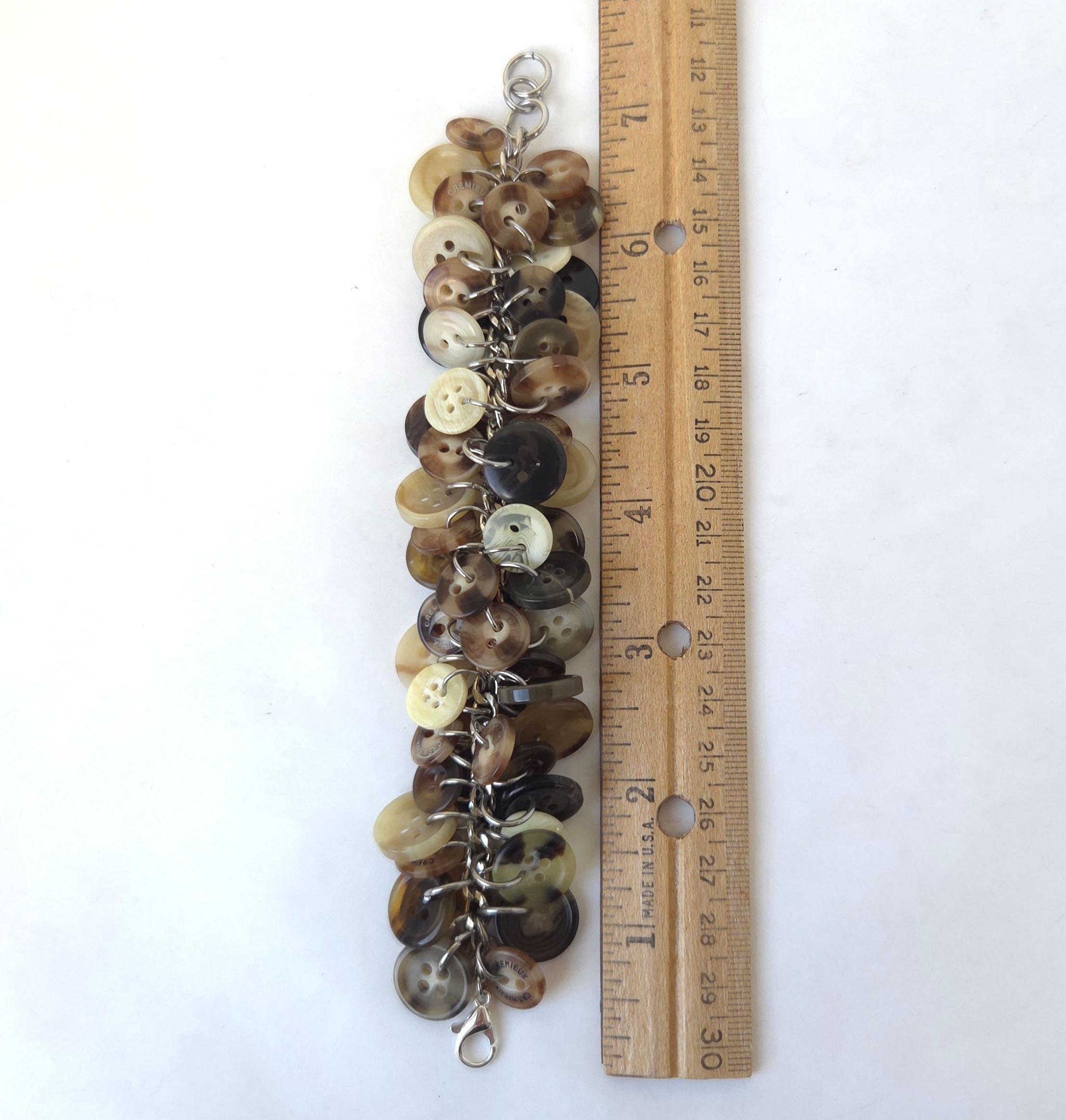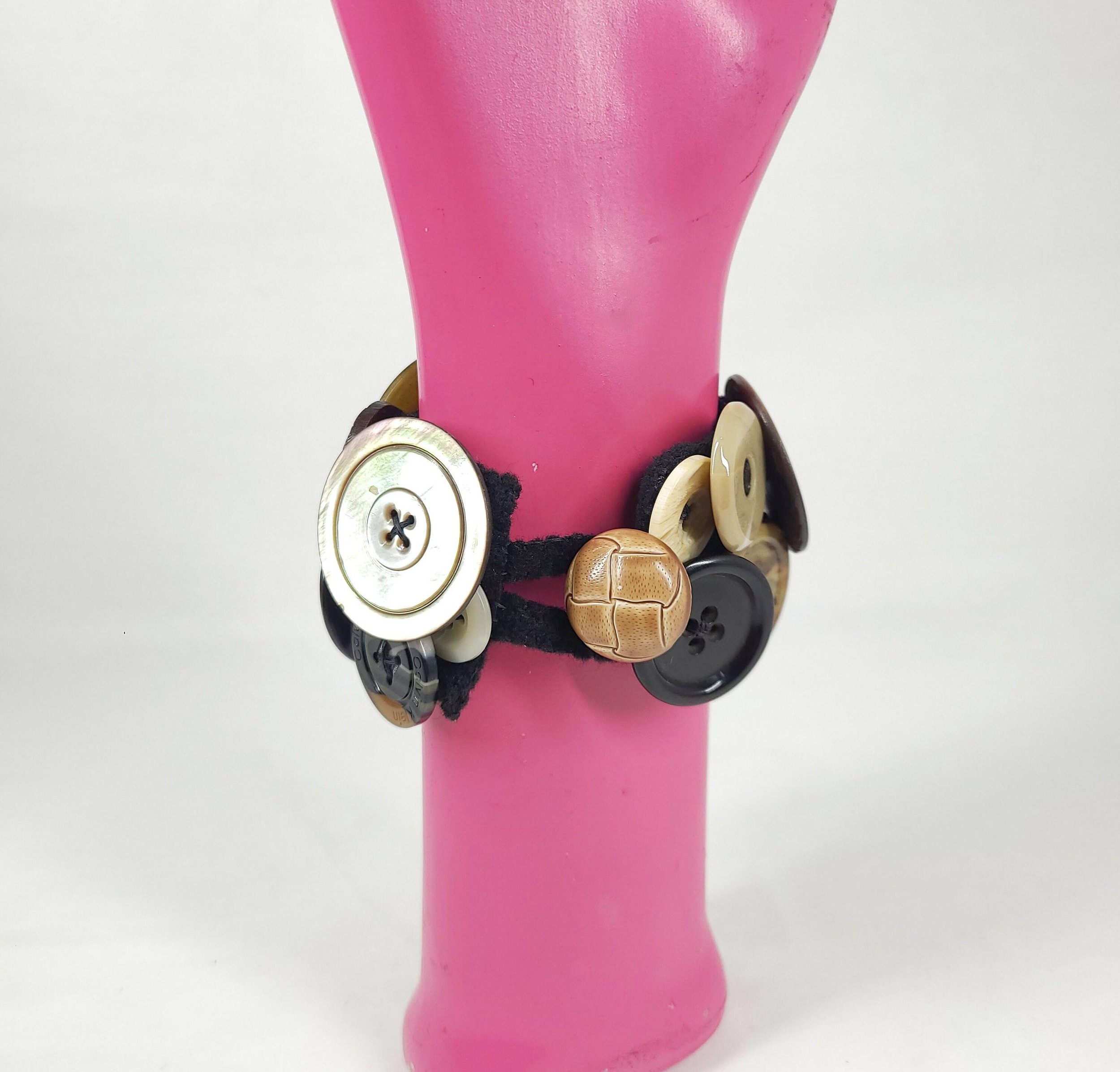 This chunky, funky, one of a kind bracelet was made with a variety of vintage buttons in black, brown and beige, that have been hand stitched onto a acrylic felt backing. The buttons are from the 1950's through the 1990's and are made from various forms of resin, natural shell, and coconut shell in an assortment of sizes, textures and designs. The bracelet is made with several layers of soft felt for extra comfort with an easy button and loop toggle closure. The buttons are used vintage pieces, so there may be some minor scratches or nicks due to their age.