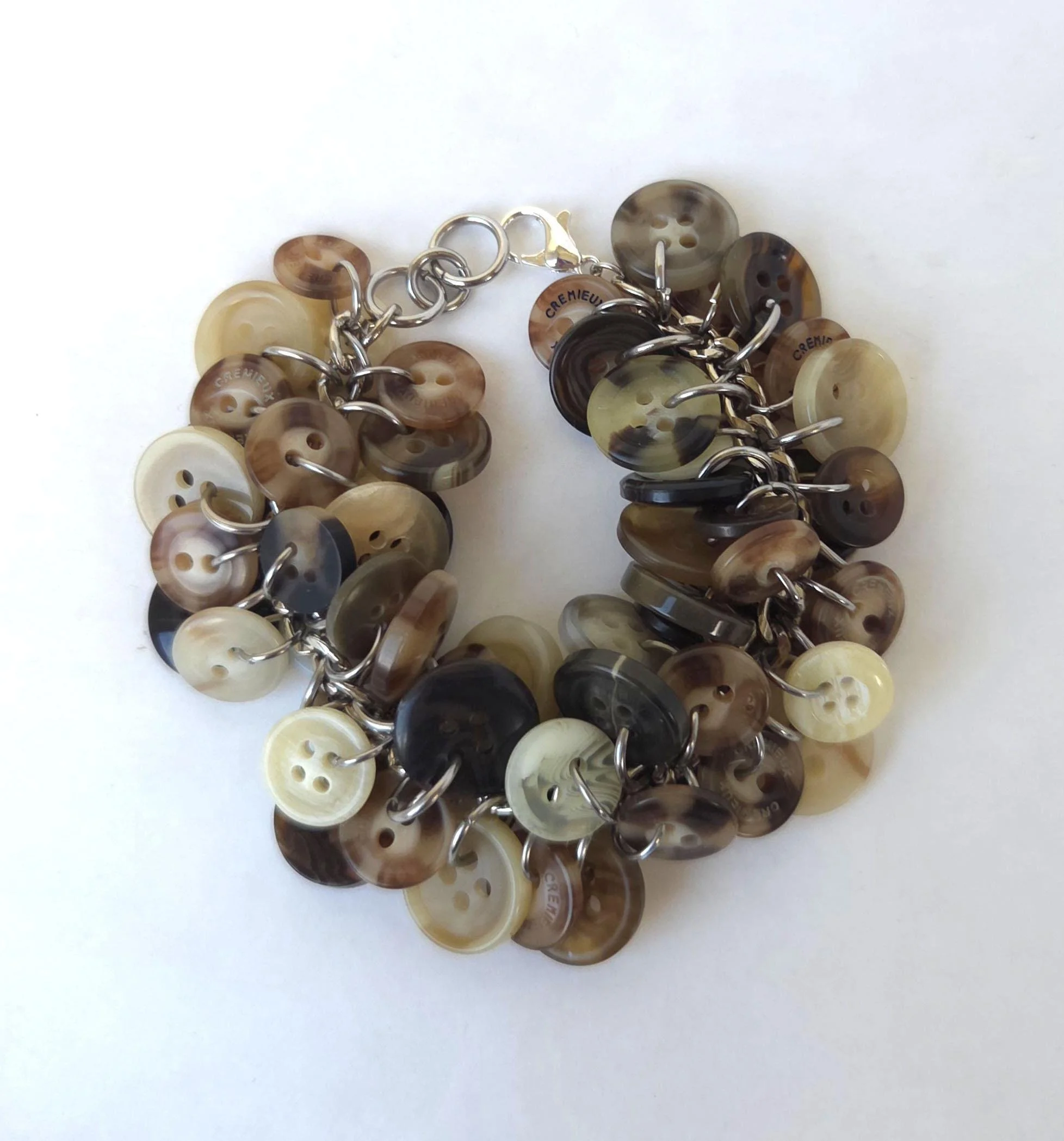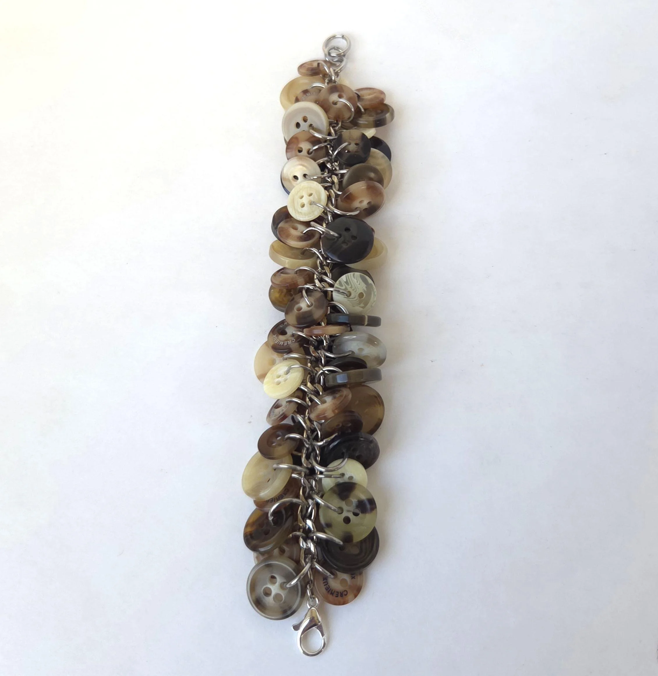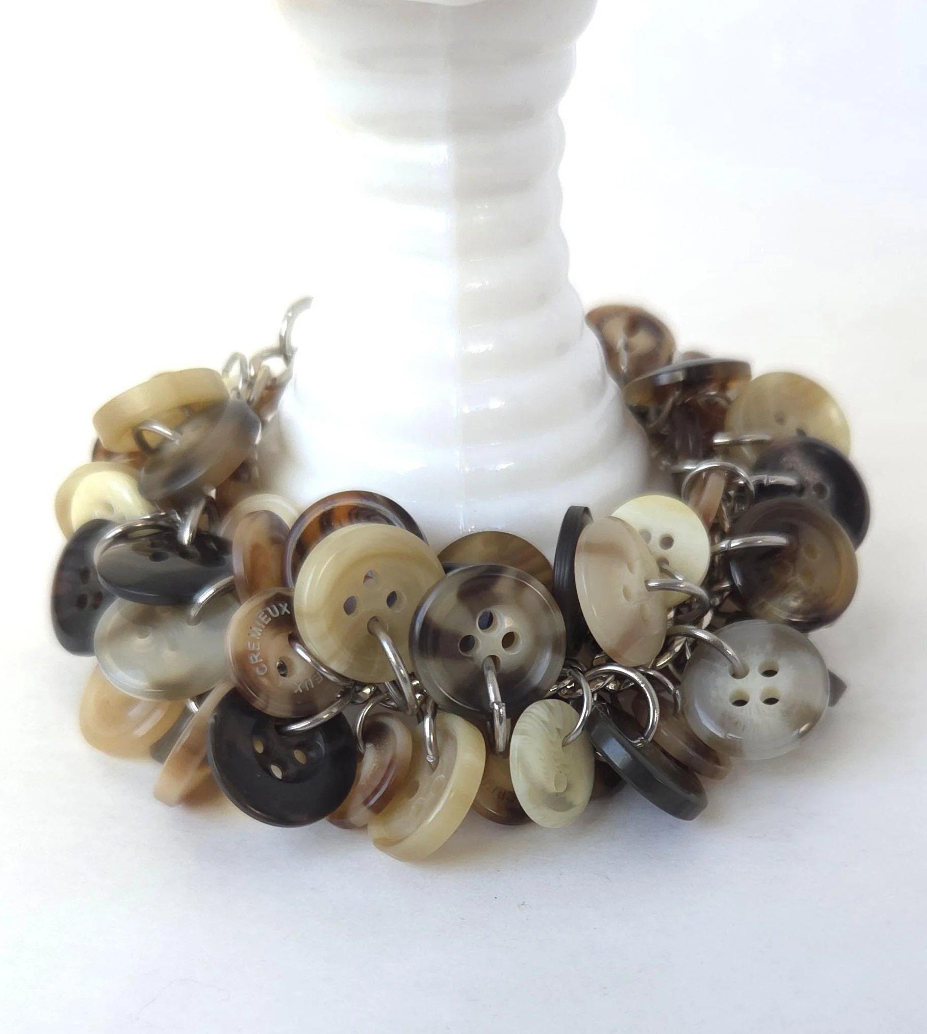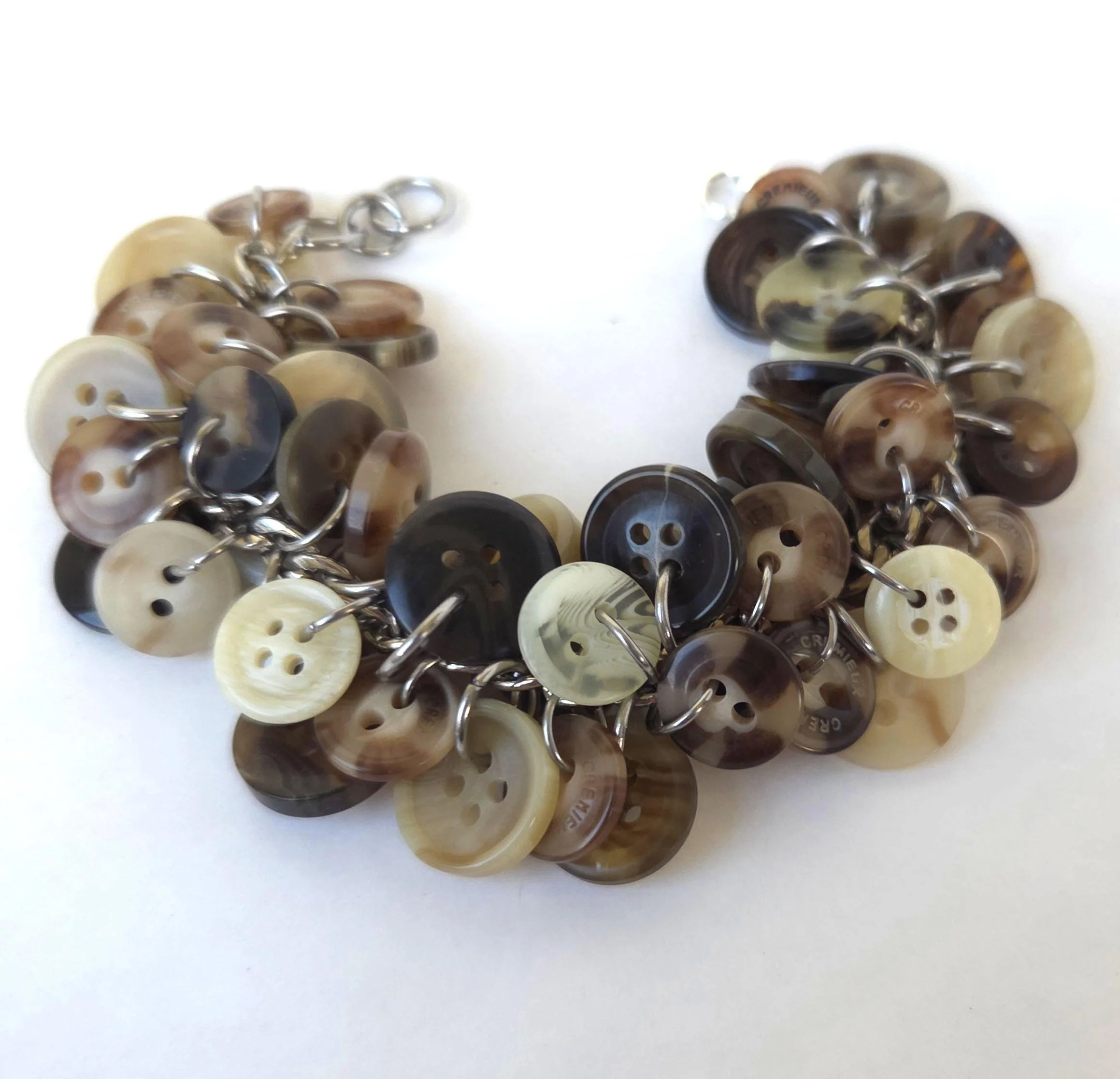 This chunky, funky, one of a kind bracelet was made with a variety of vintage buttons in black, brown and beige, that have been hand stitched onto a acrylic felt backing. The buttons are from the 1950's through the 1990's and are made from various forms of resin, natural shell, and coconut shell in an assortment of sizes, textures and designs. The bracelet is made with several layers of soft felt for extra comfort with an easy button and loop toggle closure. The buttons are used vintage pieces, so there may be some minor scratches or nicks due to their age.