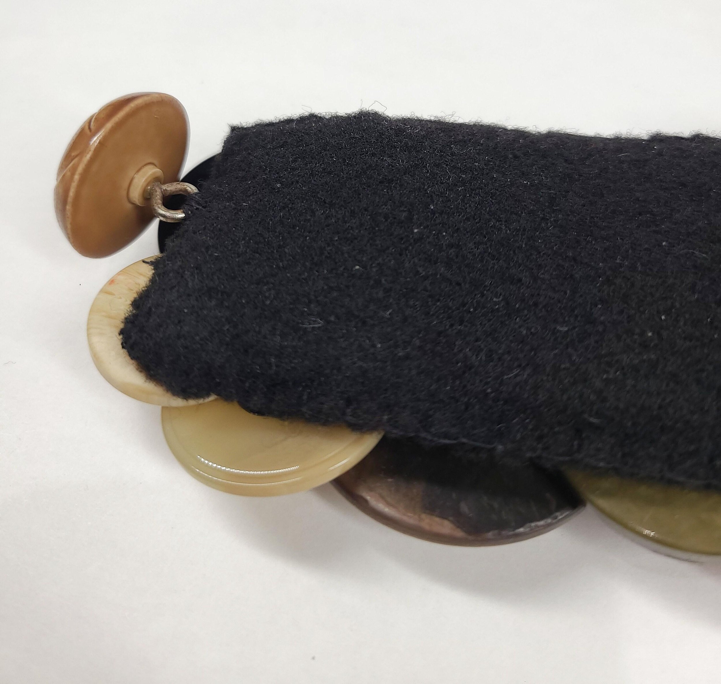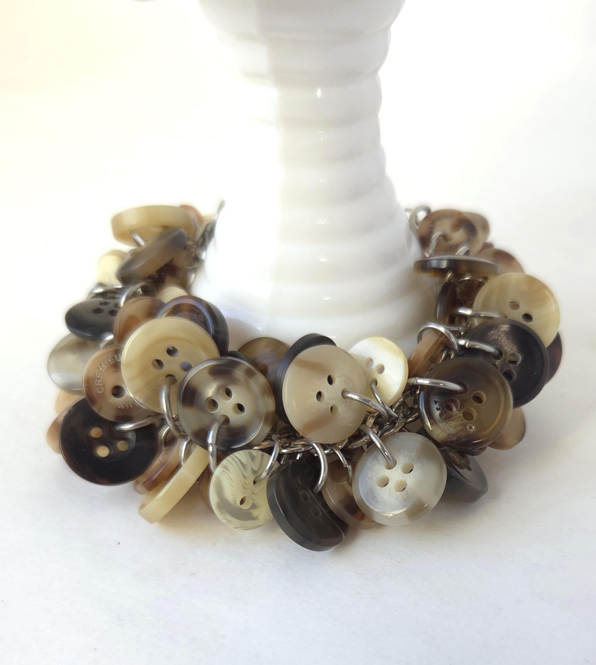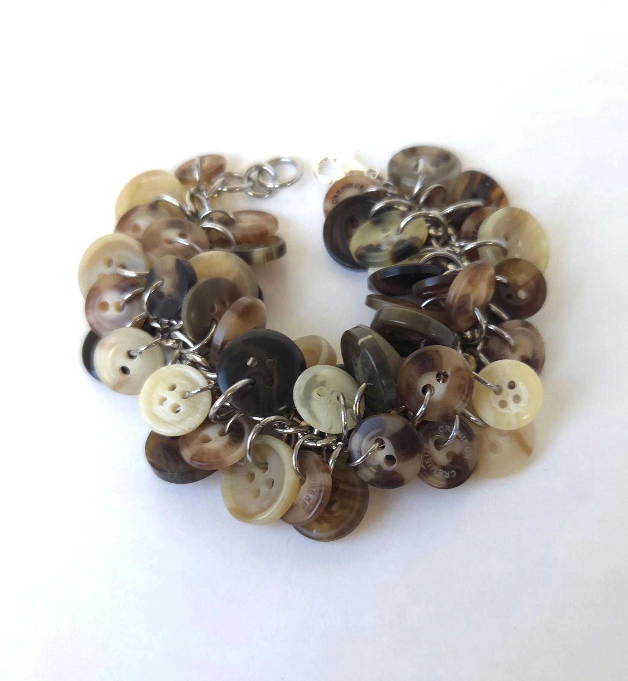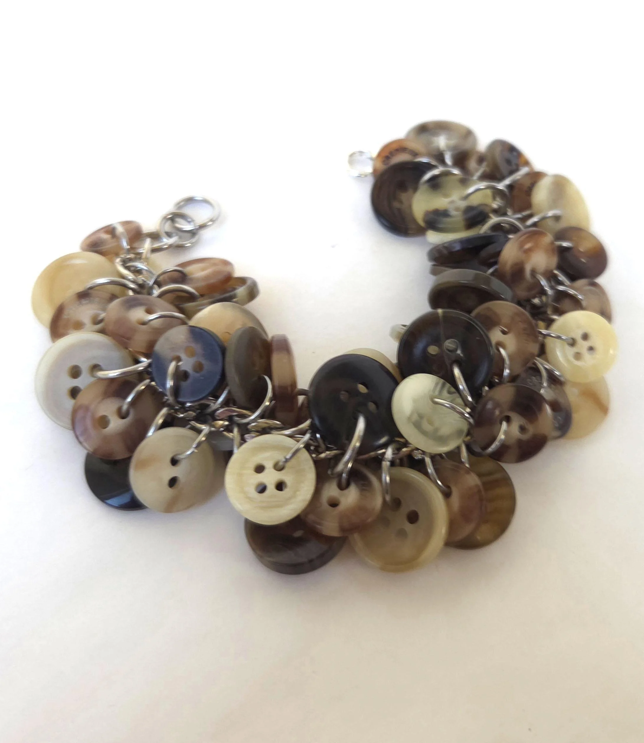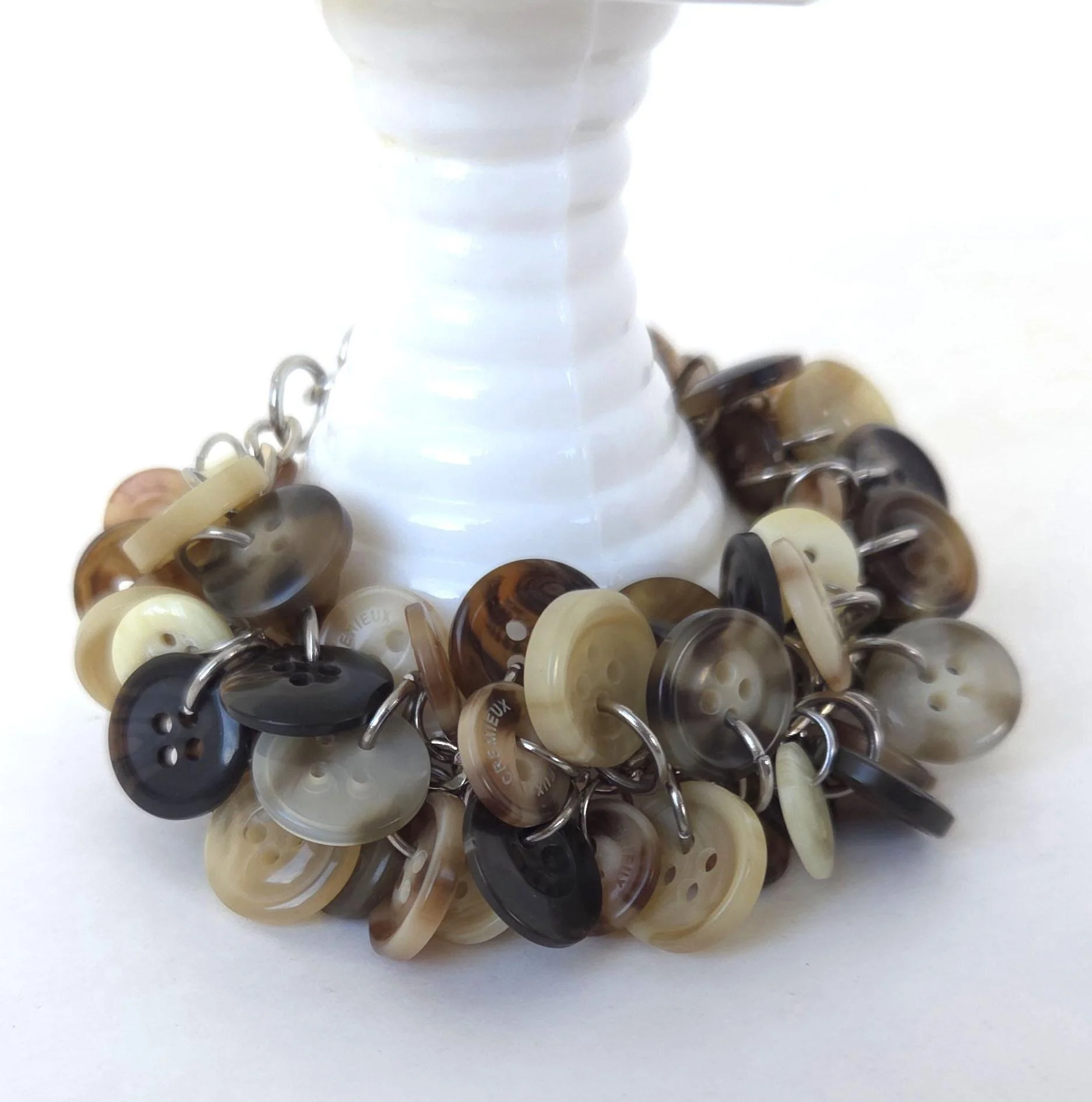 This chunky, funky, one of a kind bracelet was made with a variety of vintage buttons in black, brown and beige, that have been hand stitched onto a acrylic felt backing. The buttons are from the 1950's through the 1990's and are made from various forms of resin, natural shell, and coconut shell in an assortment of sizes, textures and designs. The bracelet is made with several layers of soft felt for extra comfort with an easy button and loop toggle closure. The buttons are used vintage pieces, so there may be some minor scratches or nicks due to their age.