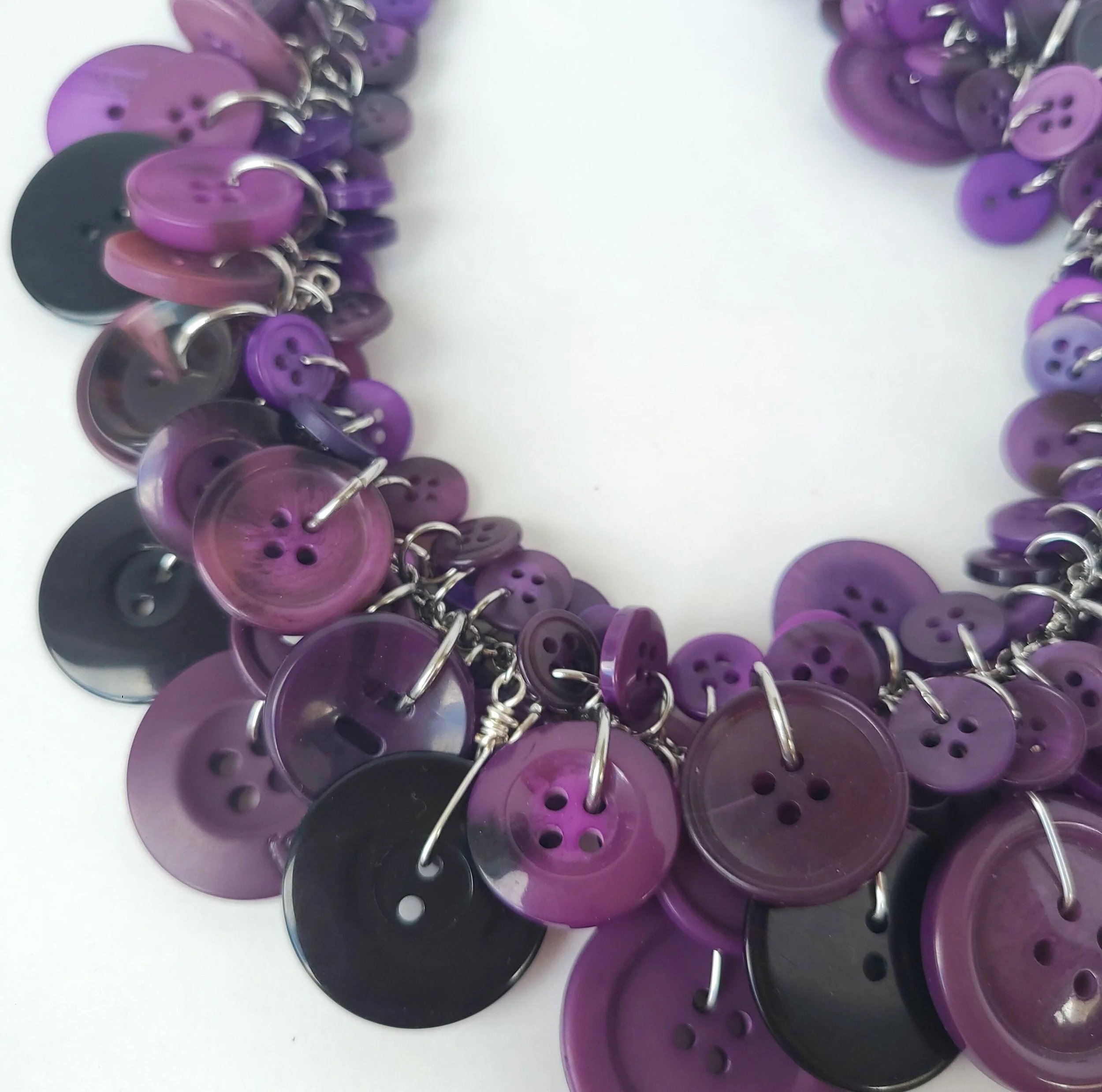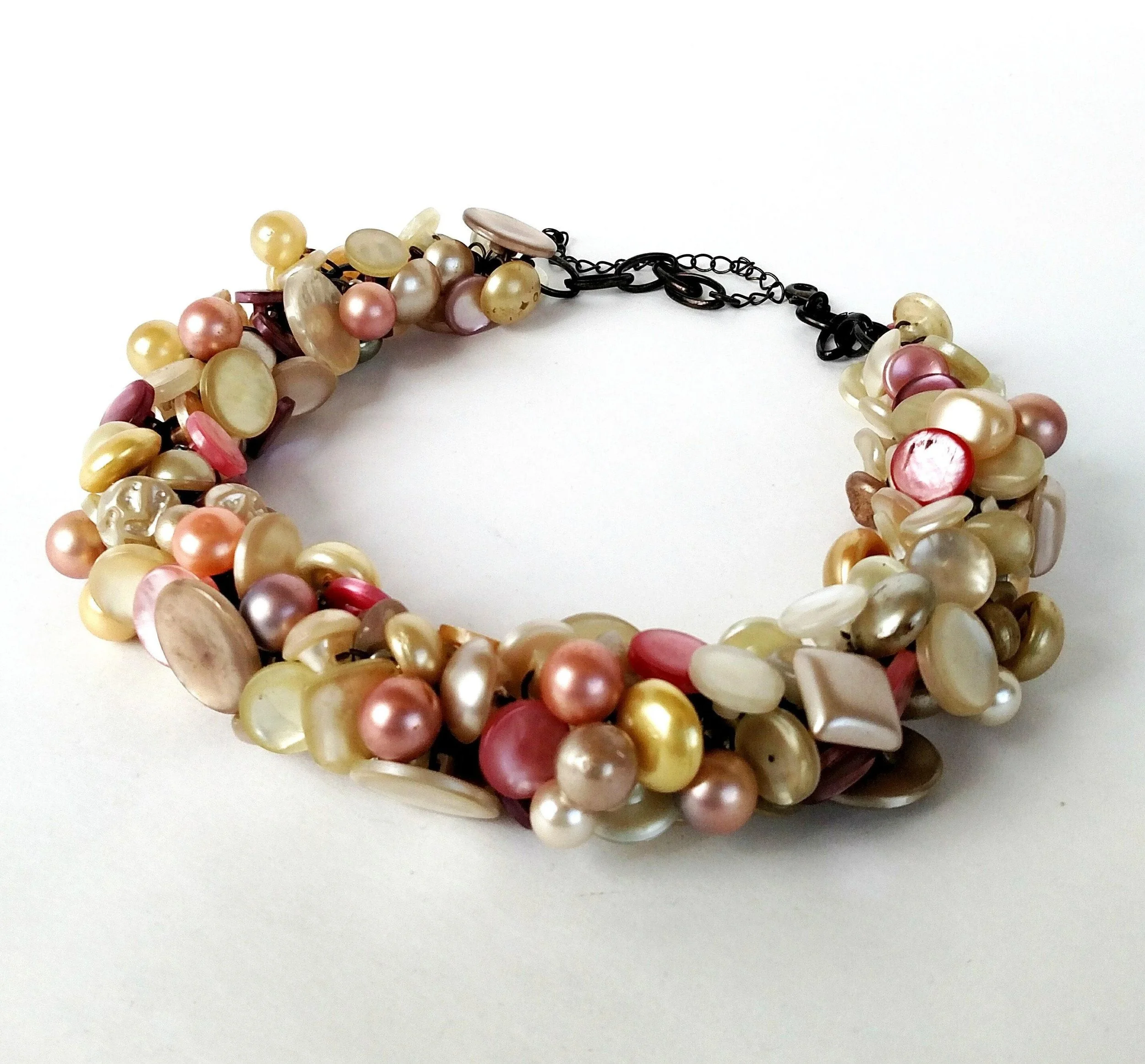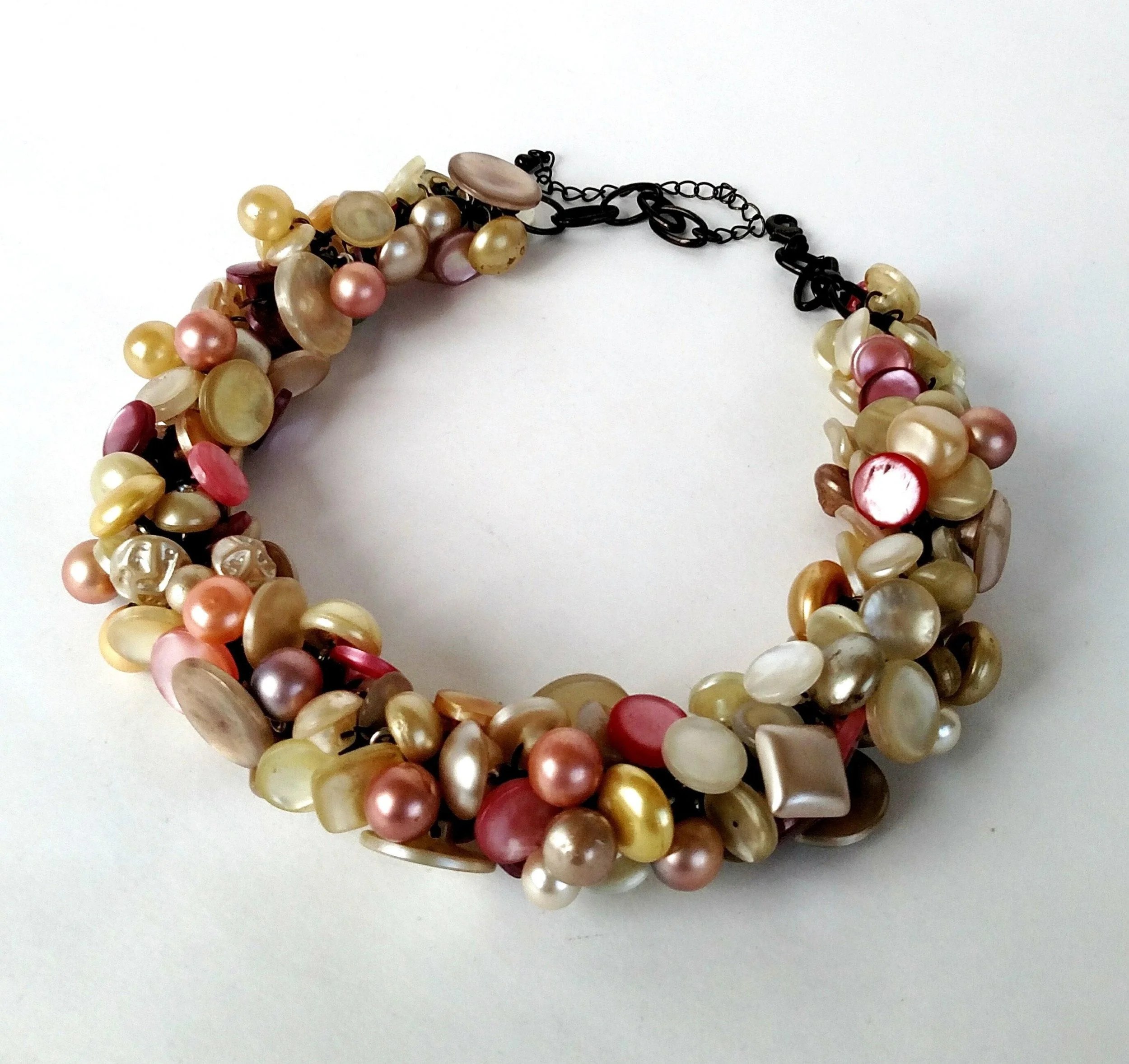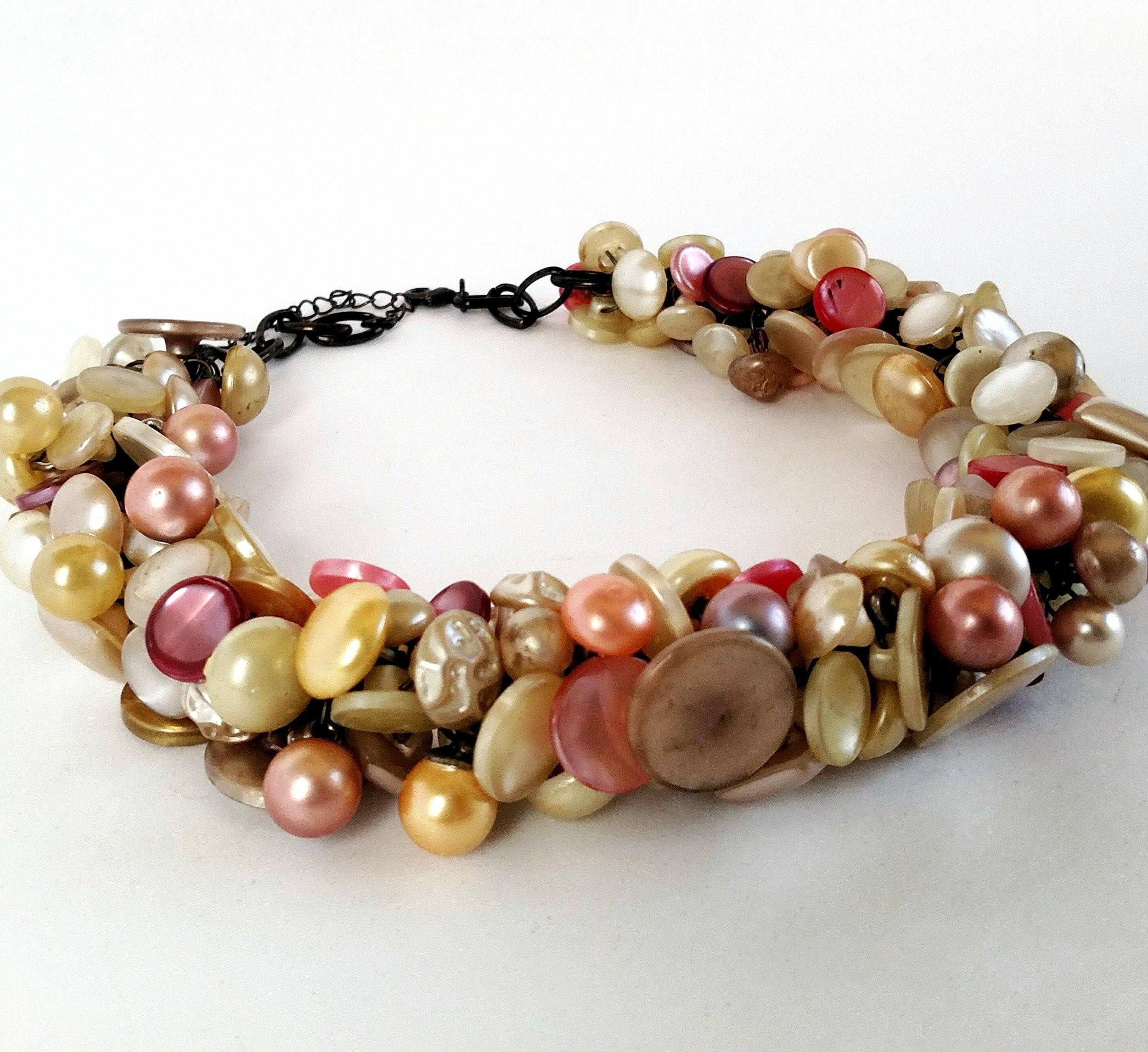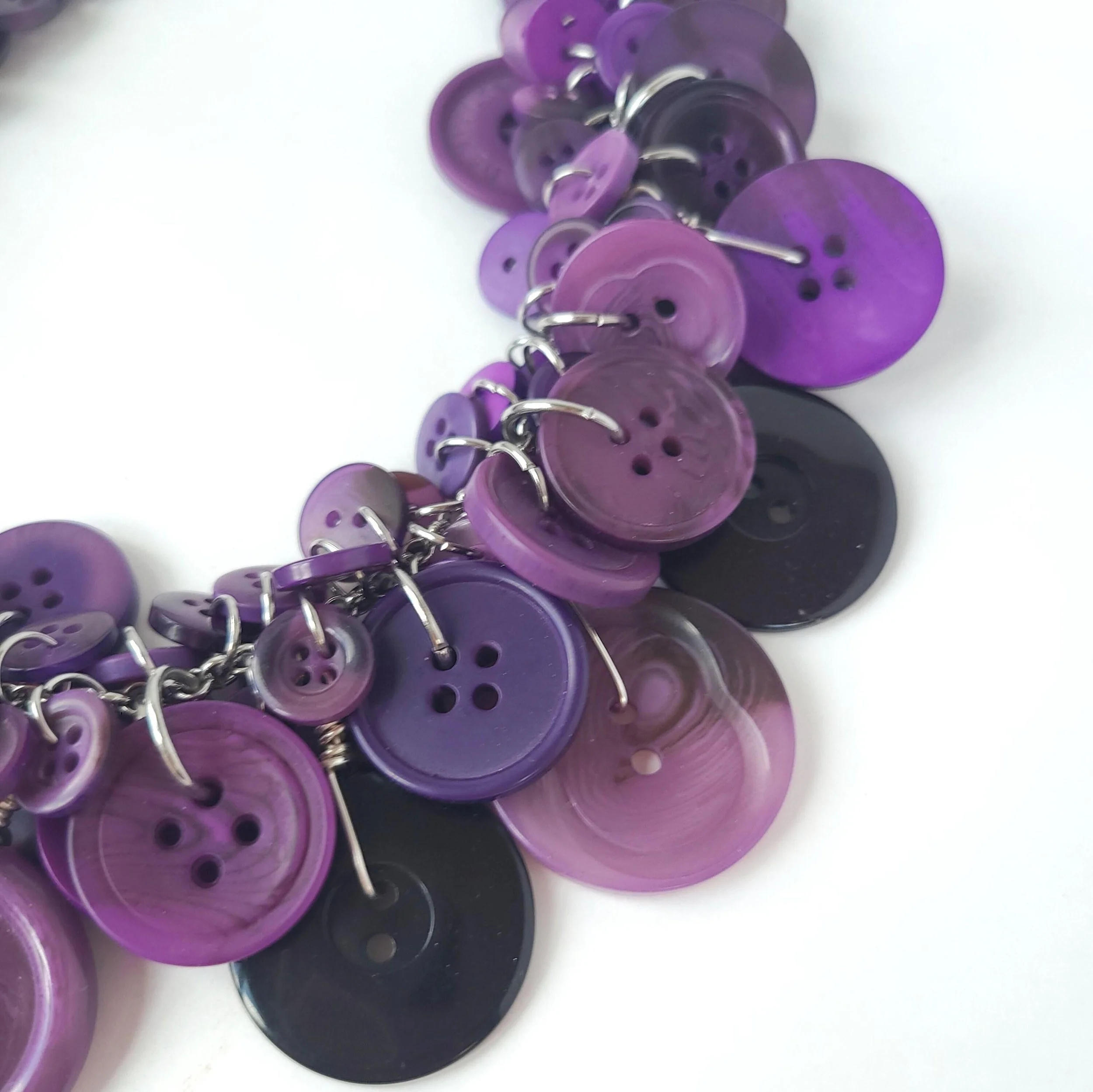 This chunky, funky, one of a kind bracelet was made with a variety of vintage buttons in black, brown and beige, that have been hand stitched onto a acrylic felt backing. The buttons are from the 1950's through the 1990's and are made from various forms of resin, natural shell, and coconut shell in an assortment of sizes, textures and designs. The bracelet is made with several layers of soft felt for extra comfort with an easy button and loop toggle closure. The buttons are used vintage pieces, so there may be some minor scratches or nicks due to their age.
