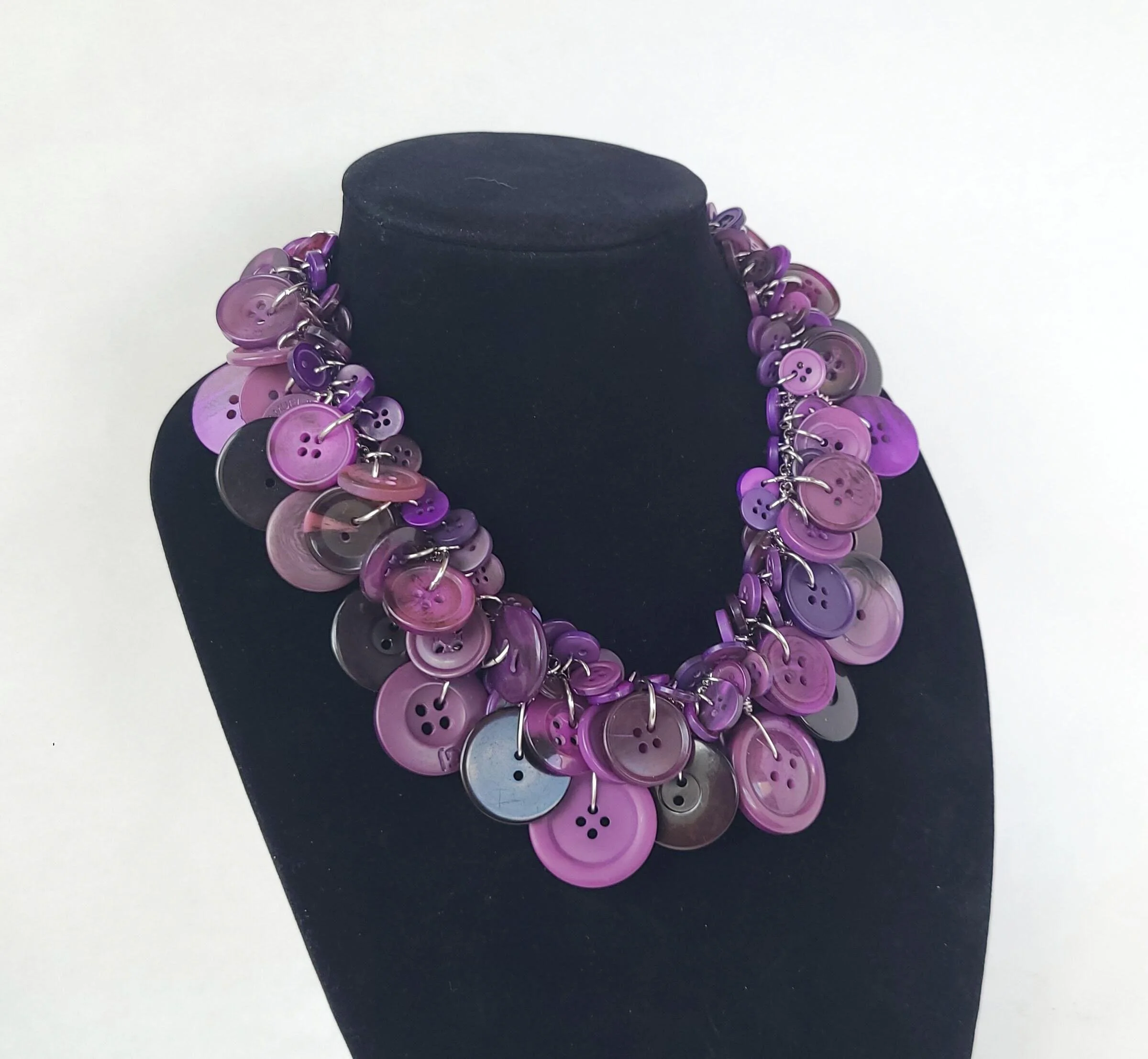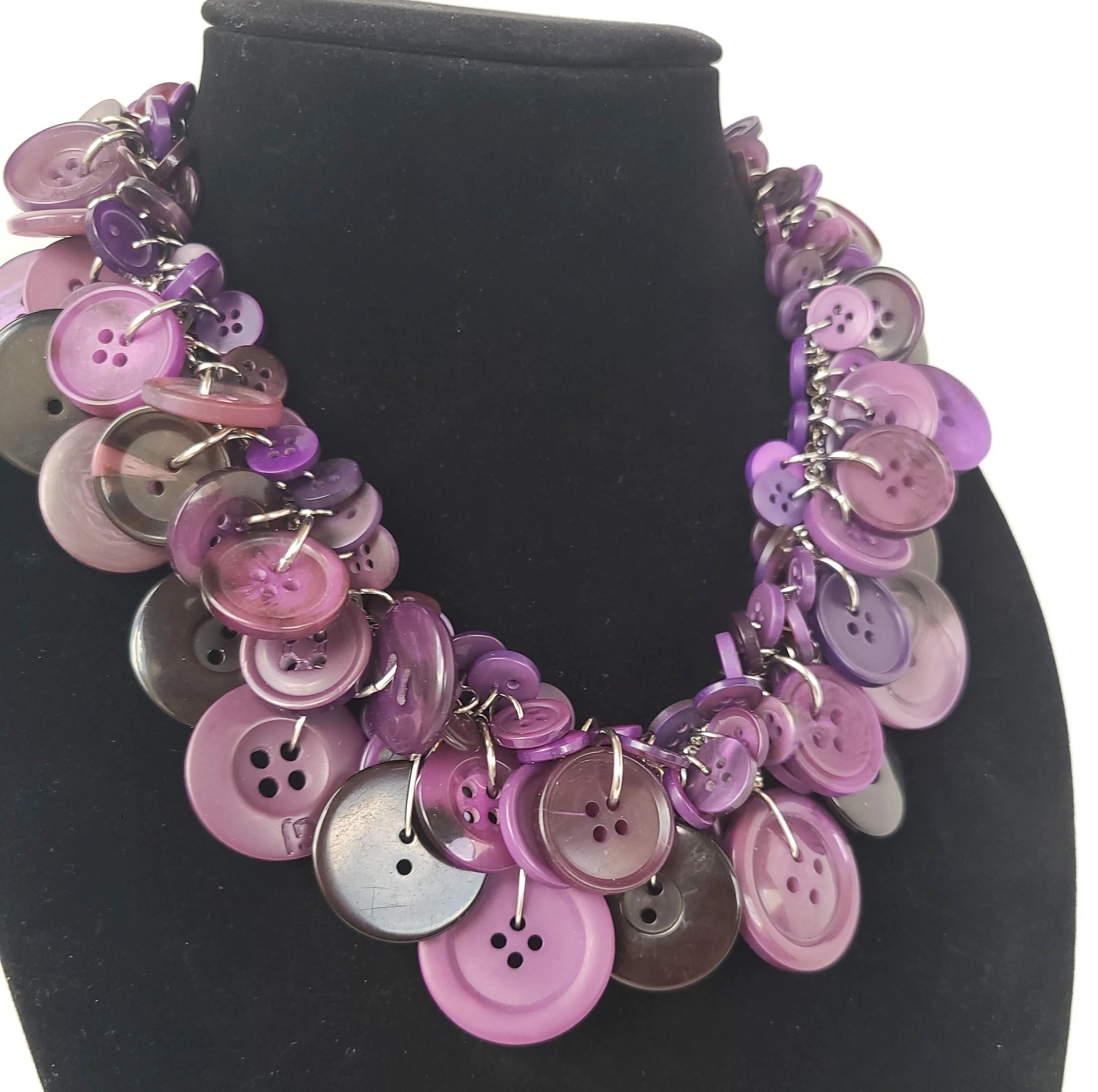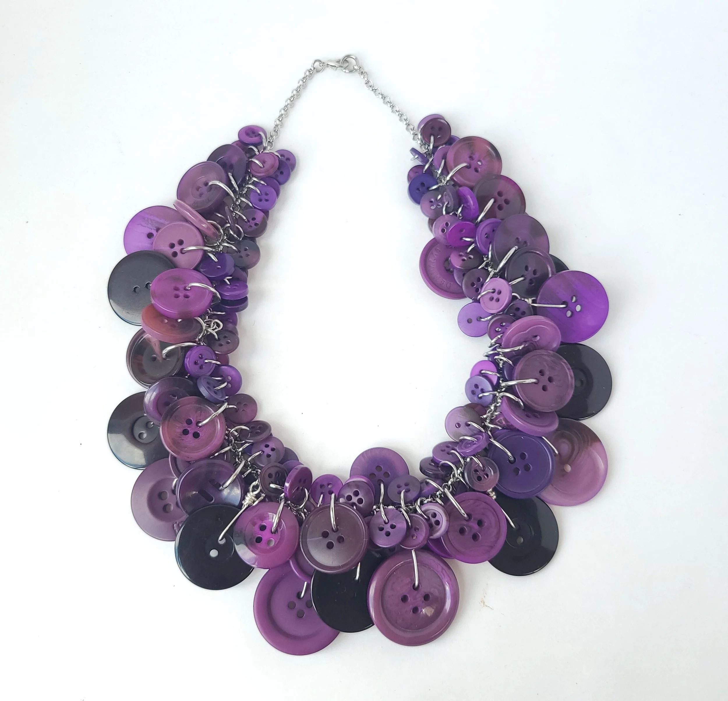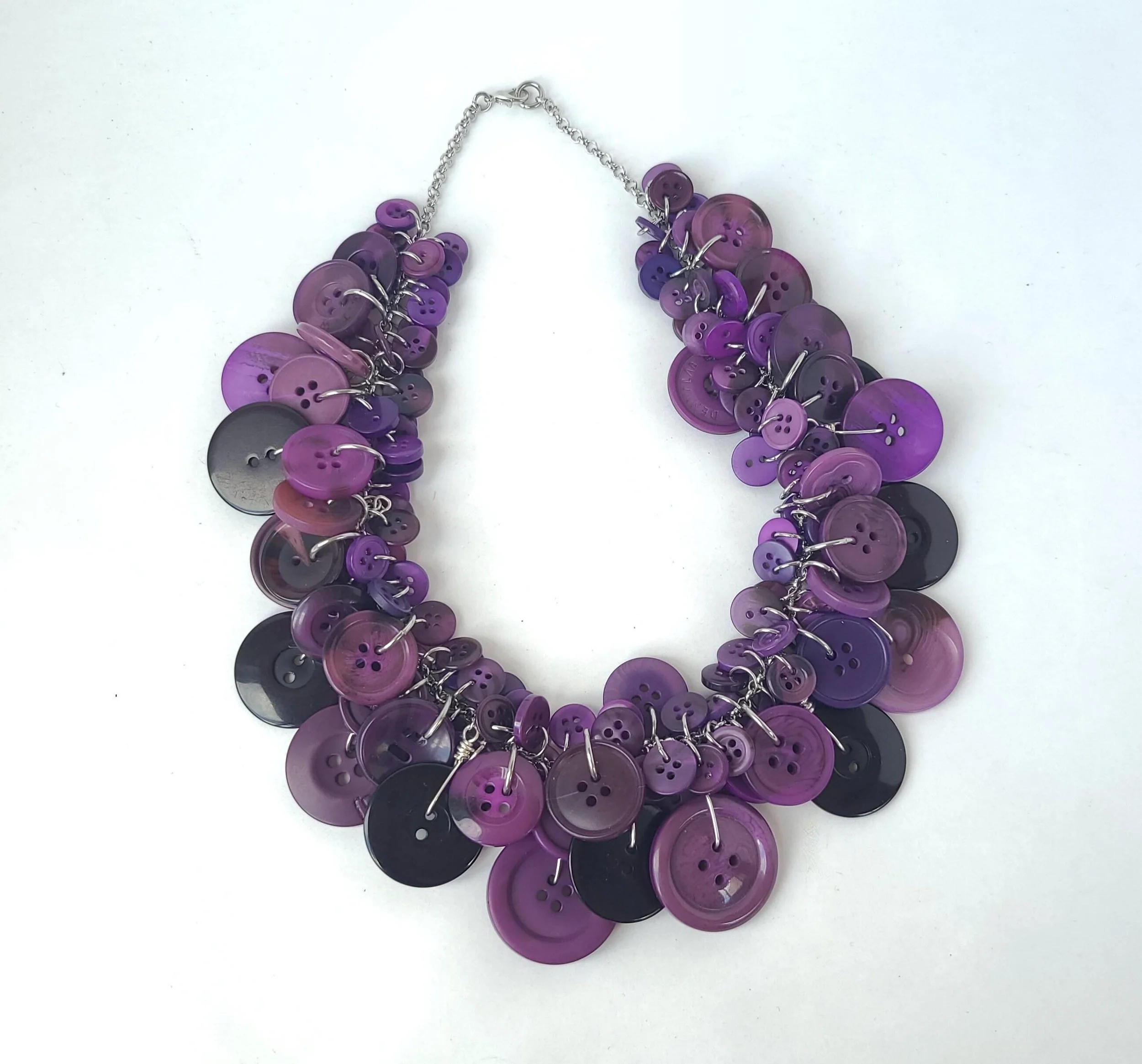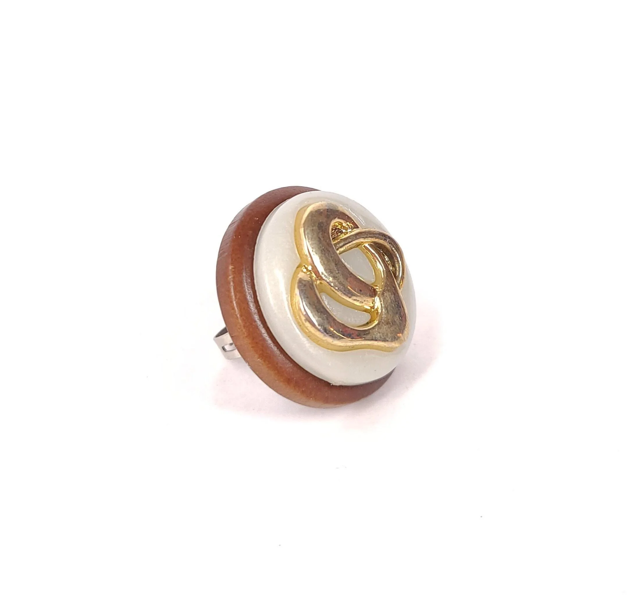 This chunky, funky, one of a kind bracelet was made with a variety of vintage buttons in black, brown and beige, that have been hand stitched onto a acrylic felt backing. The buttons are from the 1950's through the 1990's and are made from various forms of resin, natural shell, and coconut shell in an assortment of sizes, textures and designs. The bracelet is made with several layers of soft felt for extra comfort with an easy button and loop toggle closure. The buttons are used vintage pieces, so there may be some minor scratches or nicks due to their age.