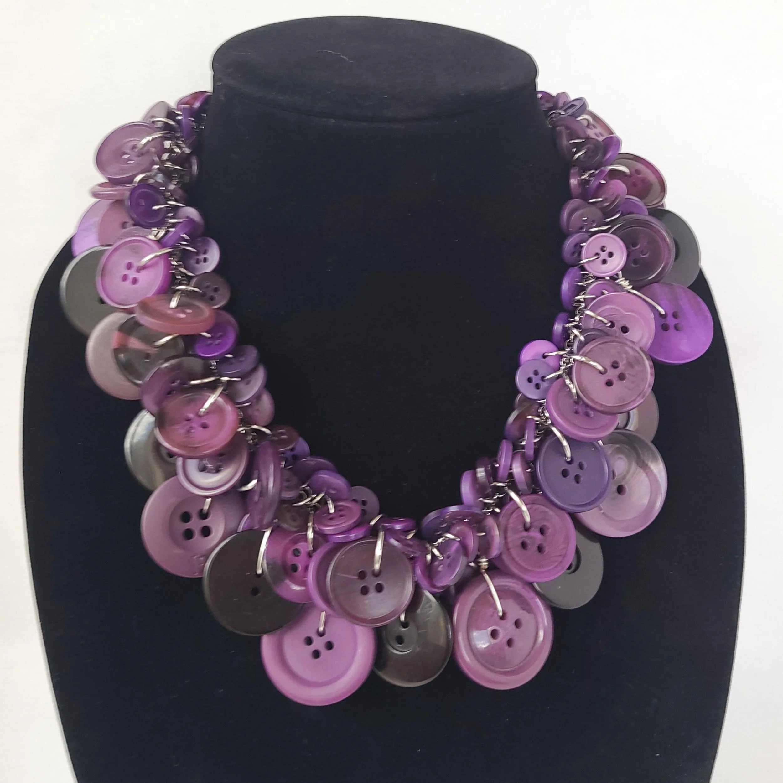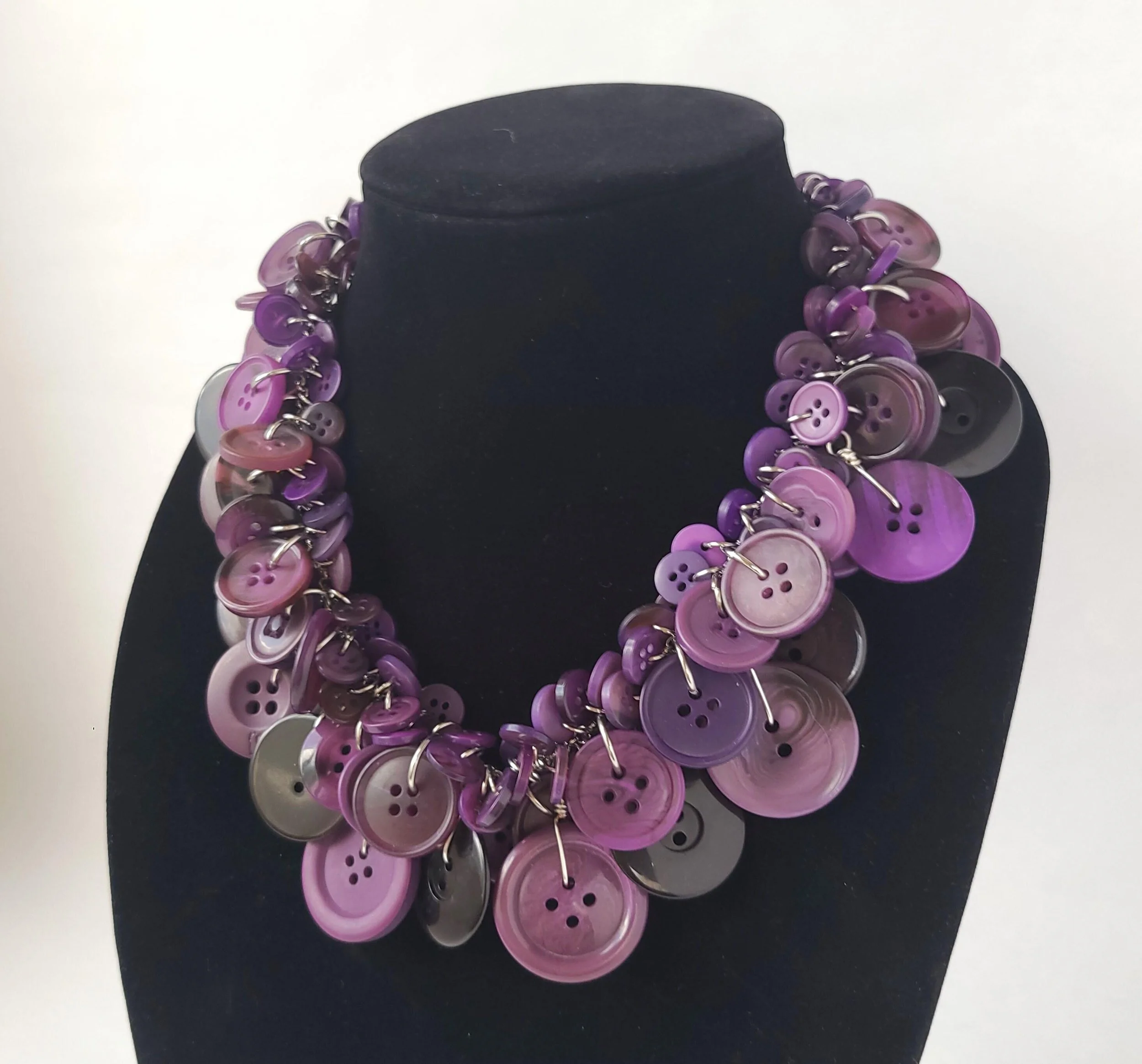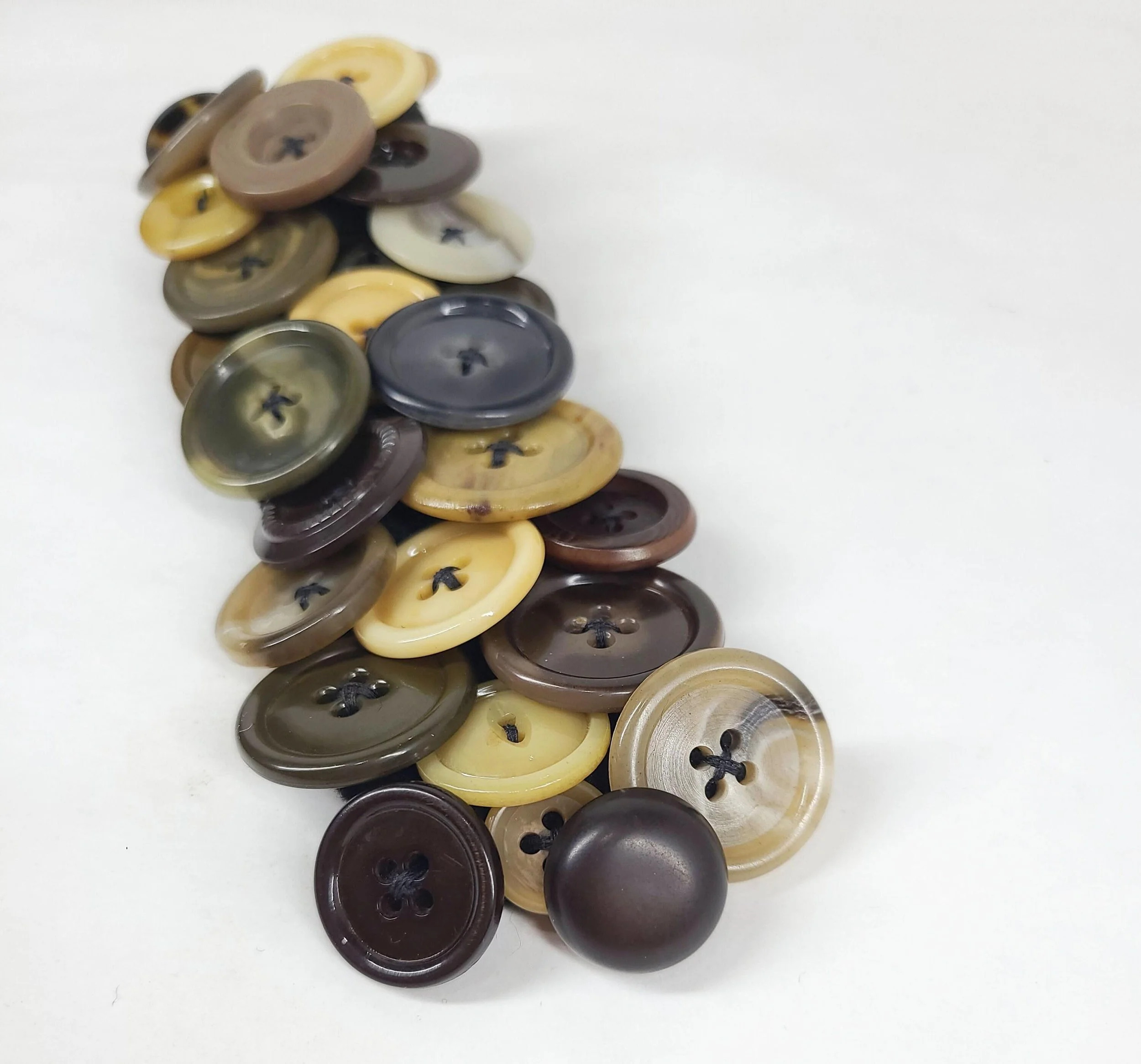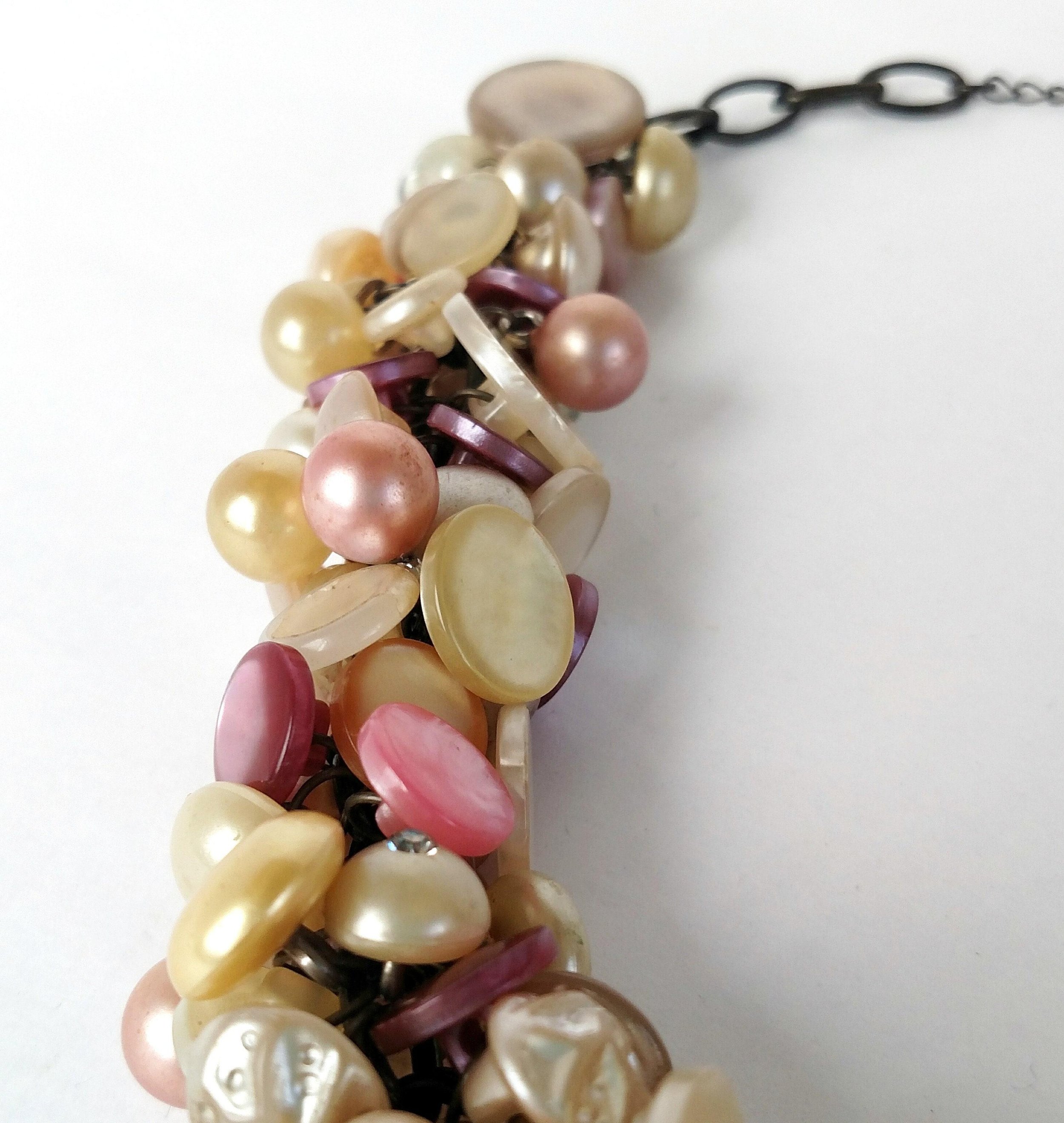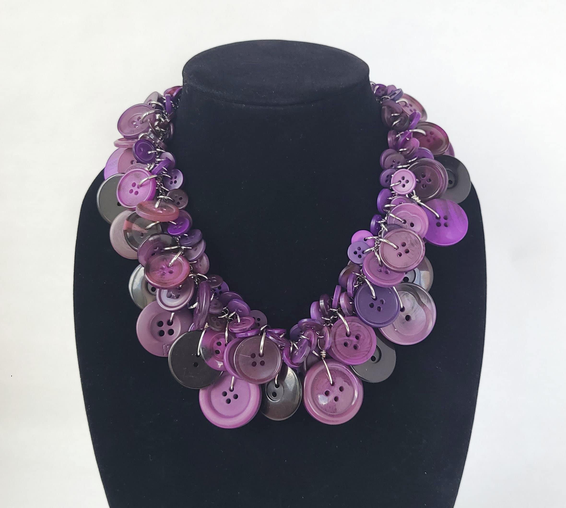 This chunky, funky, one of a kind bracelet was made with a variety of vintage buttons in black, brown and beige, that have been hand stitched onto a acrylic felt backing. The buttons are from the 1950's through the 1990's and are made from various forms of resin, natural shell, and coconut shell in an assortment of sizes, textures and designs. The bracelet is made with several layers of soft felt for extra comfort with an easy button and loop toggle closure. The buttons are used vintage pieces, so there may be some minor scratches or nicks due to their age.