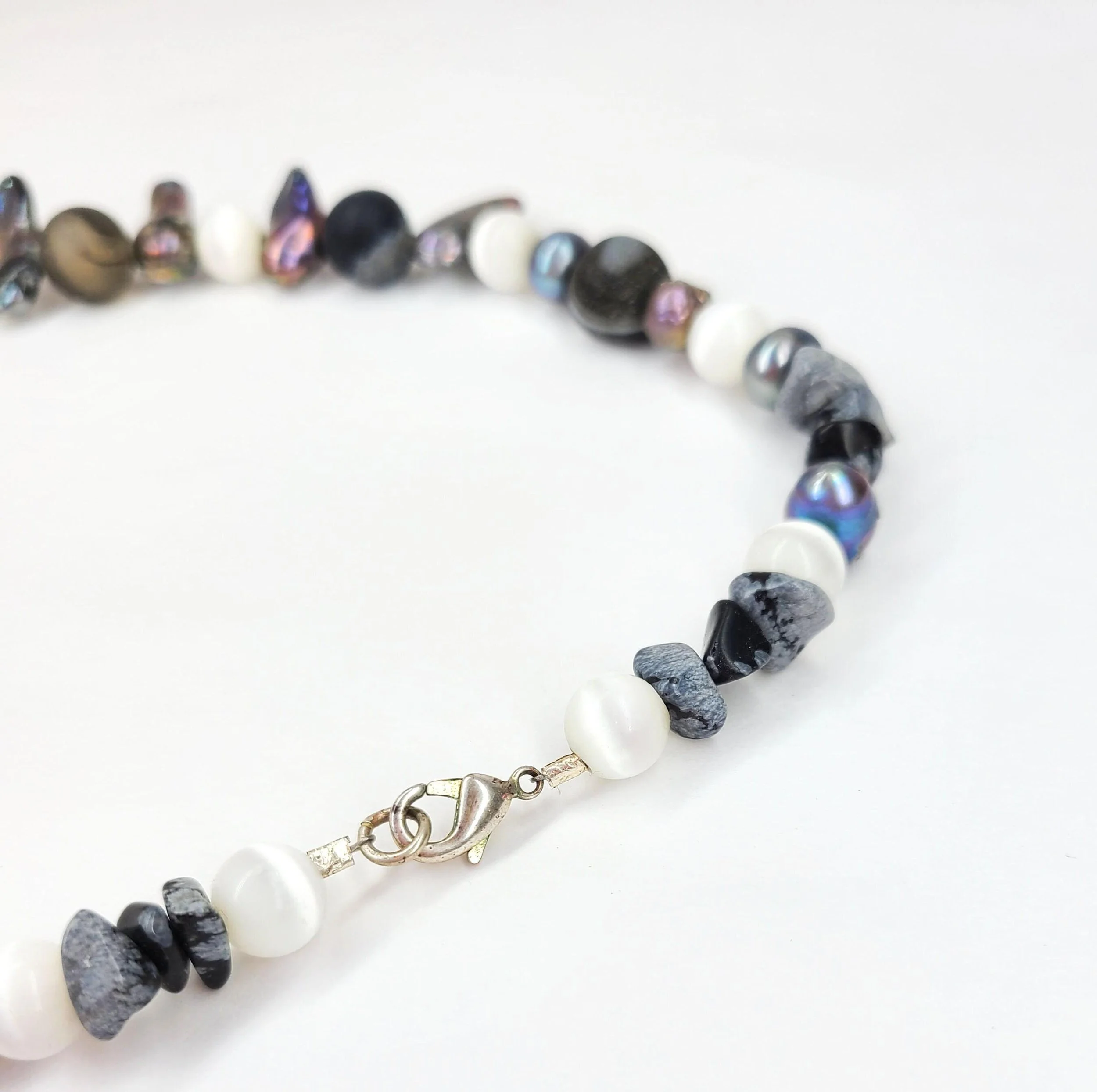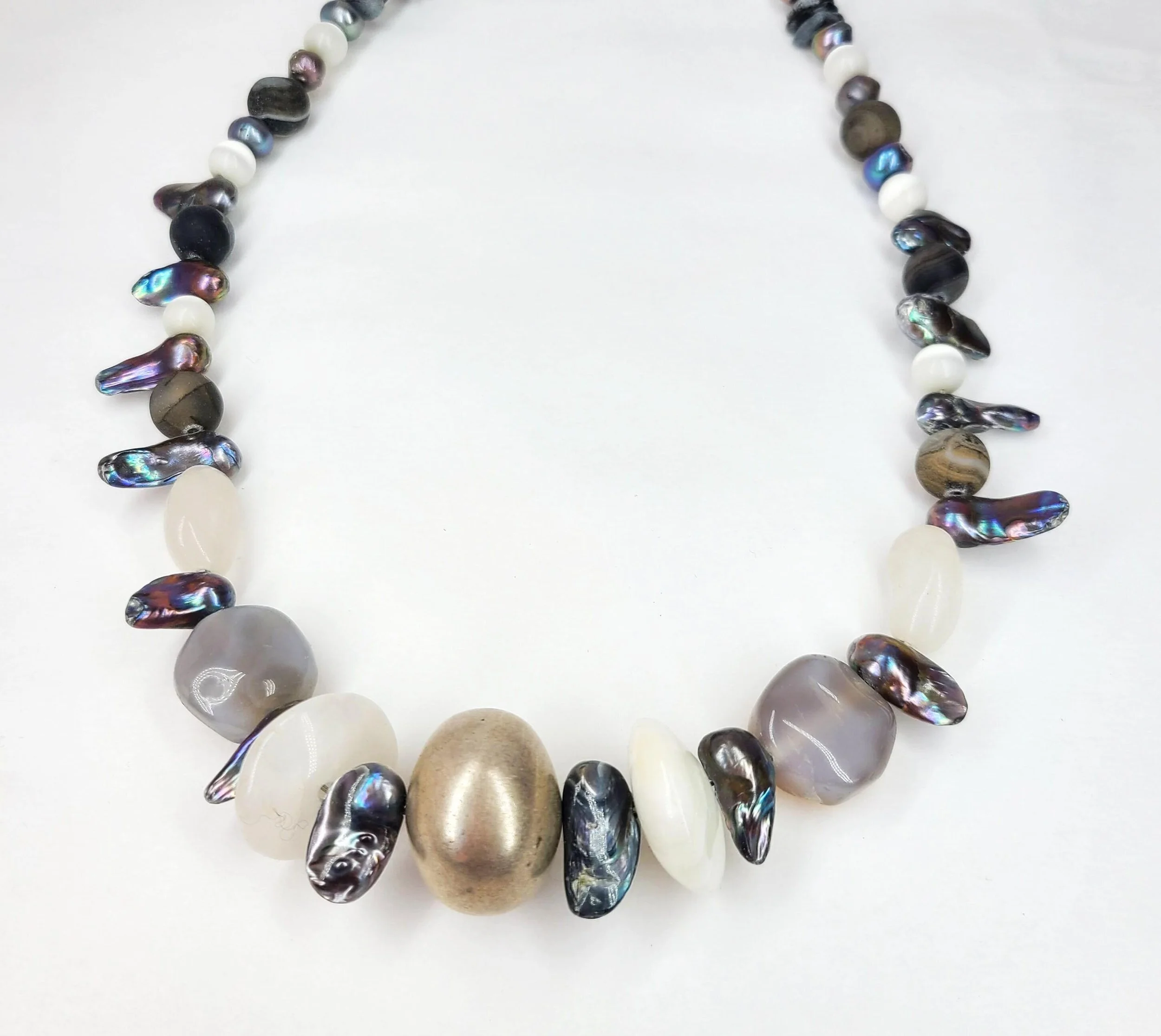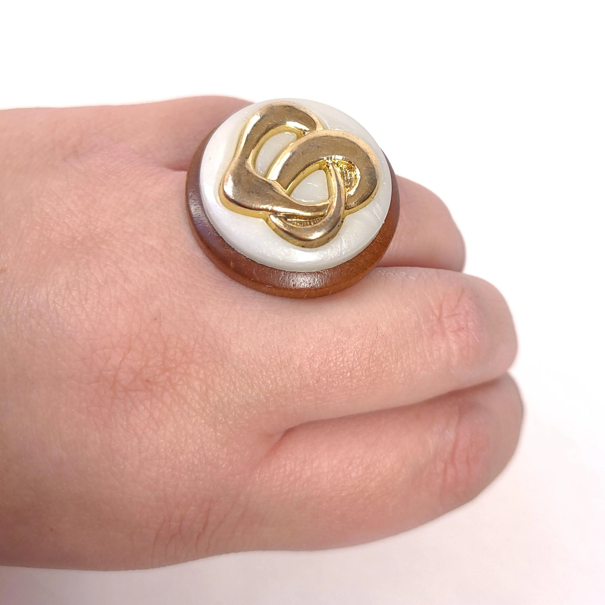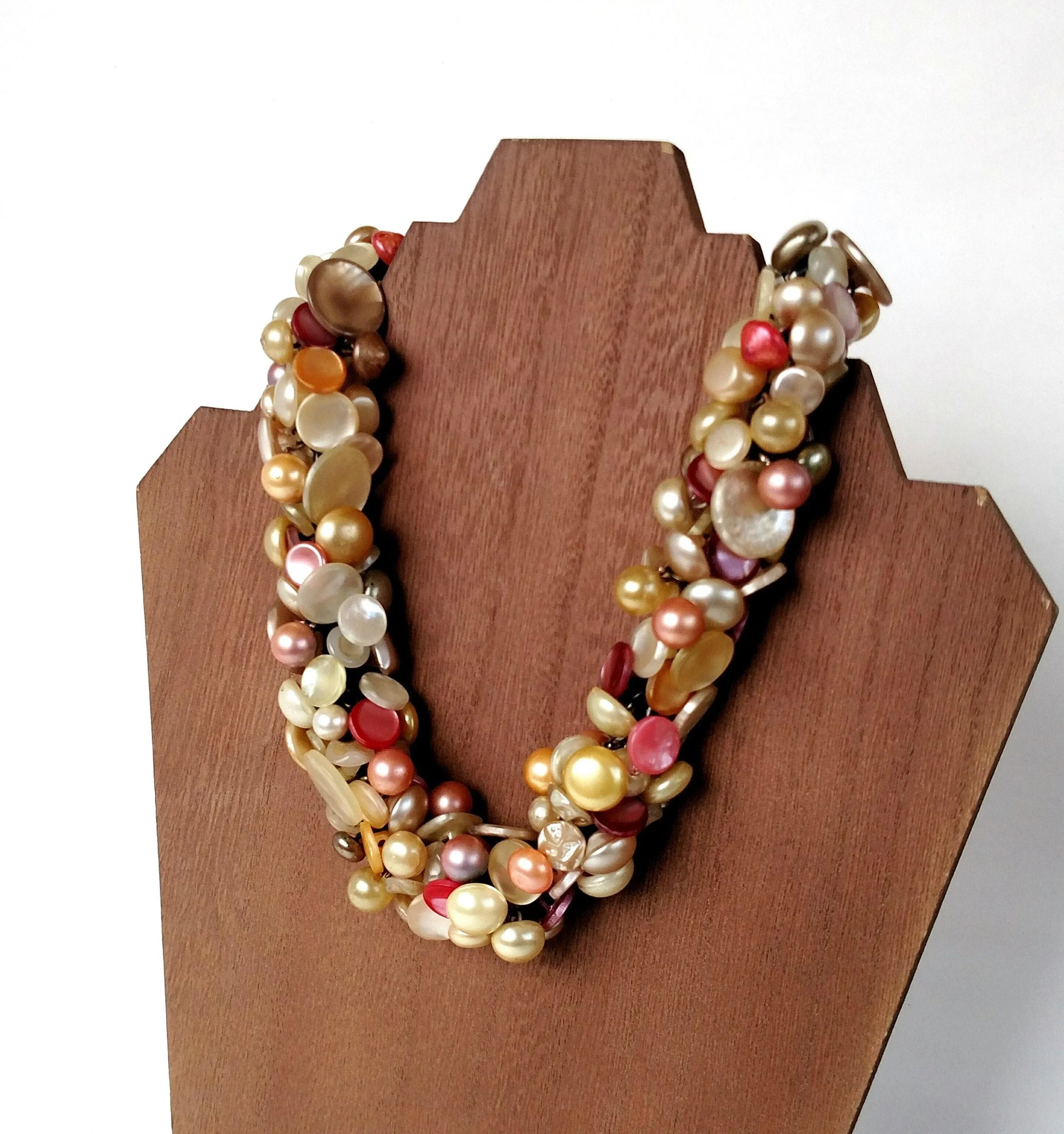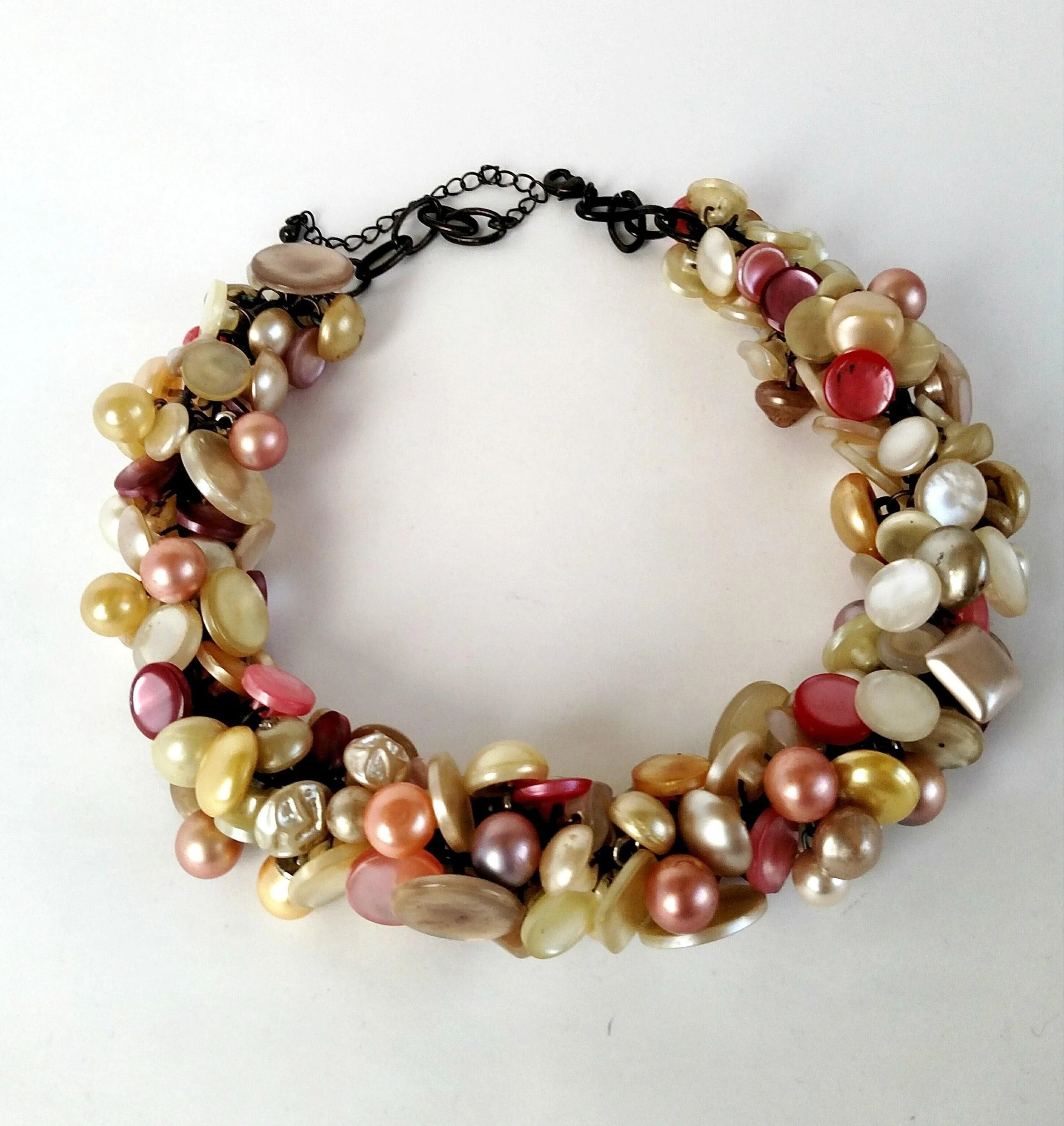 This chunky, funky, one of a kind bracelet was made with a variety of vintage buttons in black, brown and beige, that have been hand stitched onto a acrylic felt backing. The buttons are from the 1950's through the 1990's and are made from various forms of resin, natural shell, and coconut shell in an assortment of sizes, textures and designs. The bracelet is made with several layers of soft felt for extra comfort with an easy button and loop toggle closure. The buttons are used vintage pieces, so there may be some minor scratches or nicks due to their age.