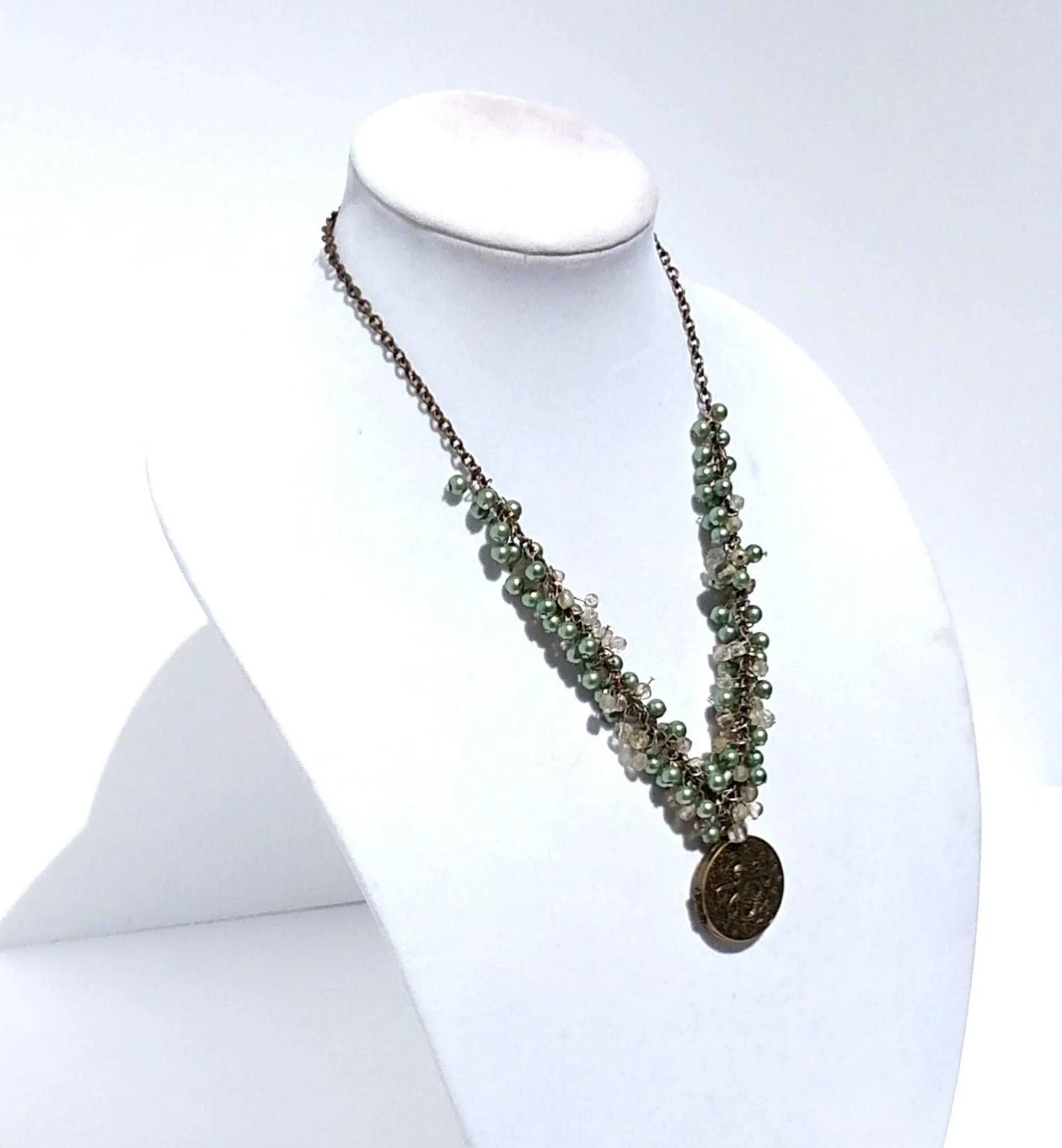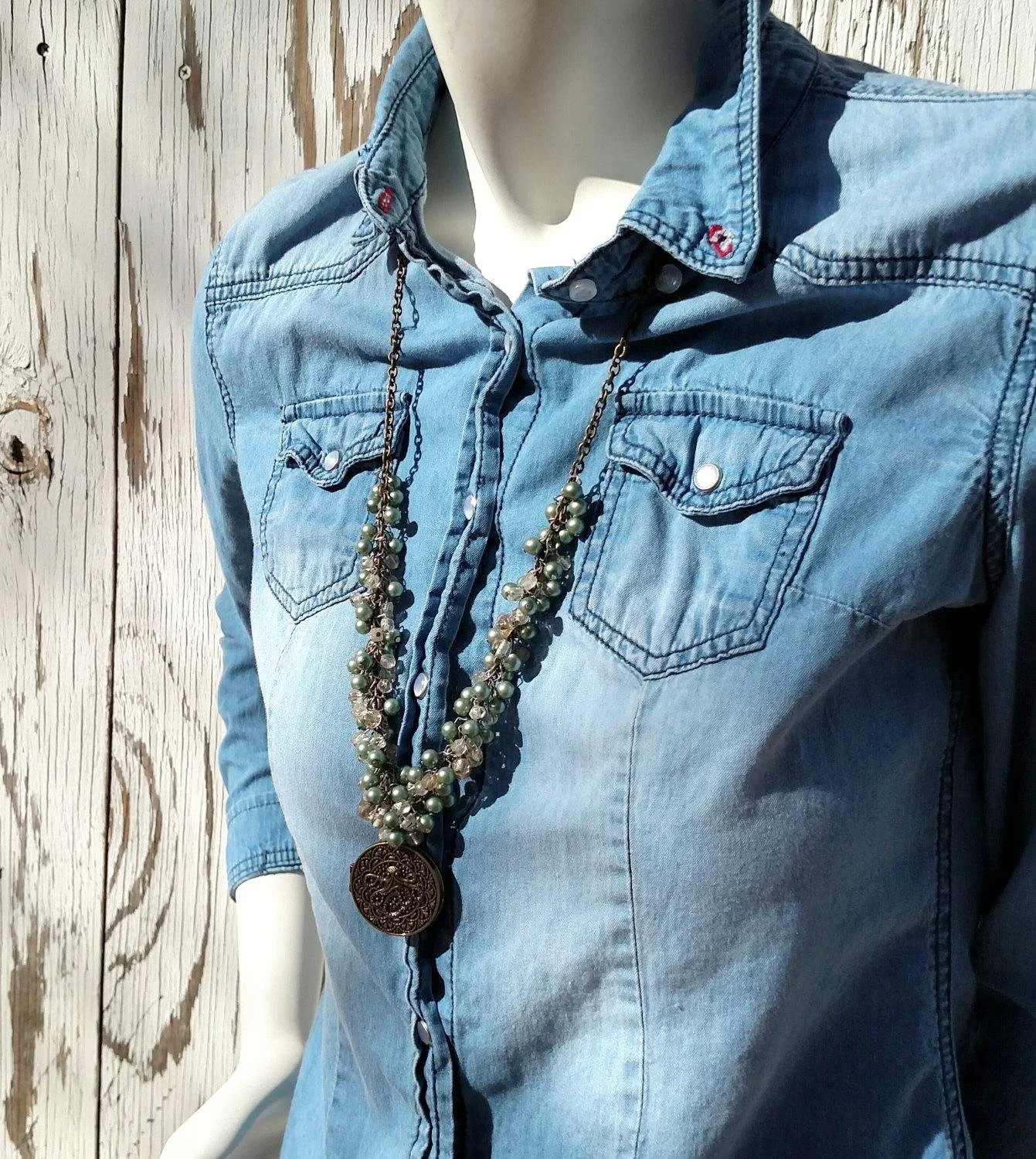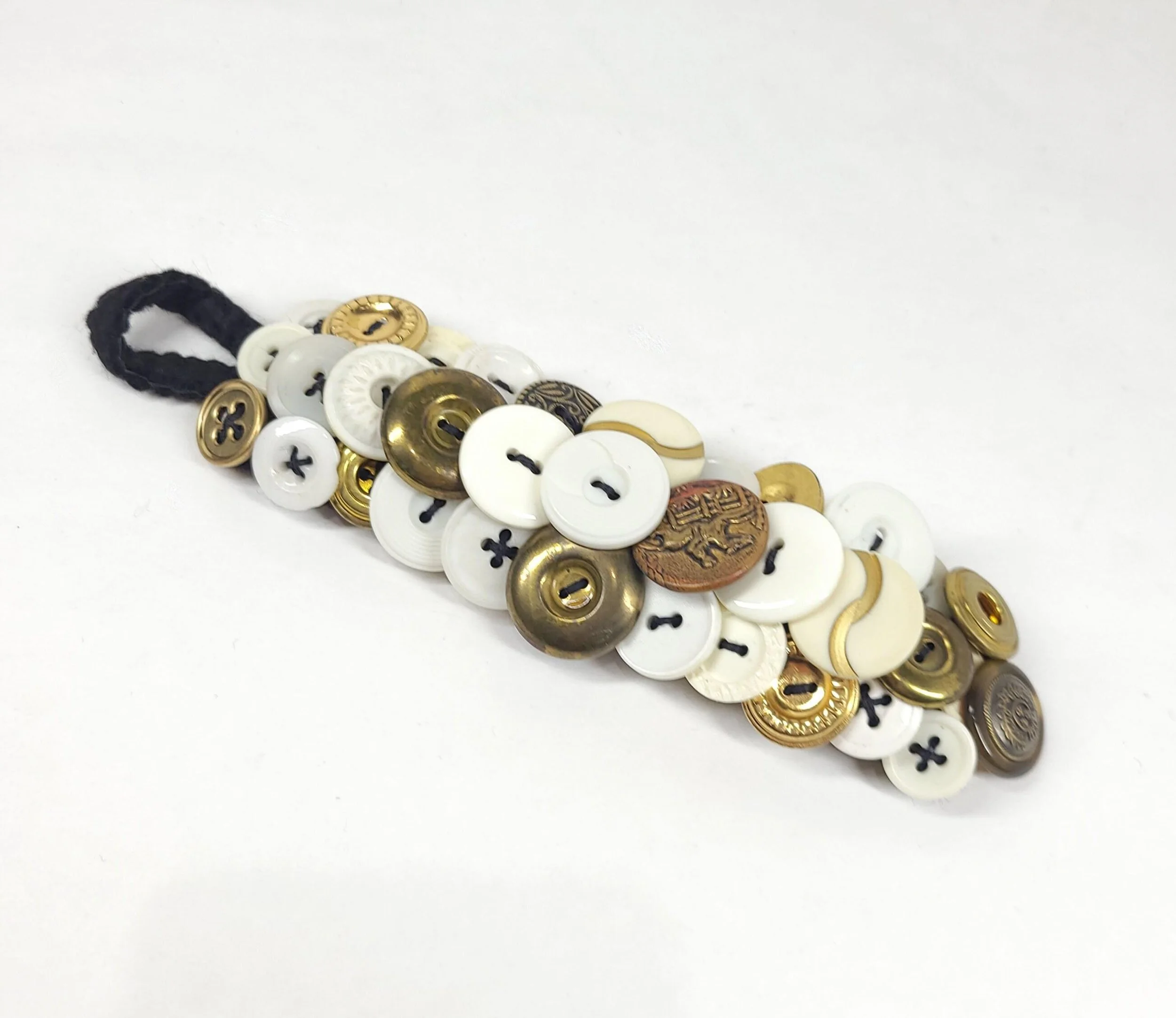 This one of a kind chunky, funky necklace was made with an assortment of vintage buttons in a rich mixture of warm white and butterscotch brown. The buttons are made from plastic in a variety of shapes and sizes and they hang from a silver tone nickel free metal chain that features a lobster claw clasp. The buttons on this necklace are vintage so there may be some light scratches, cracking or discoloration to some pieces.