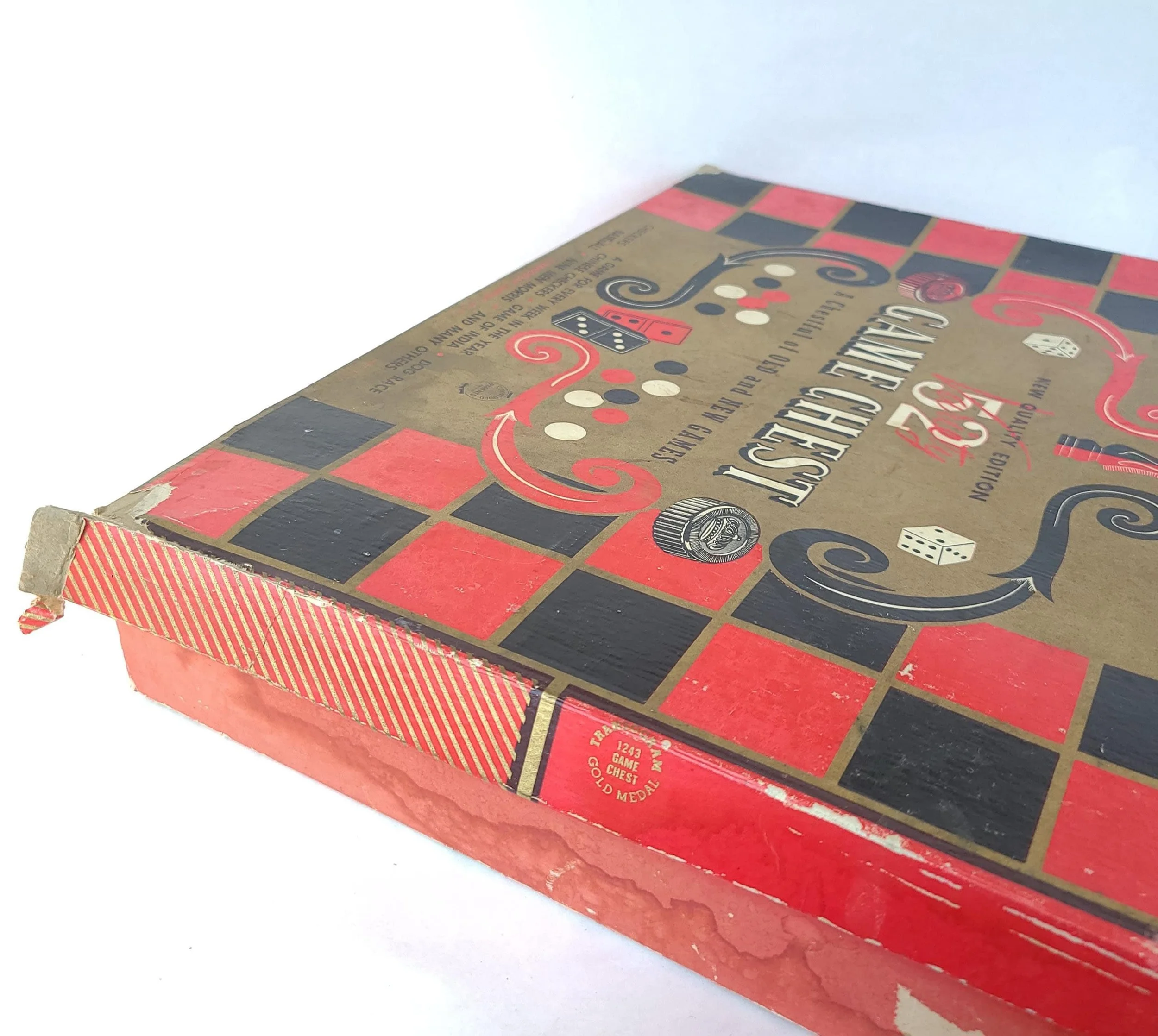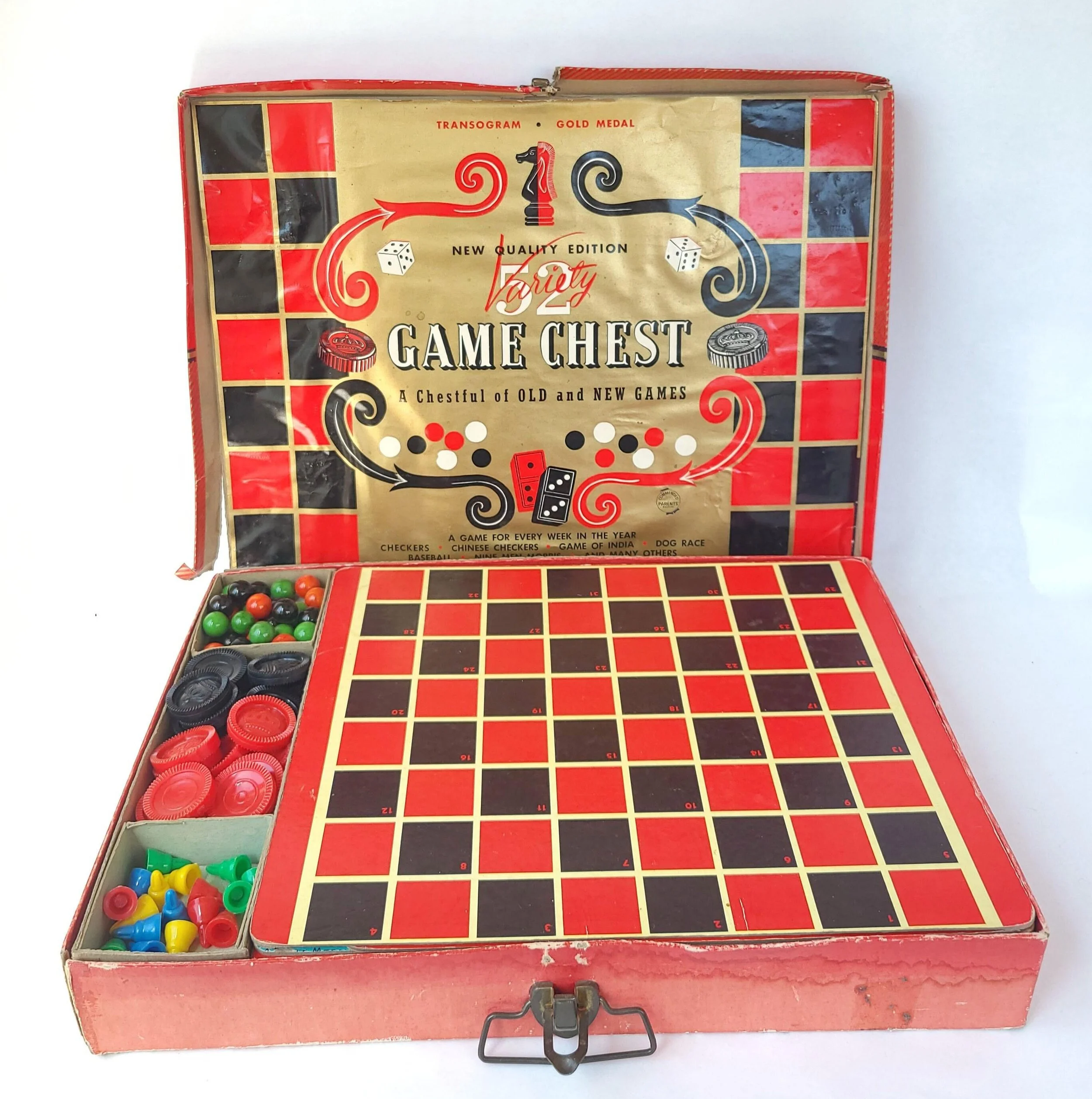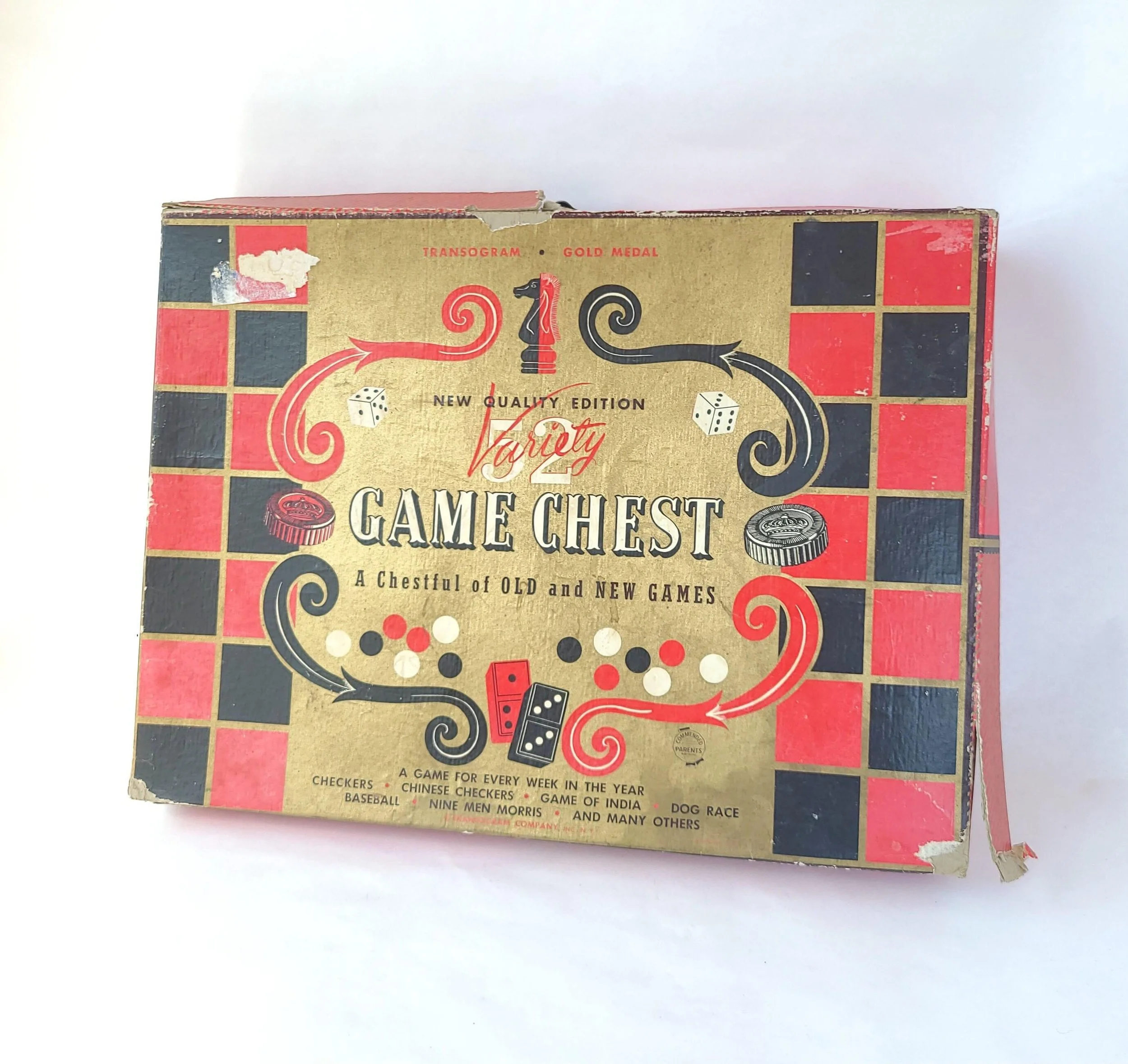 This gorgeous vintage 1950's 52 Variety Game Chest was made by the Transogram Company. The set includes: