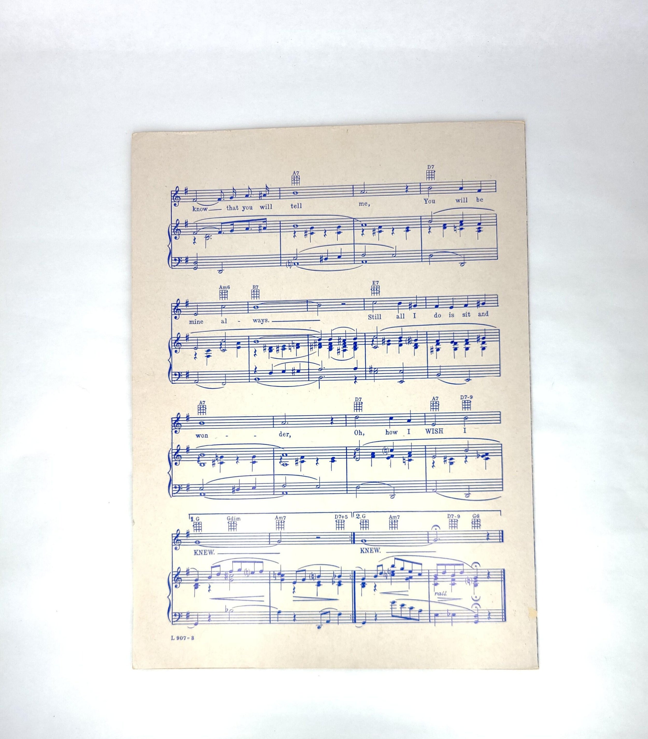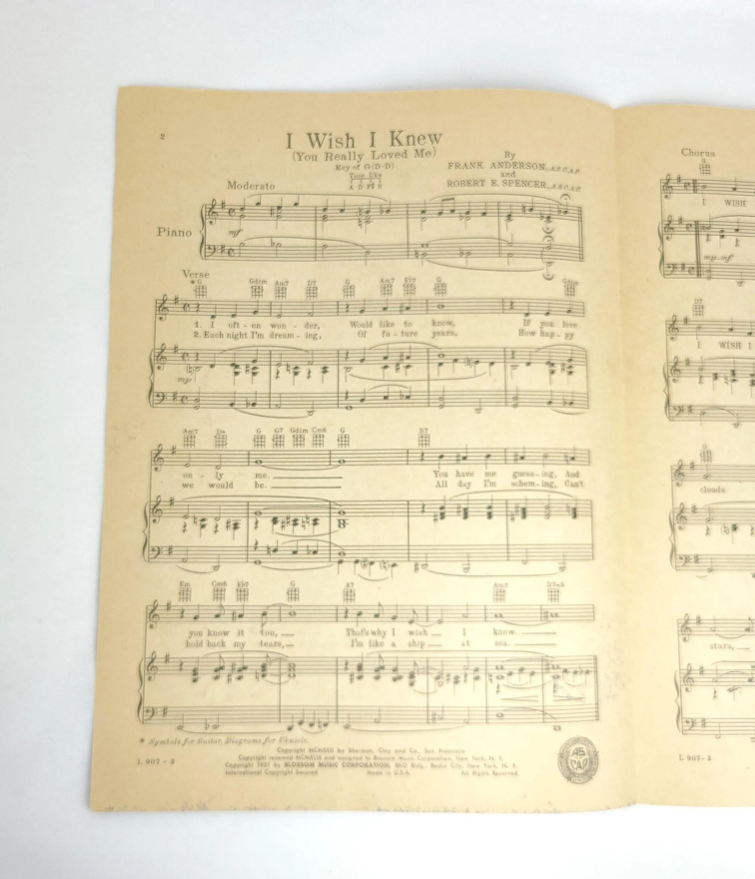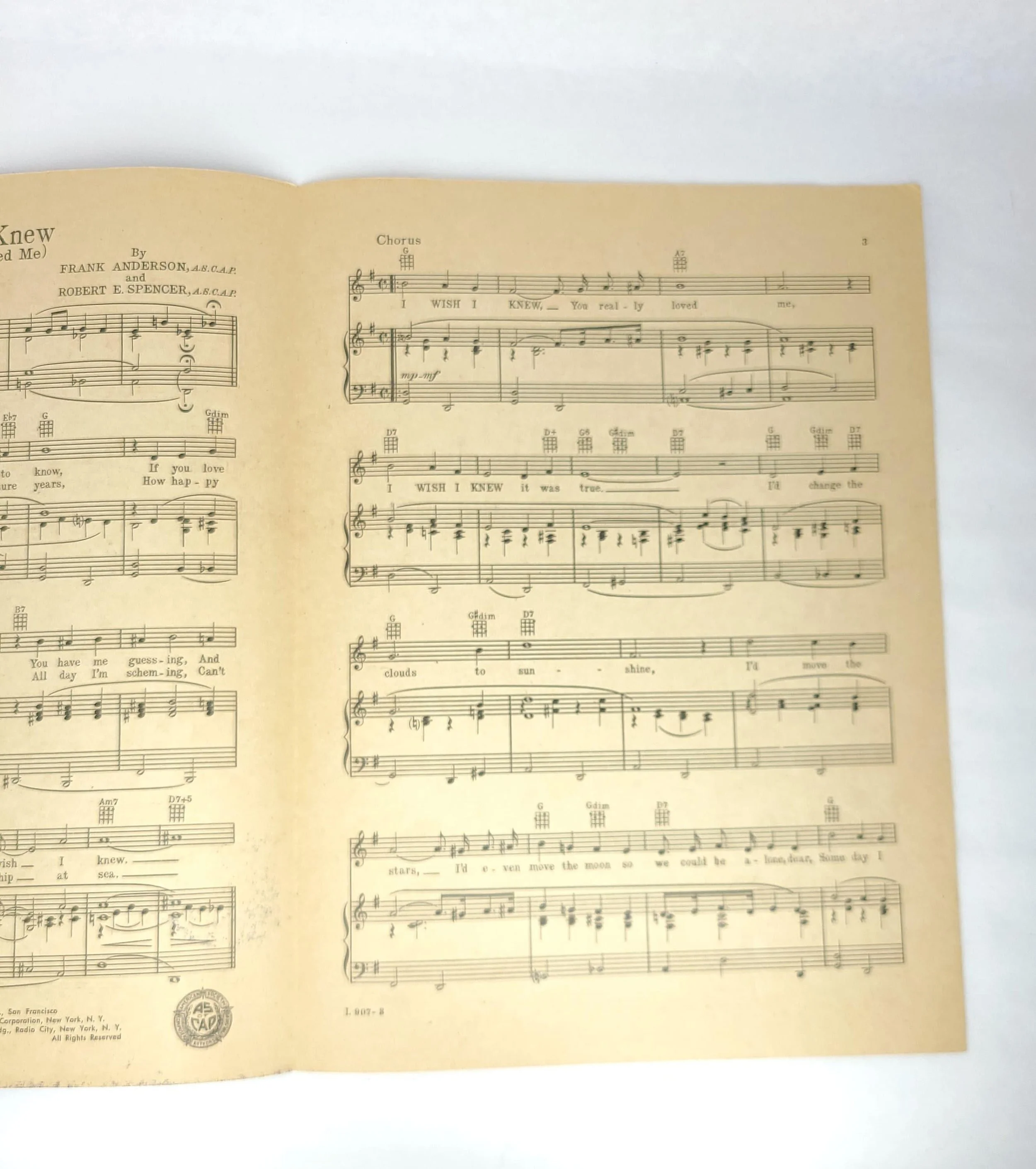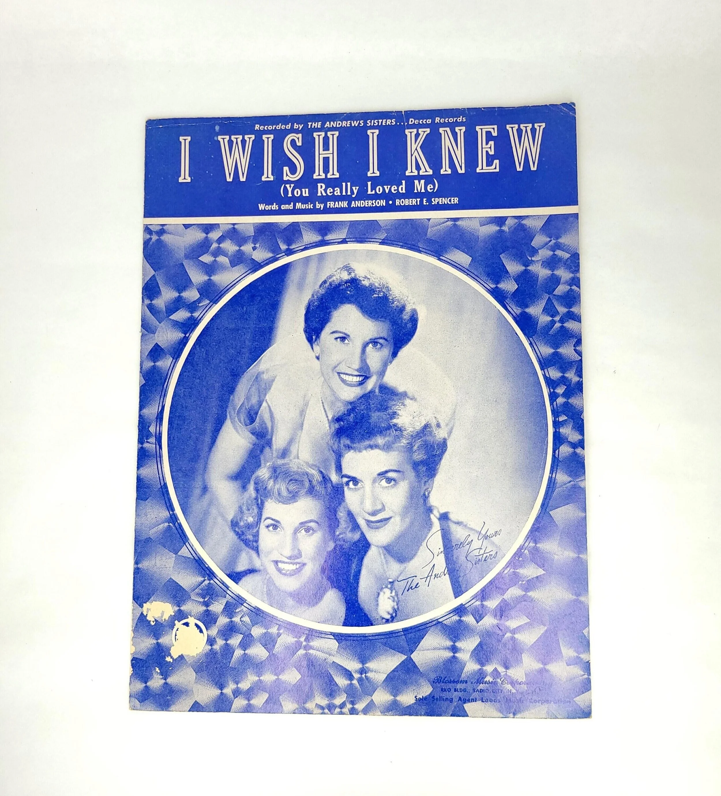 This is vintage 1951 sheet music for the song I Wish I Knew (You Really Loved Me) made famous by the Andrews Sisters. The booklet is in vintage condition with a tear to the front from removing the price tag, and some wear to the edges. There is also yellowing and some minor discoloration to the inside pages.