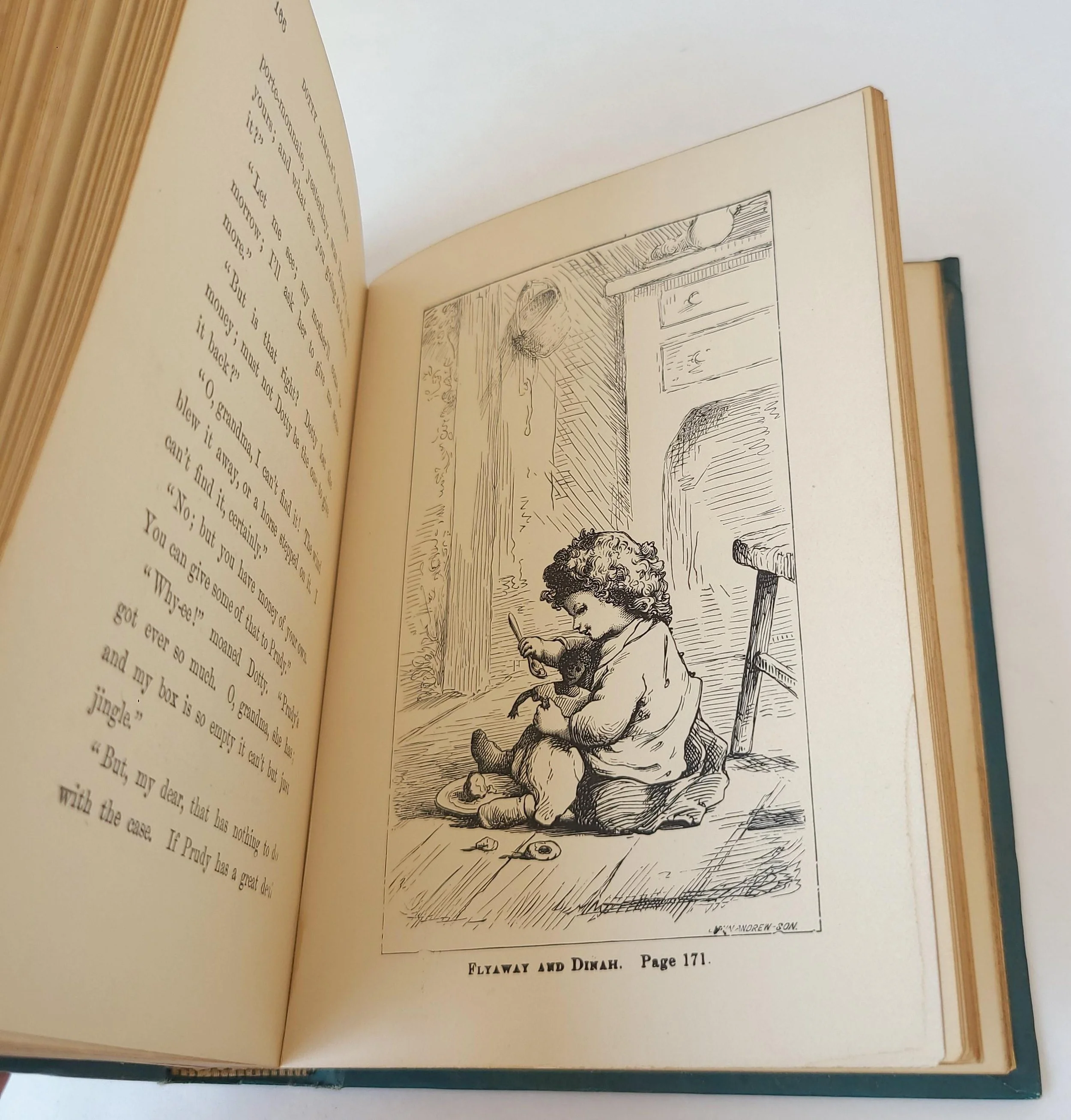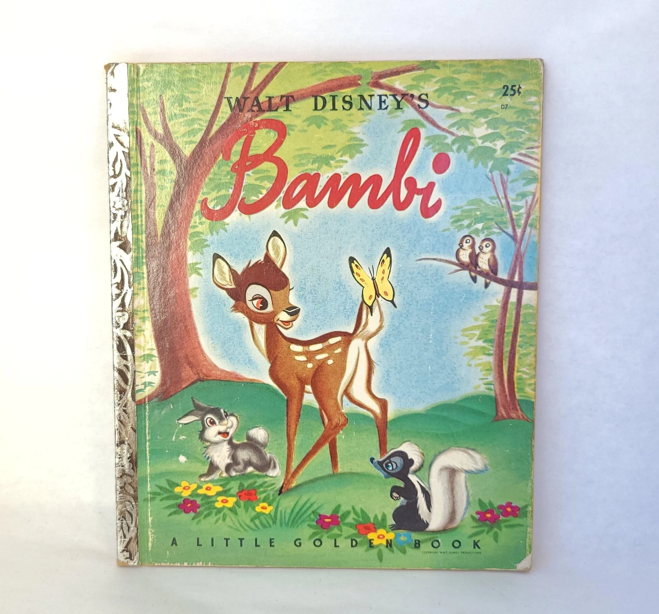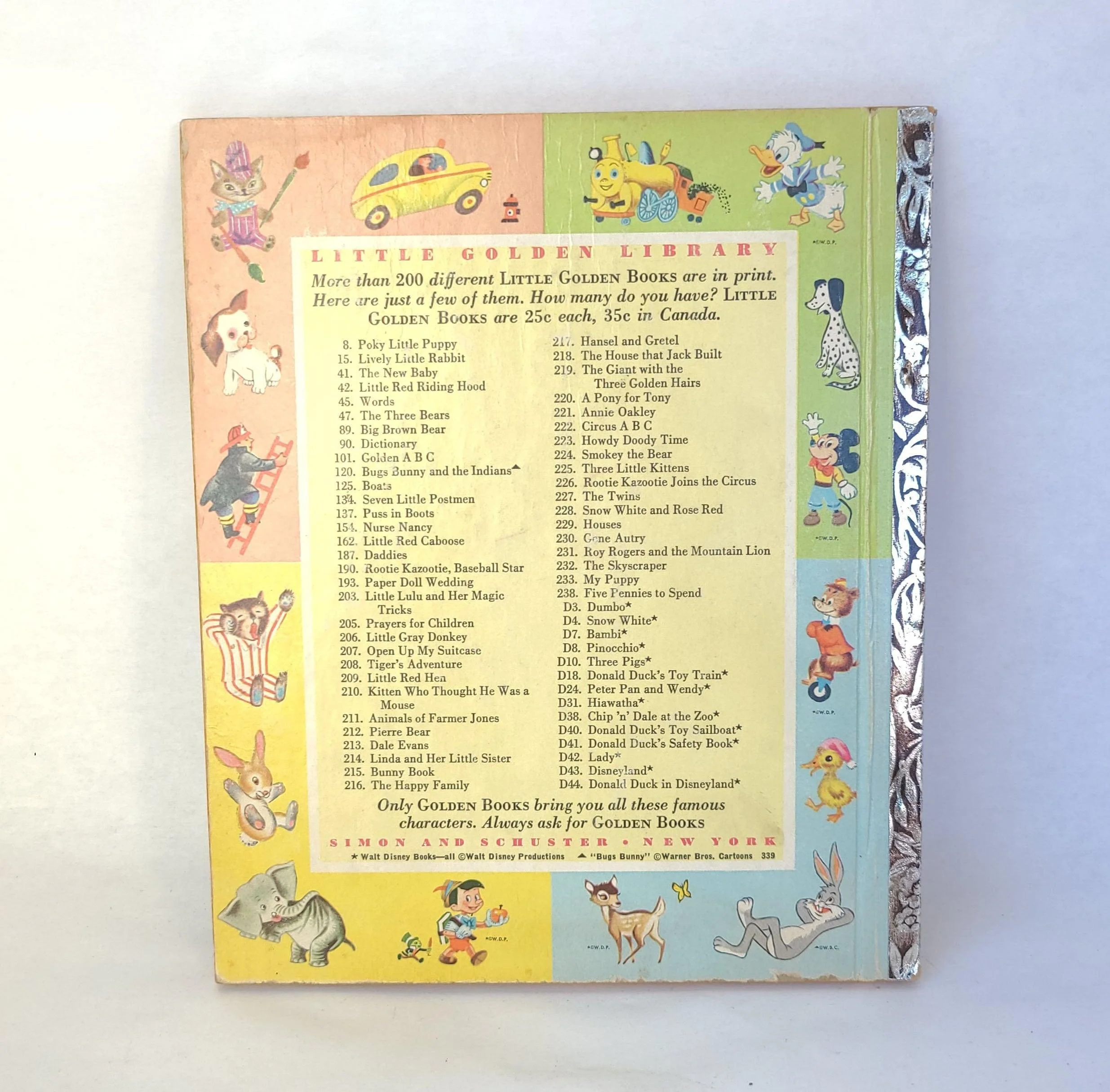 This darling vintage 1957 first hardcover edition of Freddy was written by Miriam Mason and illustrated by Vee Guthrie. It tells the story of a brave little rabbit named Freddy and his adventures with his family at their new farm. The book belonged to a school library so it has had the image from the dust jacket clipped and adhered to the cloth cover which does have some wear to the edges and spots of discoloration. There are some marks on the front cover from the library, and a checkout card pouch inside the front cover along with some stamps and marks. There are a few creased pages and a few small stains, but there are no torn or marked pages and good overall color quality.