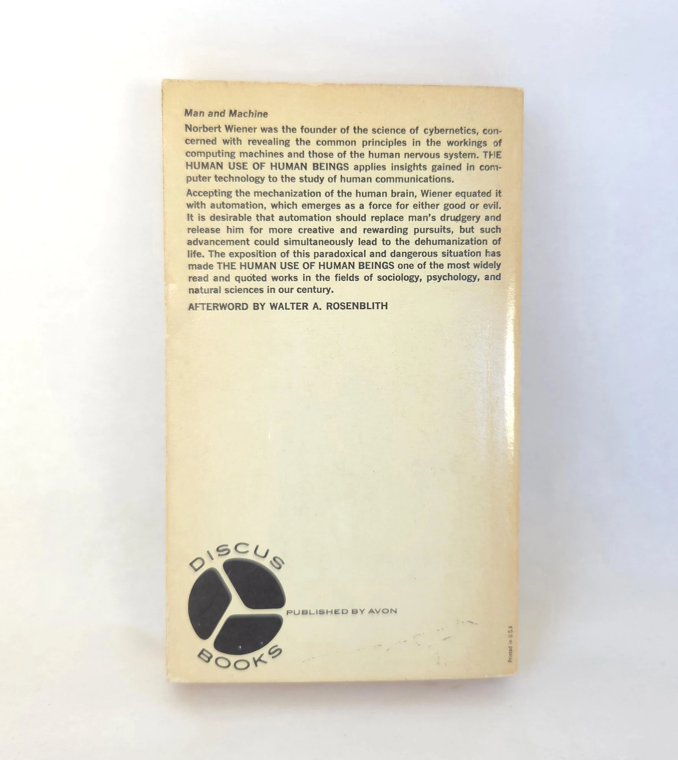 This vintage paperback edition of The Human Use of Human Beings: Cybernetics and Society by Norbert Wiener was published by Avon in 1969. Considered the "single most important and influential work on the relation between computer technology and the social sciences" this book was written by the founding thinker of cybernetics theory and an influential advocate of automation. This copy is in used vintage condition with some wear and creases to the edges of the cover along with some minor discoloration from age. There are small notes and pencil marks to the margins, but there are no torn pages and good overall color quality.