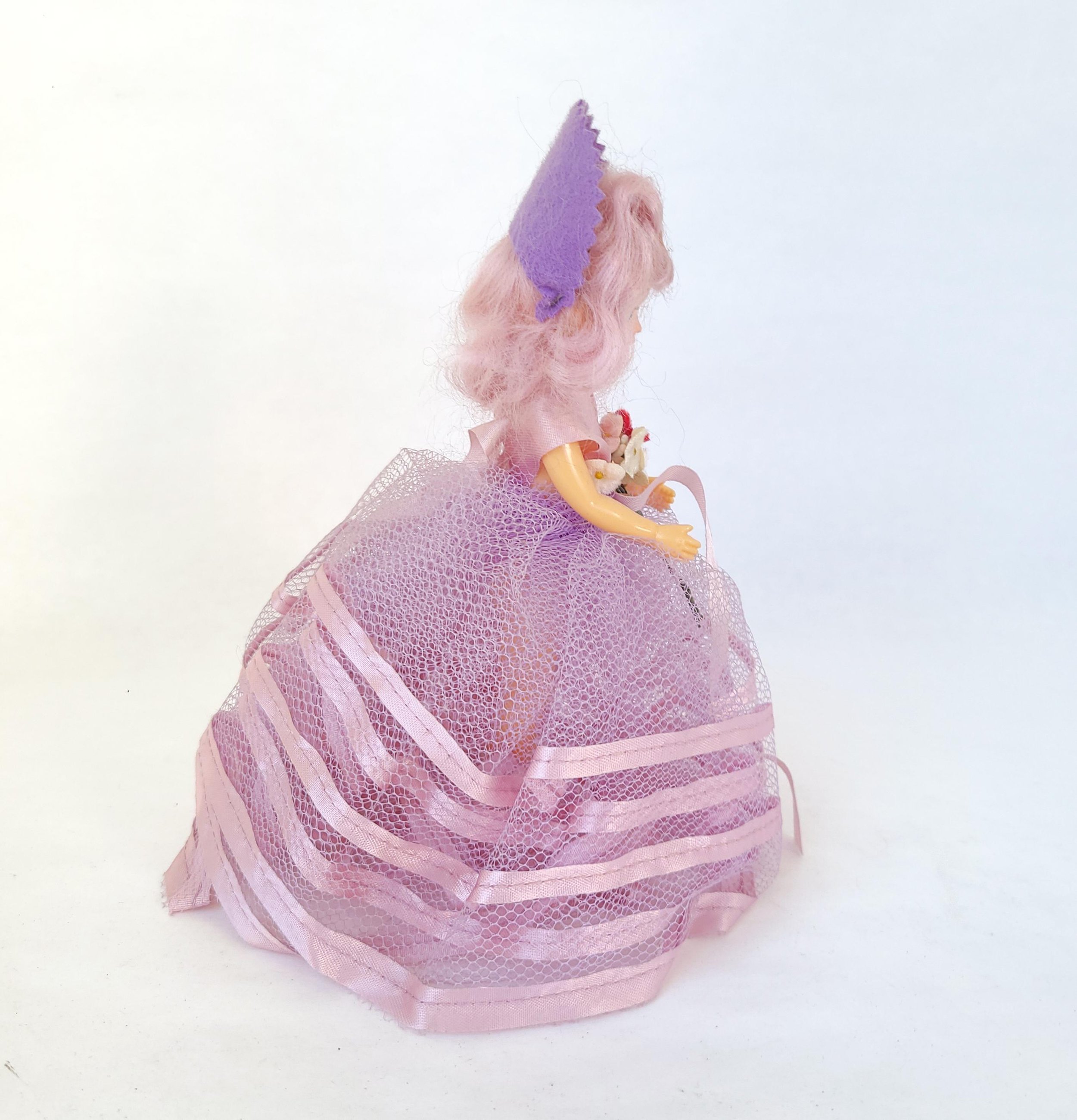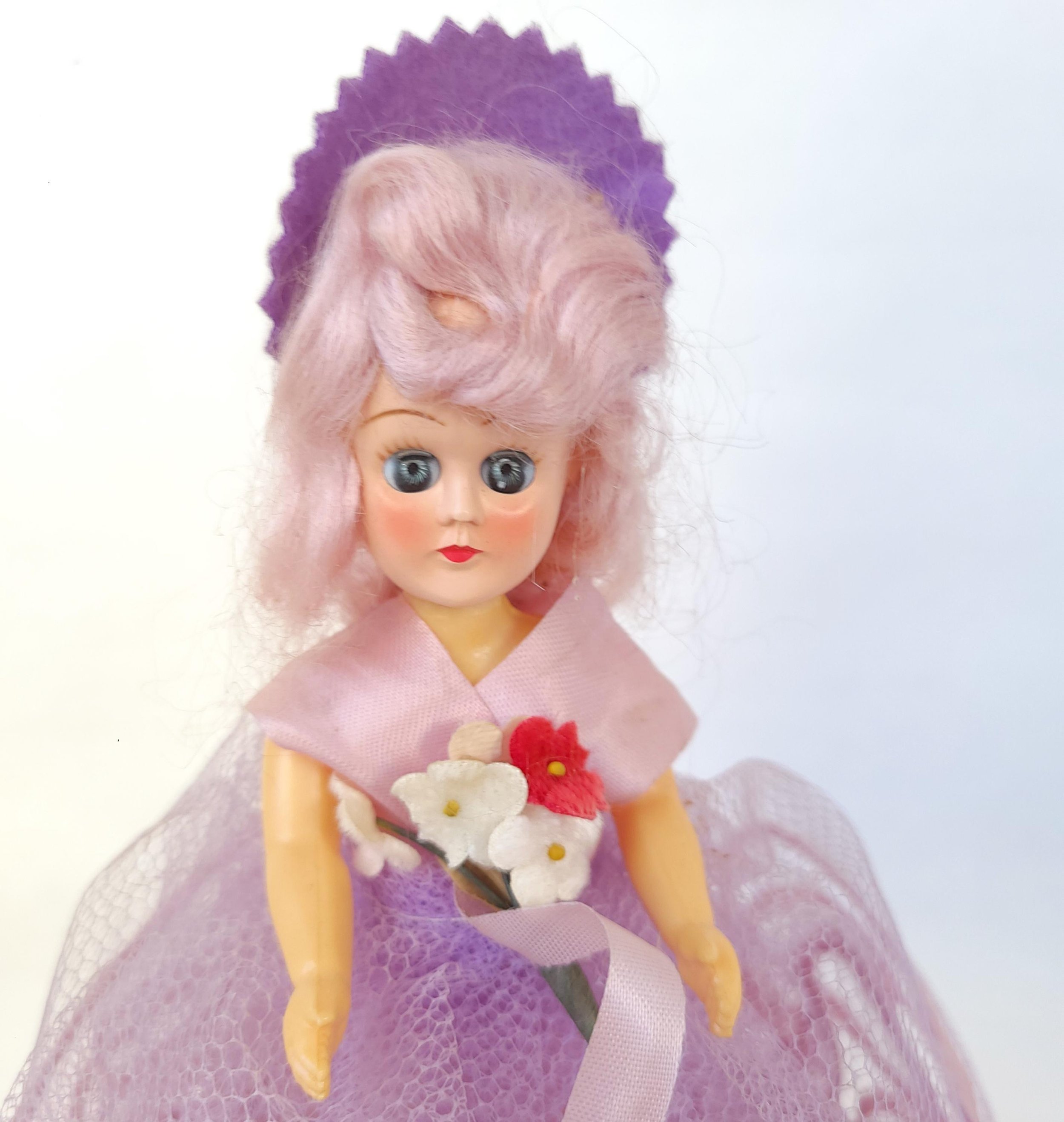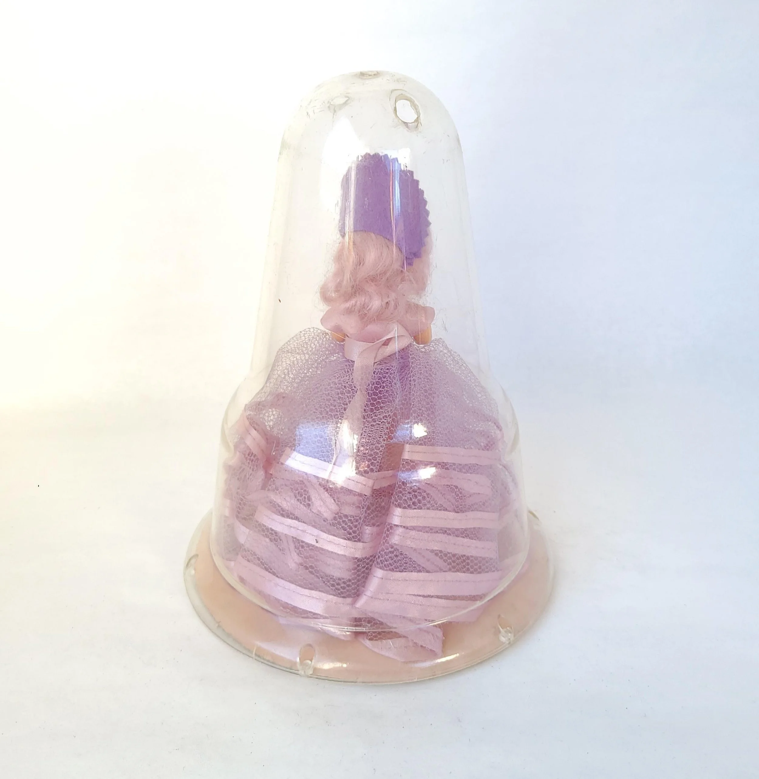 This darling vintage A&H Fair Doll is decked out in a gorgeous lilac purple mesh skirt and is rocking sassy pink hair. She is still in her original plastic bell dome - perfect for displaying her on your shelf or desk. The piece is in used condition with some scratches and scuffs to the plastic dome, as well as a couple of notes from the original on the paper bottom to the dome. The doll itself is in good condition with no stains or tears and excellent overall color quality.