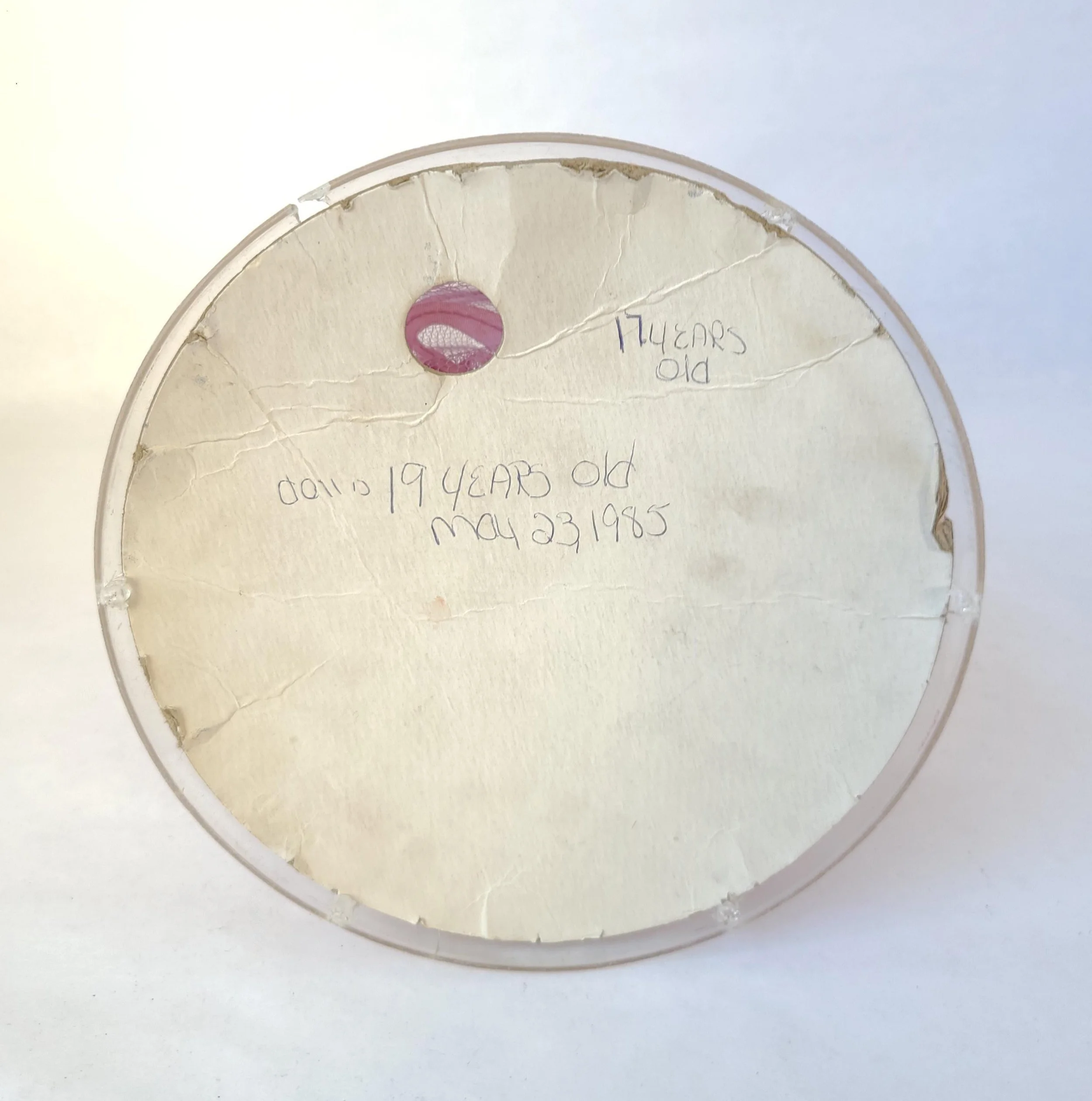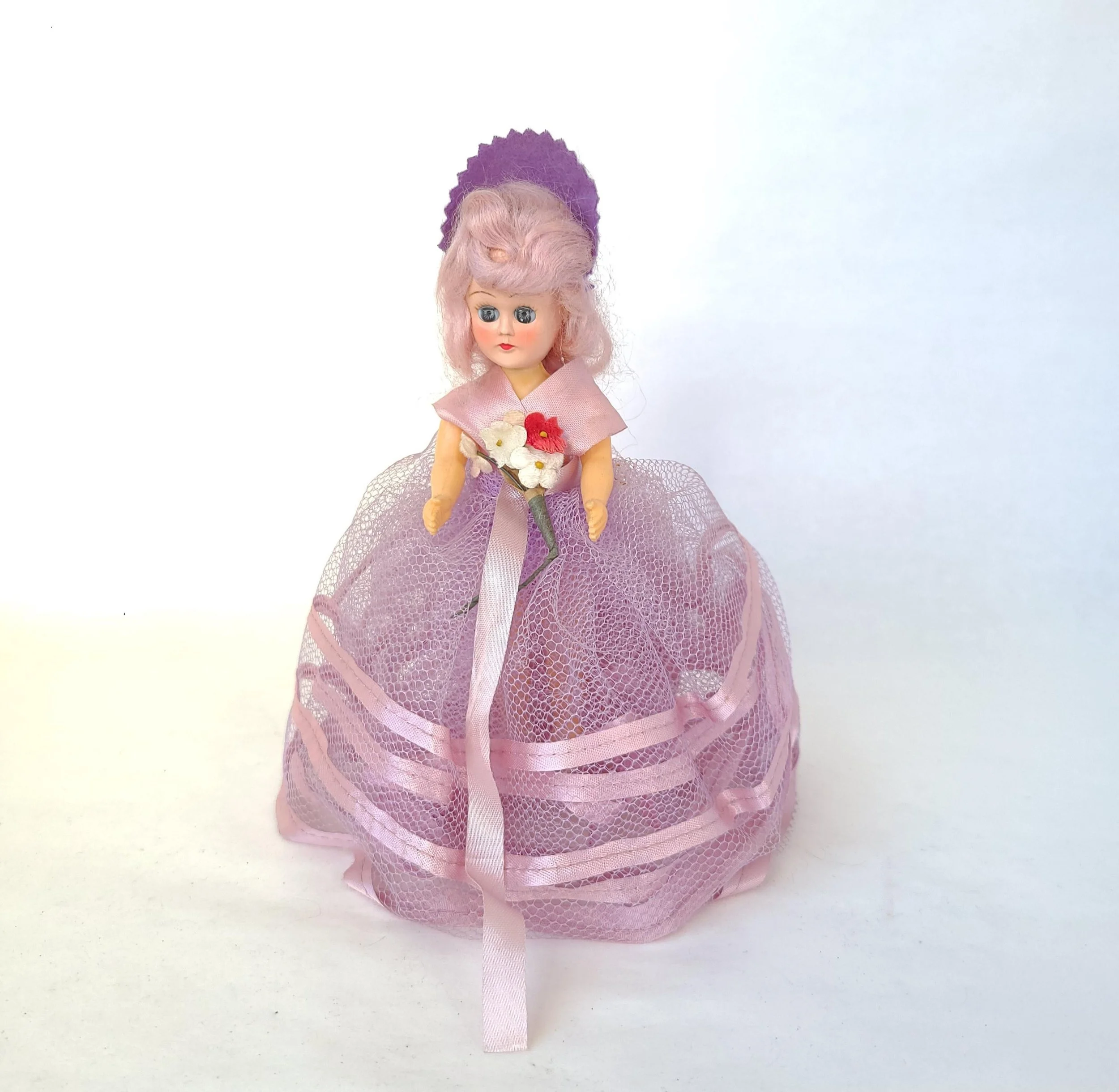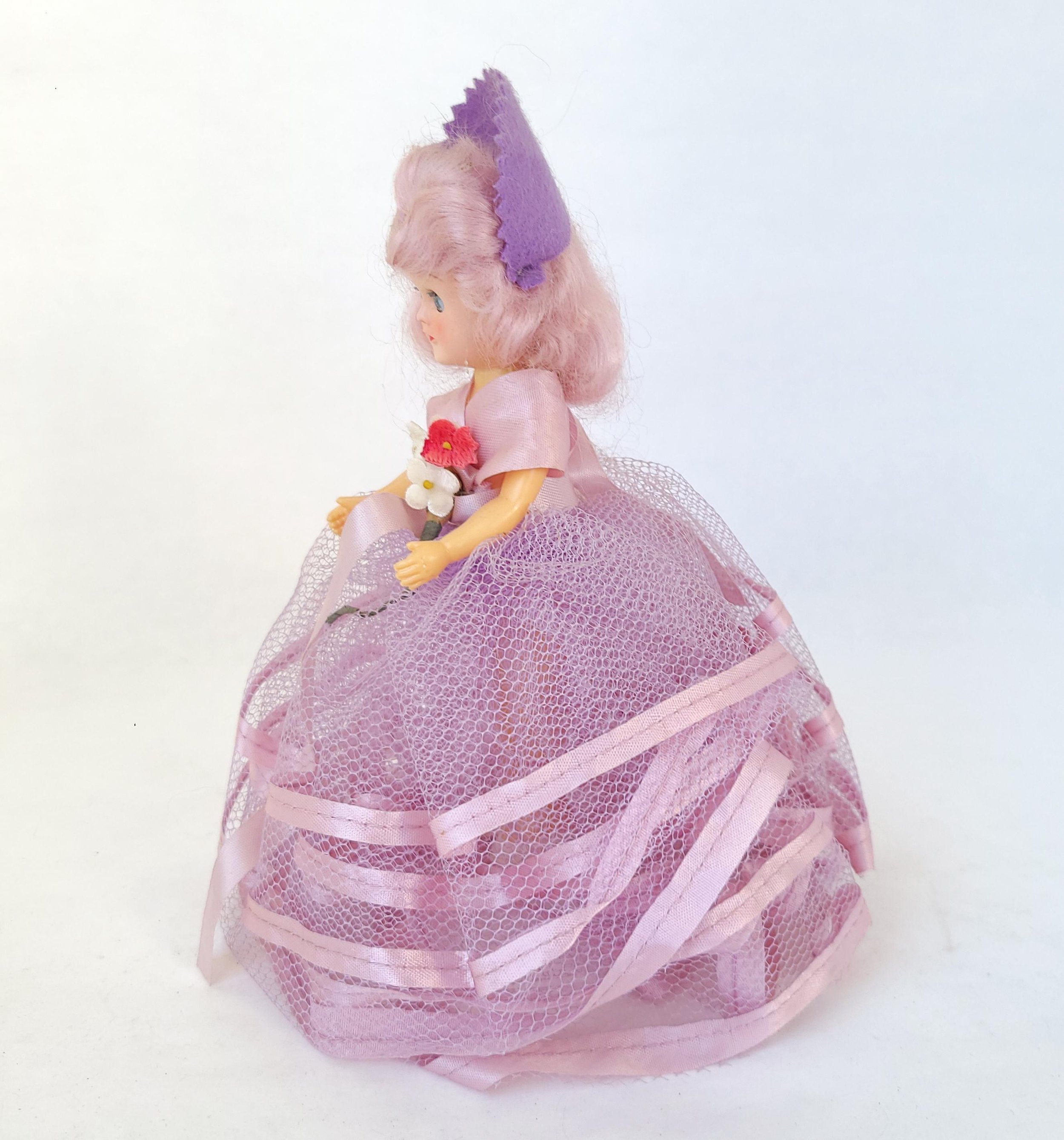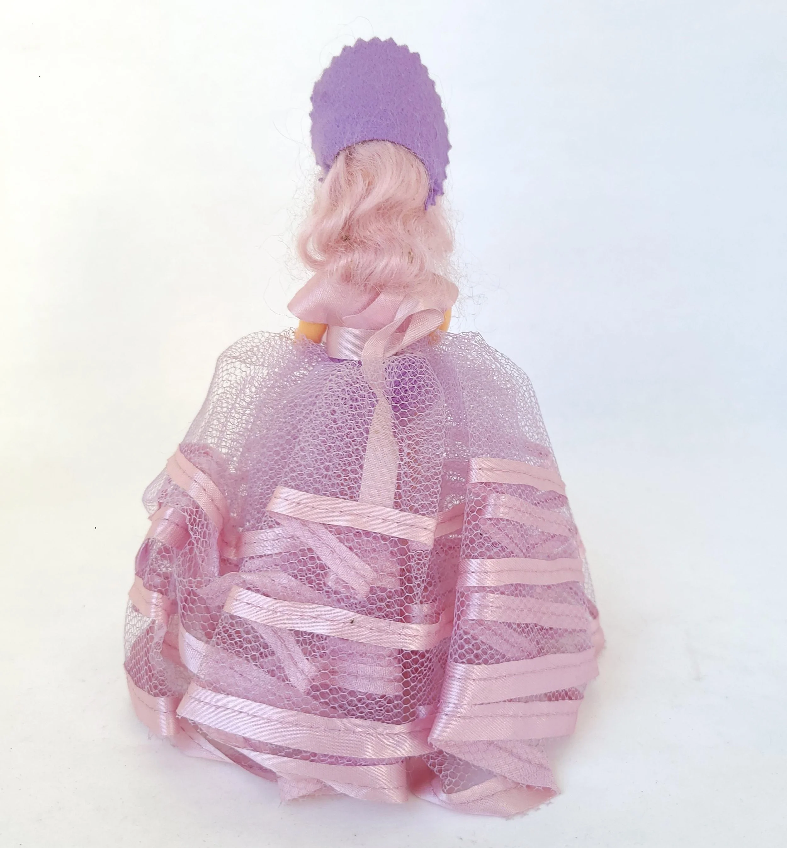 This darling vintage A&H Fair Doll is decked out in a gorgeous lilac purple mesh skirt and is rocking sassy pink hair. She is still in her original plastic bell dome - perfect for displaying her on your shelf or desk. The piece is in used condition with some scratches and scuffs to the plastic dome, as well as a couple of notes from the original on the paper bottom to the dome. The doll itself is in good condition with no stains or tears and excellent overall color quality.