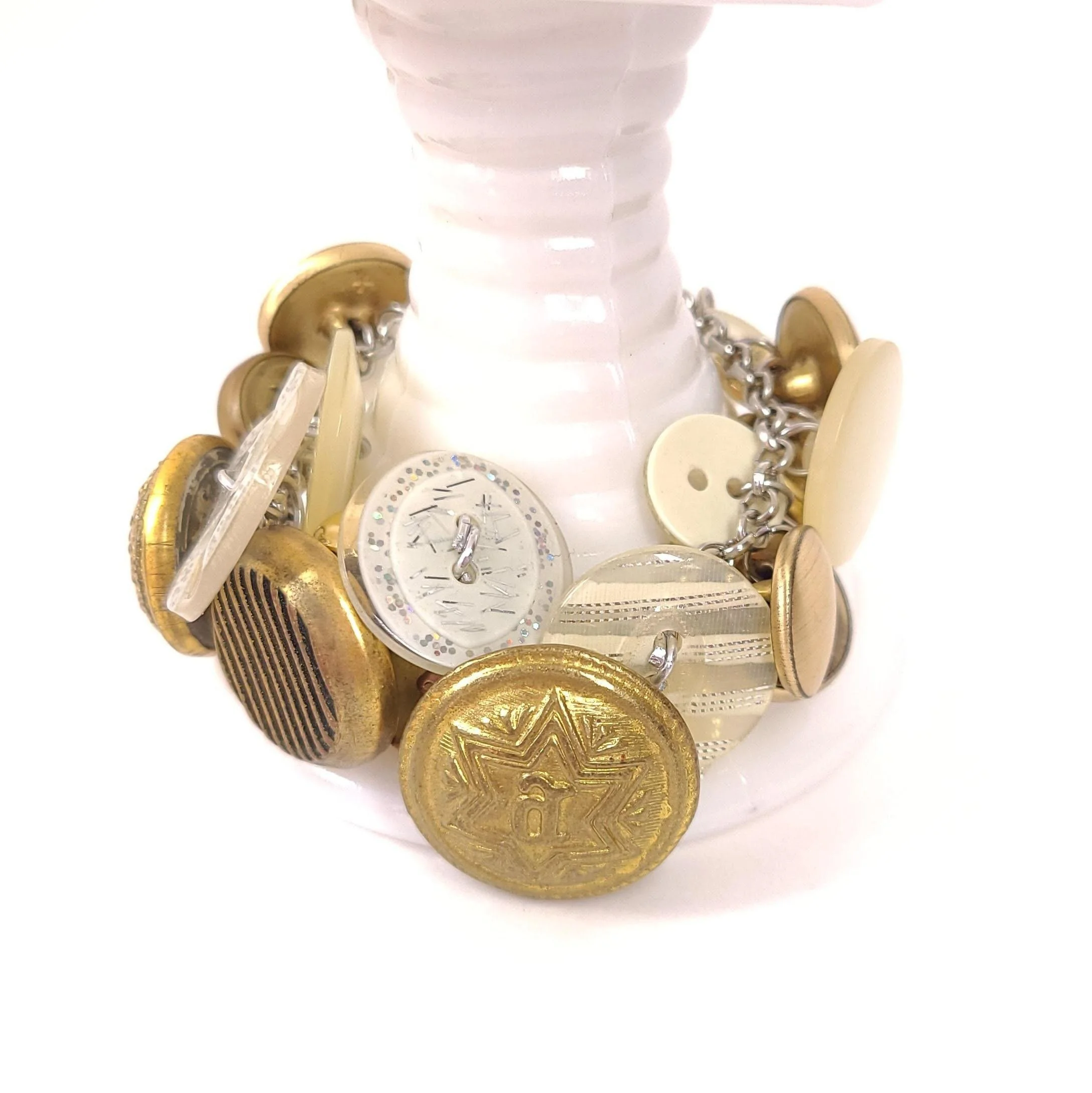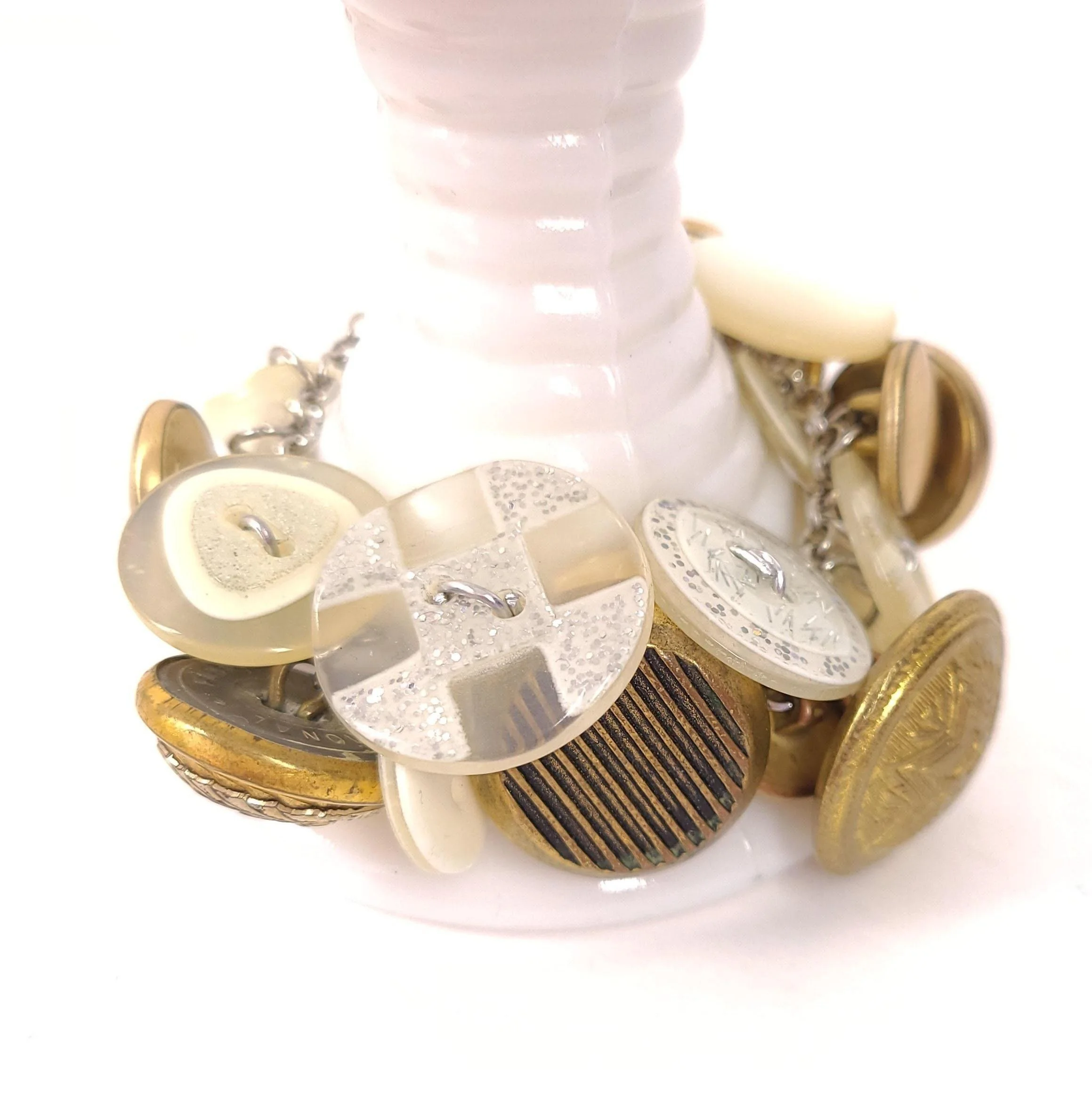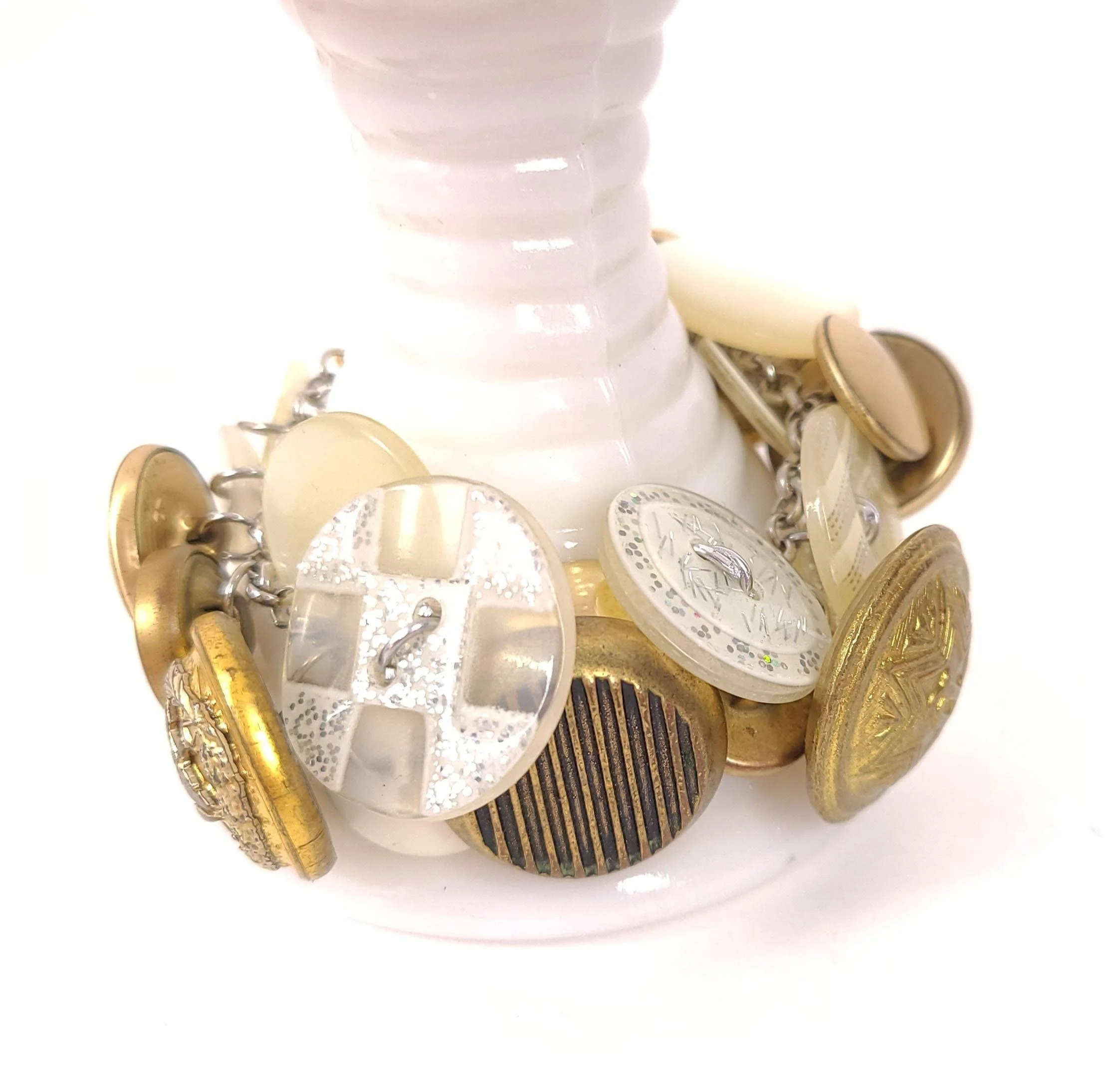 This charming ring was made using vintage buttons stacked together to make this one a kind statement piece. The larger button on the bottom is opaque shiny black made from plastic, the middle piece is milky marbled beige made from celluloid and the top button is made from silver metal with a textured leaf design.