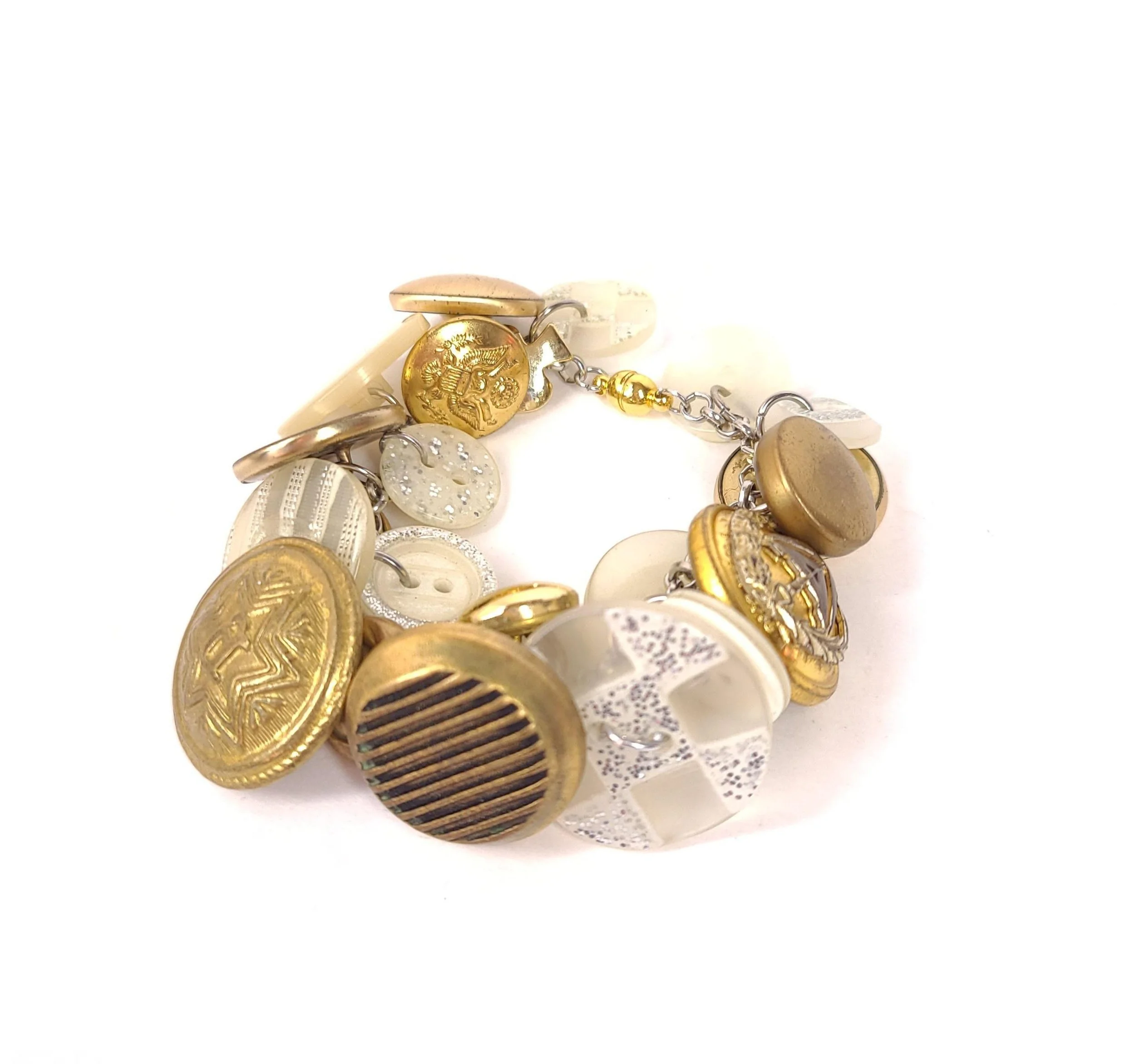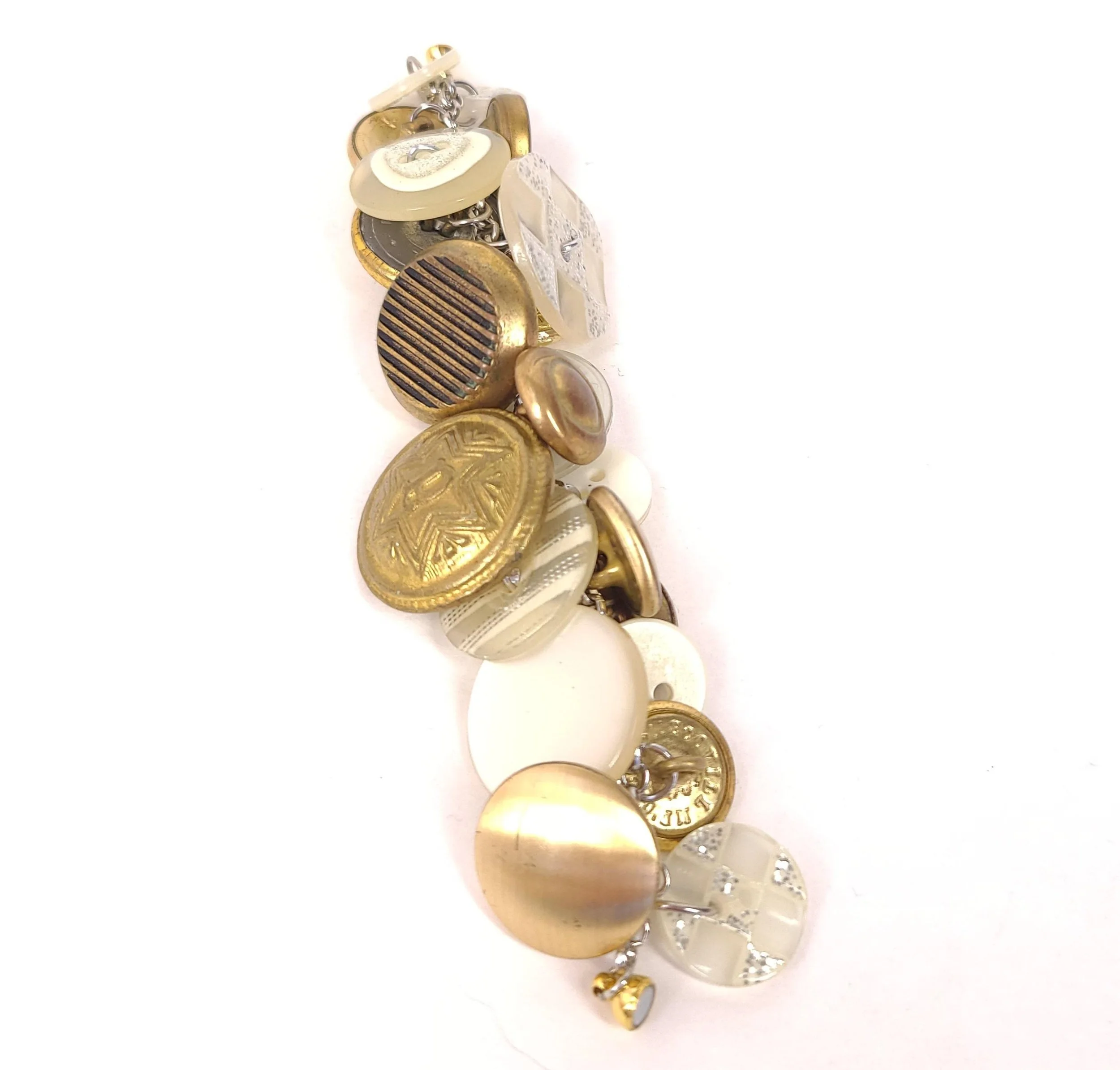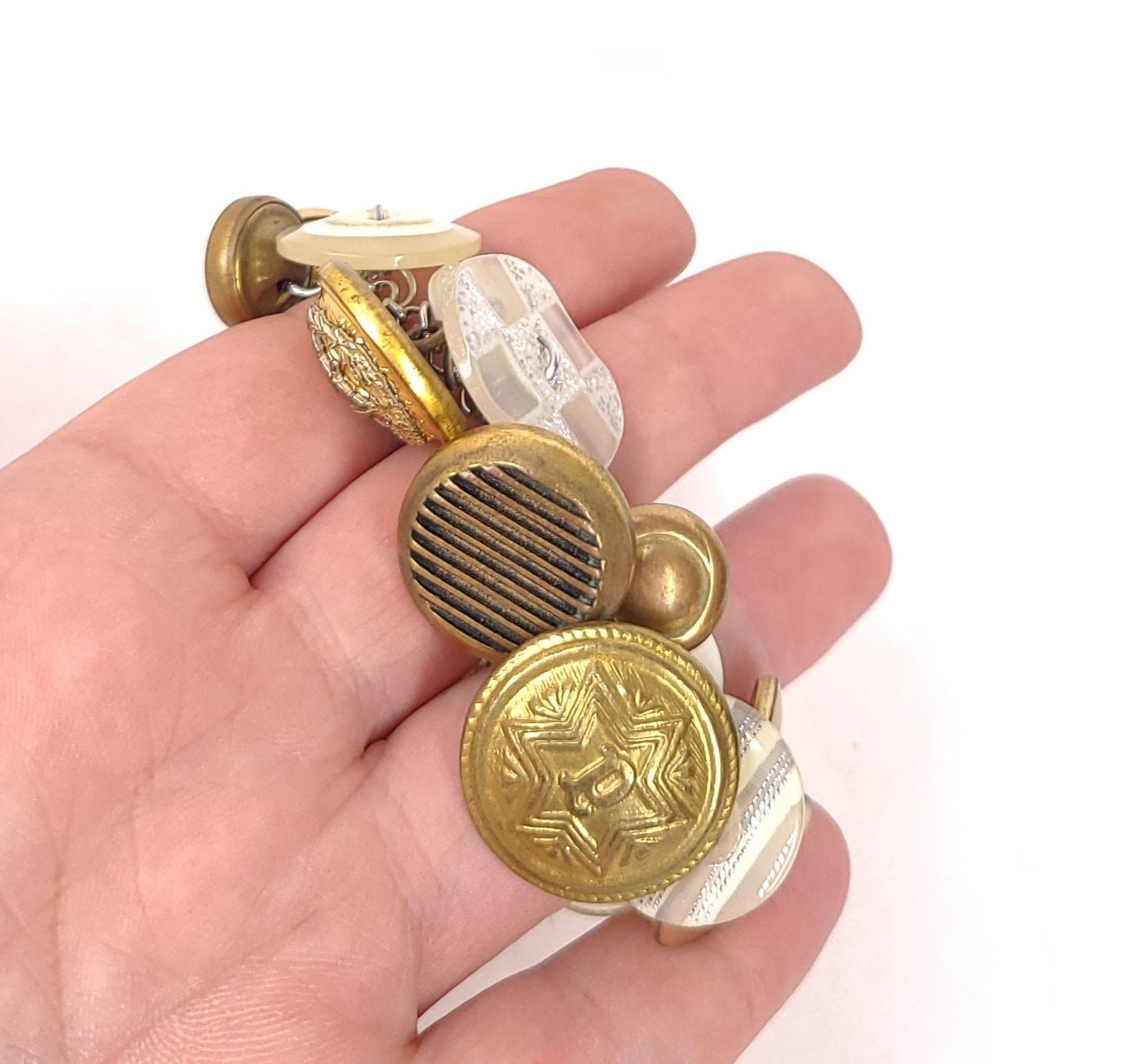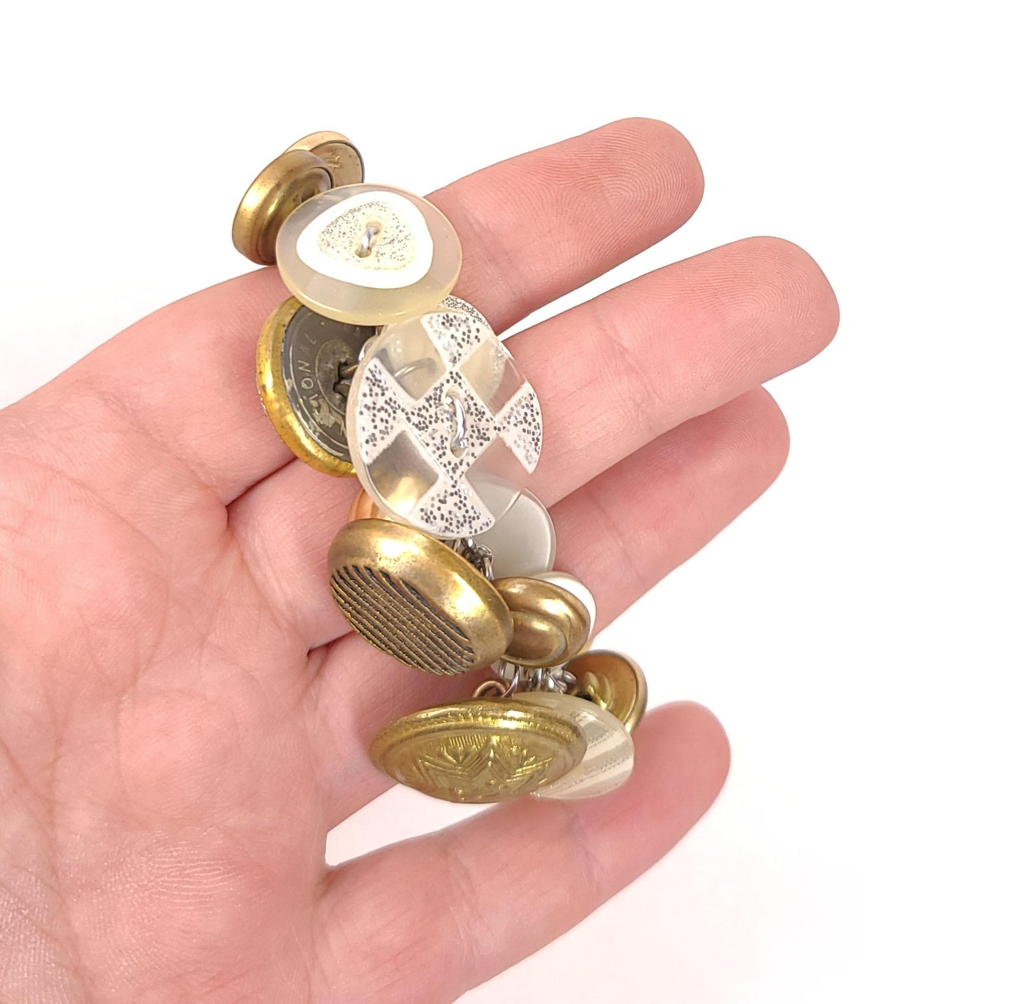 This charming ring was made using vintage buttons stacked together to make this one a kind statement piece. The larger button on the bottom is opaque shiny black made from plastic, the middle piece is milky marbled beige made from celluloid and the top button is made from silver metal with a textured leaf design.
