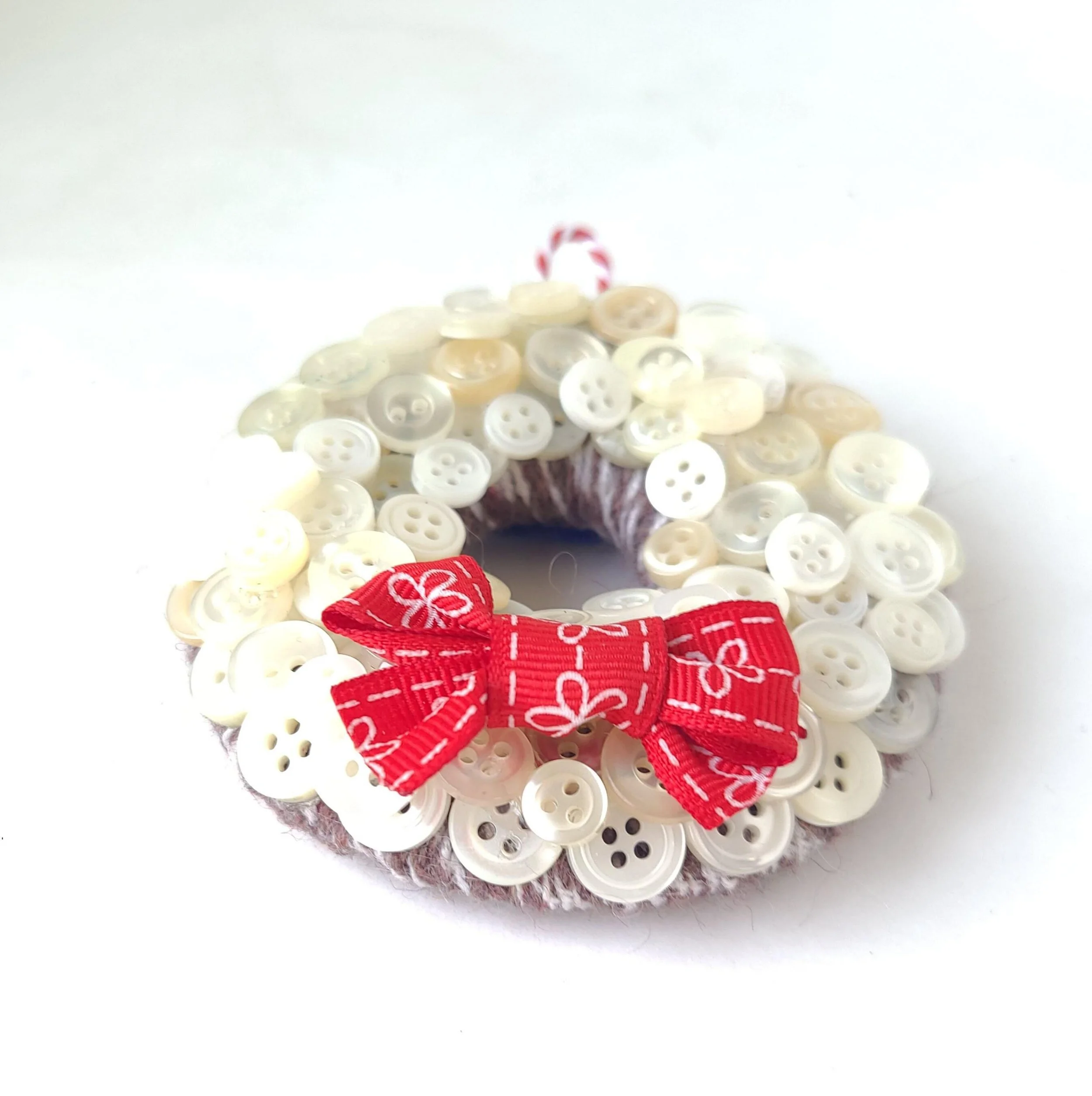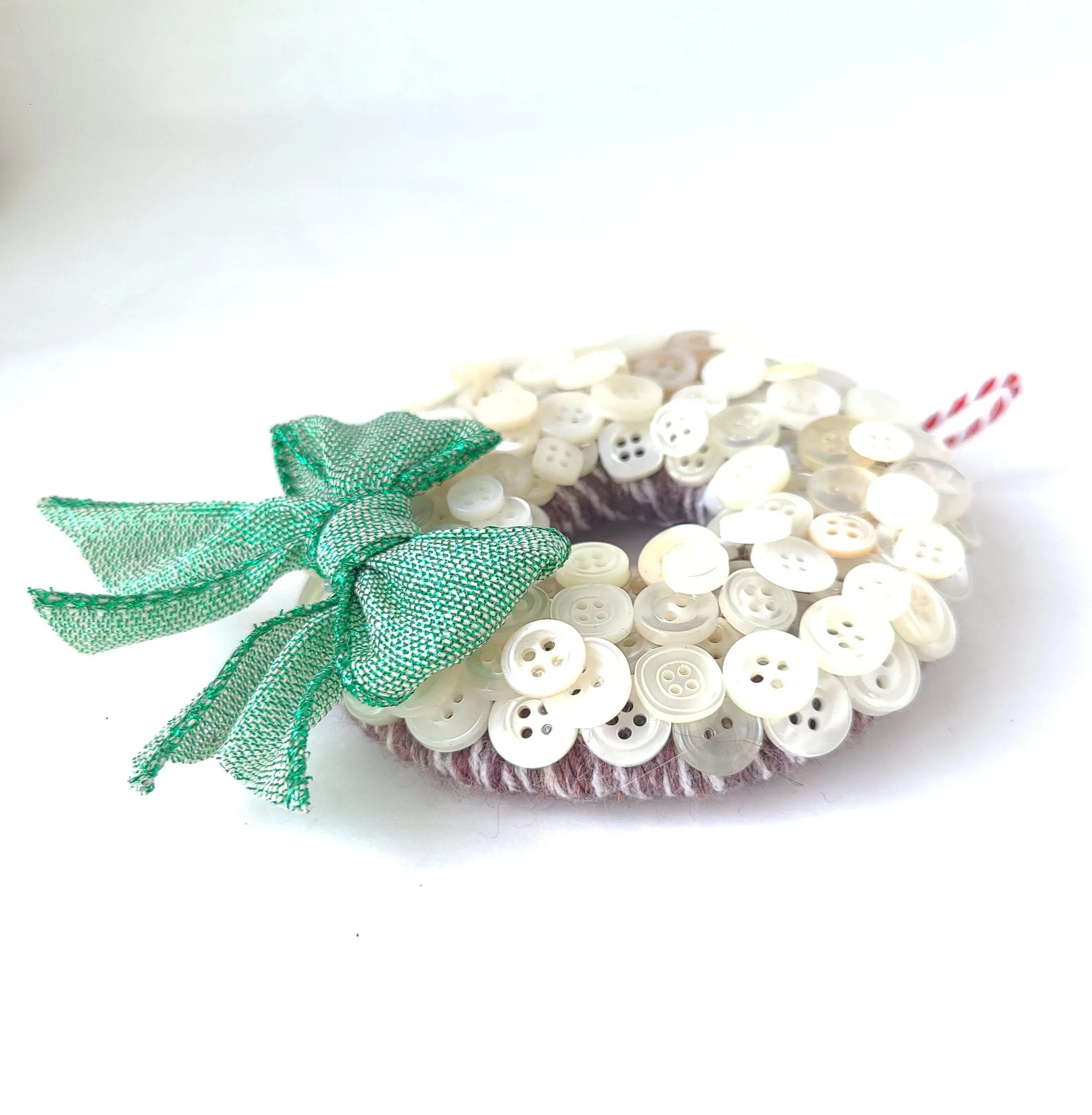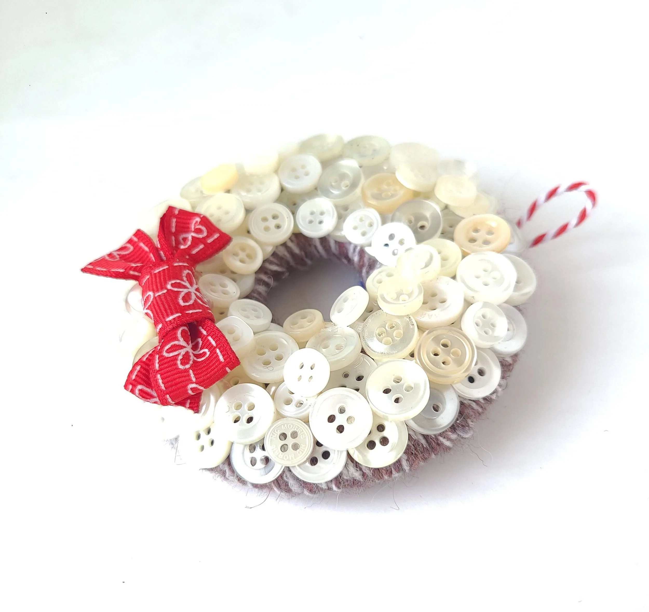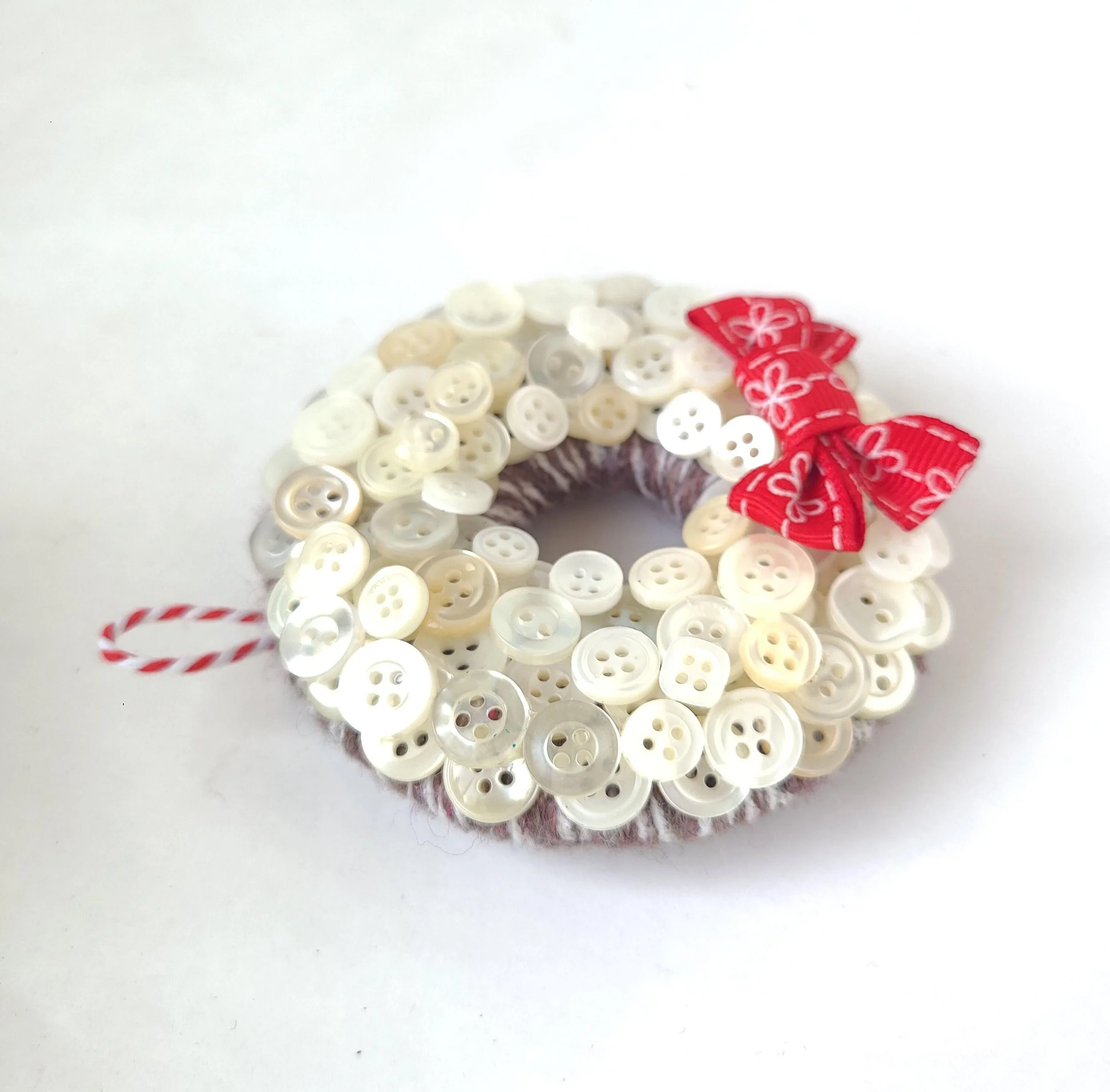 This handmade wreath has been adorned with dozens of vintage buttons in pearly shell white. The buttons are made from plastic, and the base of the wreath is made from reinforced cardboard that has been wrapped with marbled brown and white cotton yarn. The wreath is adorned with a red ribbon bow.
