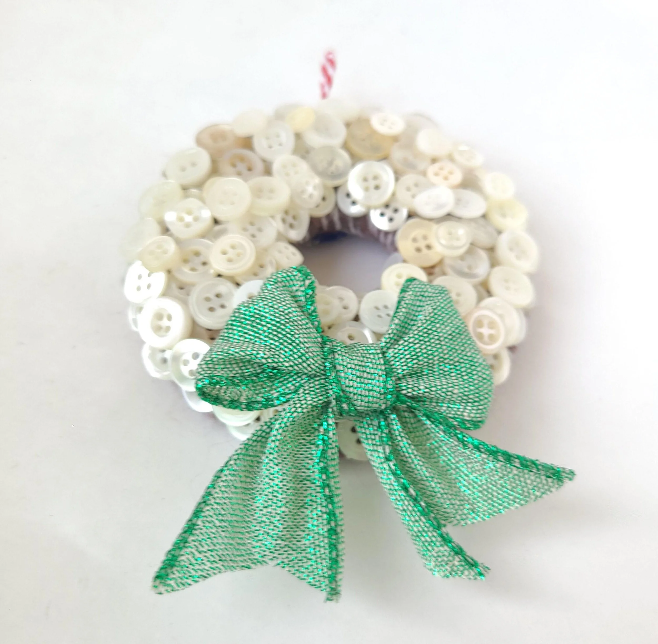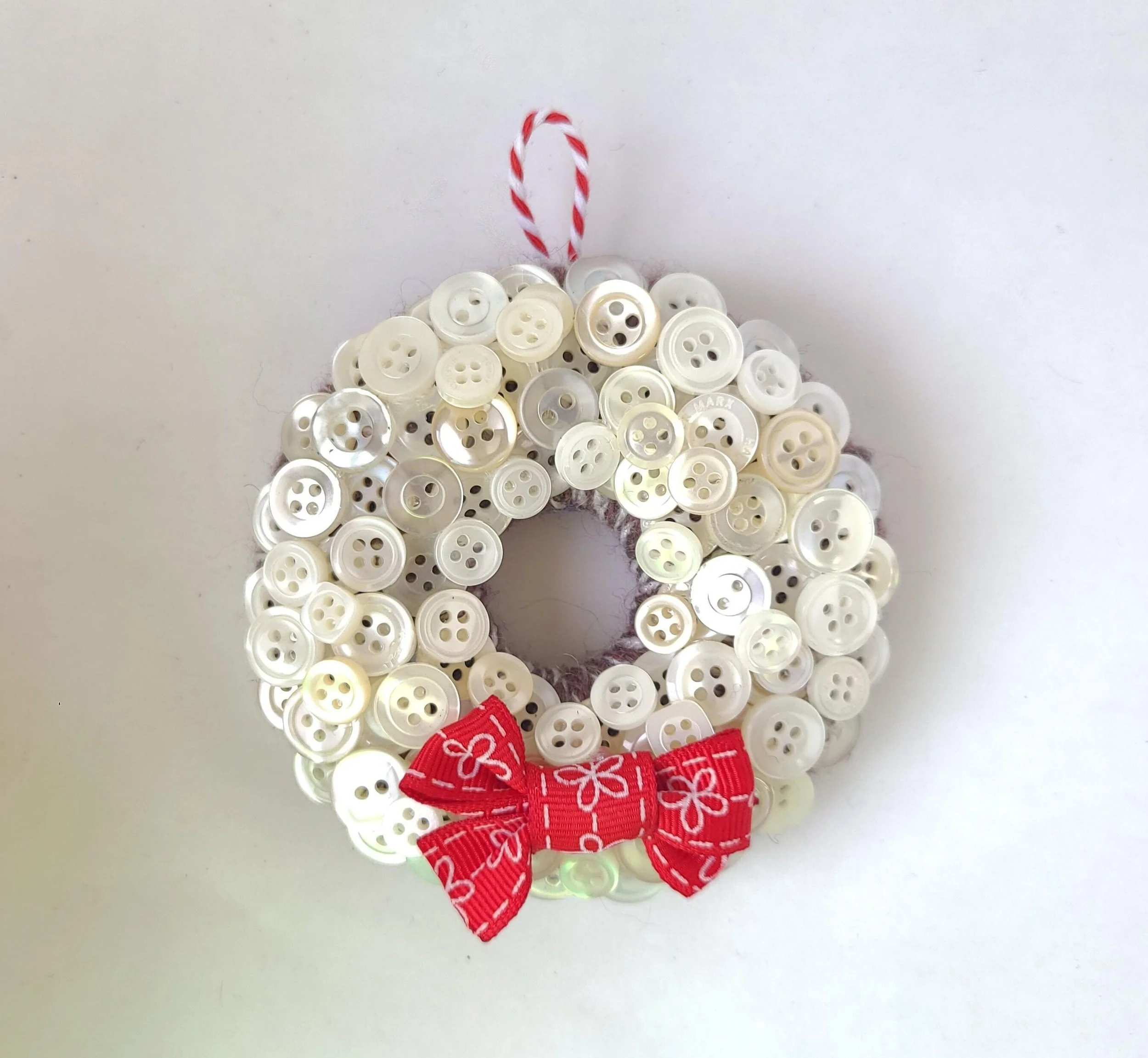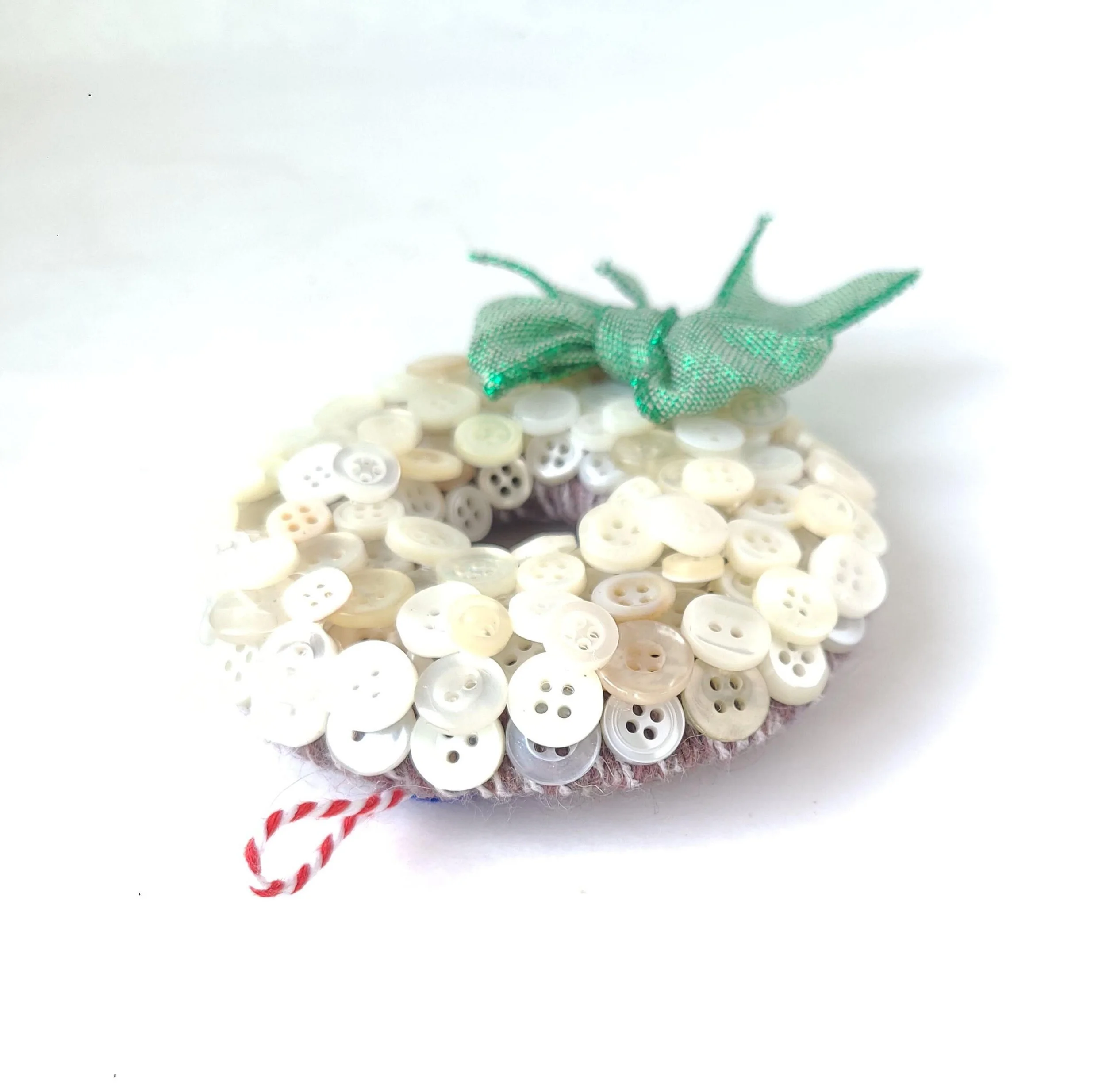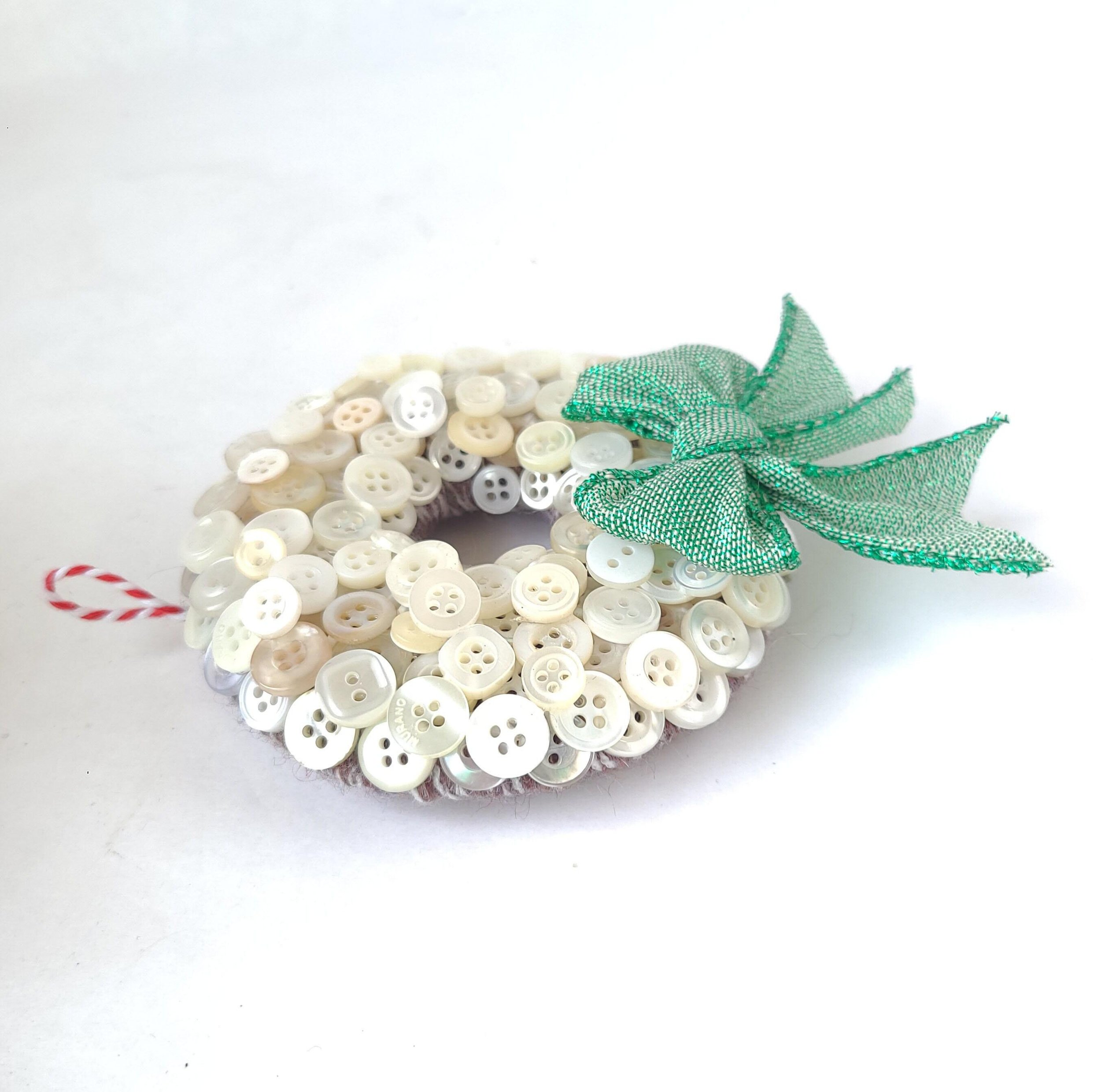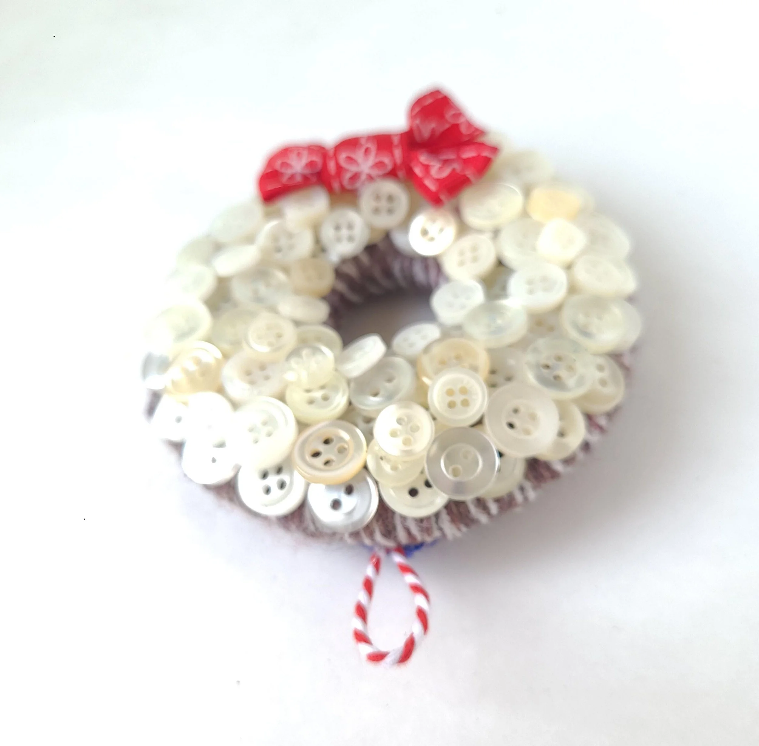 This handmade wreath has been adorned with dozens of vintage buttons in pearly shell white. The buttons are made from plastic, and the base of the wreath is made from reinforced cardboard that has been wrapped with marbled brown and white cotton yarn. The wreath is adorned with a red ribbon bow.