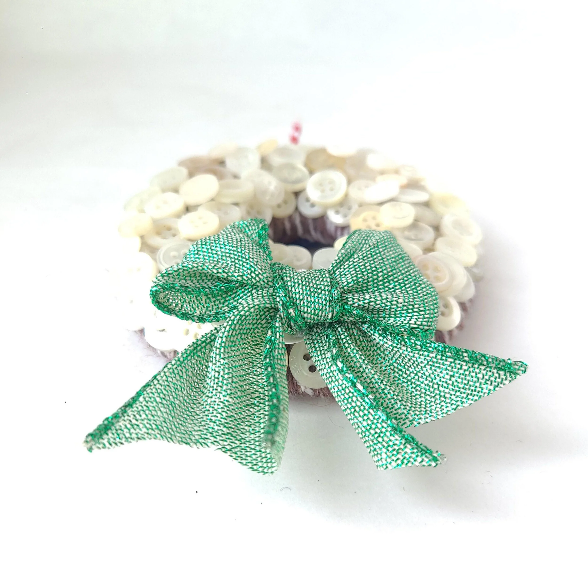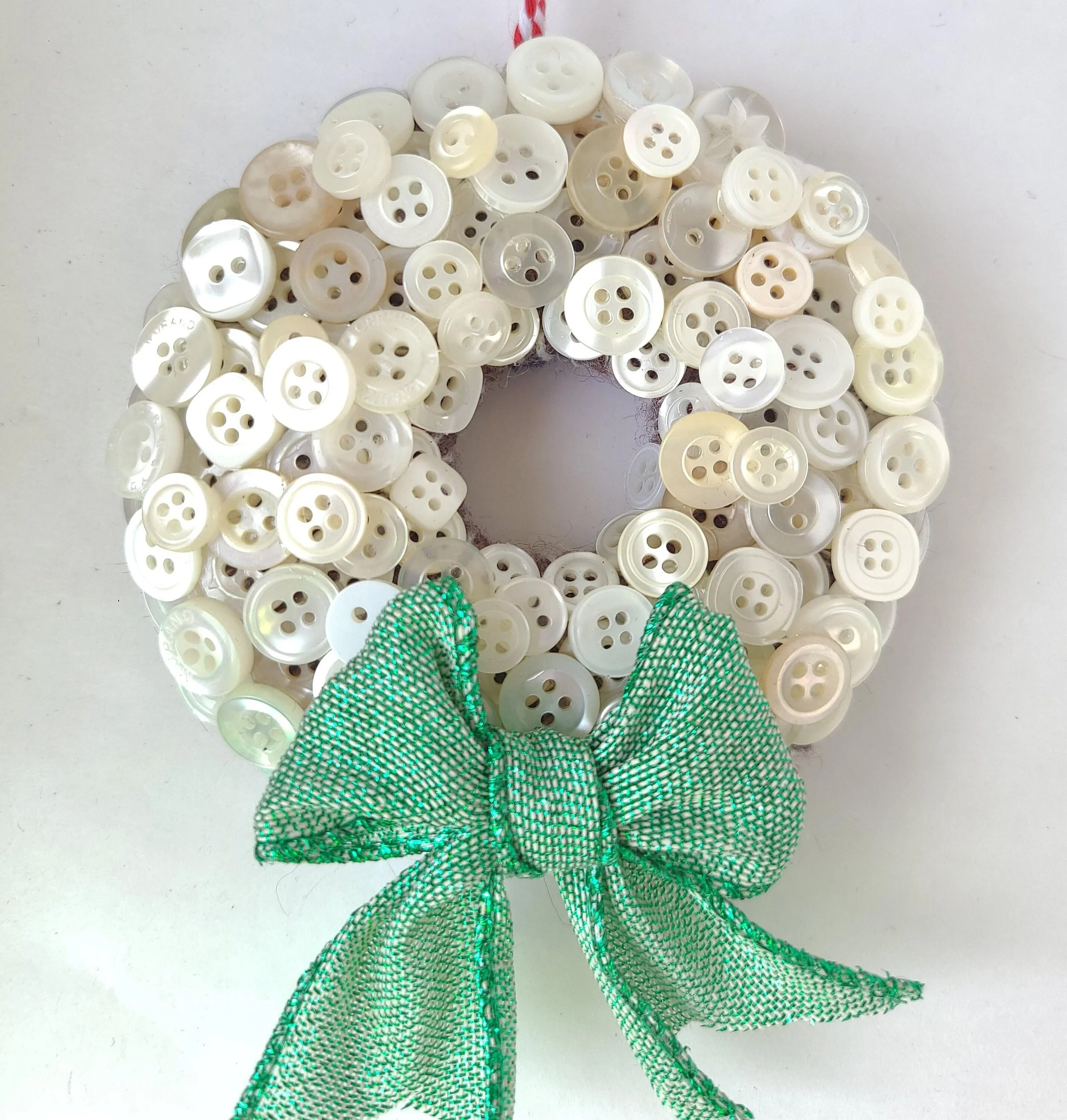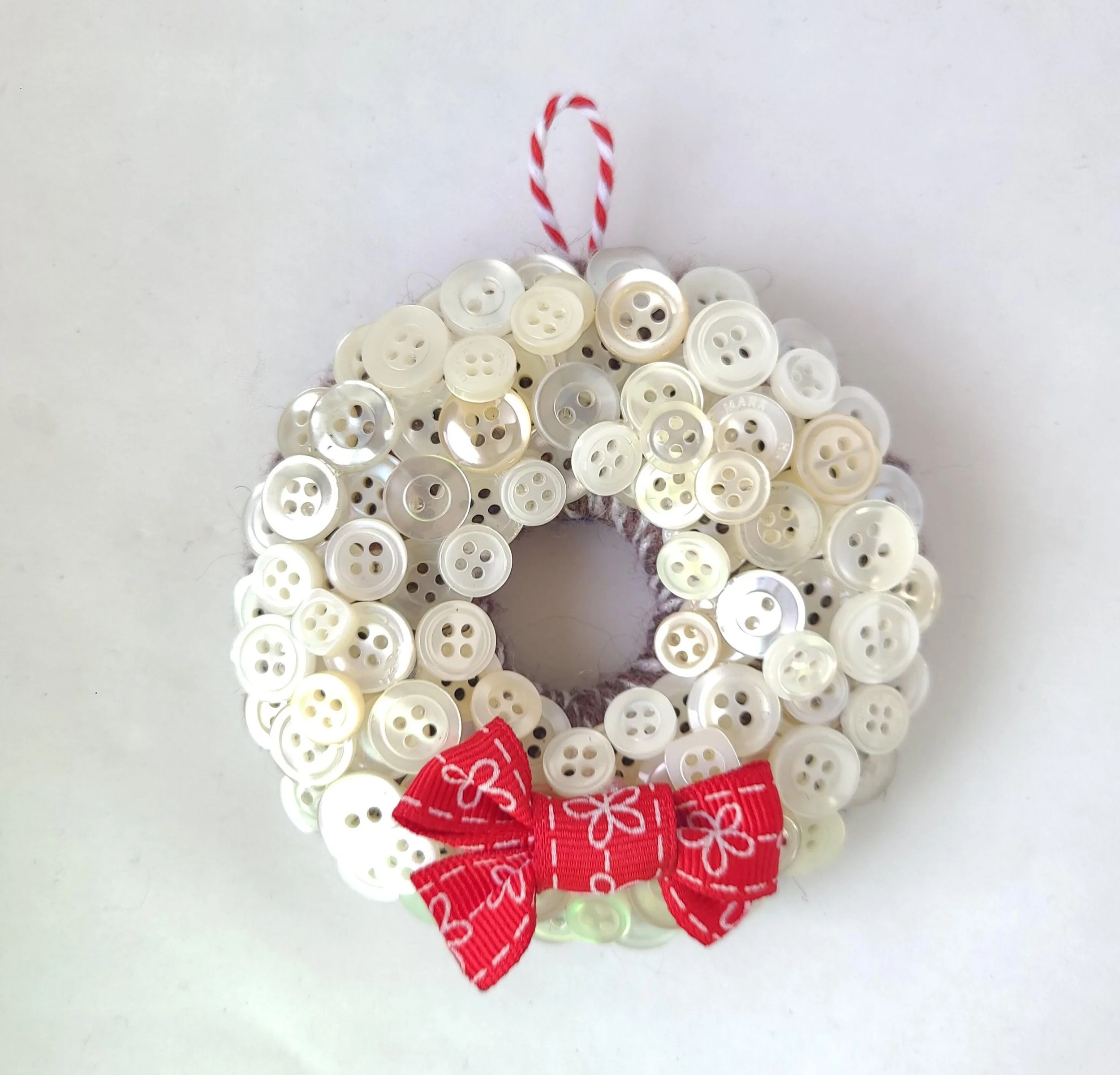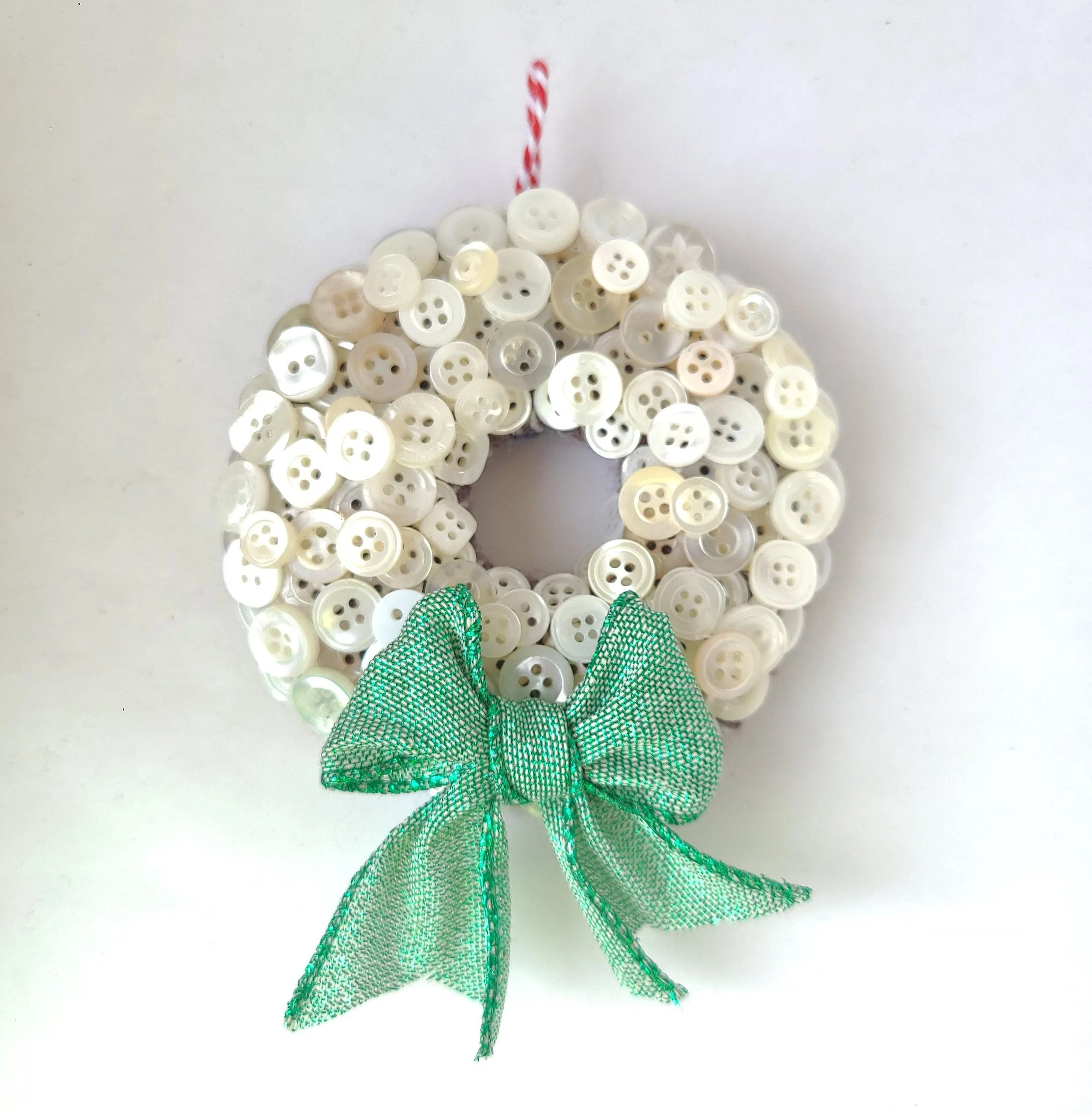 This handmade wreath has been adorned with dozens of vintage buttons in pearly shell white. The buttons are made from plastic, and the base of the wreath is made from reinforced cardboard that has been wrapped with marbled brown and white cotton yarn. The wreath is adorned with a red ribbon bow.