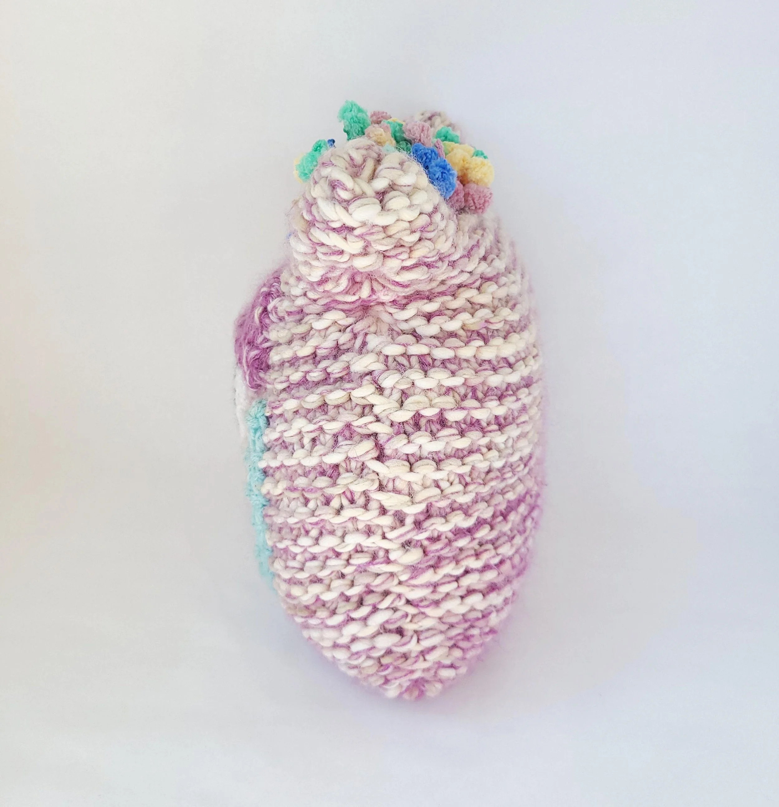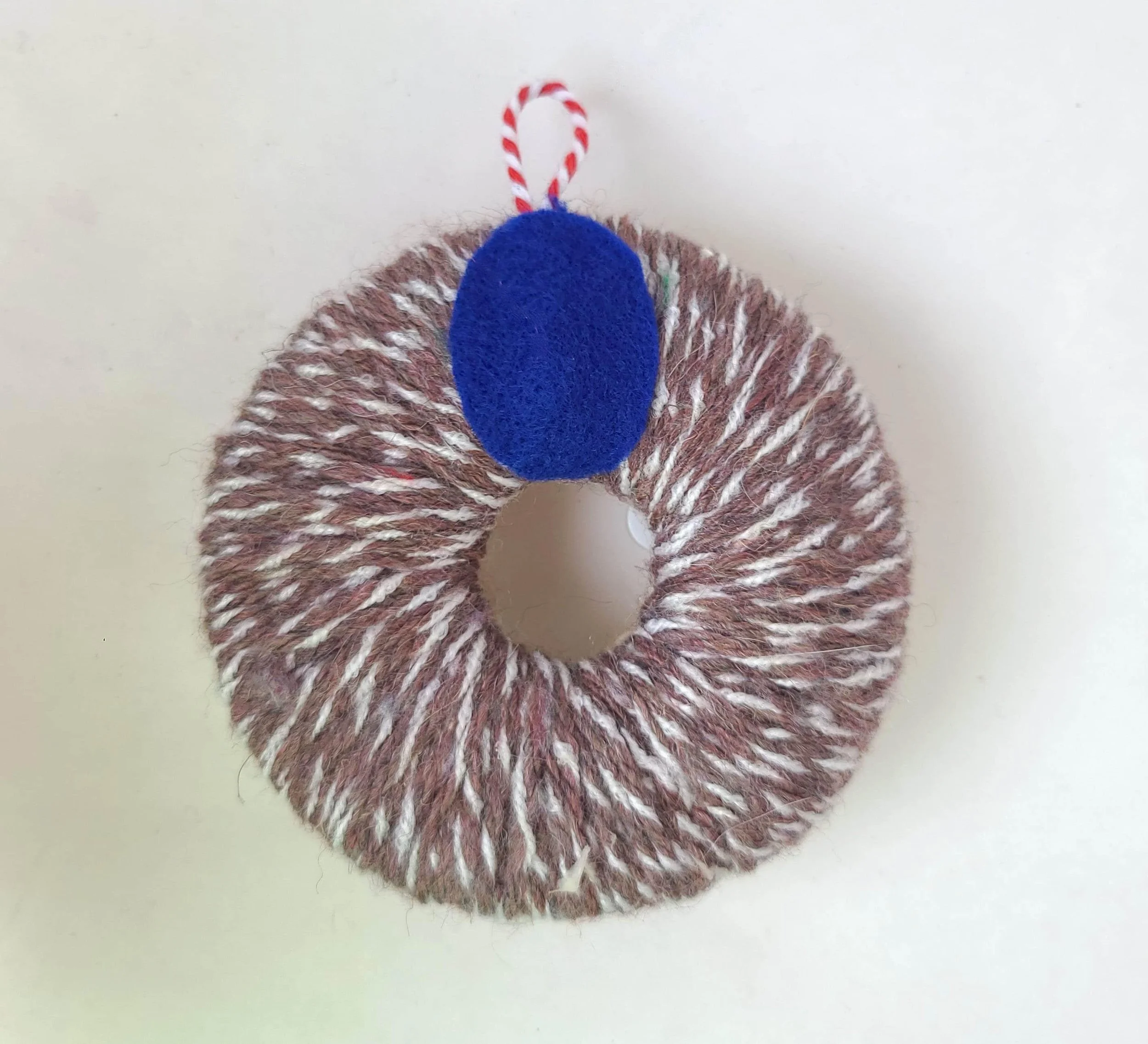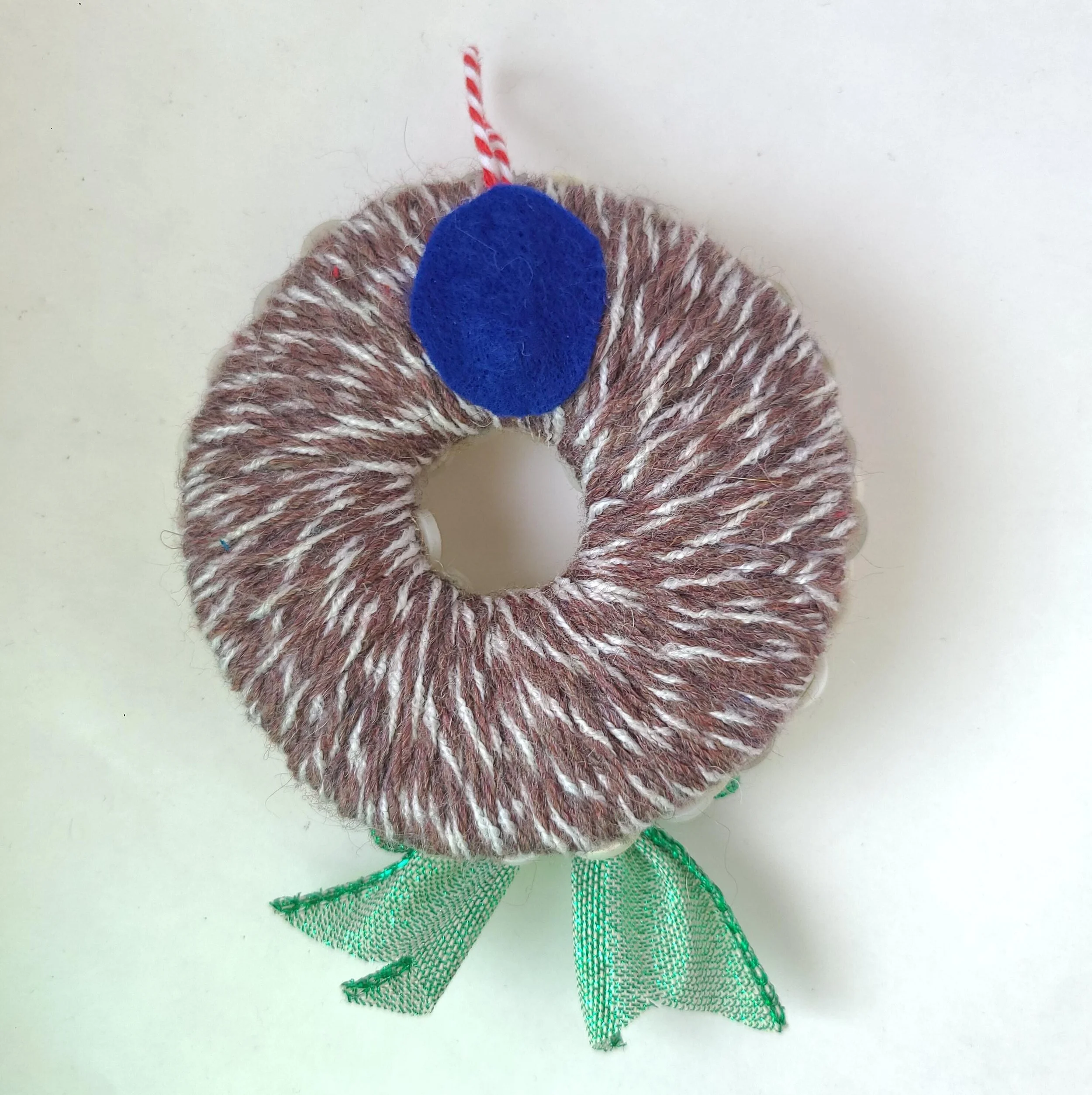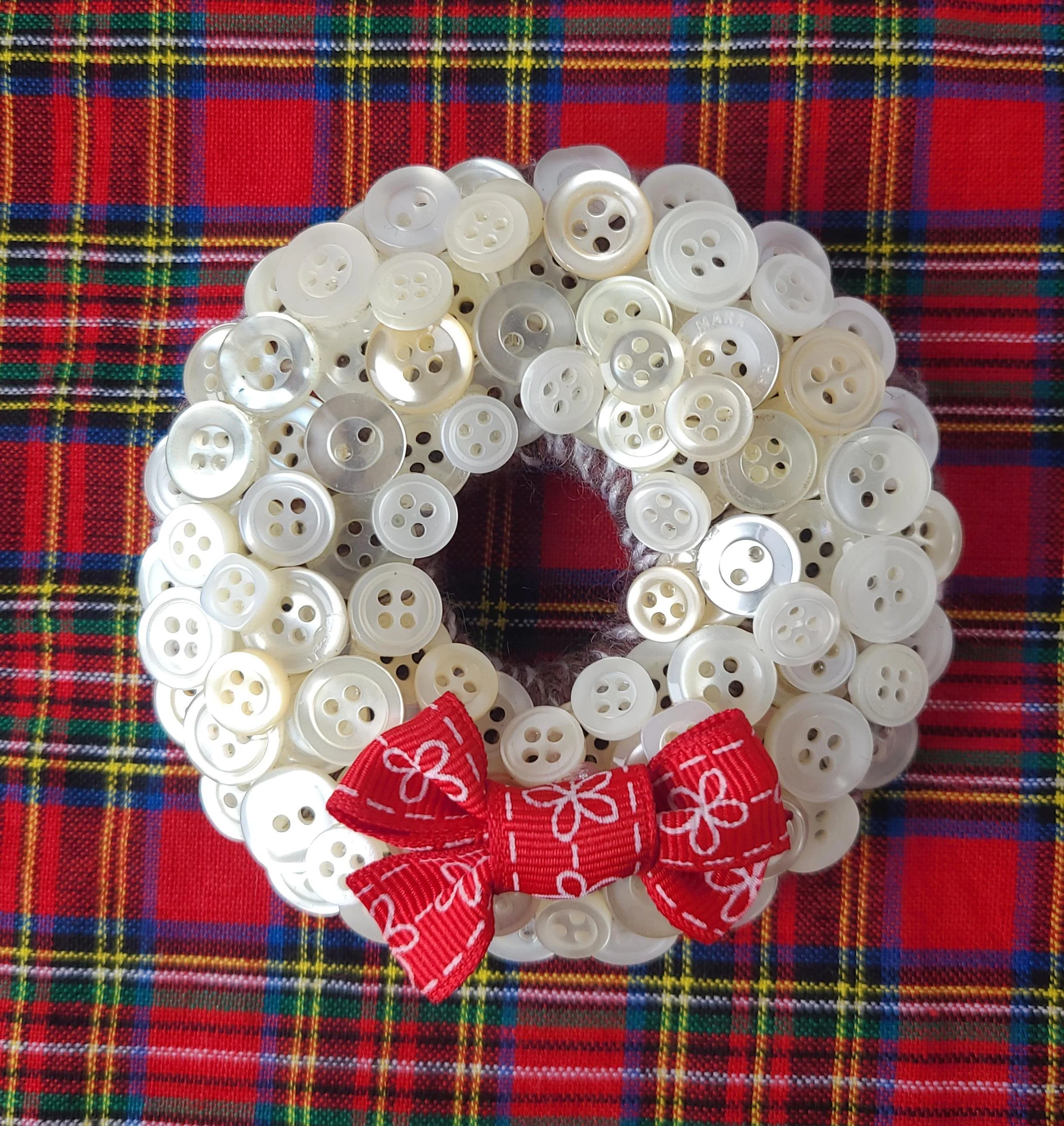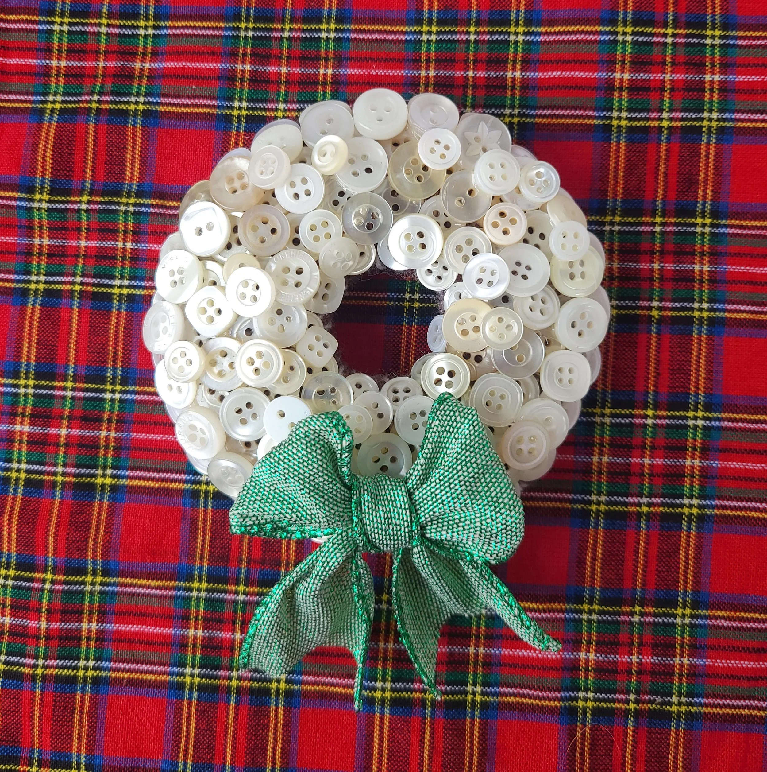 This handmade wreath has been adorned with dozens of vintage buttons in pearly shell white. The buttons are made from plastic, and the base of the wreath is made from reinforced cardboard that has been wrapped with marbled brown and white cotton yarn. The wreath is adorned with a red ribbon bow.