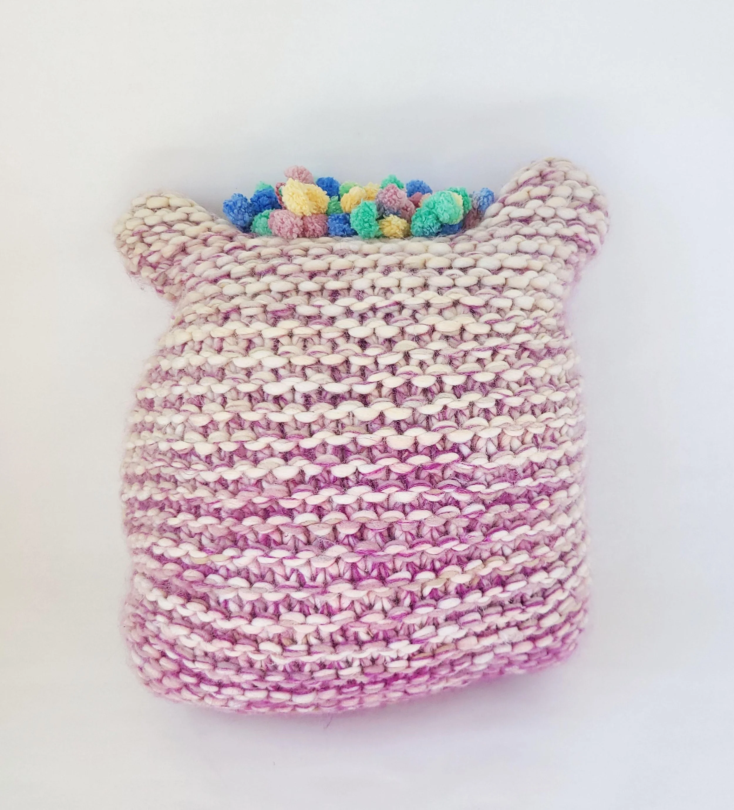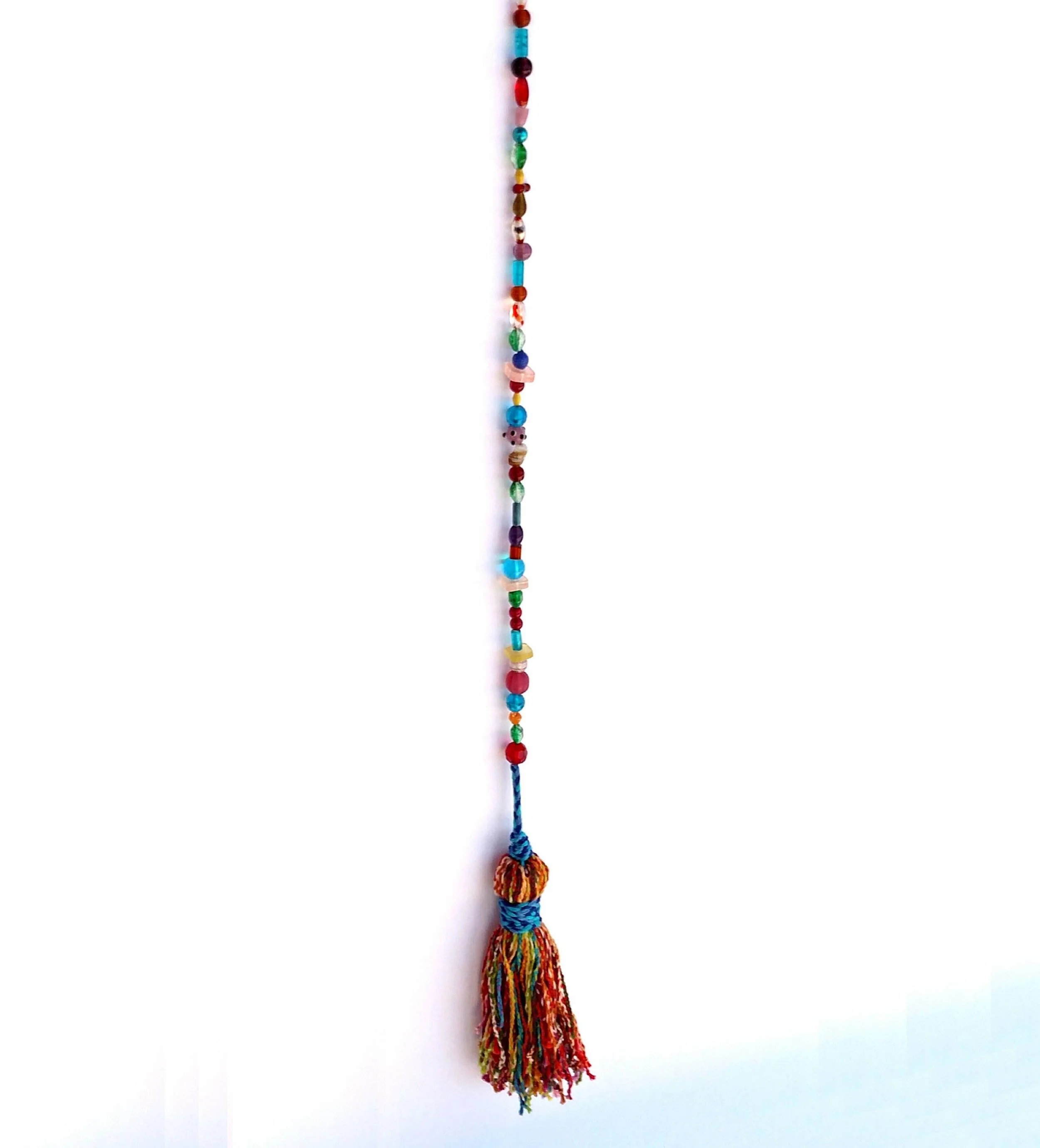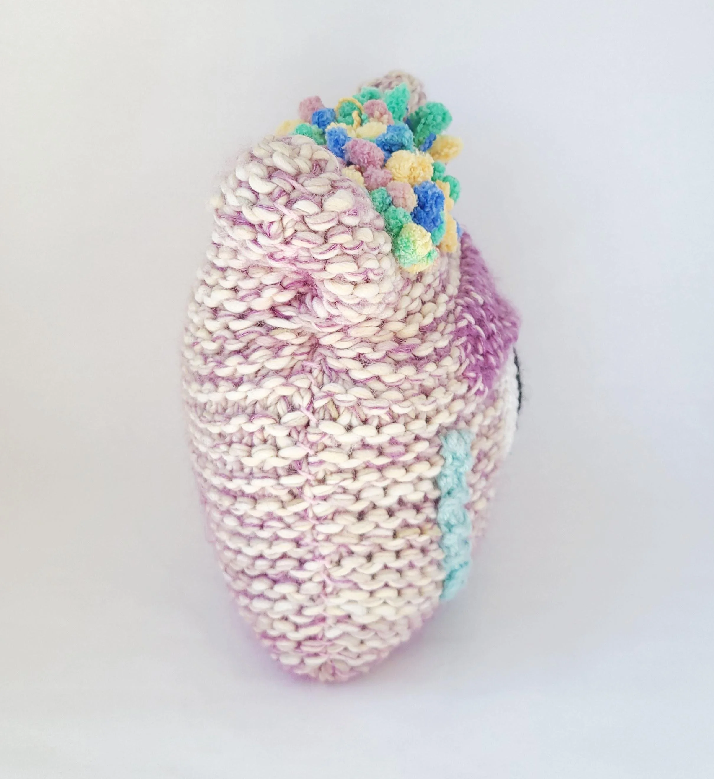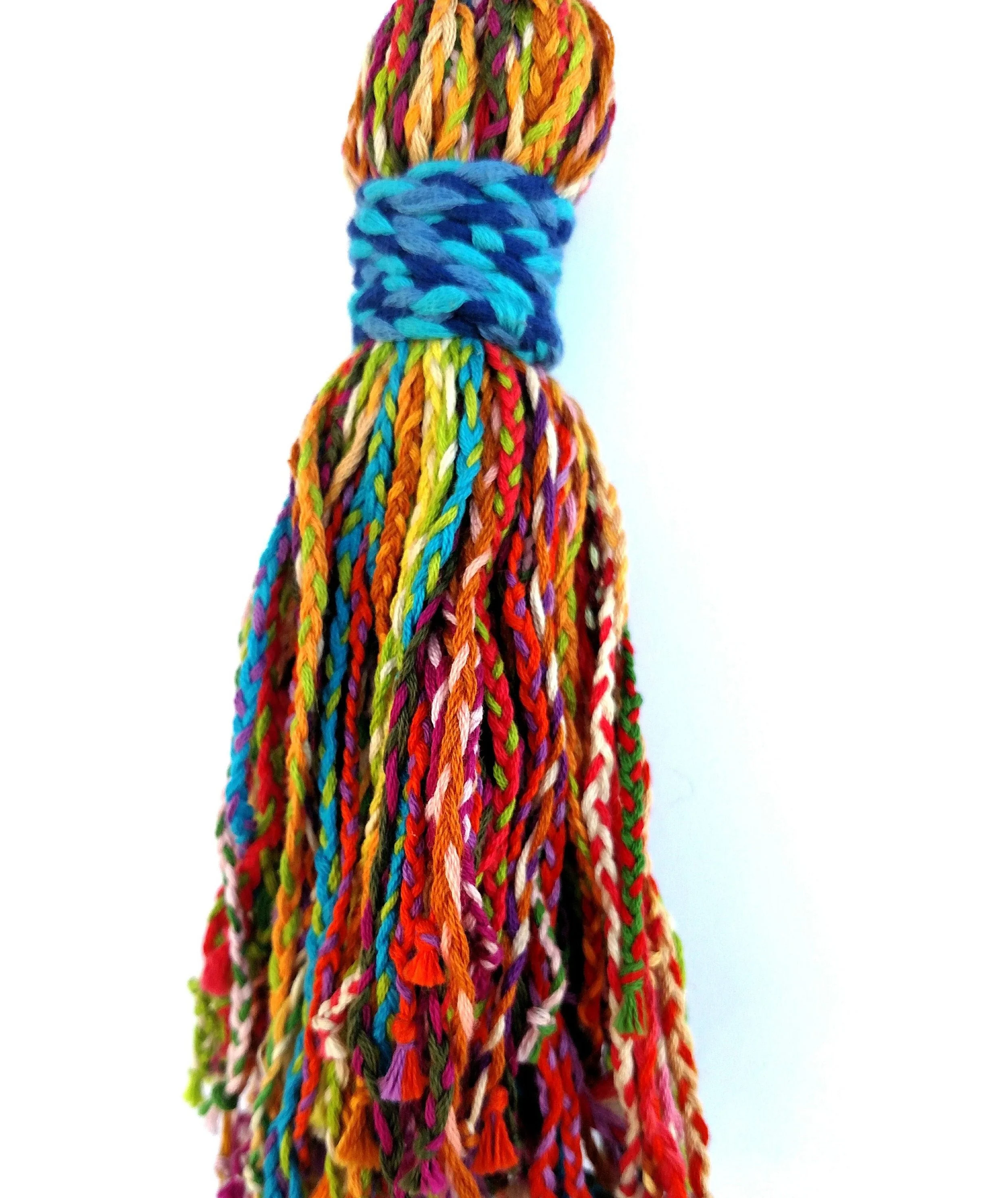 This handmade wreath has been adorned with dozens of vintage buttons in pearly shell white. The buttons are made from plastic, and the base of the wreath is made from reinforced cardboard that has been wrapped with marbled brown and white cotton yarn. The wreath is adorned with a red ribbon bow.
