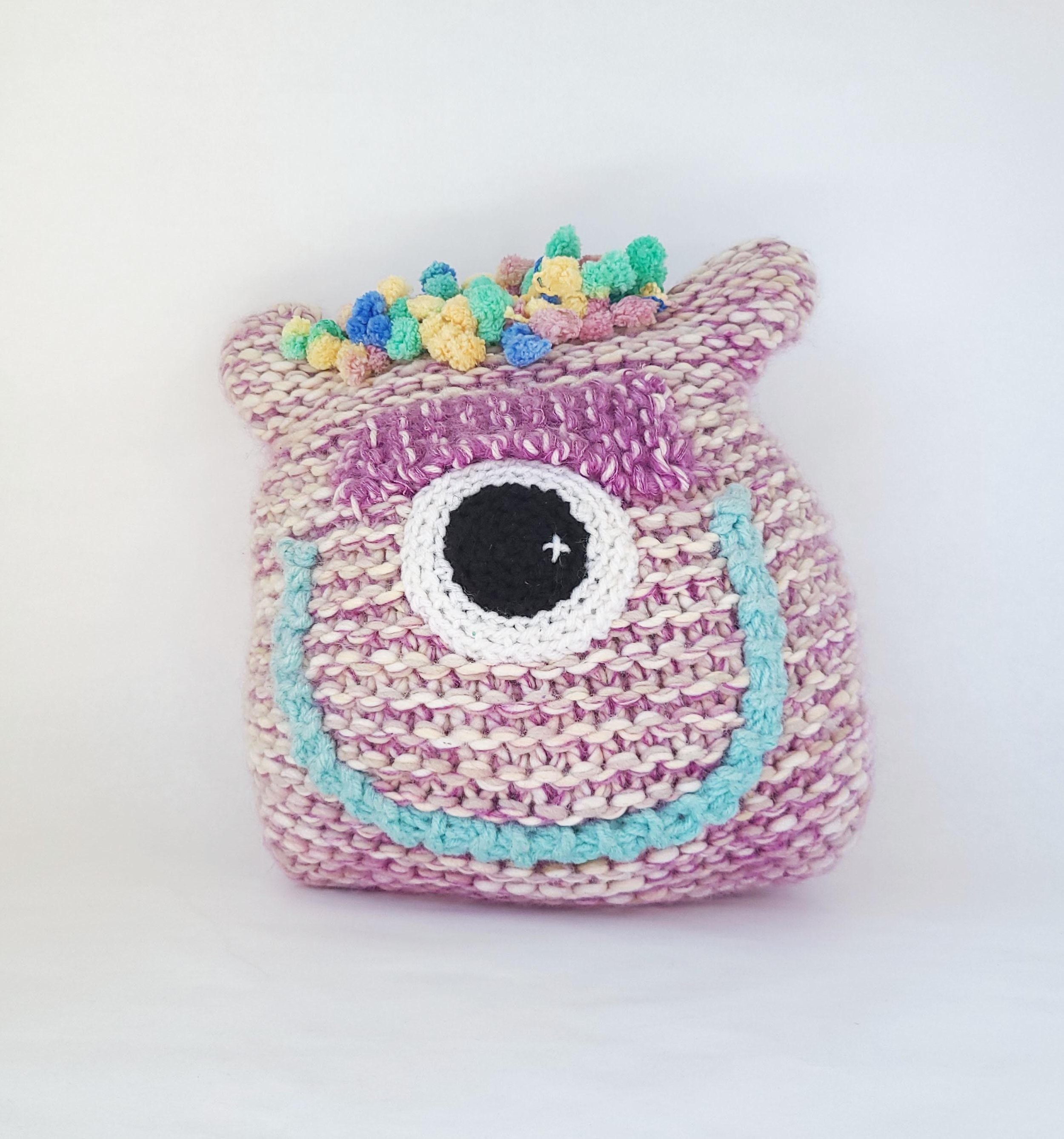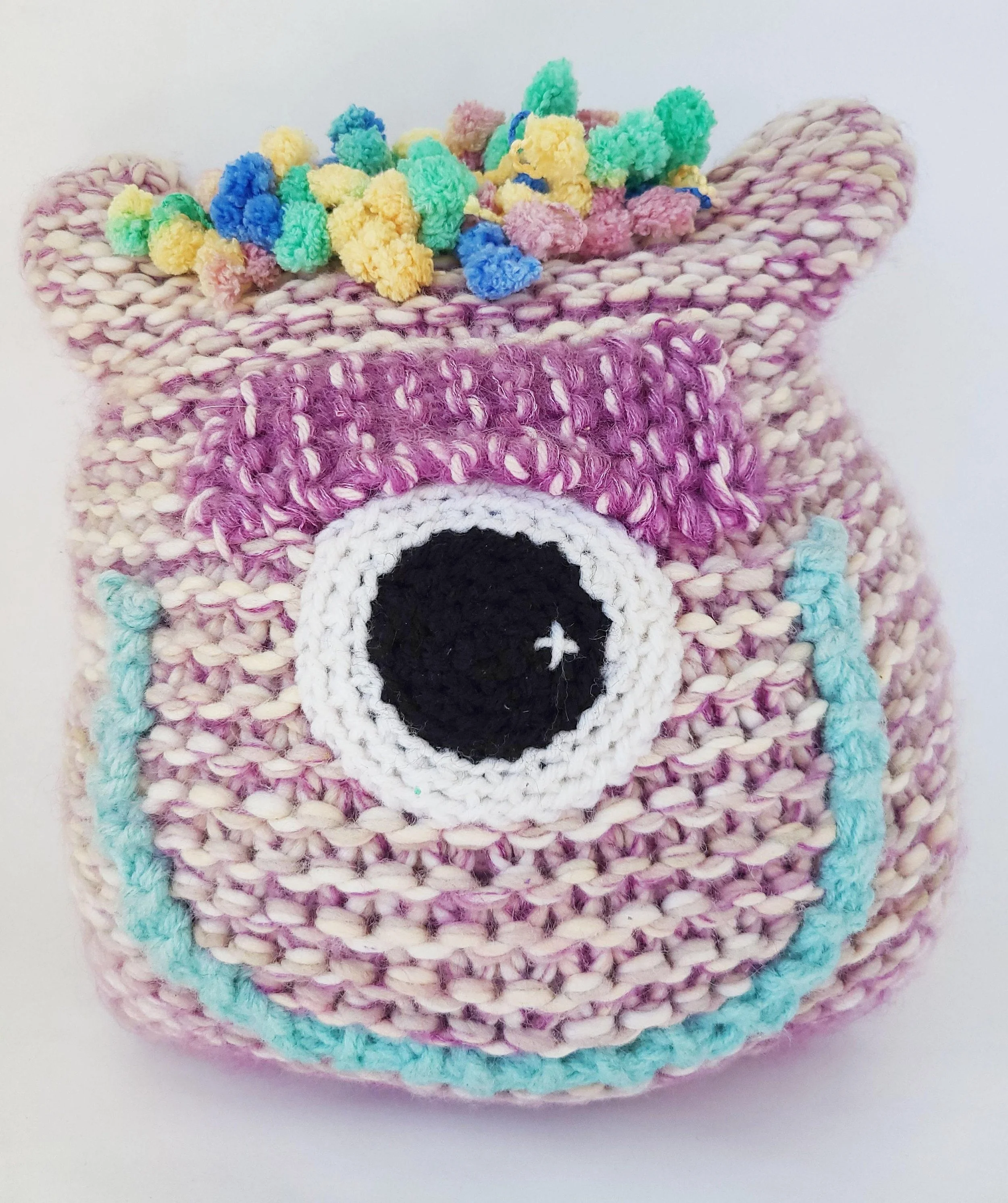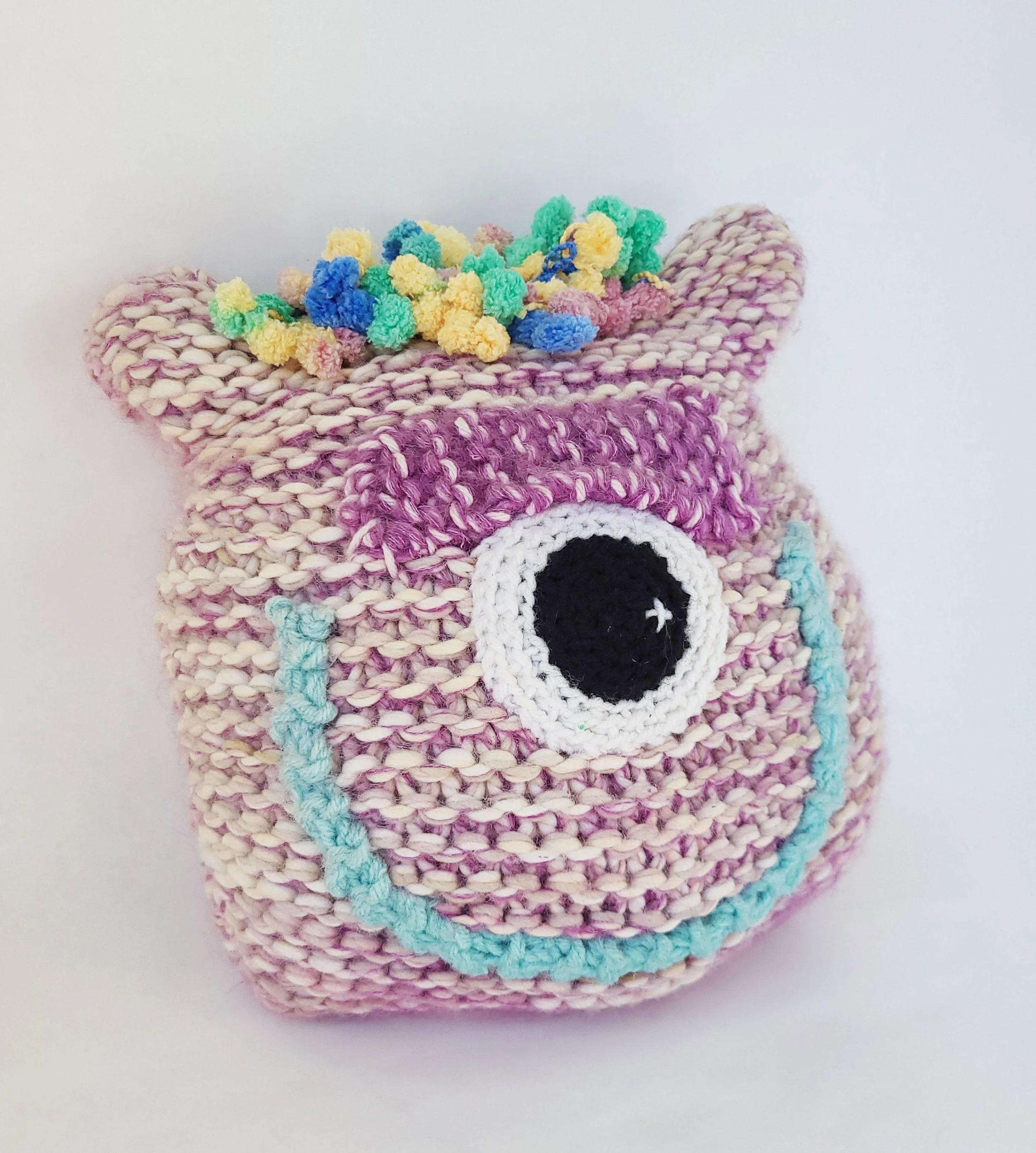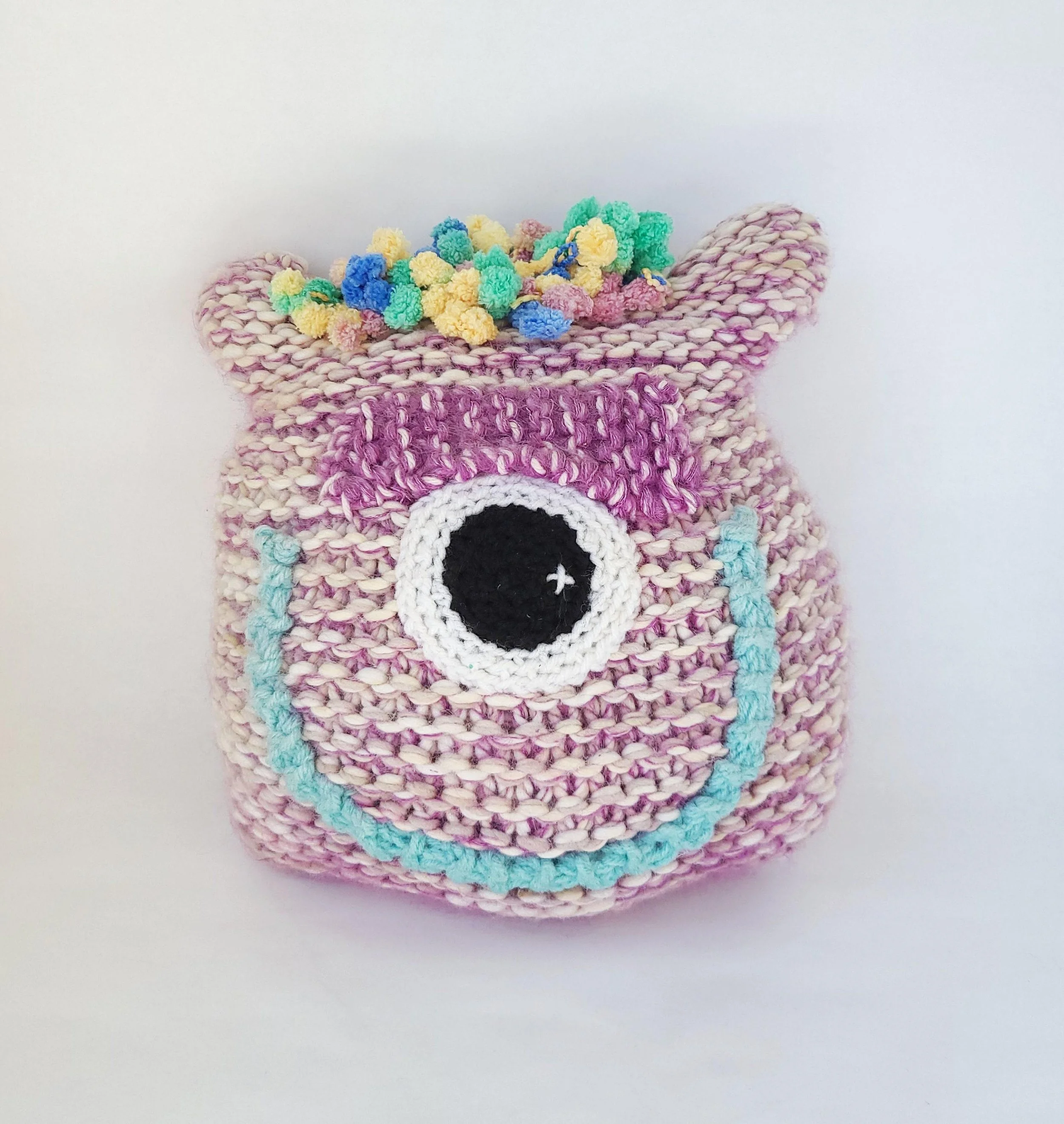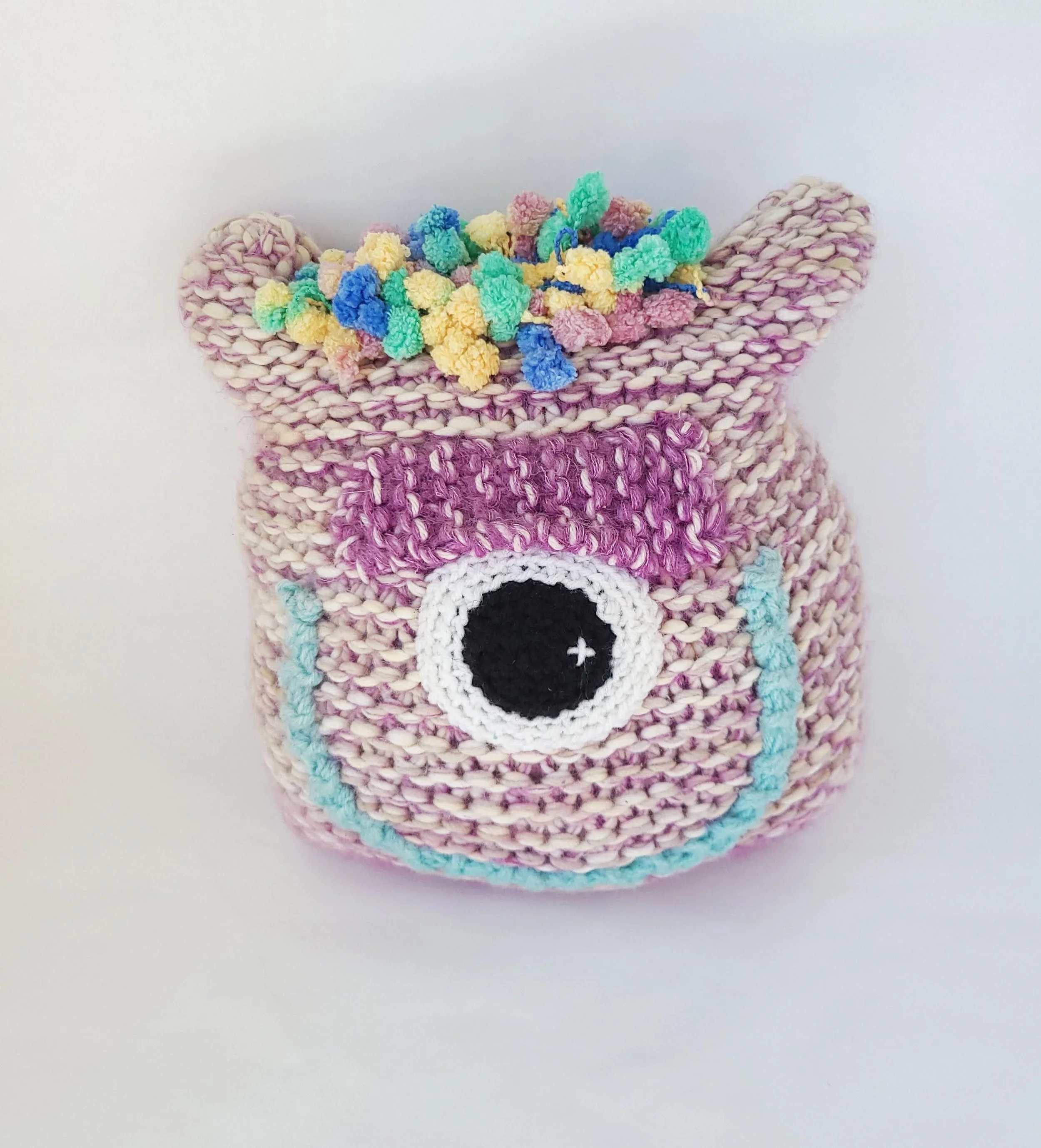 This handmade wreath has been adorned with dozens of vintage buttons in pearly shell white. The buttons are made from plastic, and the base of the wreath is made from reinforced cardboard that has been wrapped with marbled brown and white cotton yarn. The wreath is adorned with a red ribbon bow.