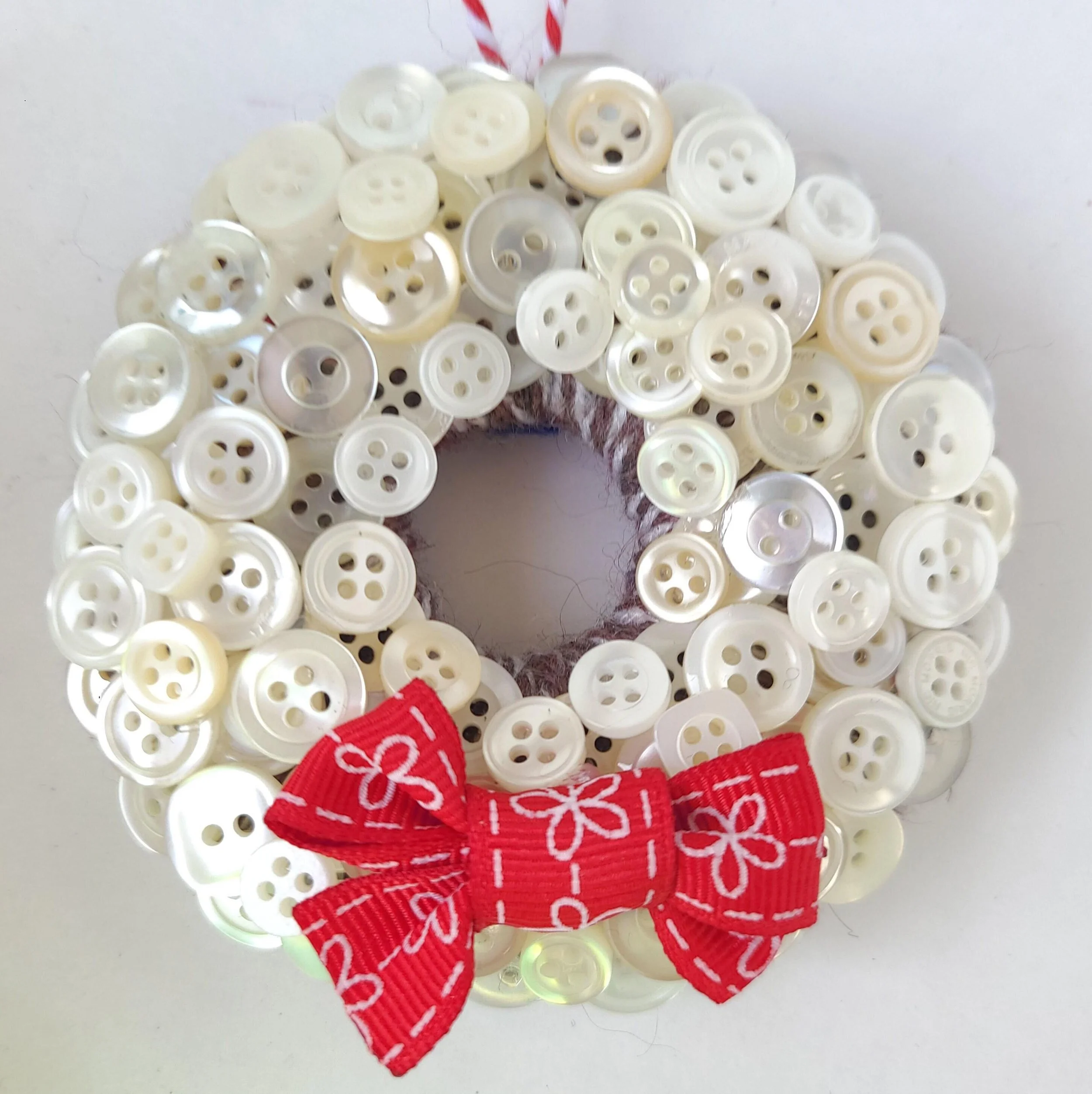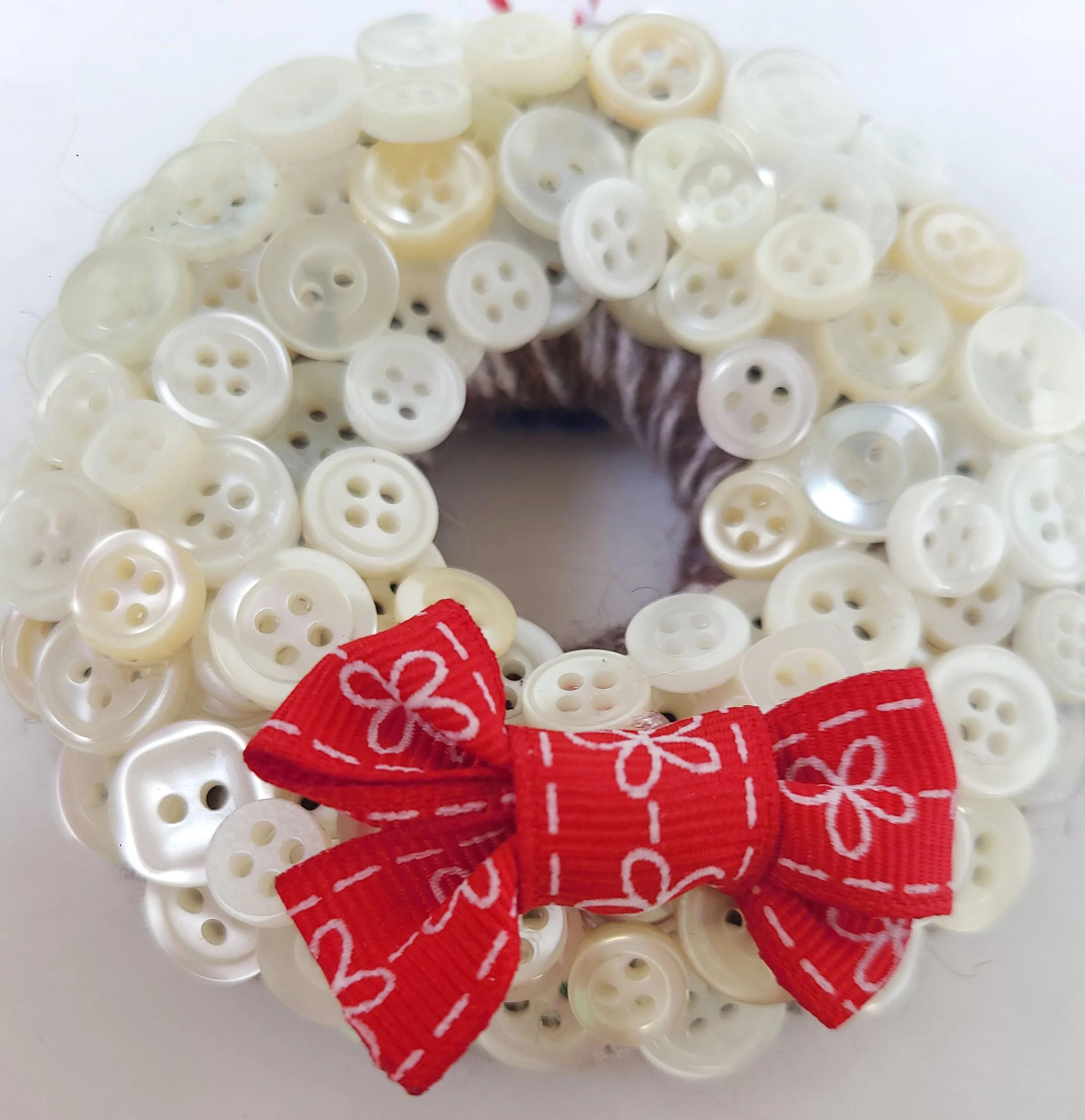 Vintage Button Wreath in Shell White with Red Bow - 3.5 Inch