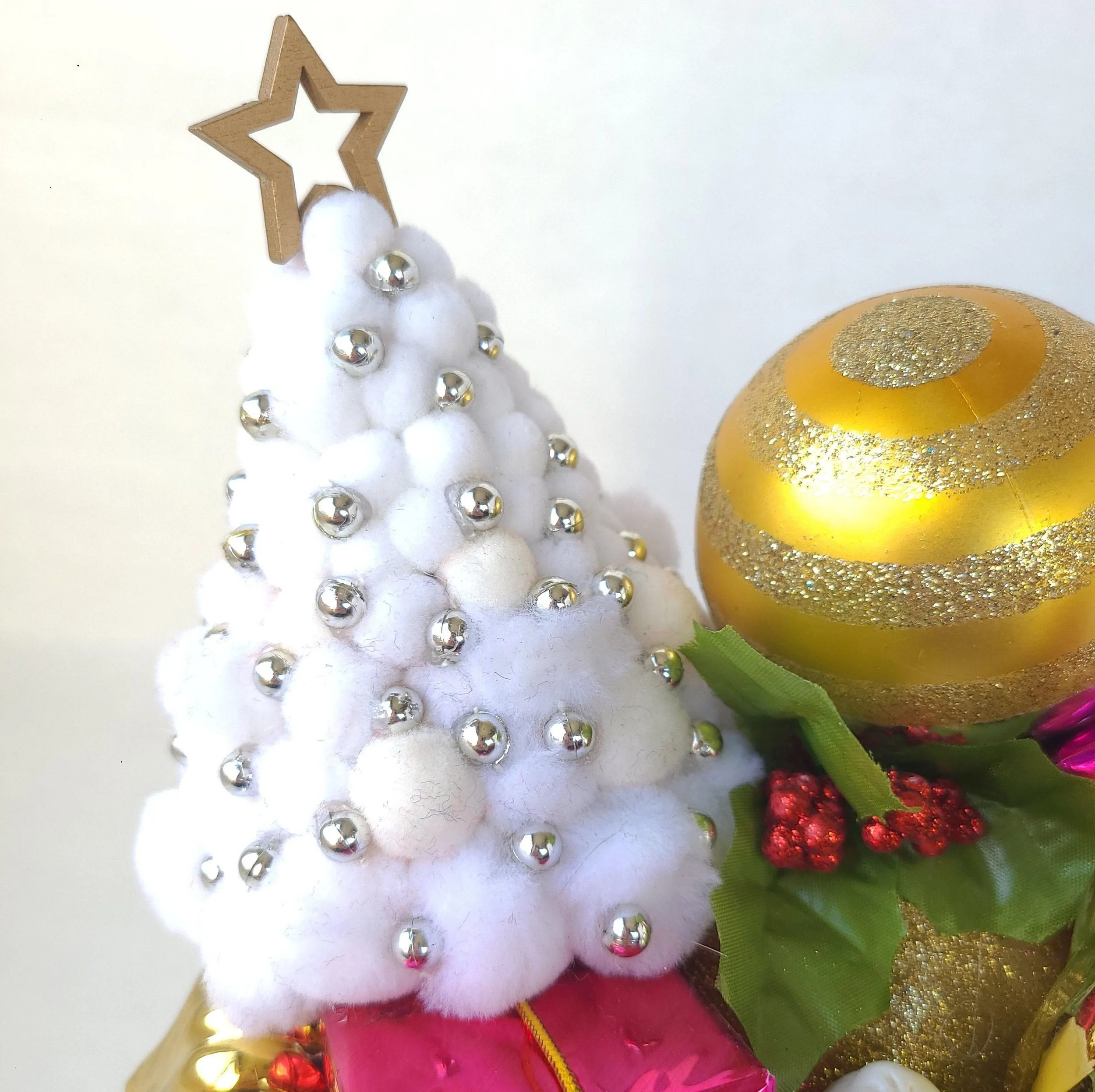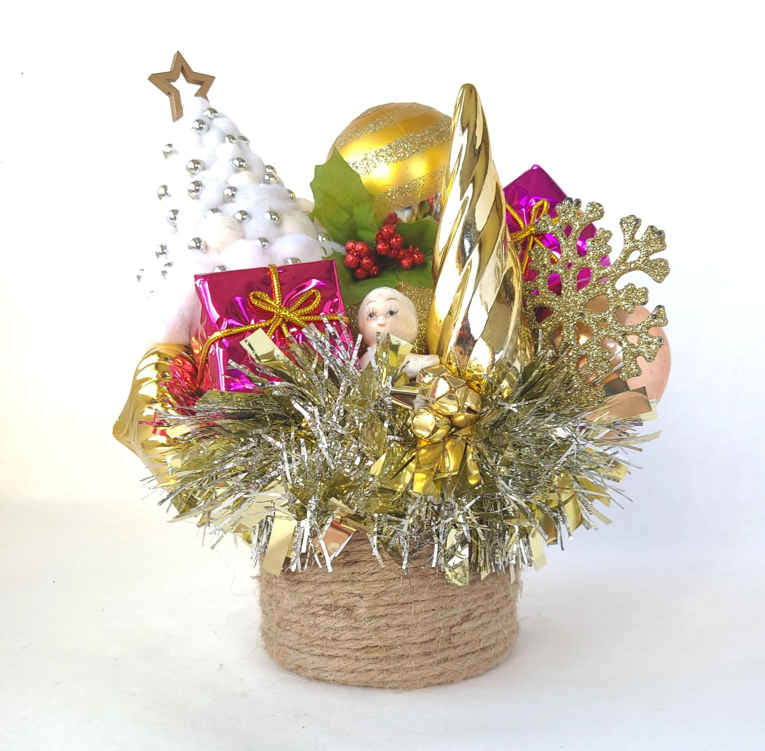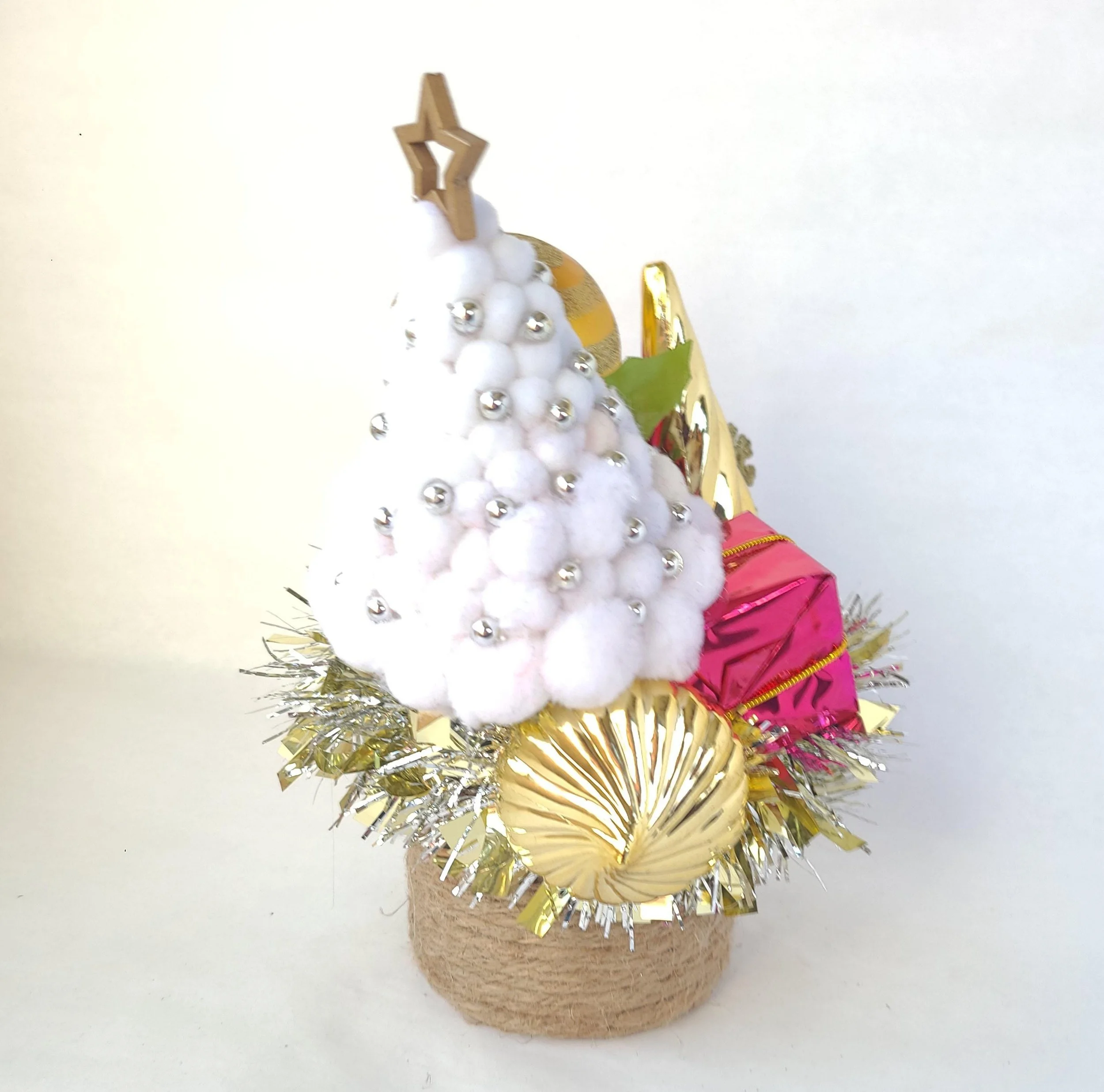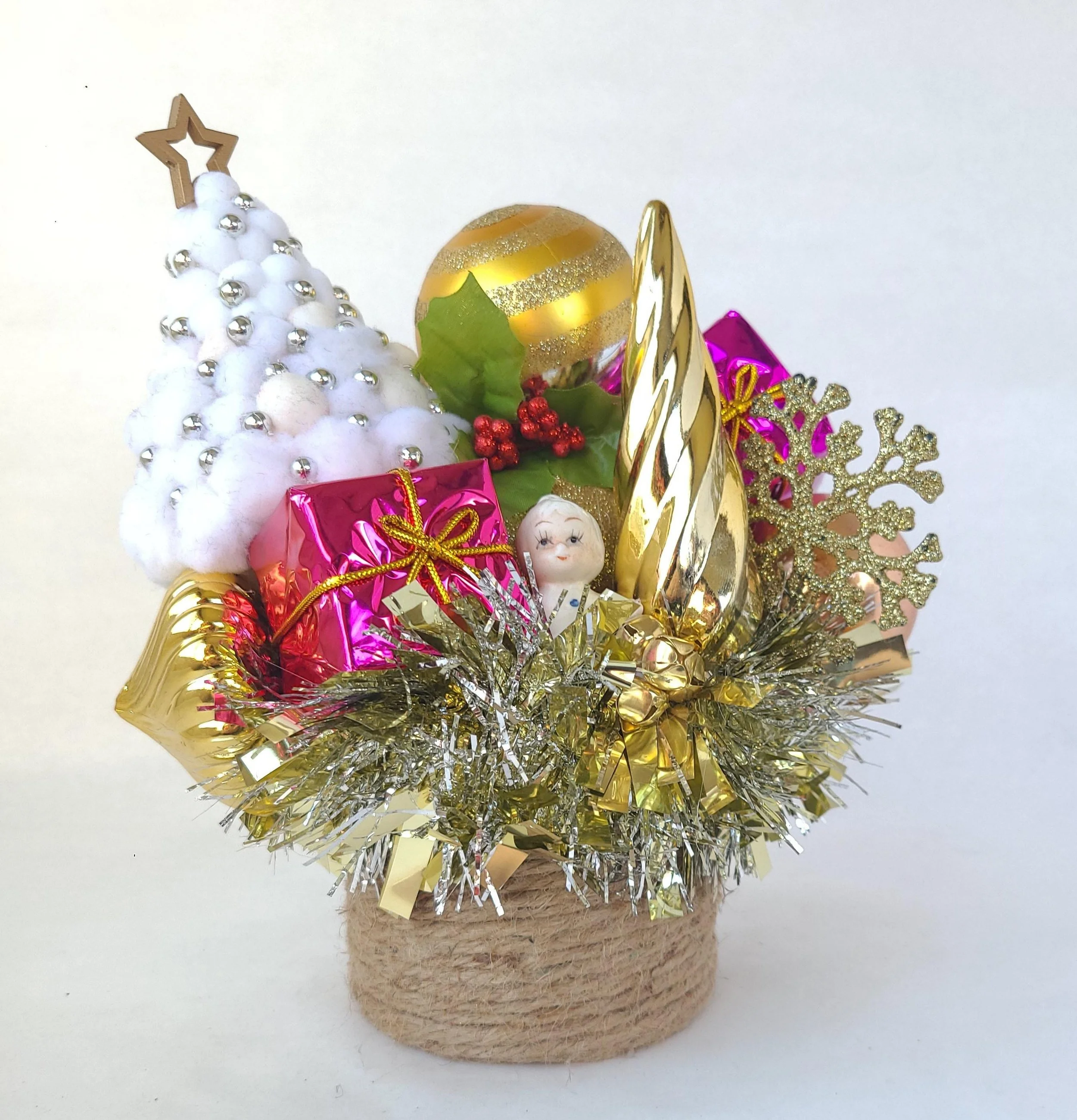 This handmade wreath has been adorned with dozens of vintage buttons in pearly shell white. The buttons are made from plastic, and the base of the wreath is made from reinforced cardboard that has been wrapped with marbled brown and white cotton yarn. The wreath is adorned with a metallic green ribbon bow.