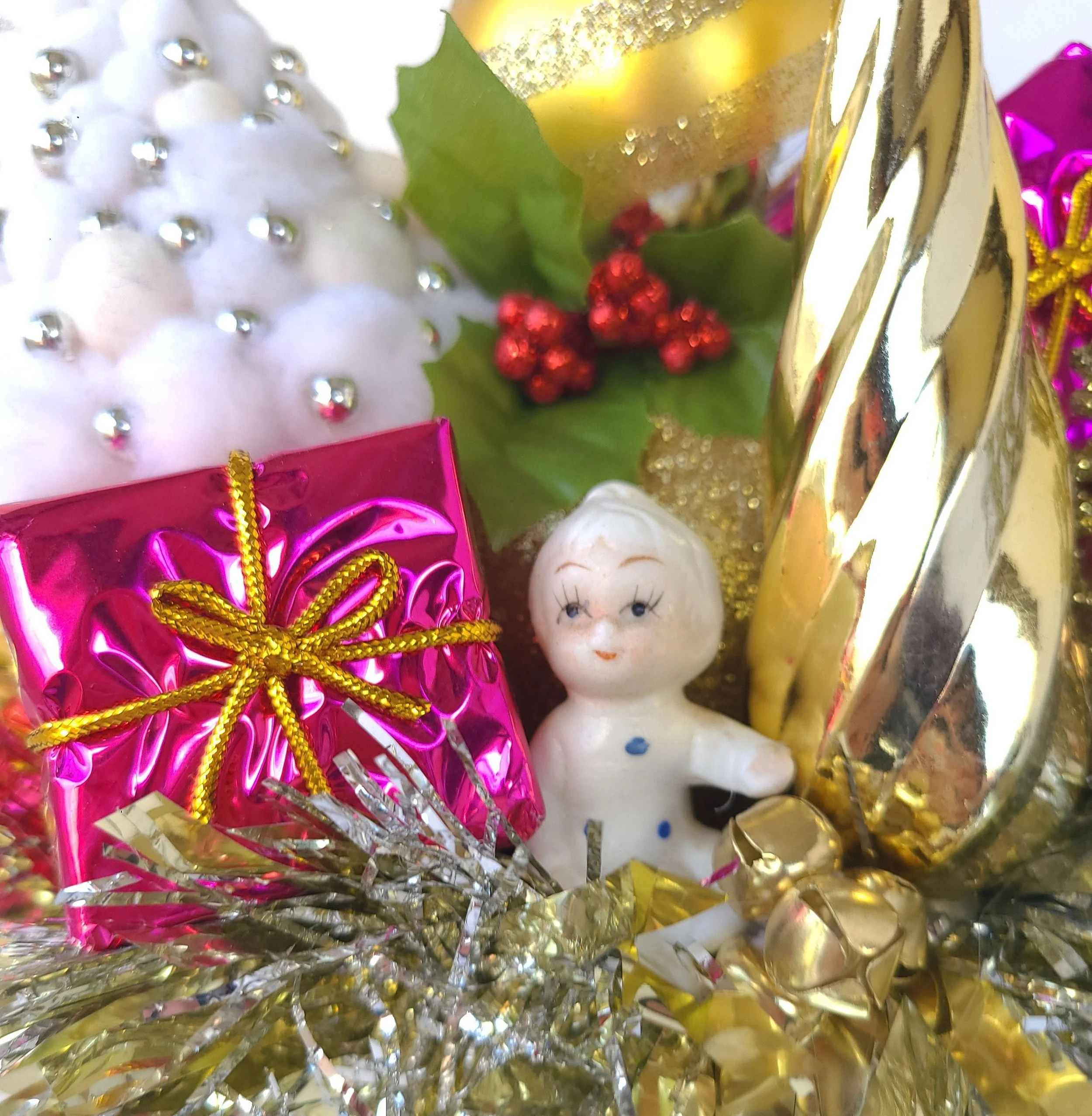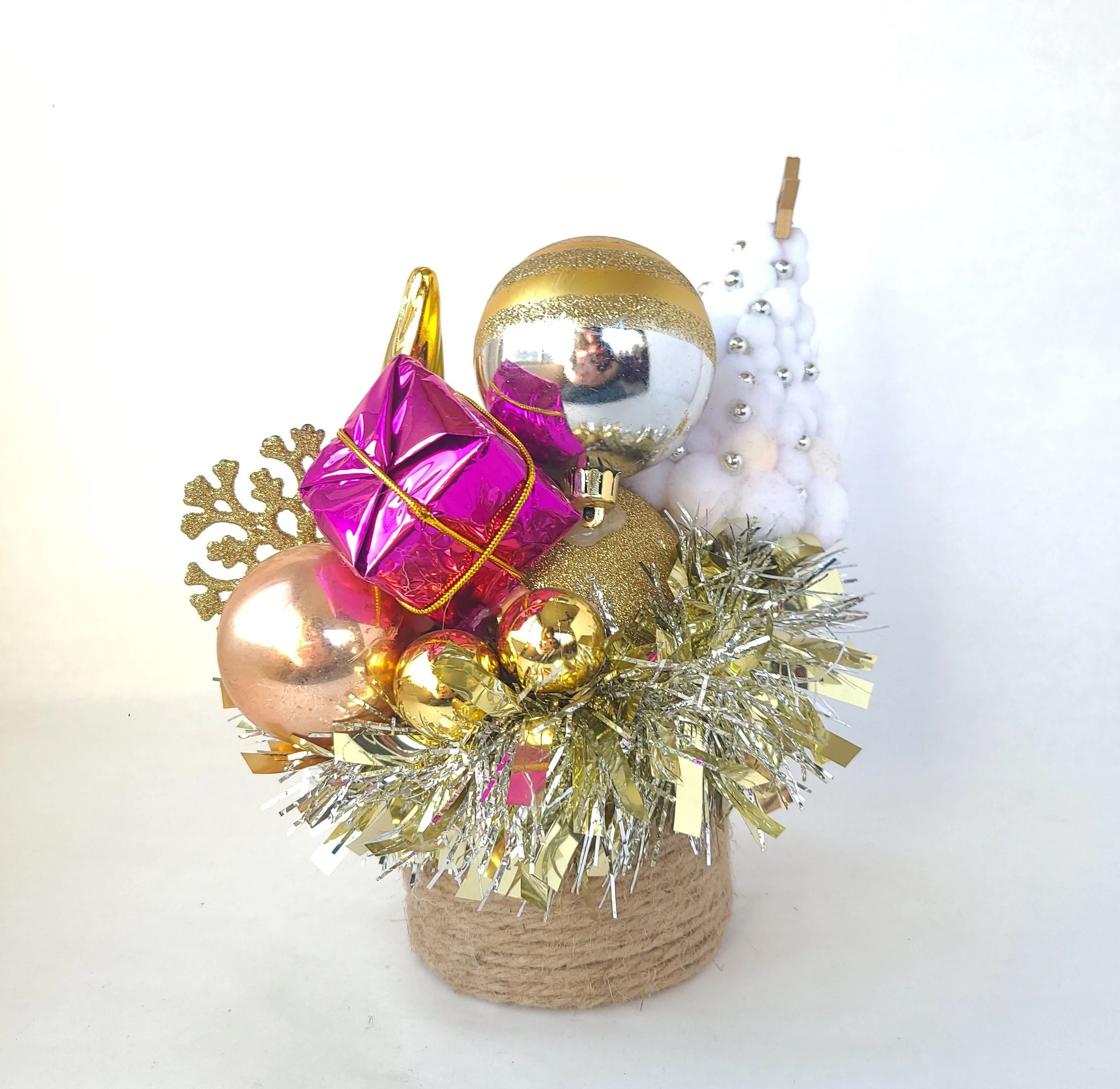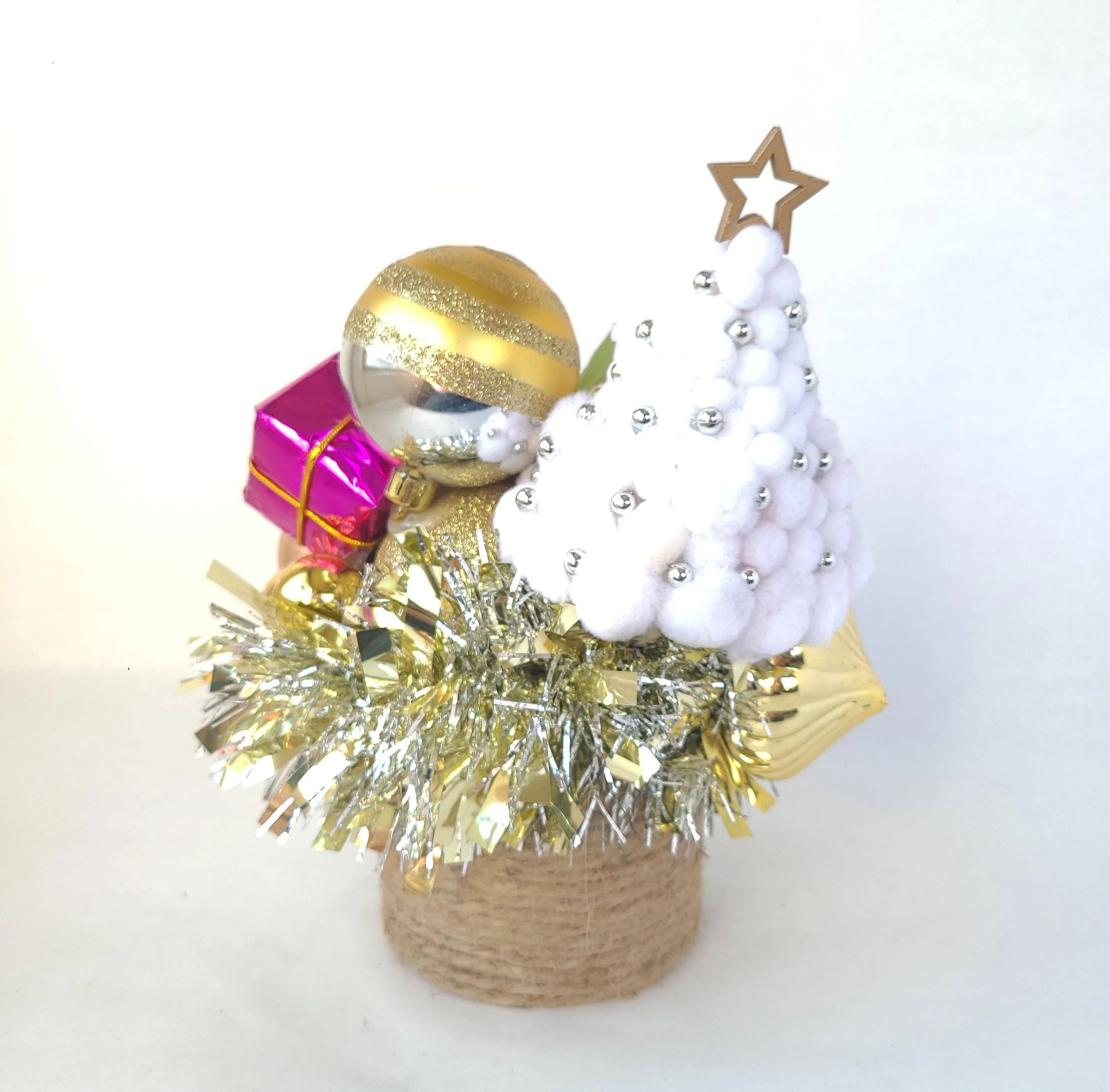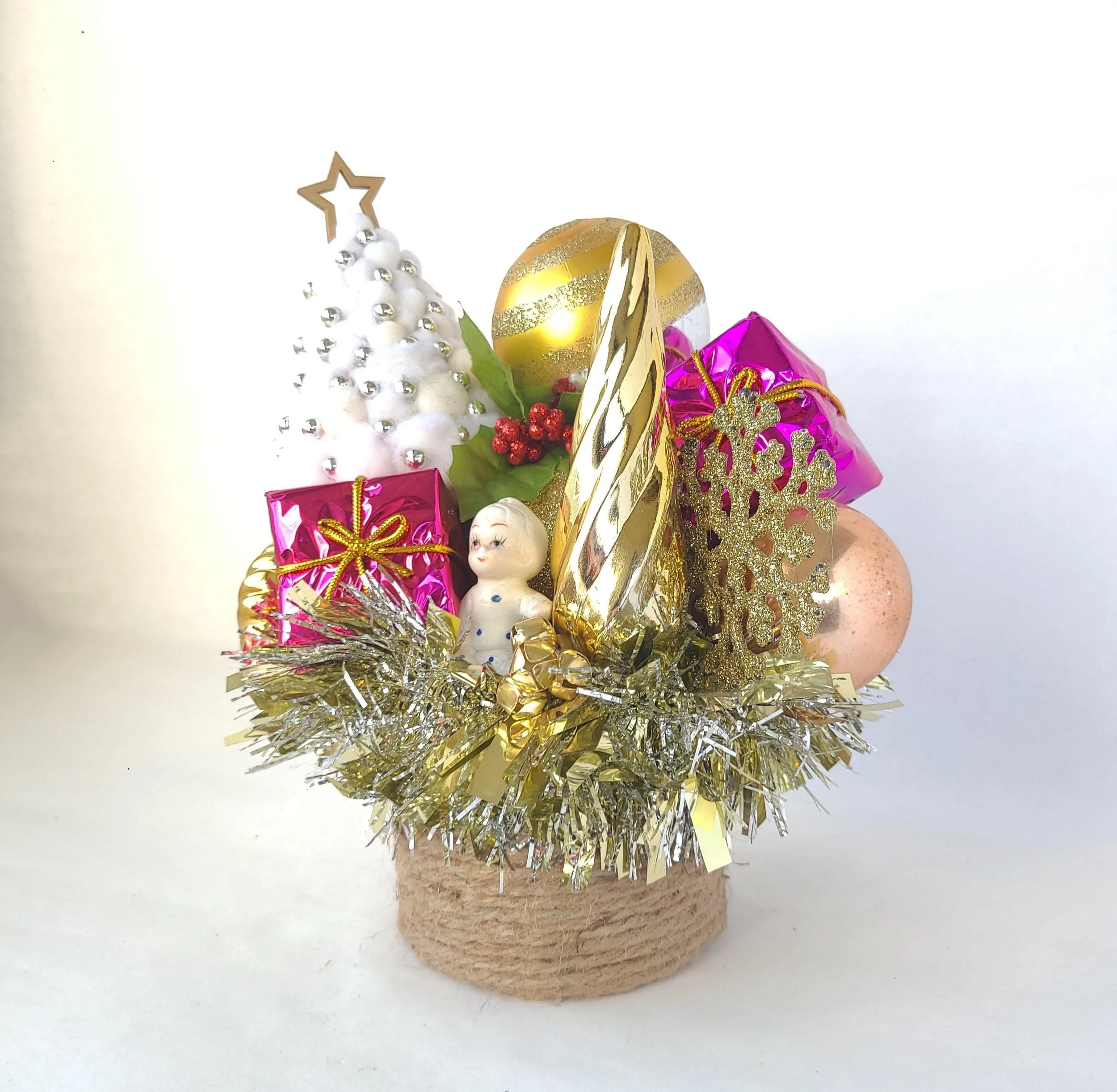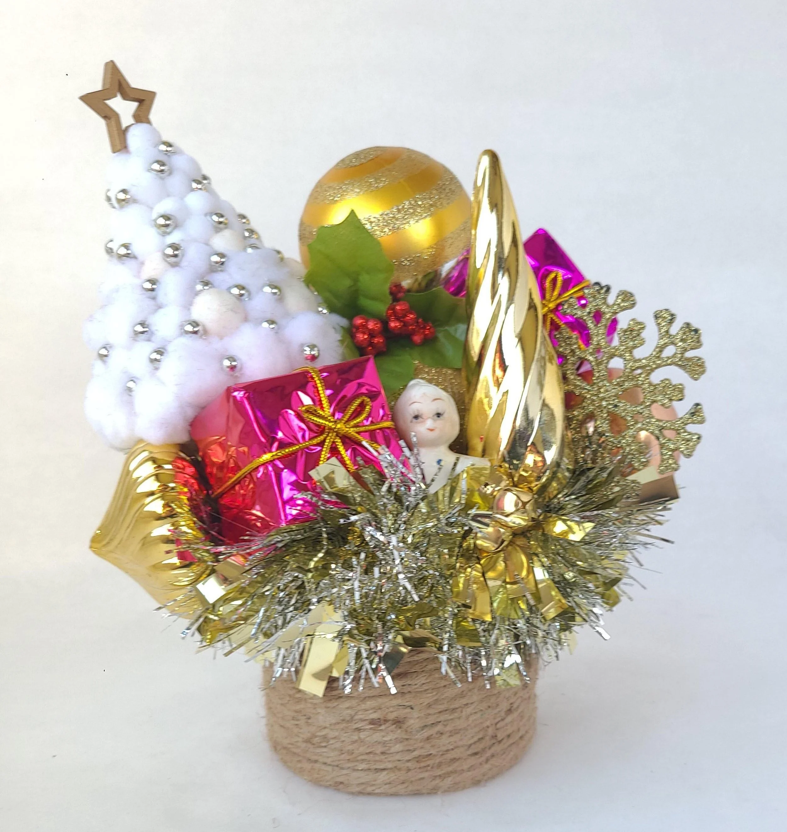 This handmade wreath has been adorned with dozens of vintage buttons in pearly shell white. The buttons are made from plastic, and the base of the wreath is made from reinforced cardboard that has been wrapped with marbled brown and white cotton yarn. The wreath is adorned with a metallic green ribbon bow.
