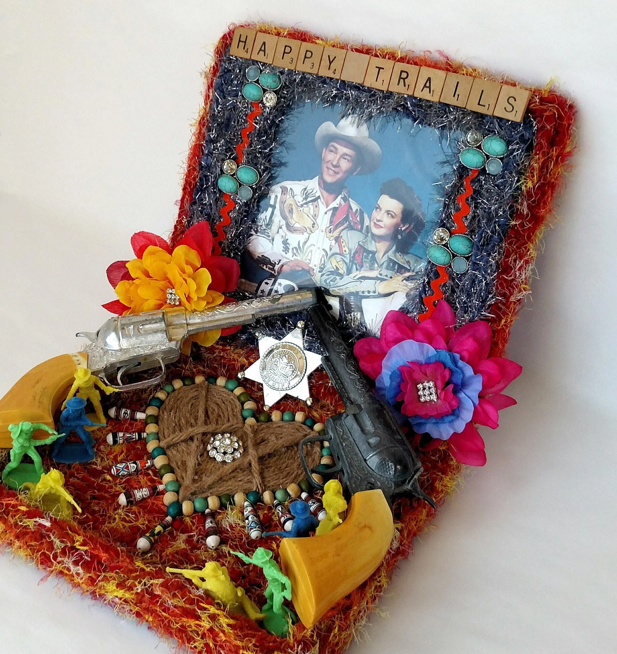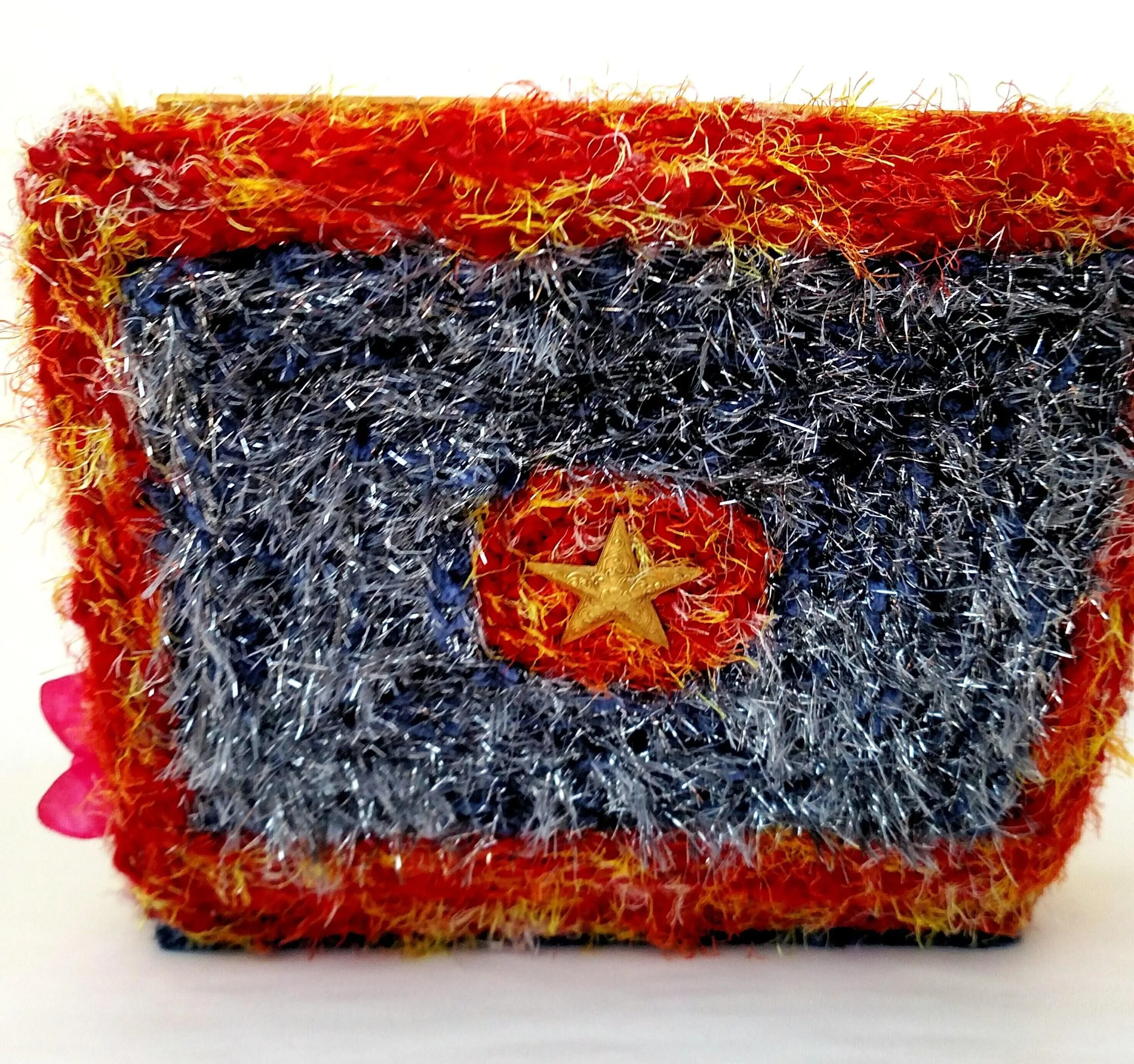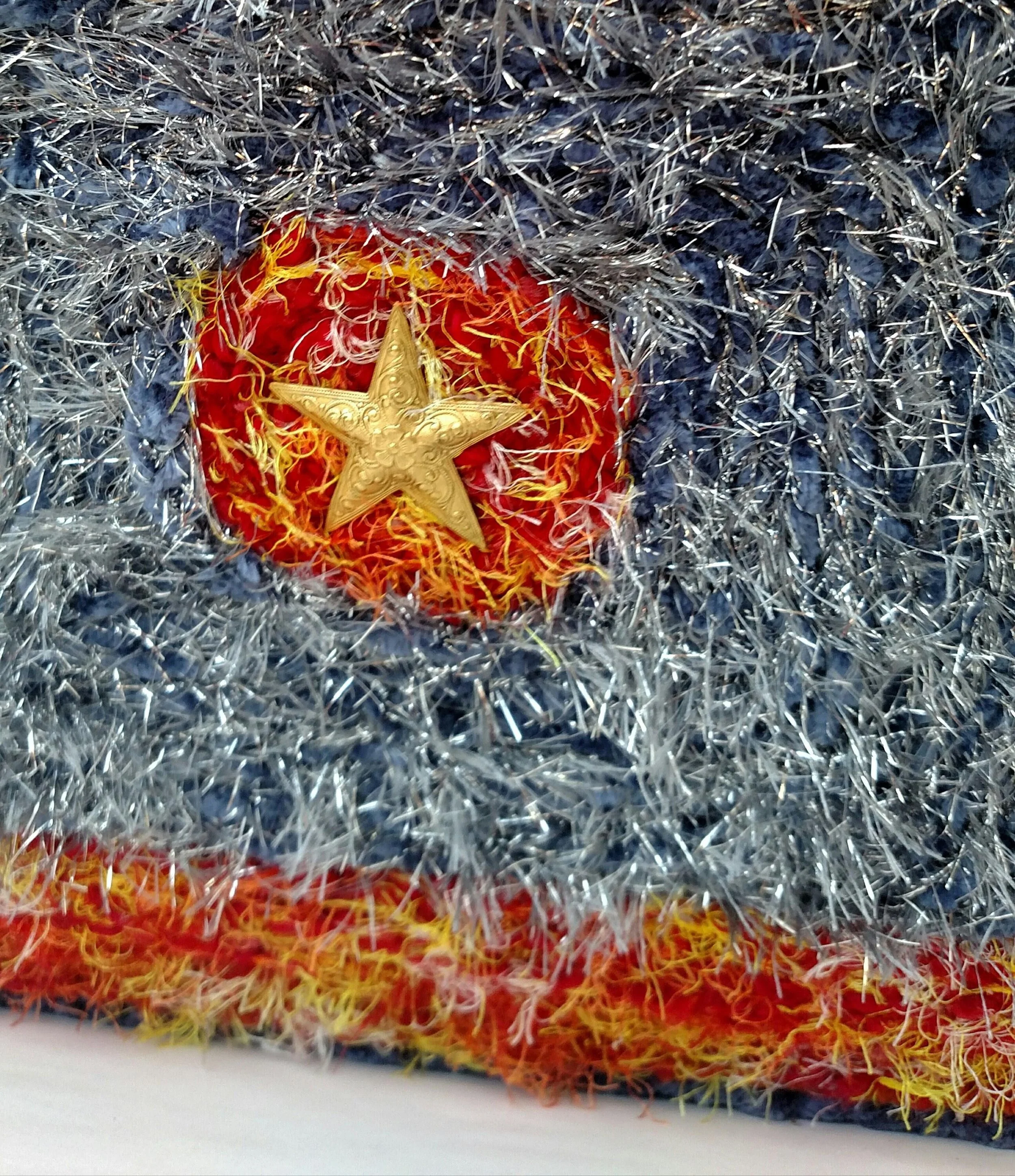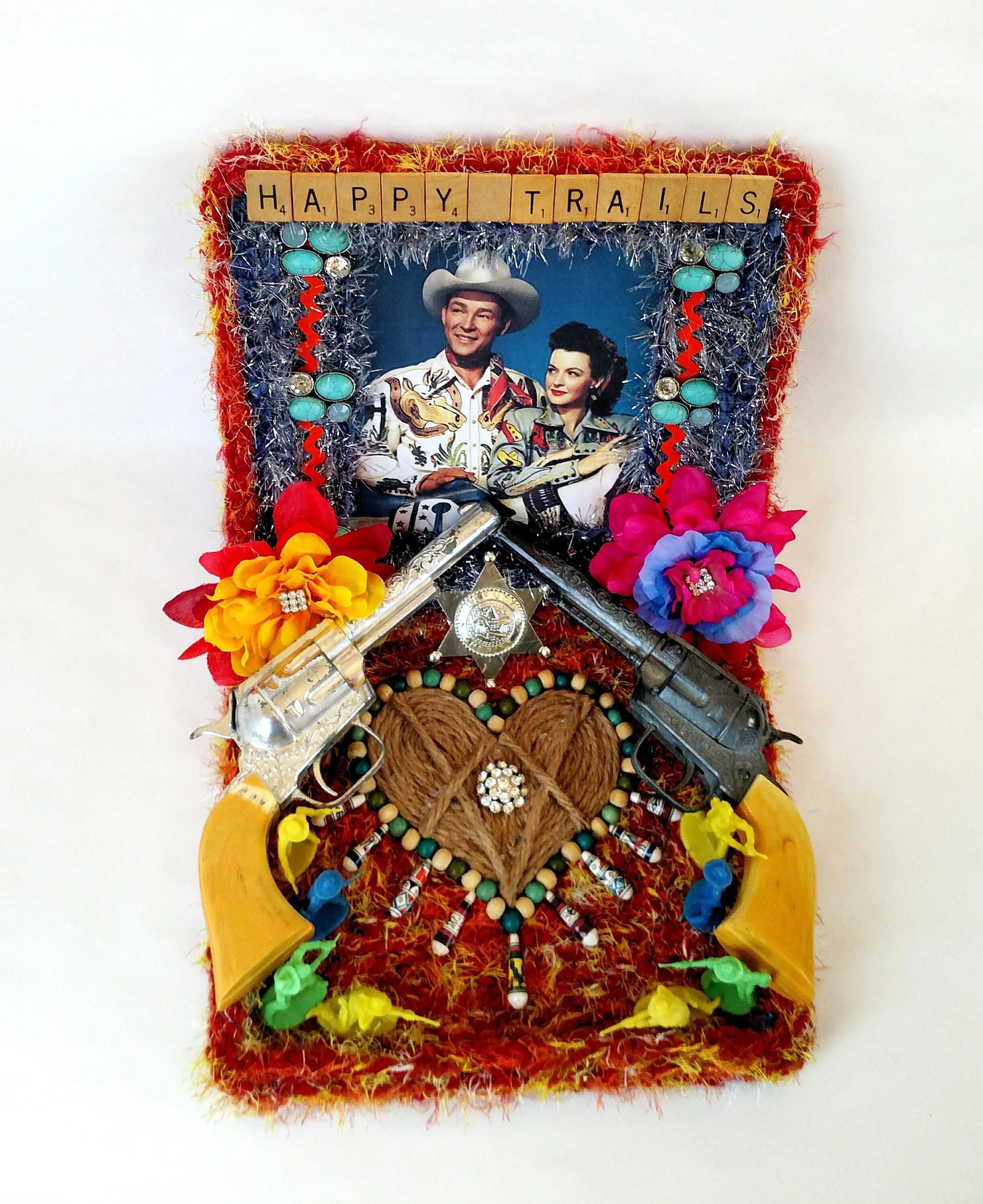 This handmade wreath has been adorned with dozens of vintage buttons in pearly shell white. The buttons are made from plastic, and the base of the wreath is made from reinforced cardboard that has been wrapped with marbled brown and white cotton yarn. The wreath is adorned with a metallic green ribbon bow.
