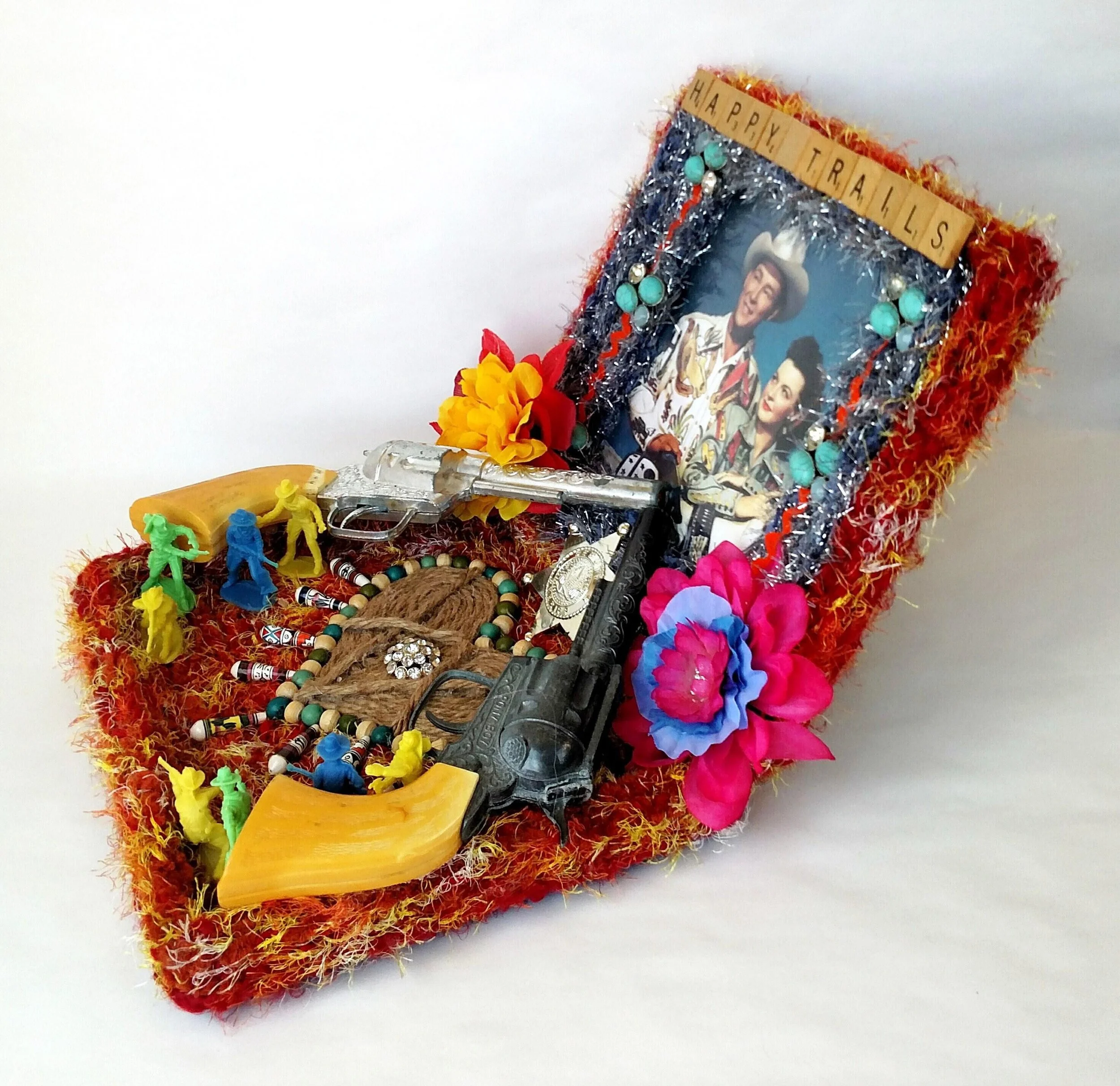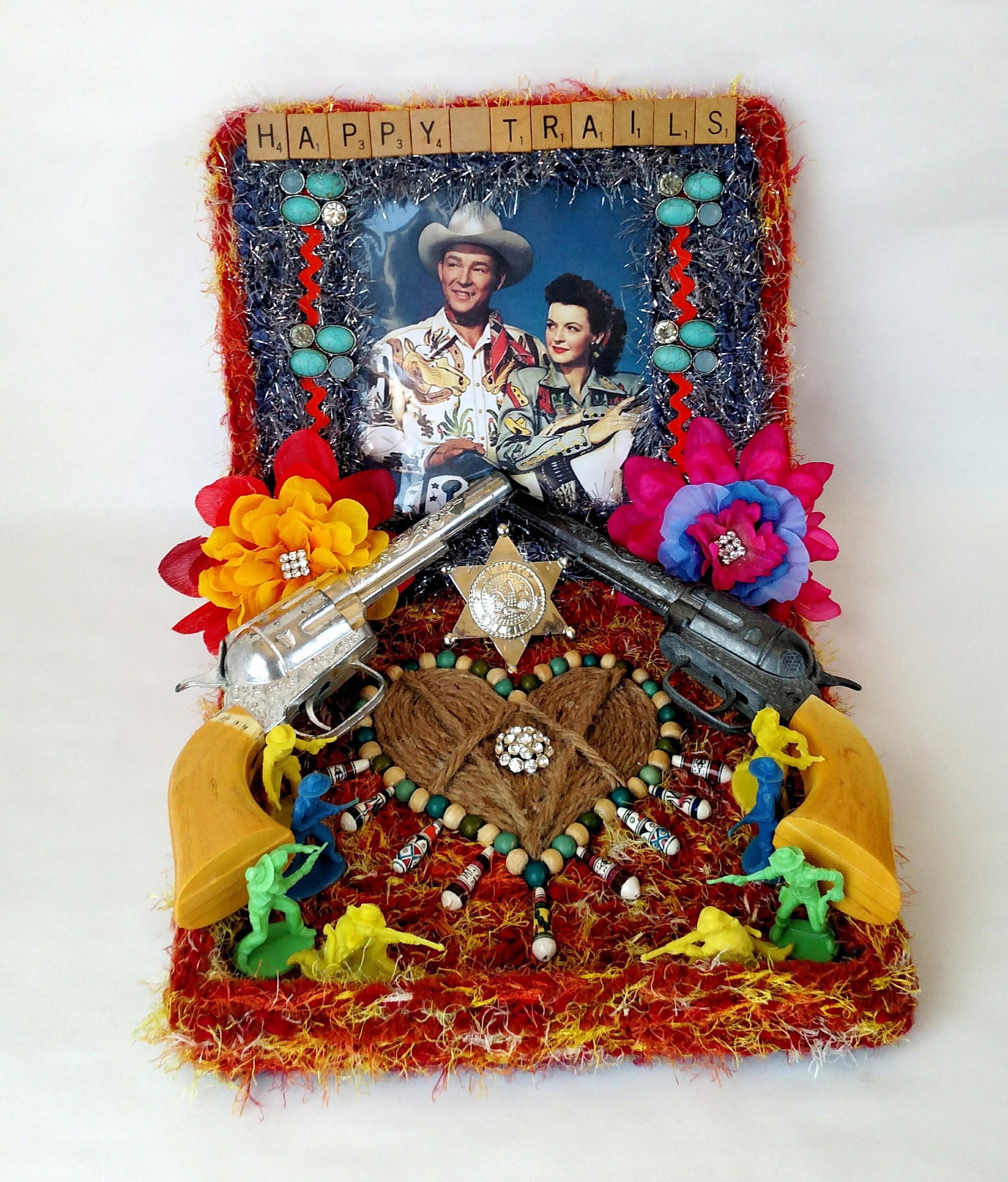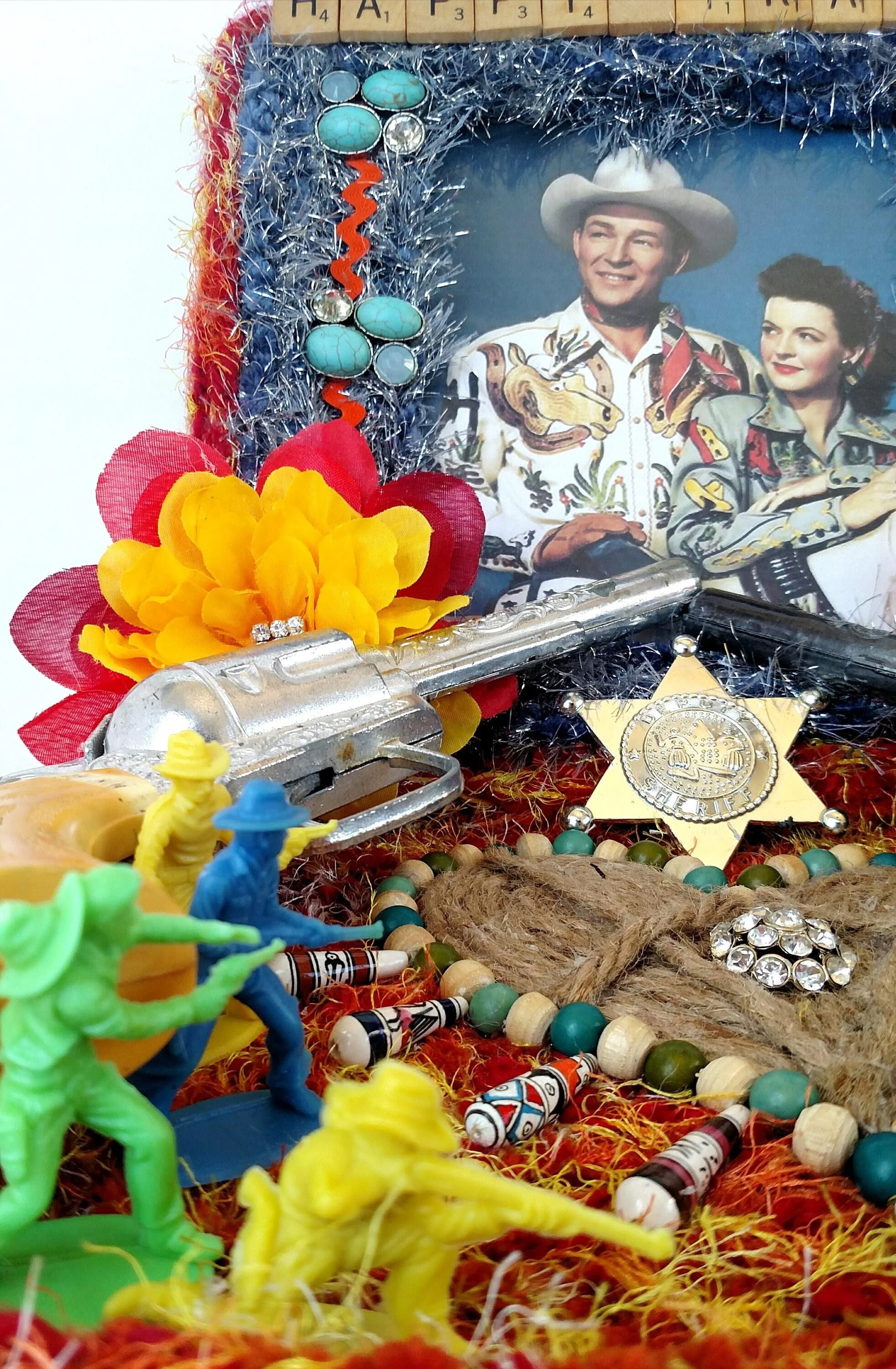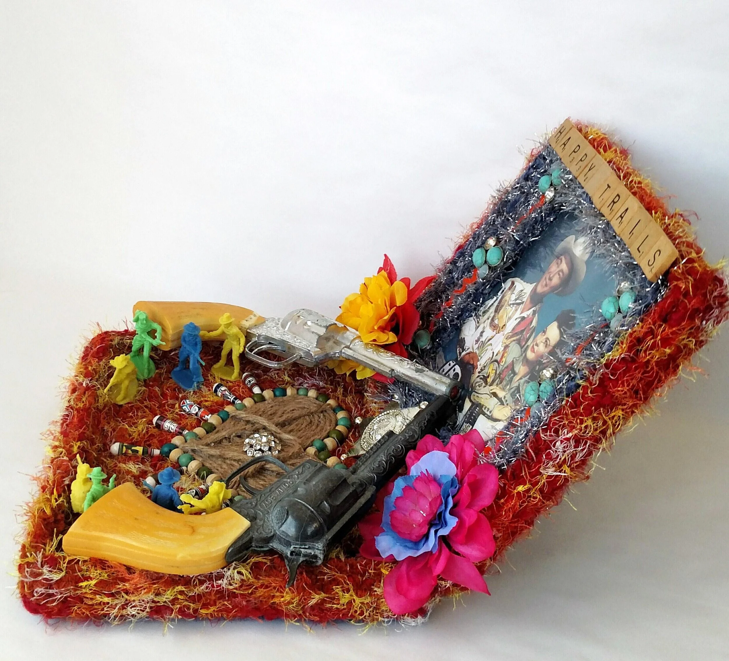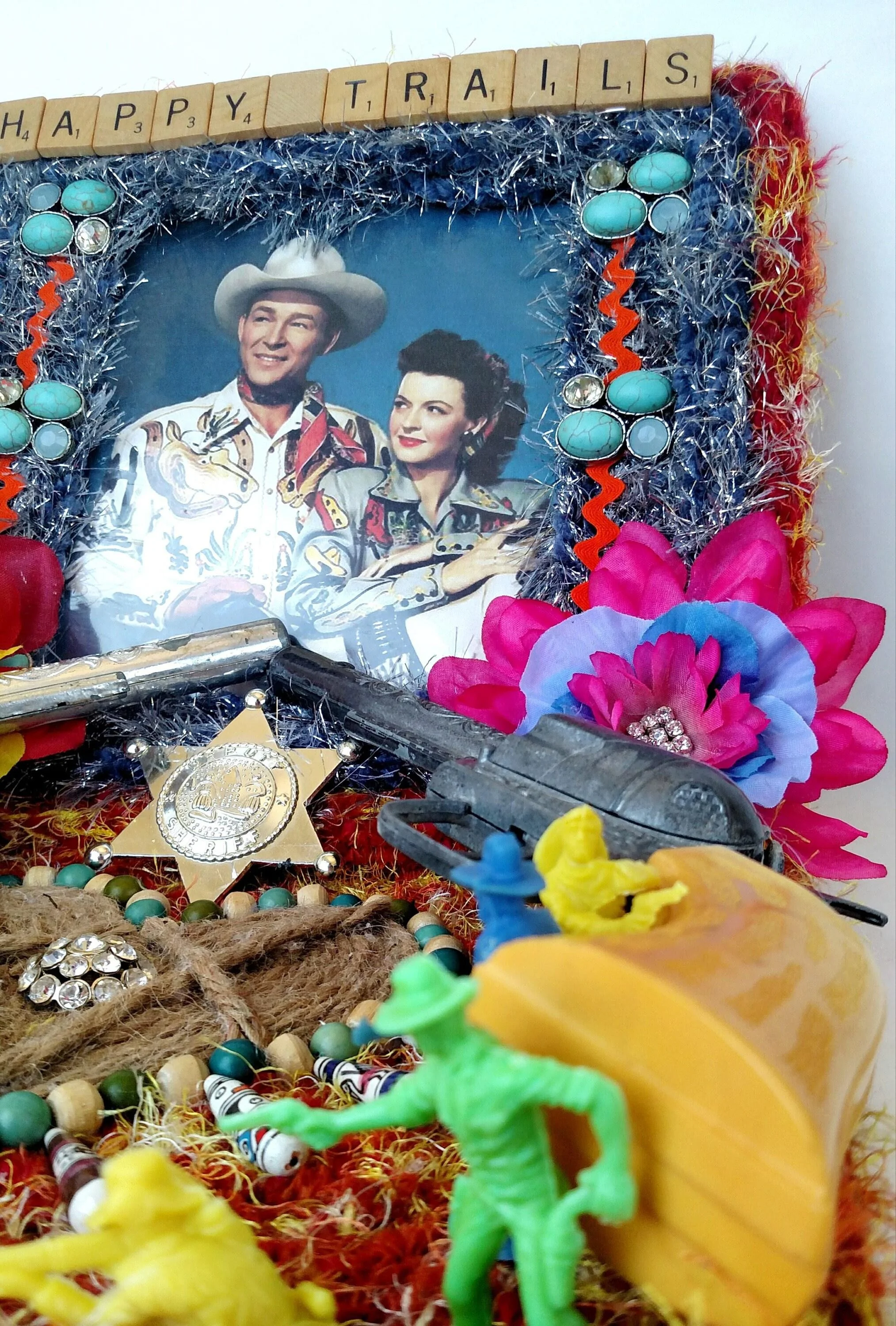 This handmade wreath has been adorned with dozens of vintage buttons in pearly shell white. The buttons are made from plastic, and the base of the wreath is made from reinforced cardboard that has been wrapped with marbled brown and white cotton yarn. The wreath is adorned with a metallic green ribbon bow.