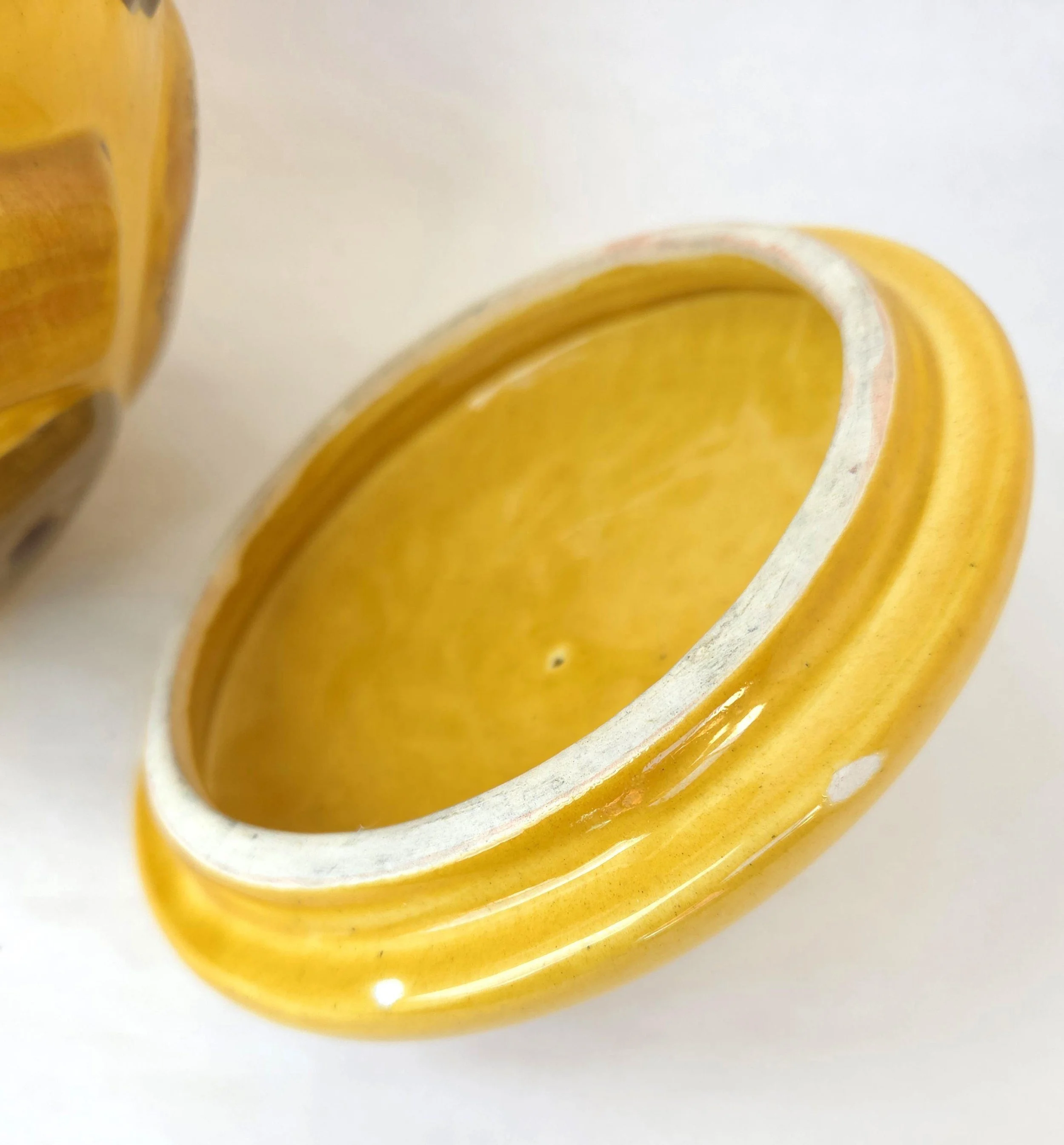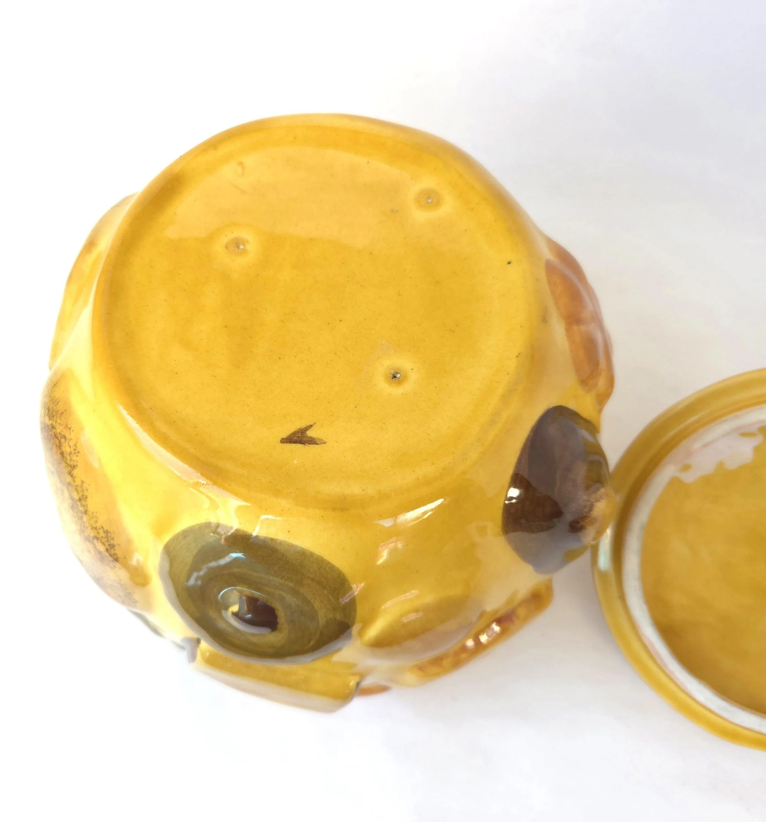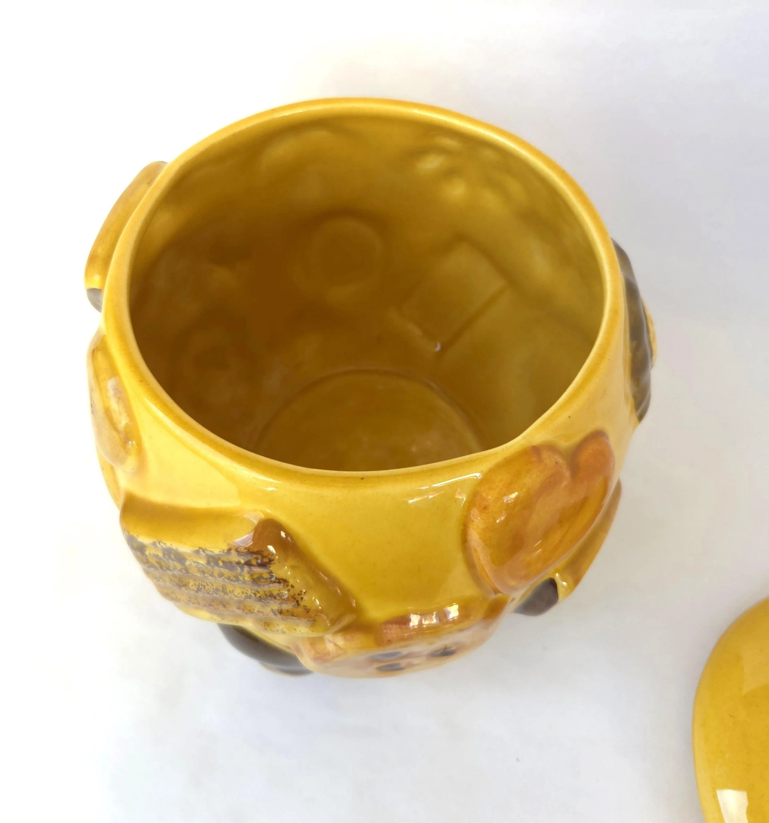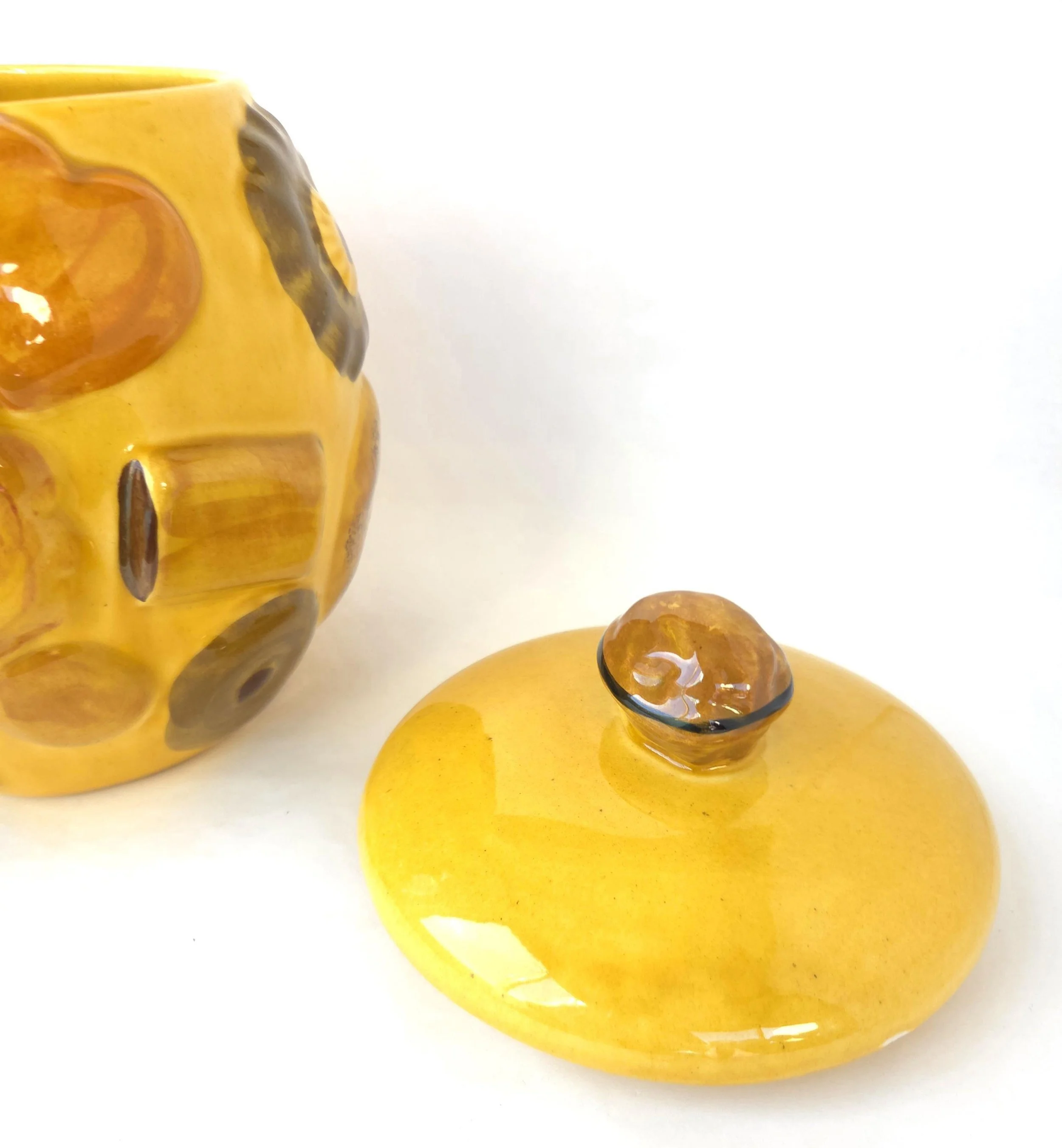 This charming vintage 1950's ceramic cookie jar by Los Angeles pottery features their beloved Cookies All Over design on a yellow background. Whether you're crazy for cookies or need a pop of color in your kitchen - this adorable jar has got you covered! The piece is in used vintage condition with one small surface chip to one cookie and a couple of small surface chips to the outer edge of the lid. The glaze is in good condition with no crazing and excellent color quality.