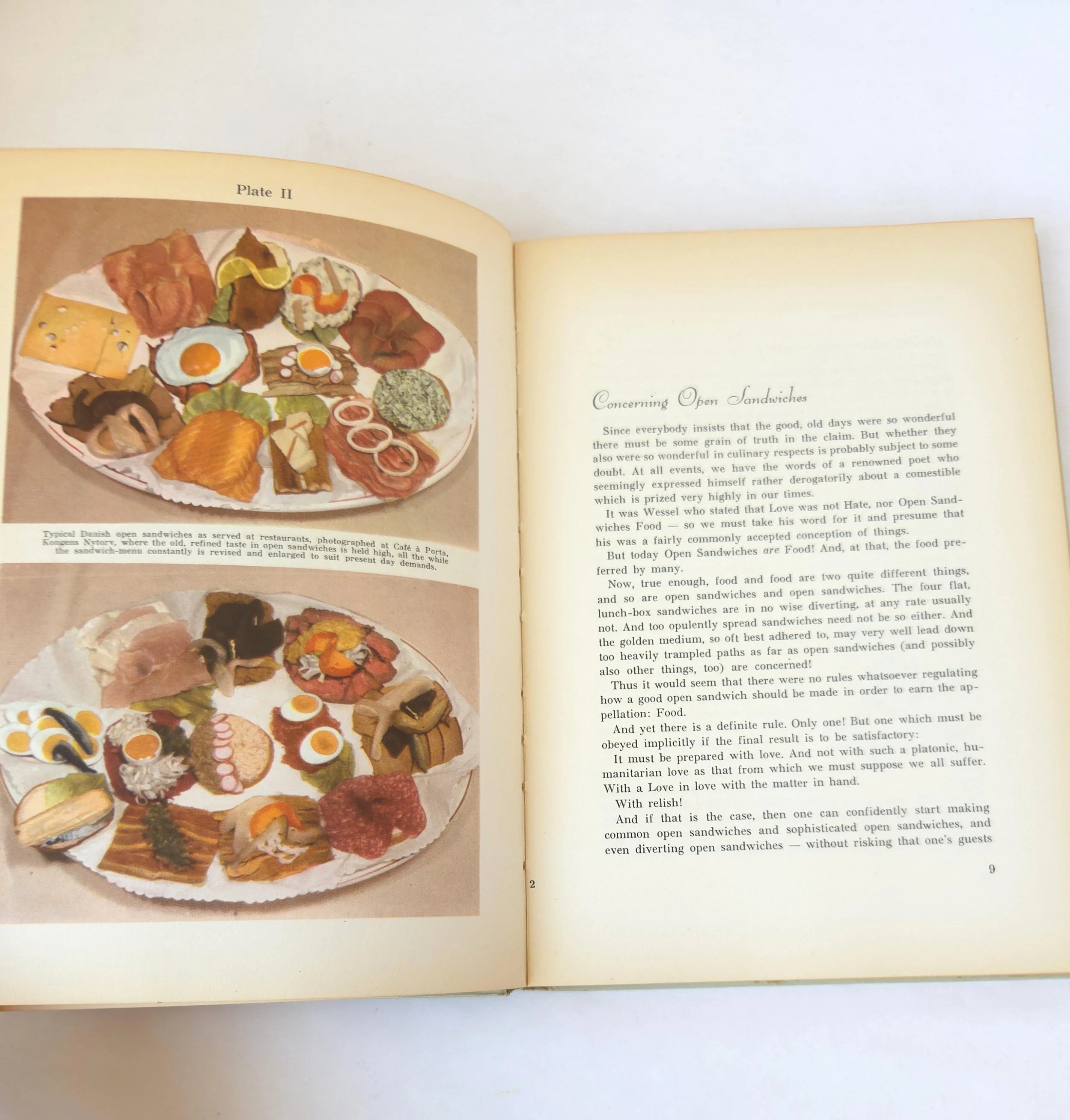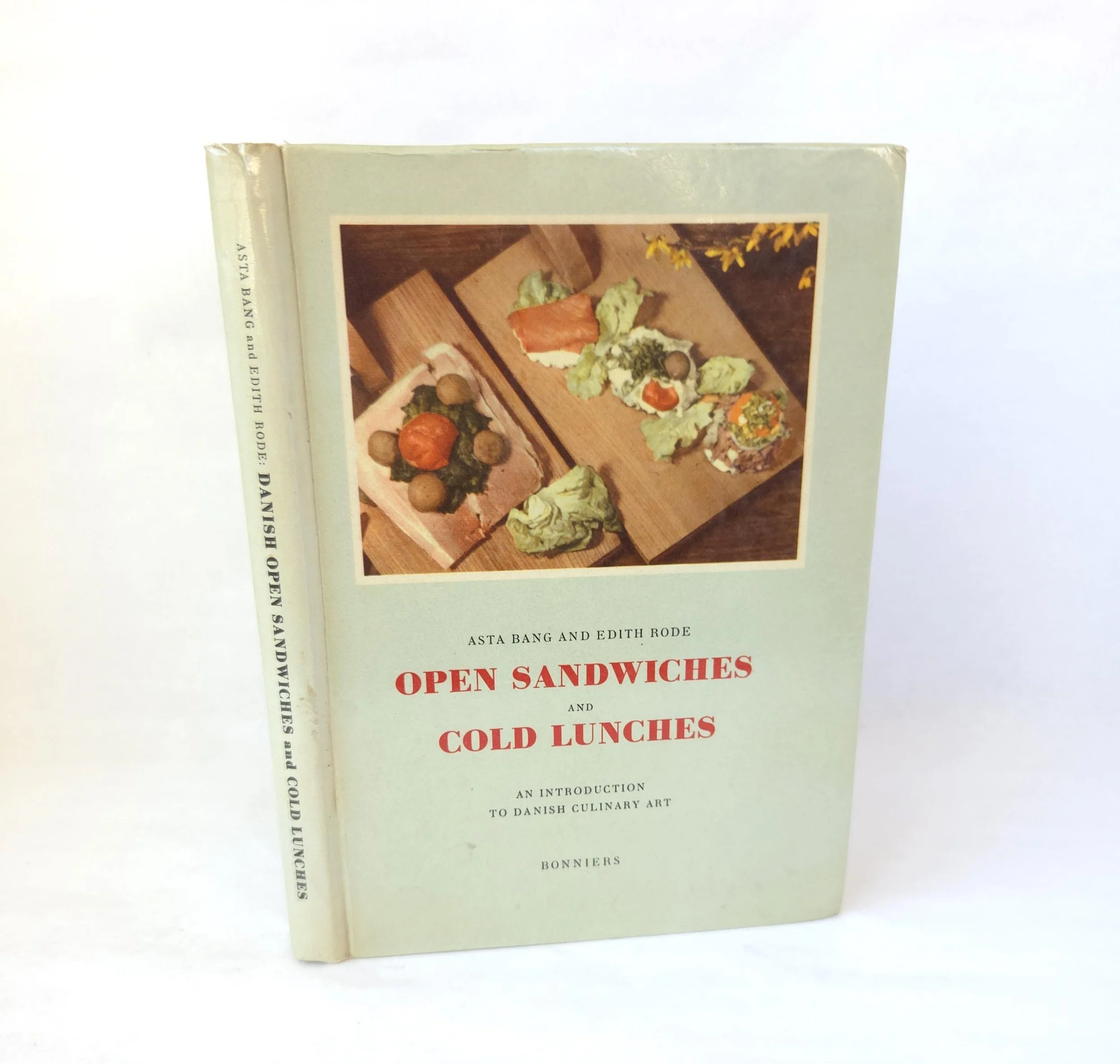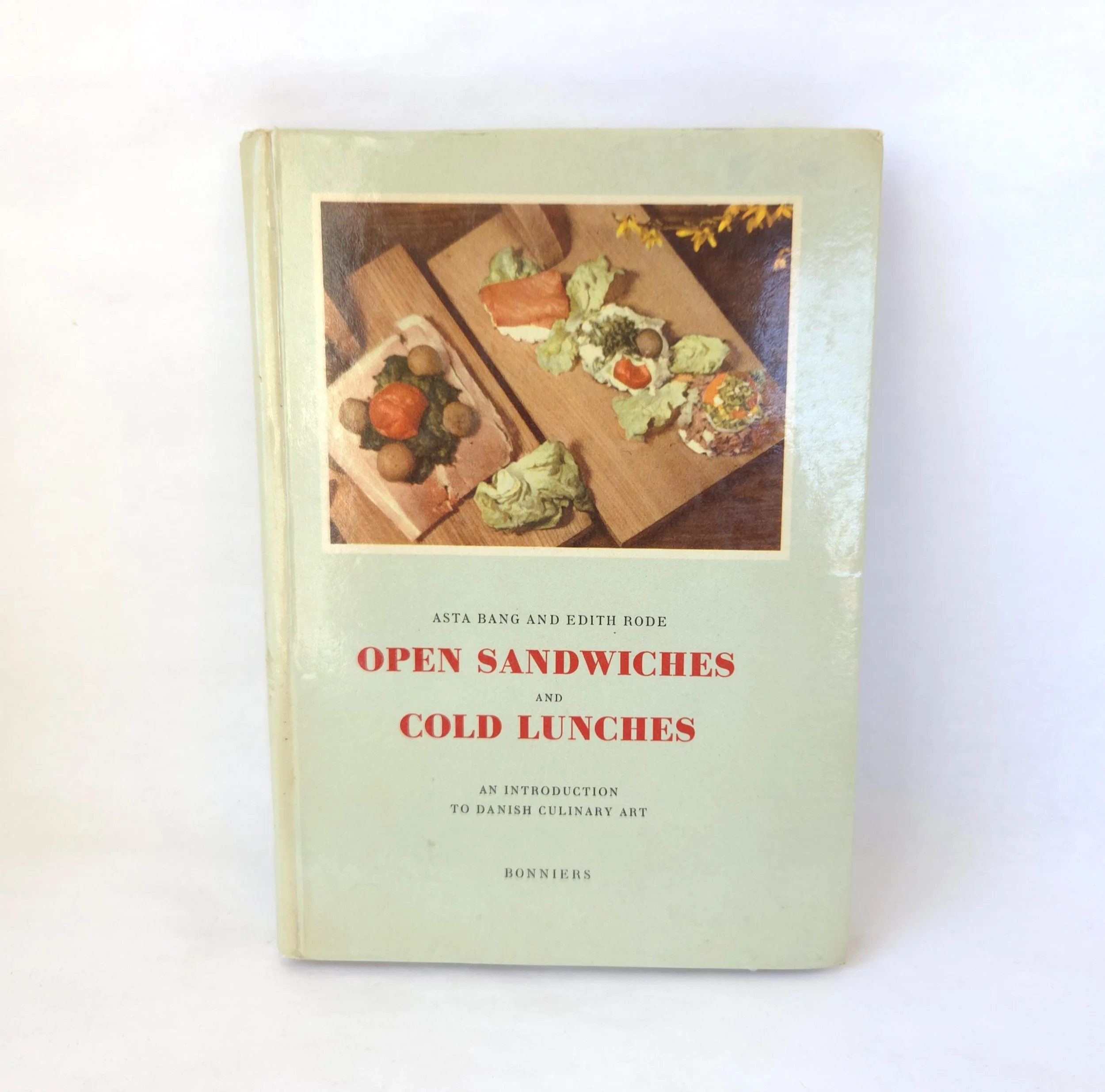 This charming vintage 1949 hardcover edition of Open Sandwiches and Cold Lunches - An Introduction to Danish Culinary Art was written by Asta Bang and Edith Rode. It celebrates this delicious Danish tradition along with full color photographs and easy to follow directions. The book is in used vintage condition with some wear to the edges of the cover along with some light scuffs. The original owner's name is written on the title page and there is a crack towards the middle of the book that reveals the spine's webbing - but the binding feels solid. There are no torn or marked pages, just some yellowing from age.
