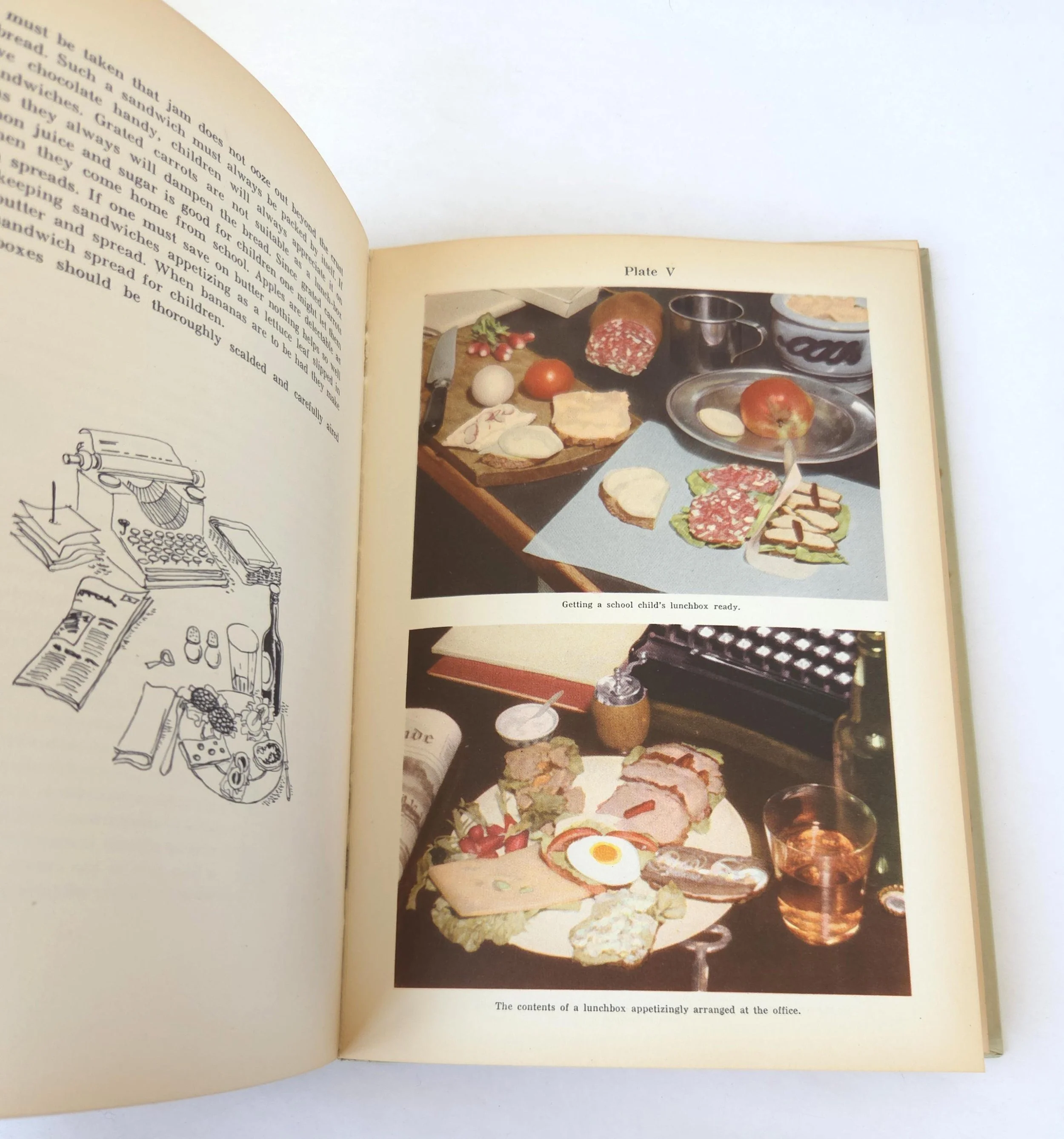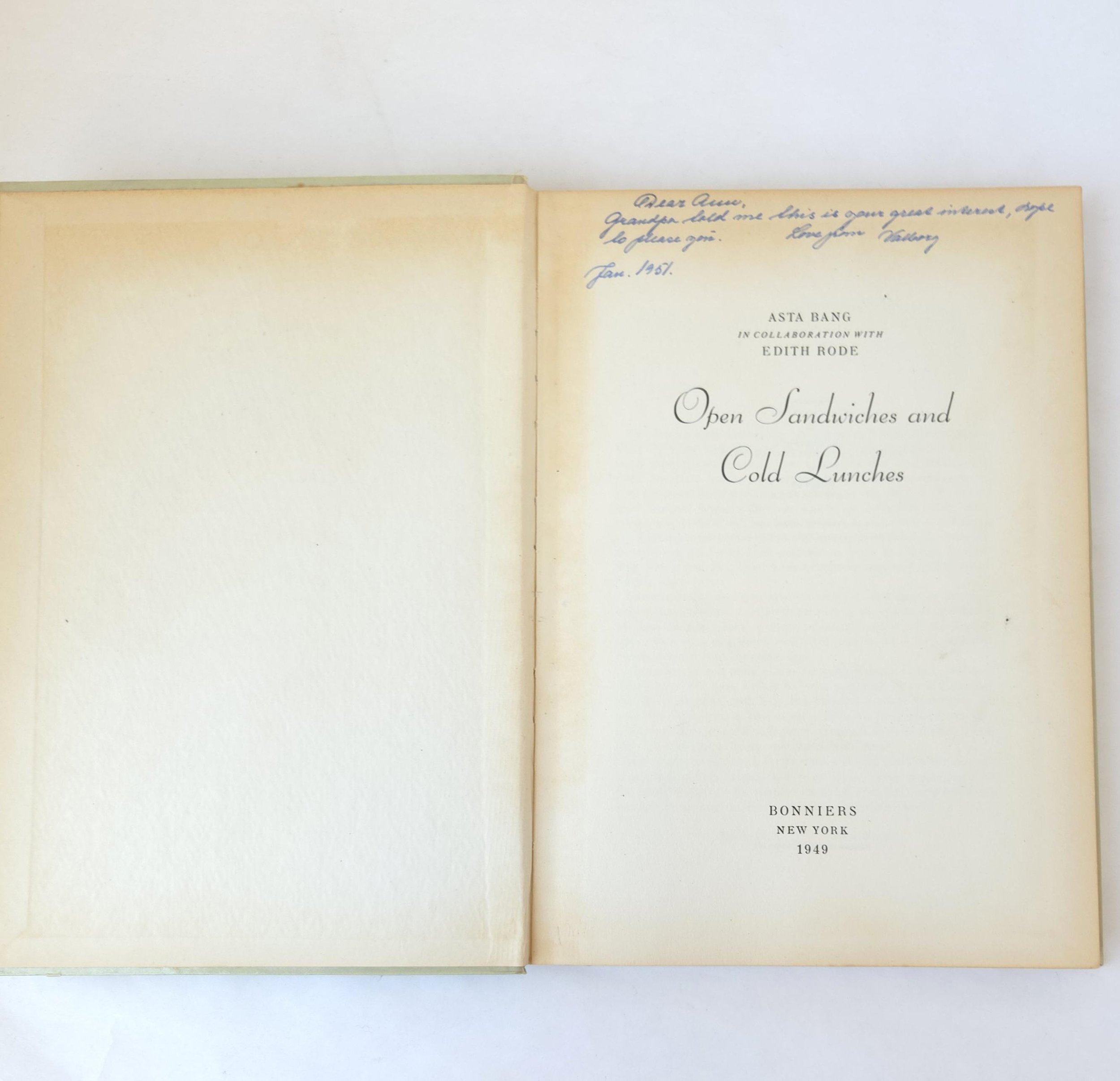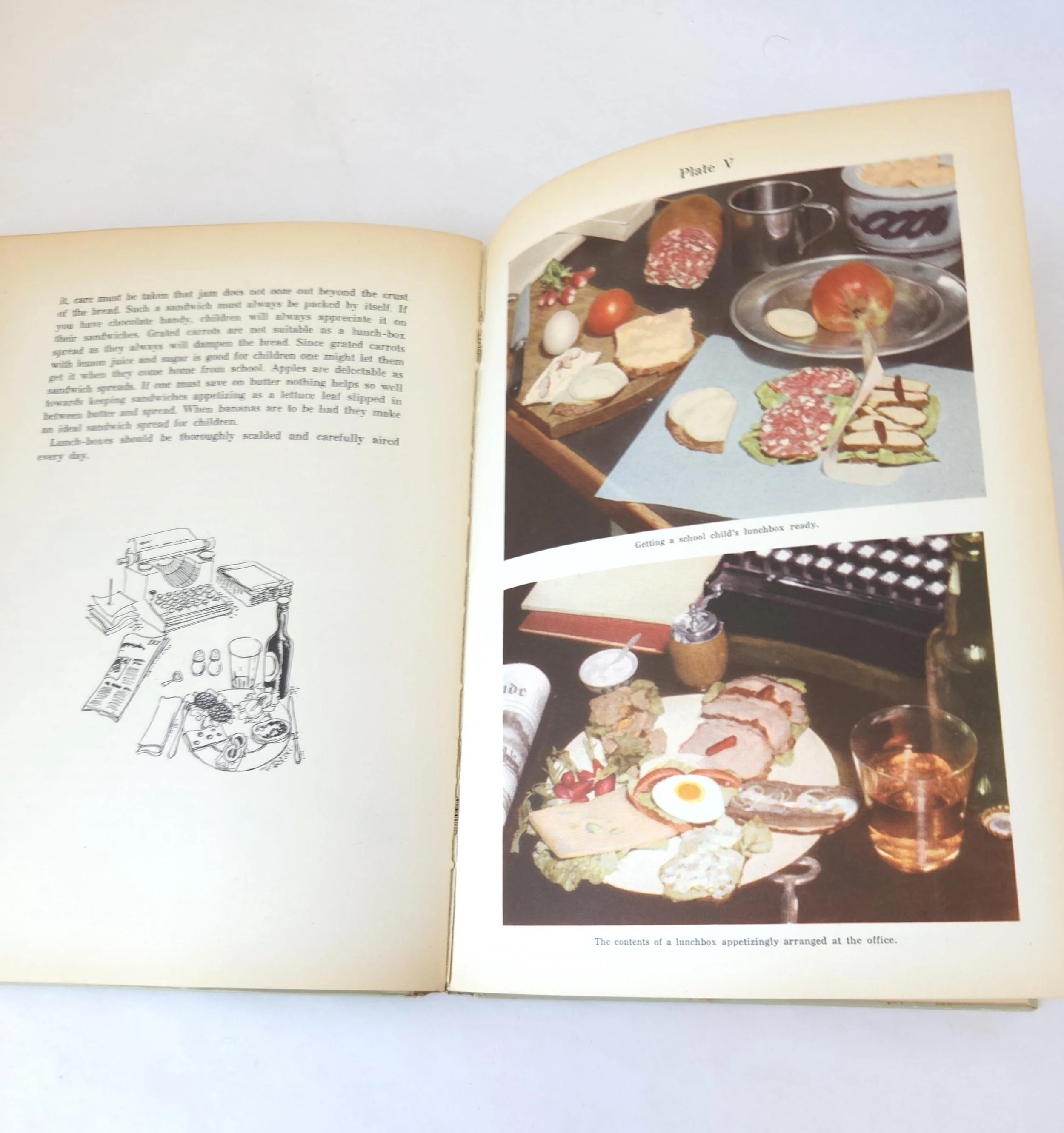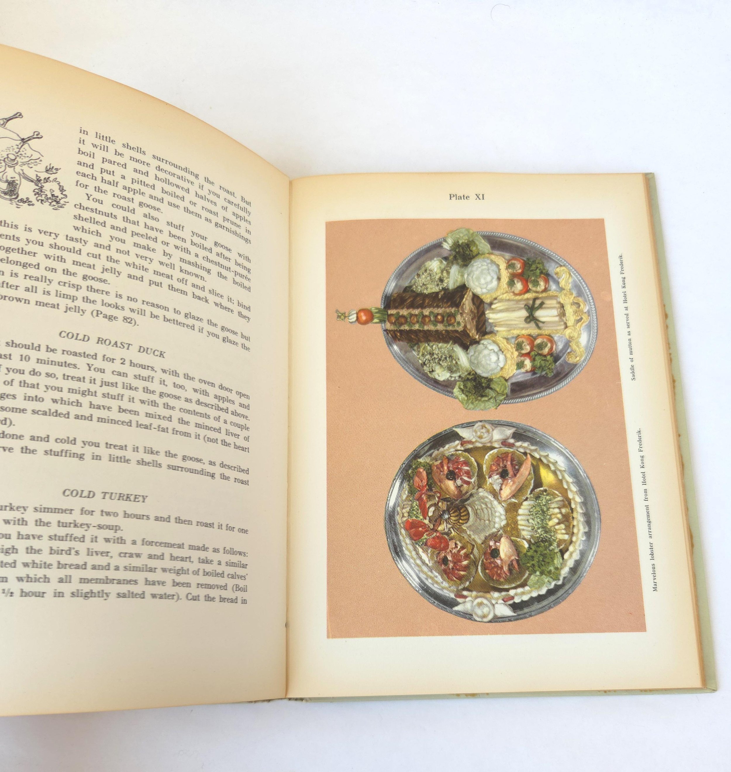 This charming vintage 1949 hardcover edition of Open Sandwiches and Cold Lunches - An Introduction to Danish Culinary Art was written by Asta Bang and Edith Rode. It celebrates this delicious Danish tradition along with full color photographs and easy to follow directions. The book is in used vintage condition with some wear to the edges of the cover along with some light scuffs. The original owner's name is written on the title page and there is a crack towards the middle of the book that reveals the spine's webbing - but the binding feels solid. There are no torn or marked pages, just some yellowing from age.