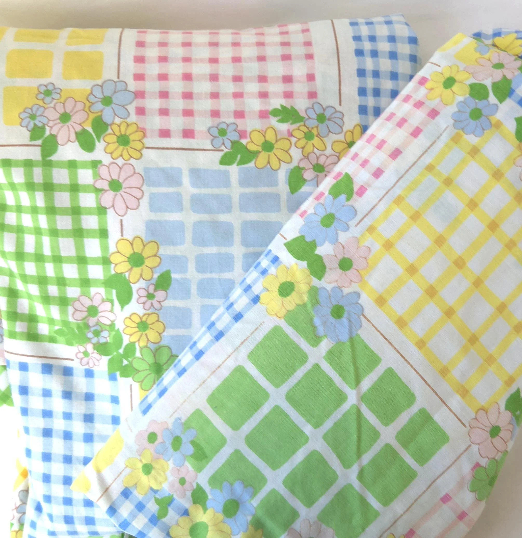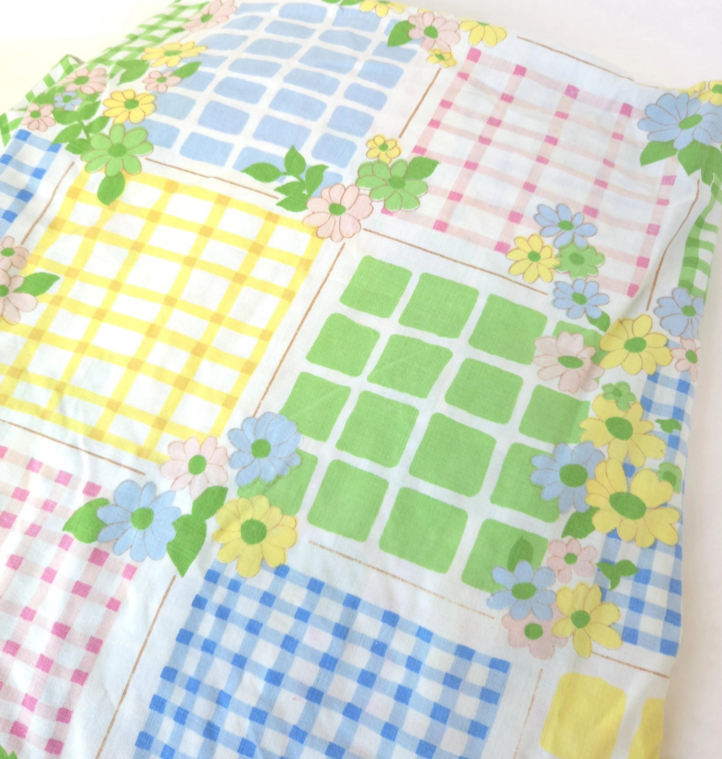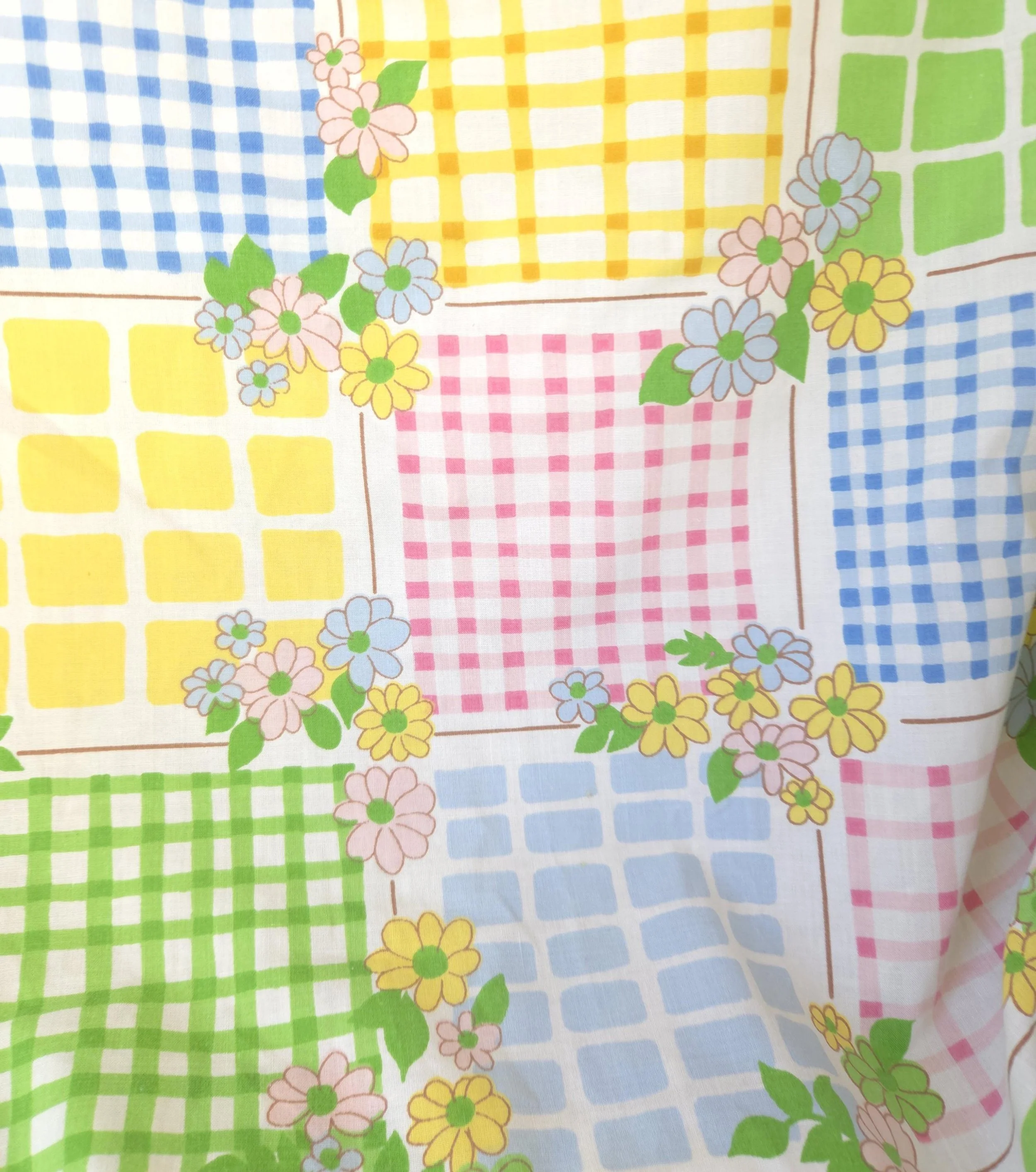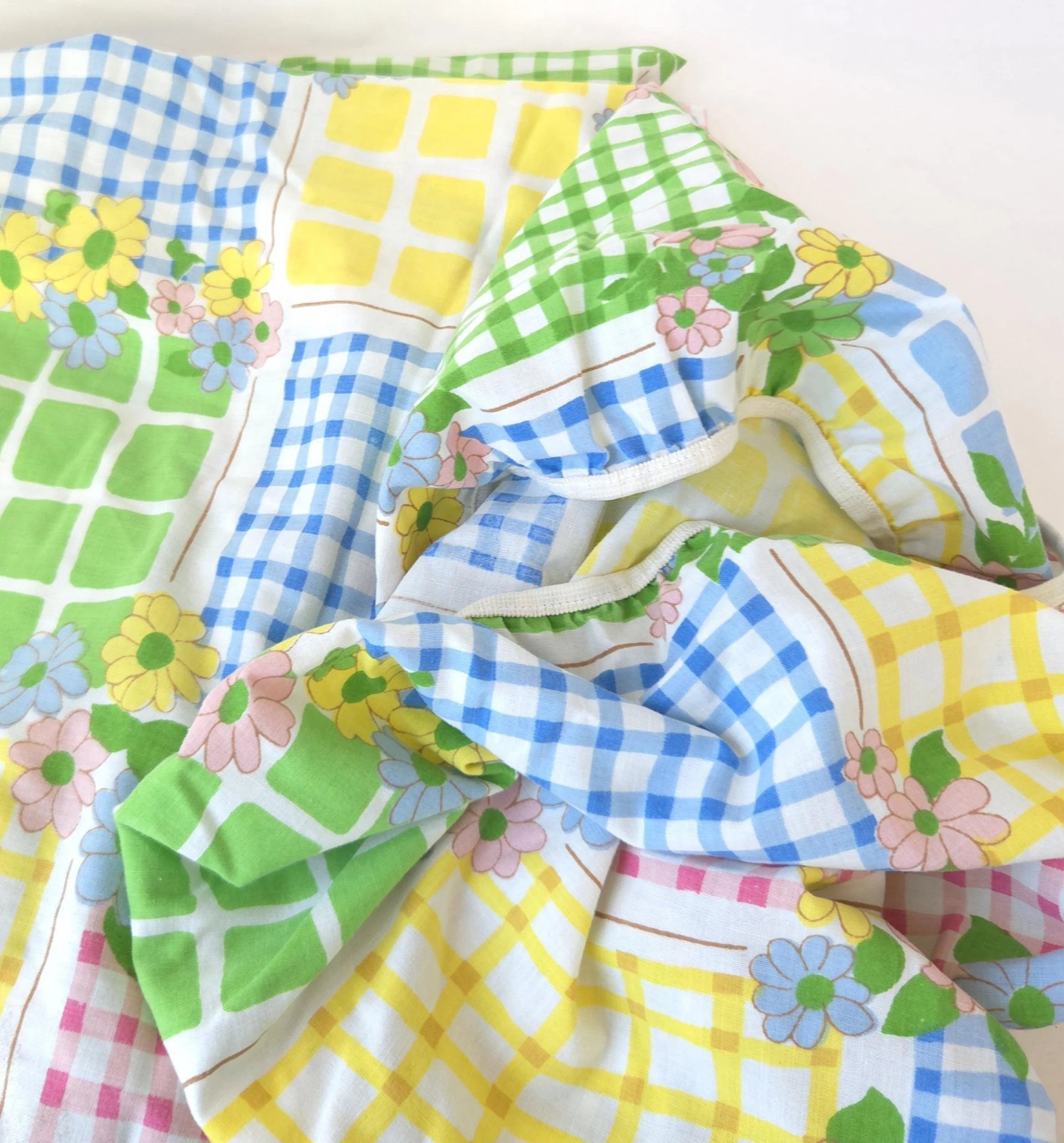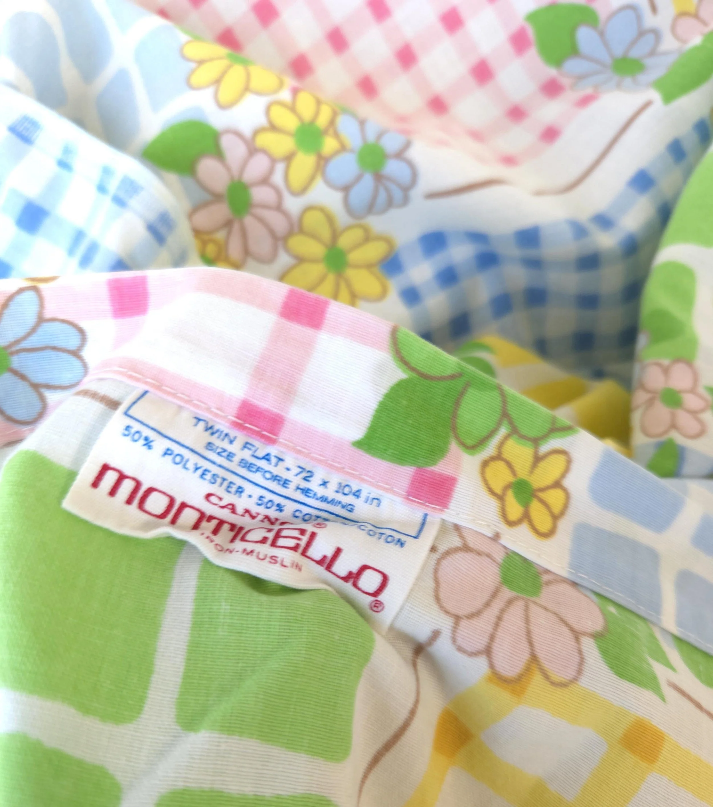 This groovy vintage 1970's sheet set by Cannon Monticello includes one twin flat and one twin fitted sheet in a pastel flower power and gingham print. Both pieces are in good used condition with some minor fading to the center of the fitted sheet, but no stains or tears and good overall color quality.