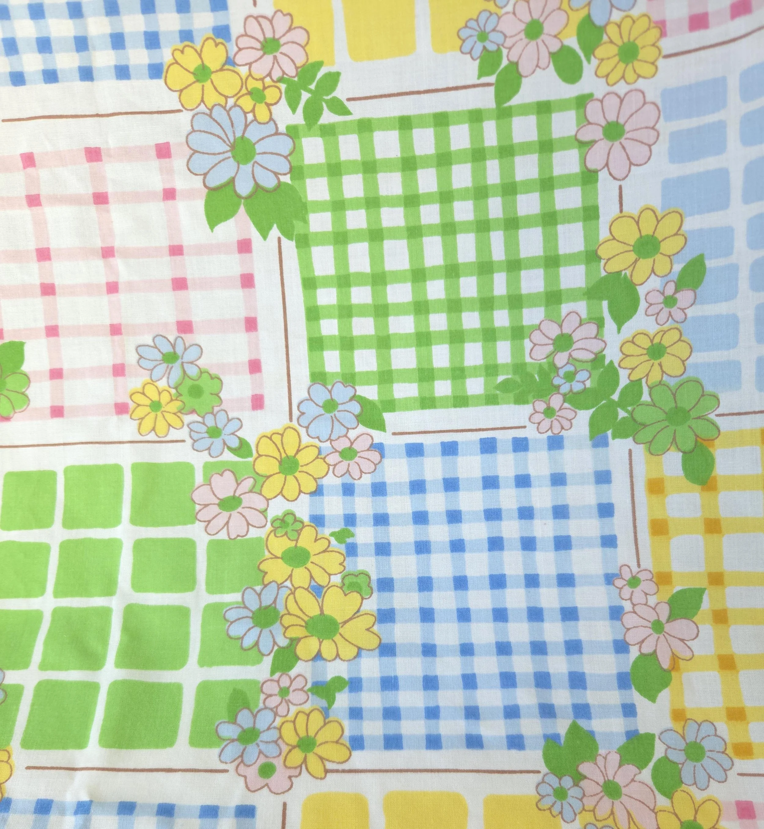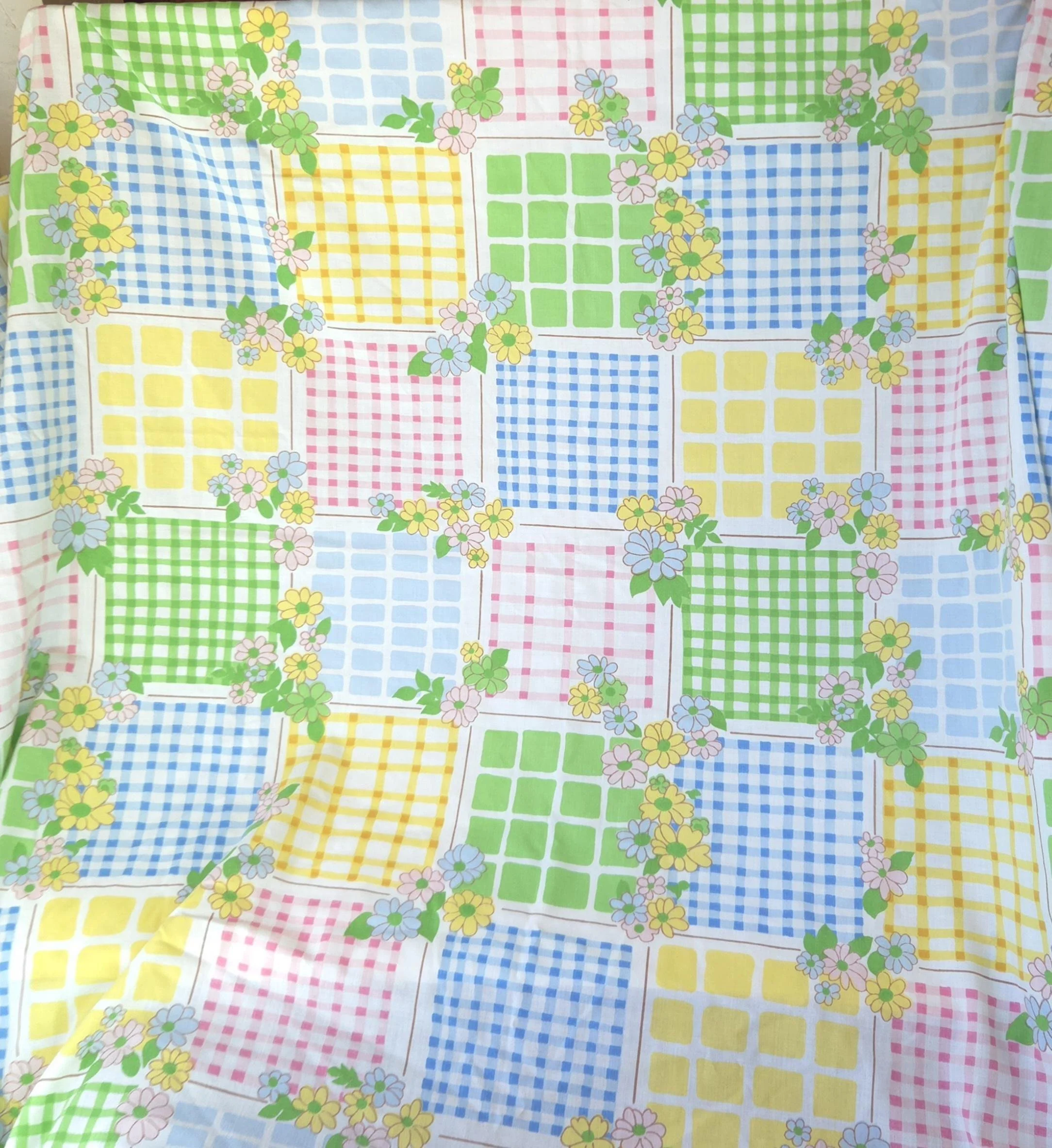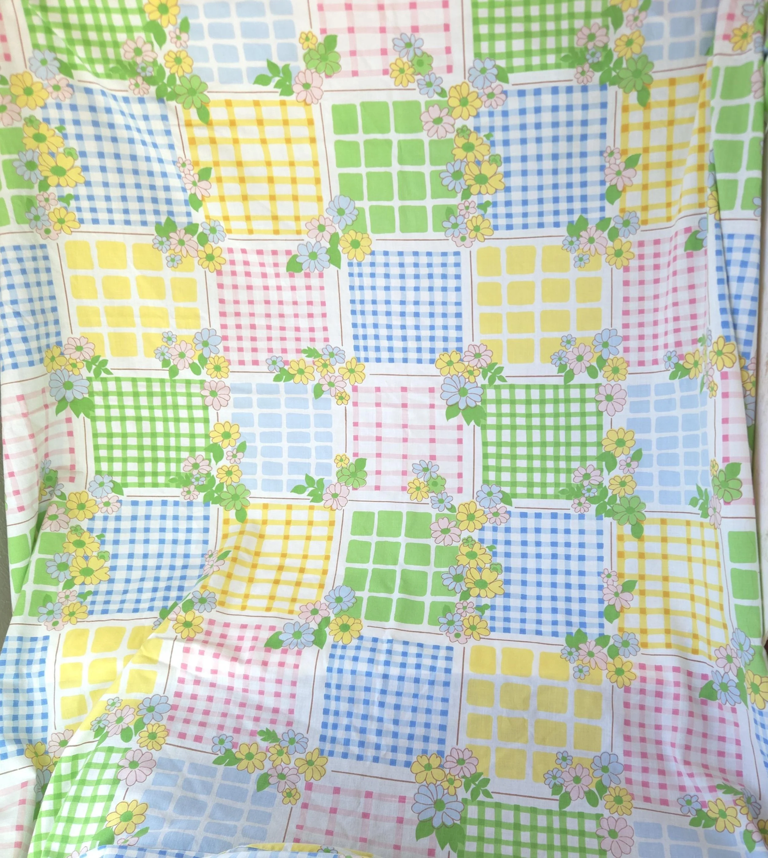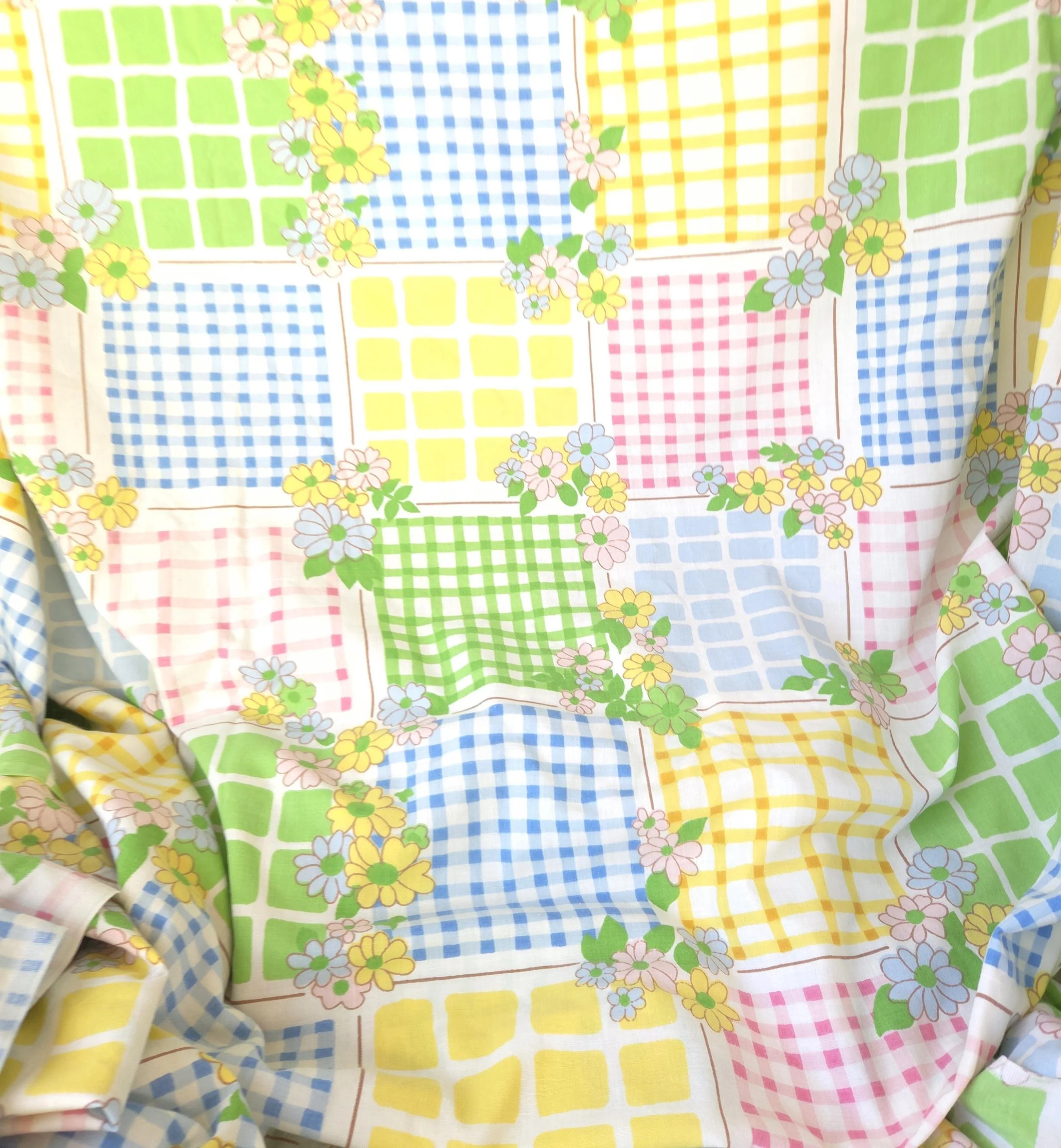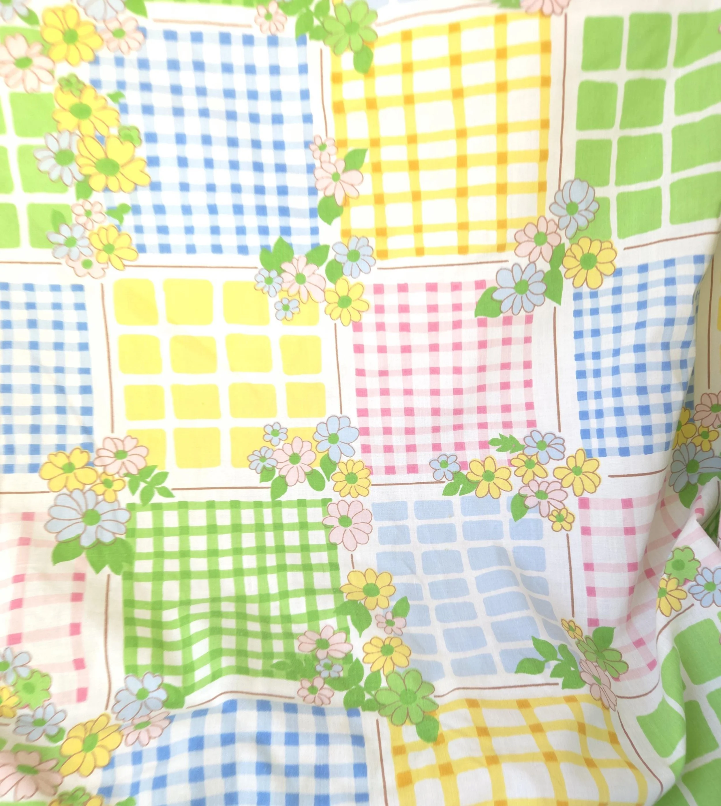 This groovy vintage 1970's sheet set by Cannon Monticello includes one twin flat and one twin fitted sheet in a pastel flower power and gingham print. Both pieces are in good used condition with some minor fading to the center of the fitted sheet, but no stains or tears and good overall color quality.