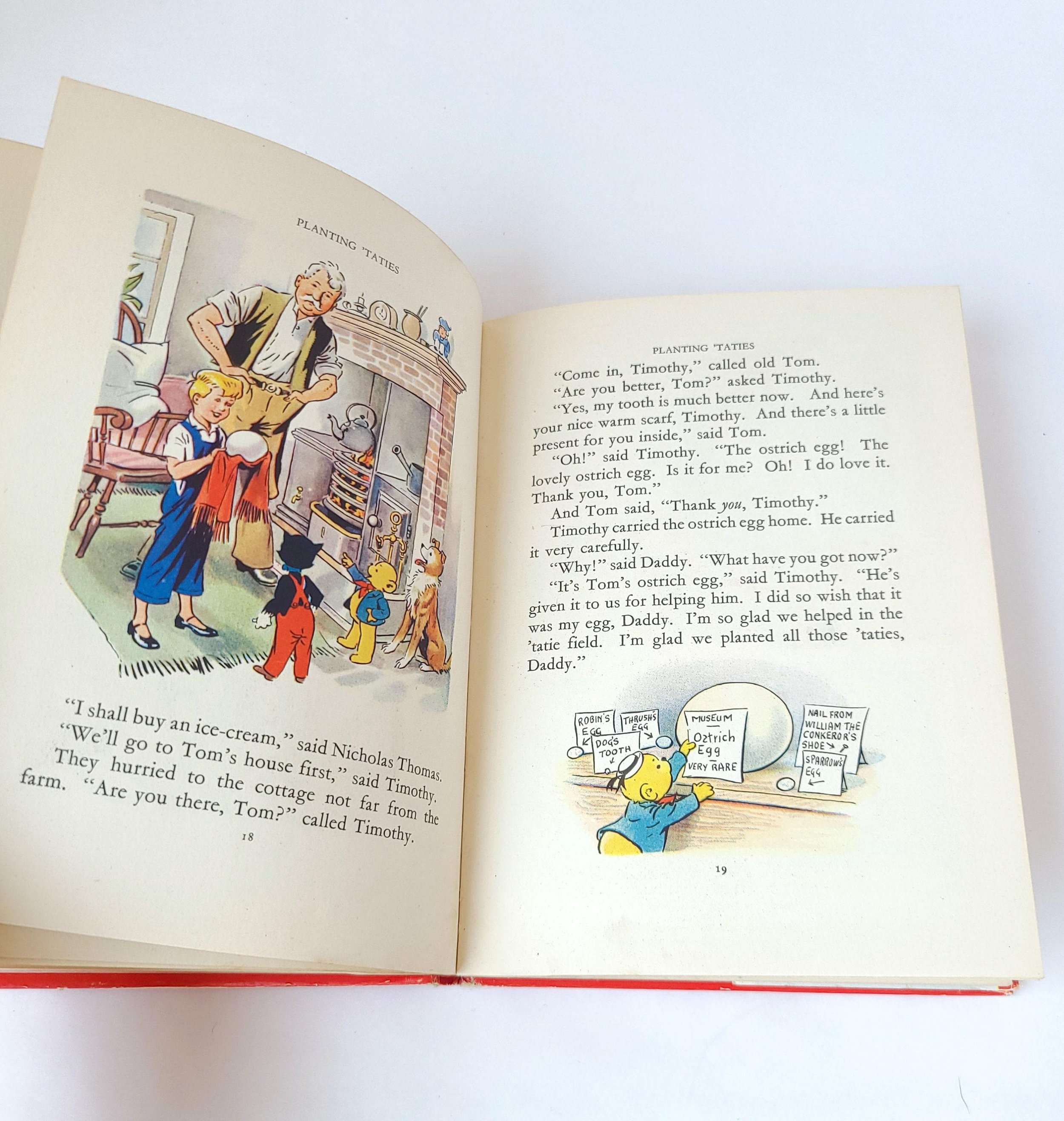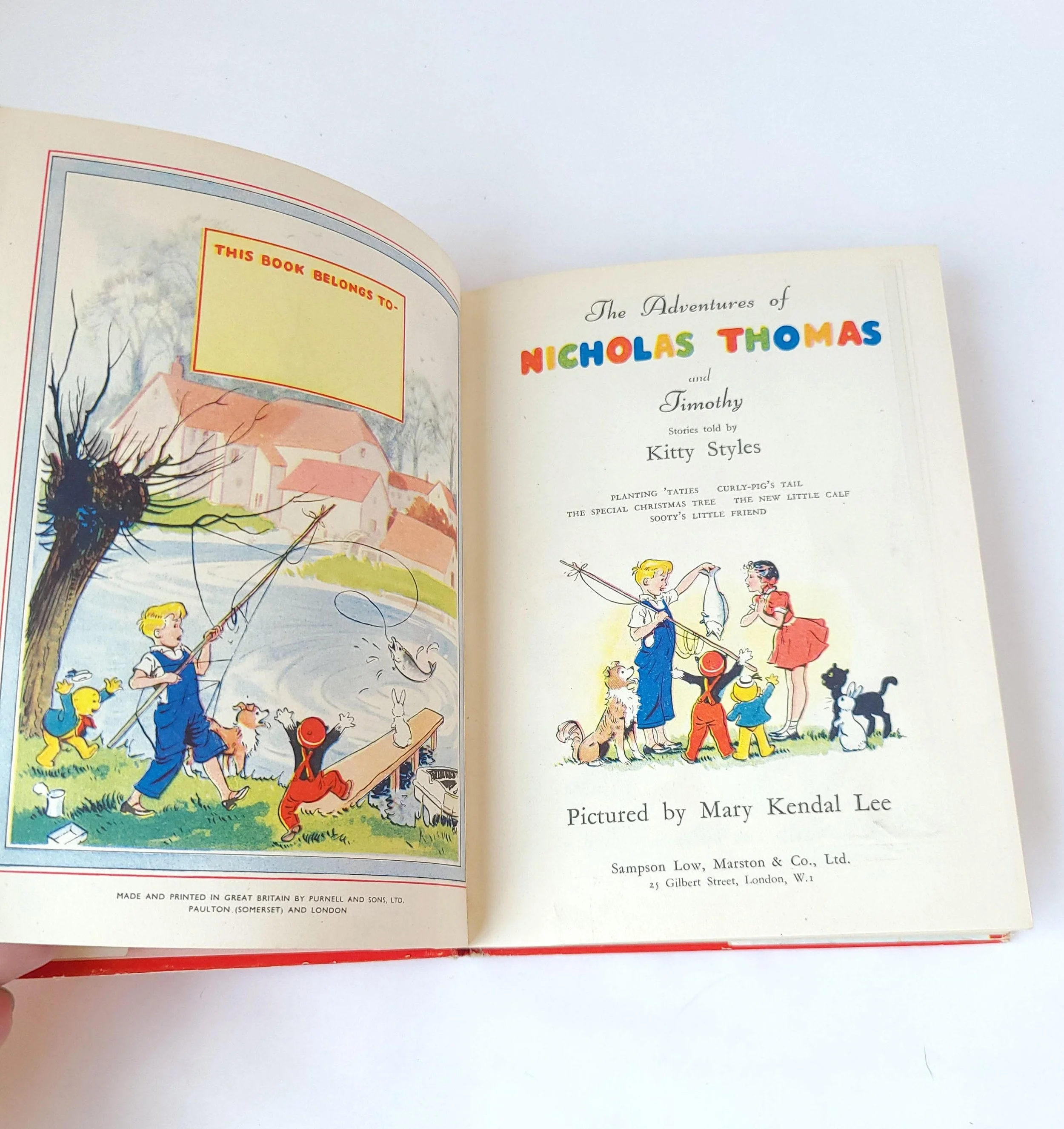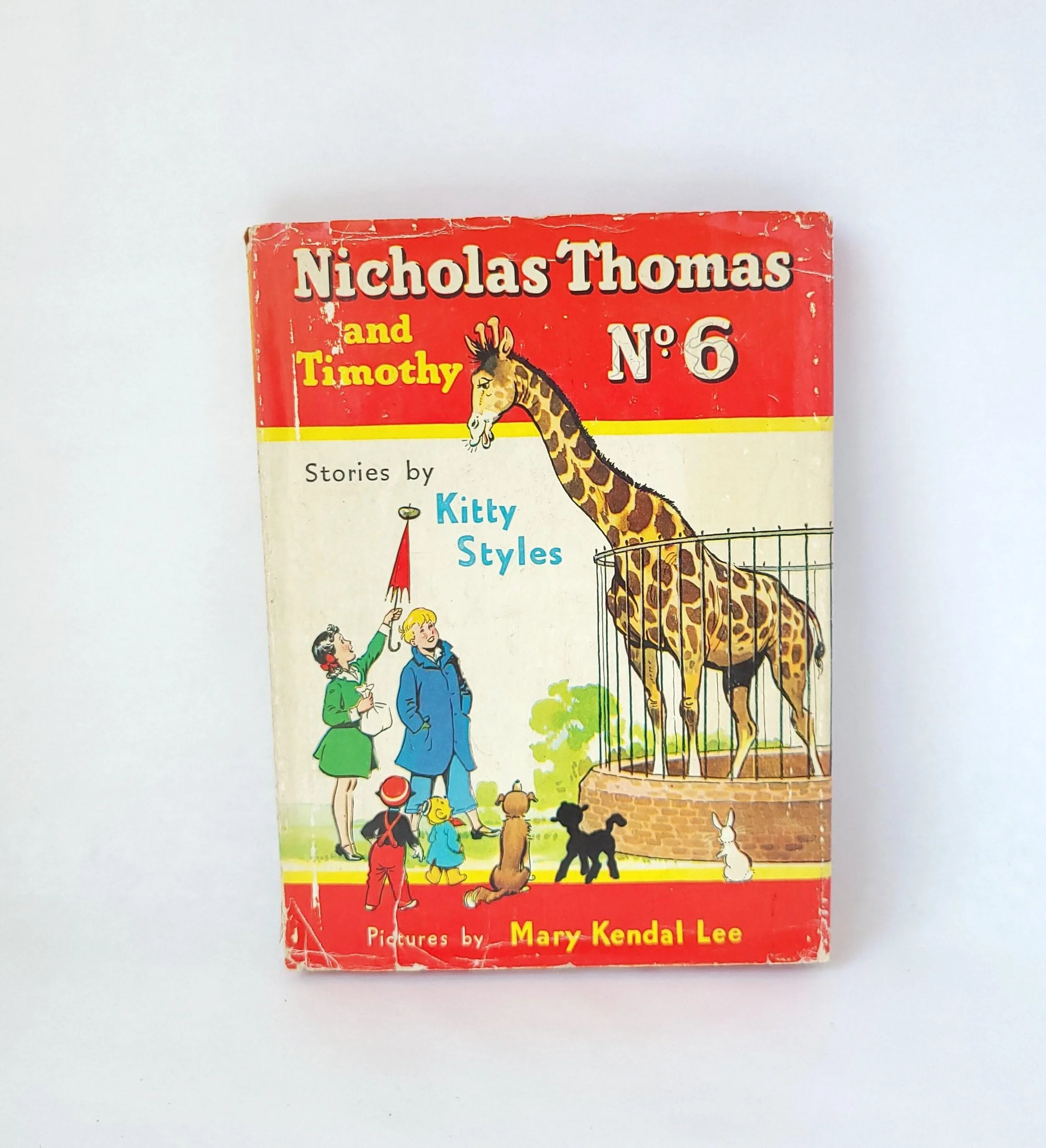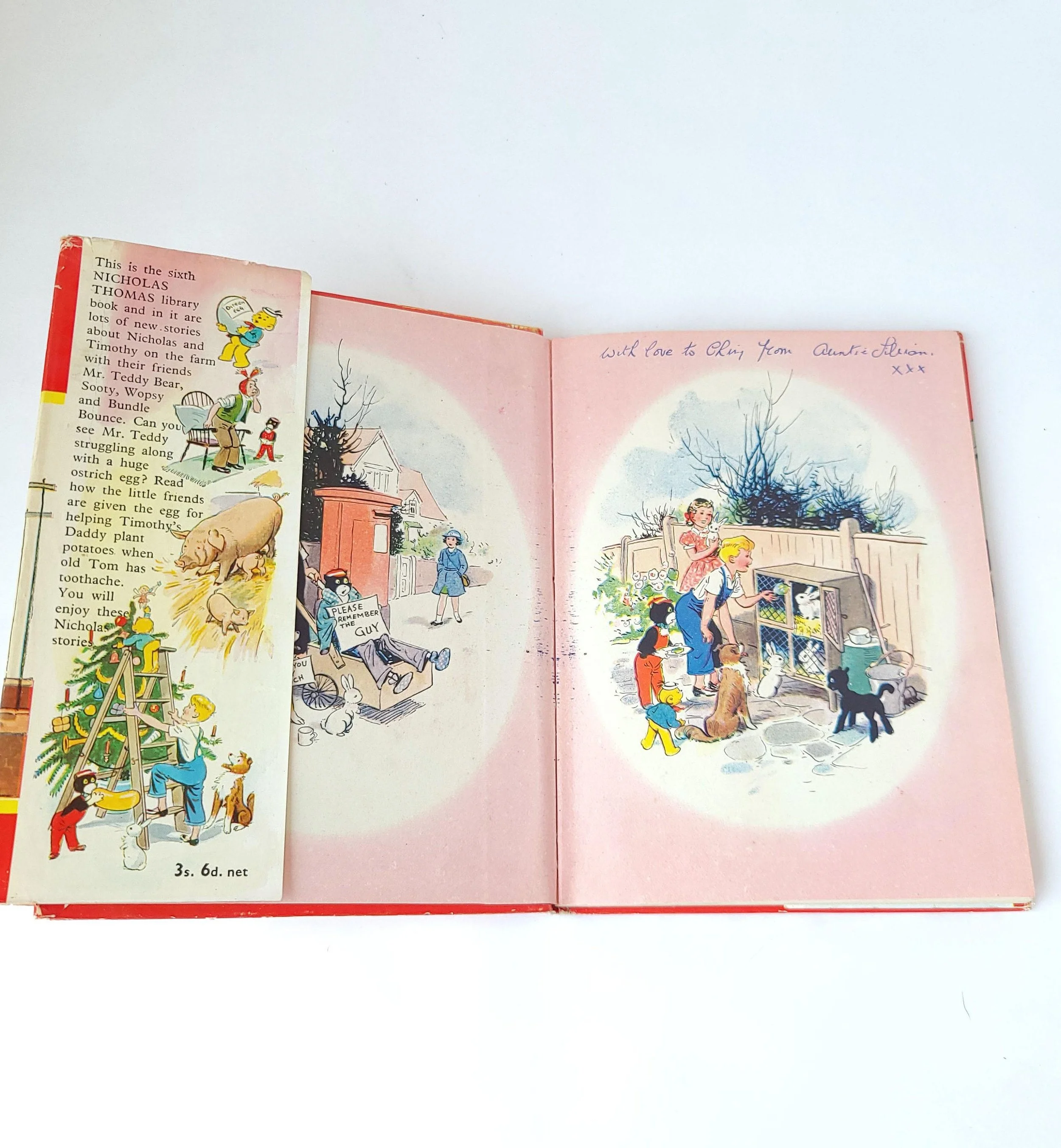 This adorable 1950's edition of Nicholas Thomas and Timothy No. 6 features stories by Kitty Styles and illustrations by Mary Kendal Lee. The book includes sweet little short stories paired with gorgeous full color illustrations. The book is in used condition with small tears and scuffs to the dust jacket, along with a few small scribbles. There is a note written on the front end pages and some smudges on a few pages, but no tears and good overall color quality.
