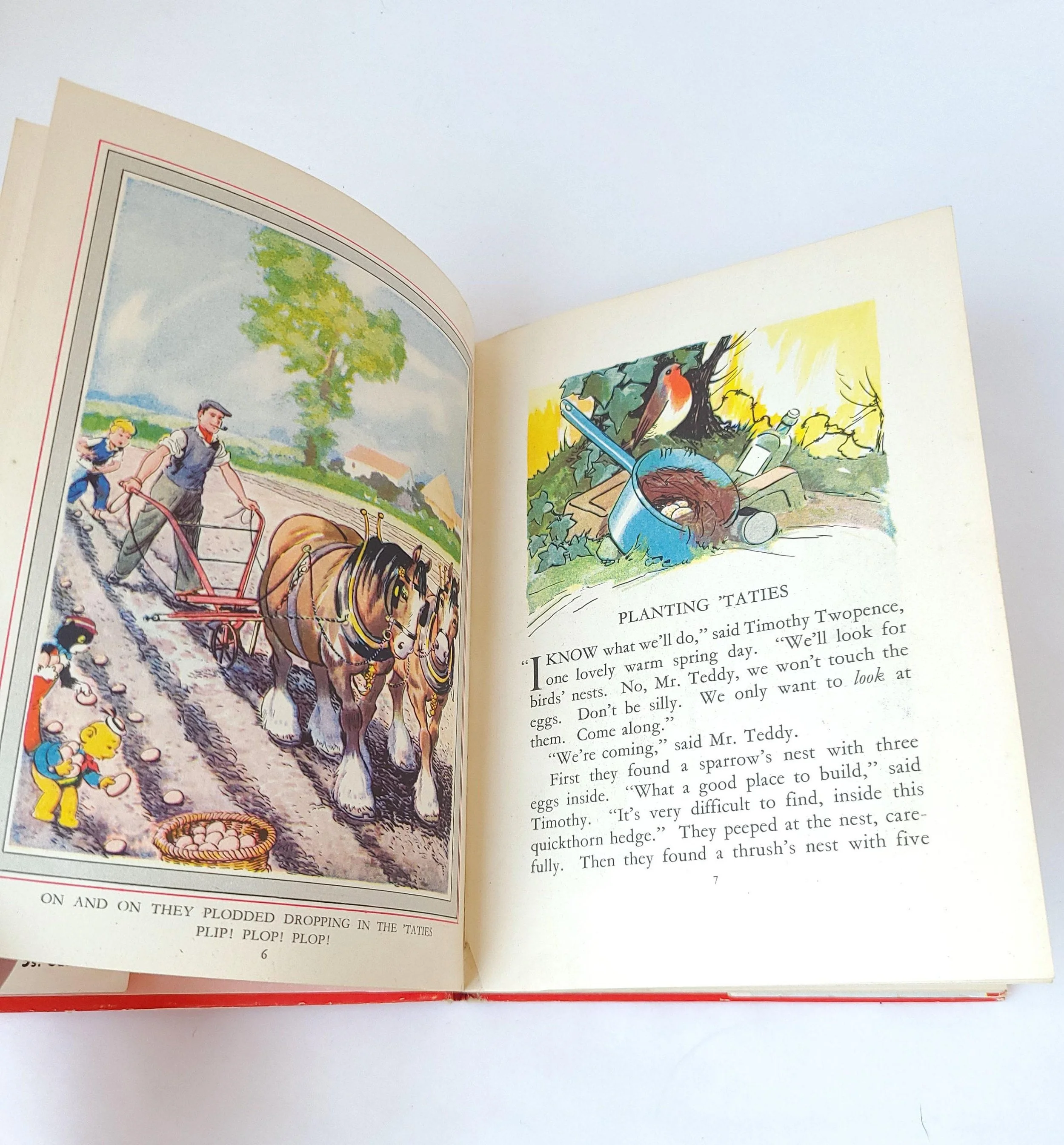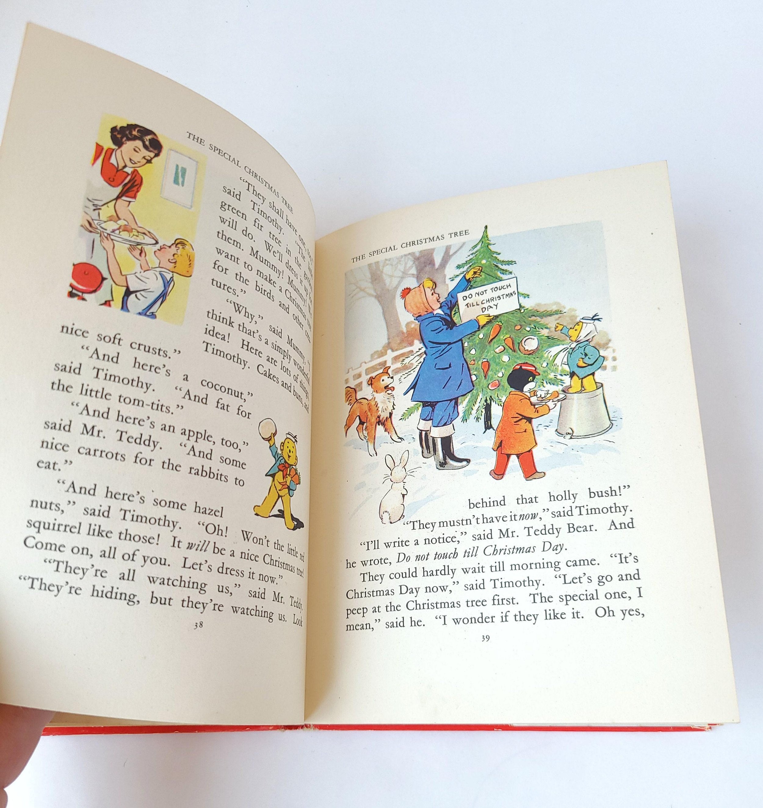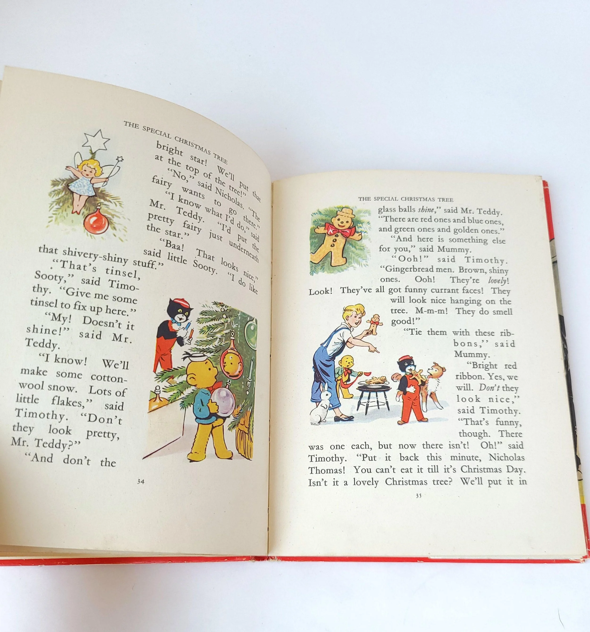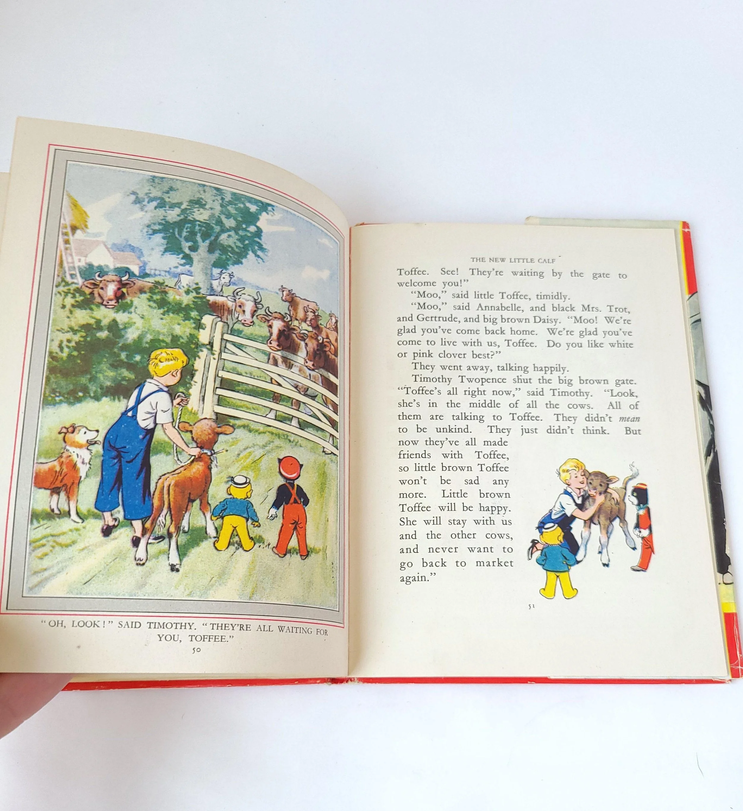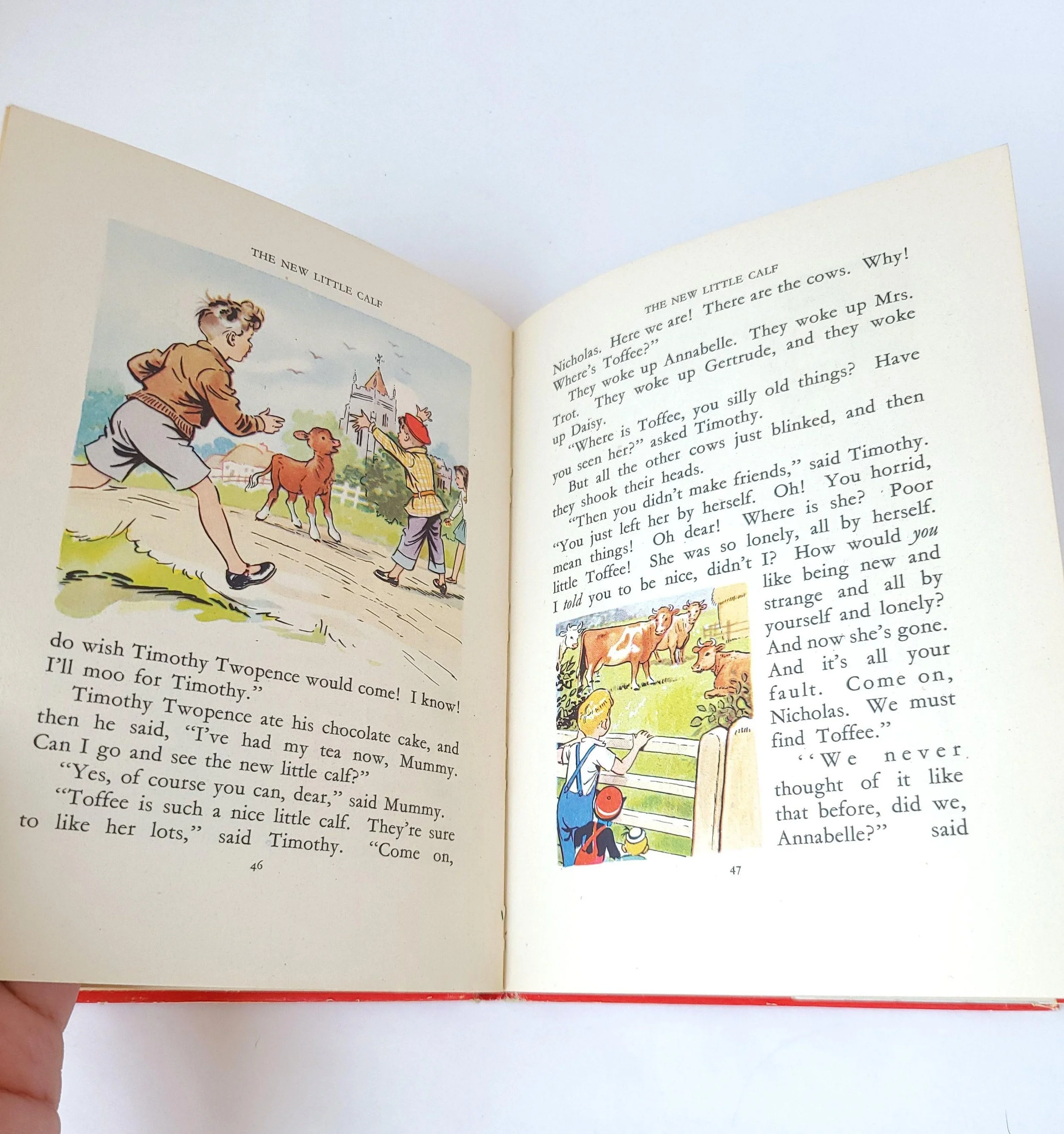 This adorable 1950's edition of Nicholas Thomas and Timothy No. 6 features stories by Kitty Styles and illustrations by Mary Kendal Lee. The book includes sweet little short stories paired with gorgeous full color illustrations. The book is in used condition with small tears and scuffs to the dust jacket, along with a few small scribbles. There is a note written on the front end pages and some smudges on a few pages, but no tears and good overall color quality.